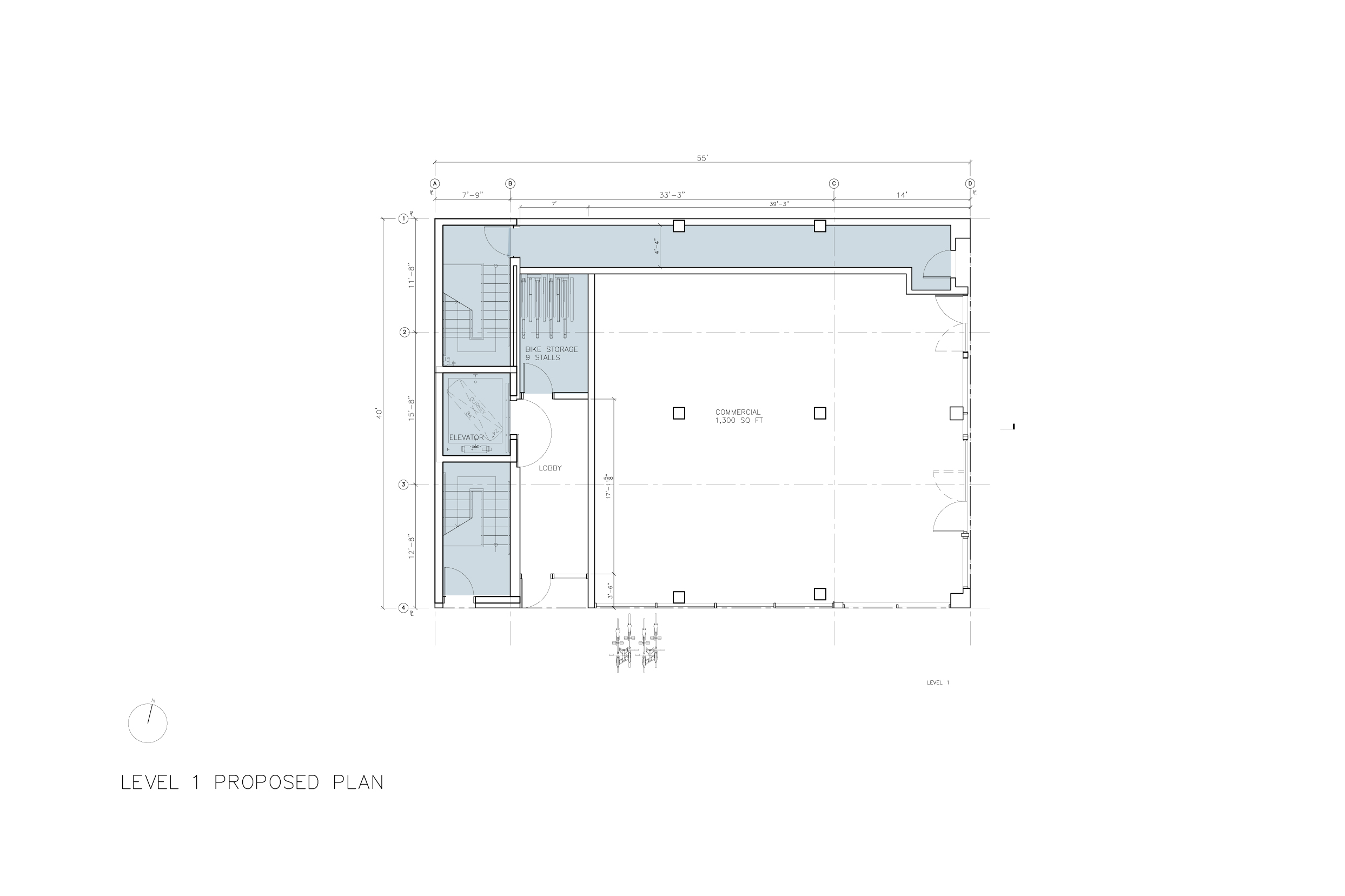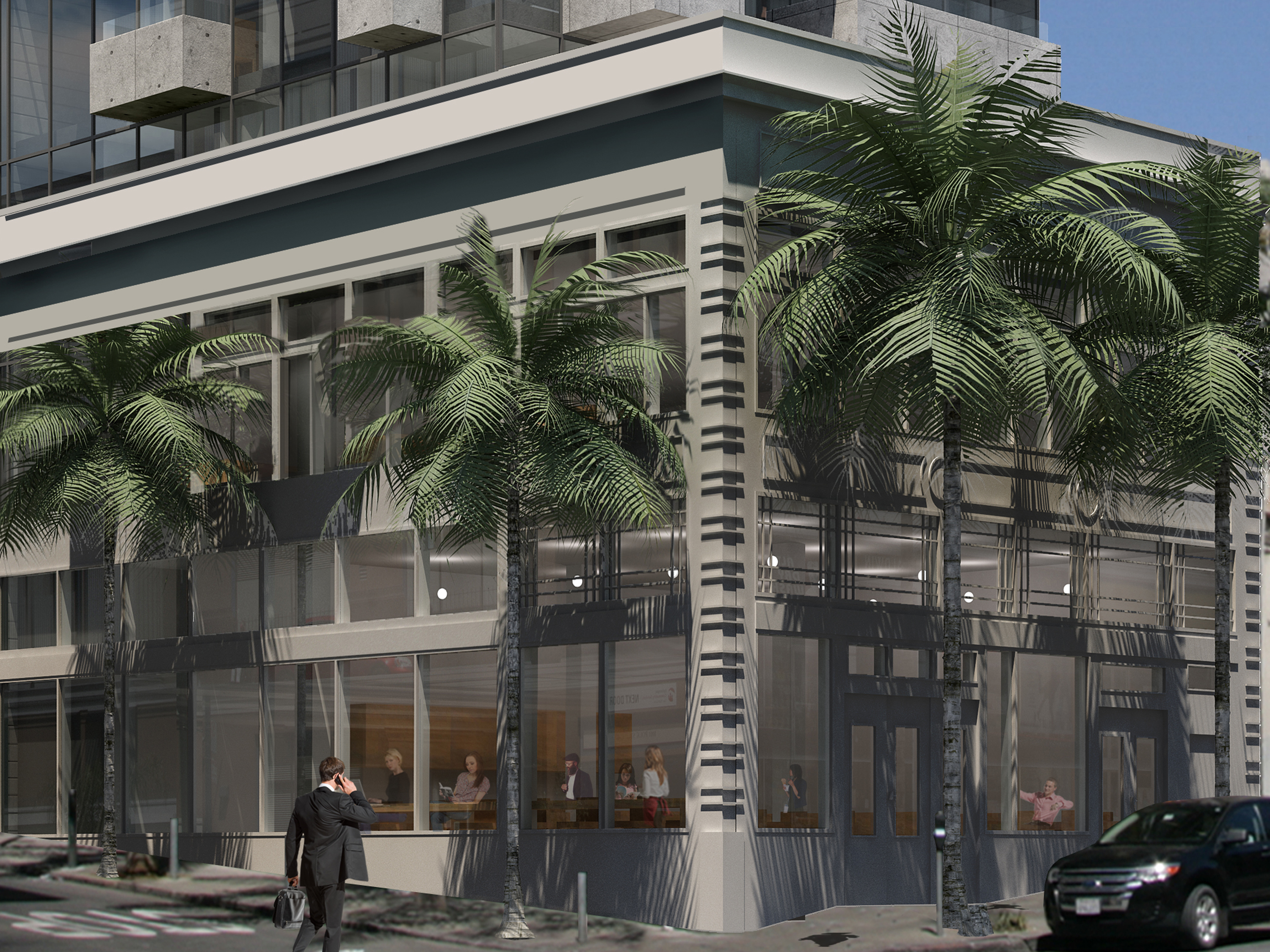 1033 Polk Street is a historic building preserved as the base of a new contrasting tower. The historic building is a typical two story concrete frame building with glass infill. The tower is opposite – a glass curtain wall with projections of solid balconies.