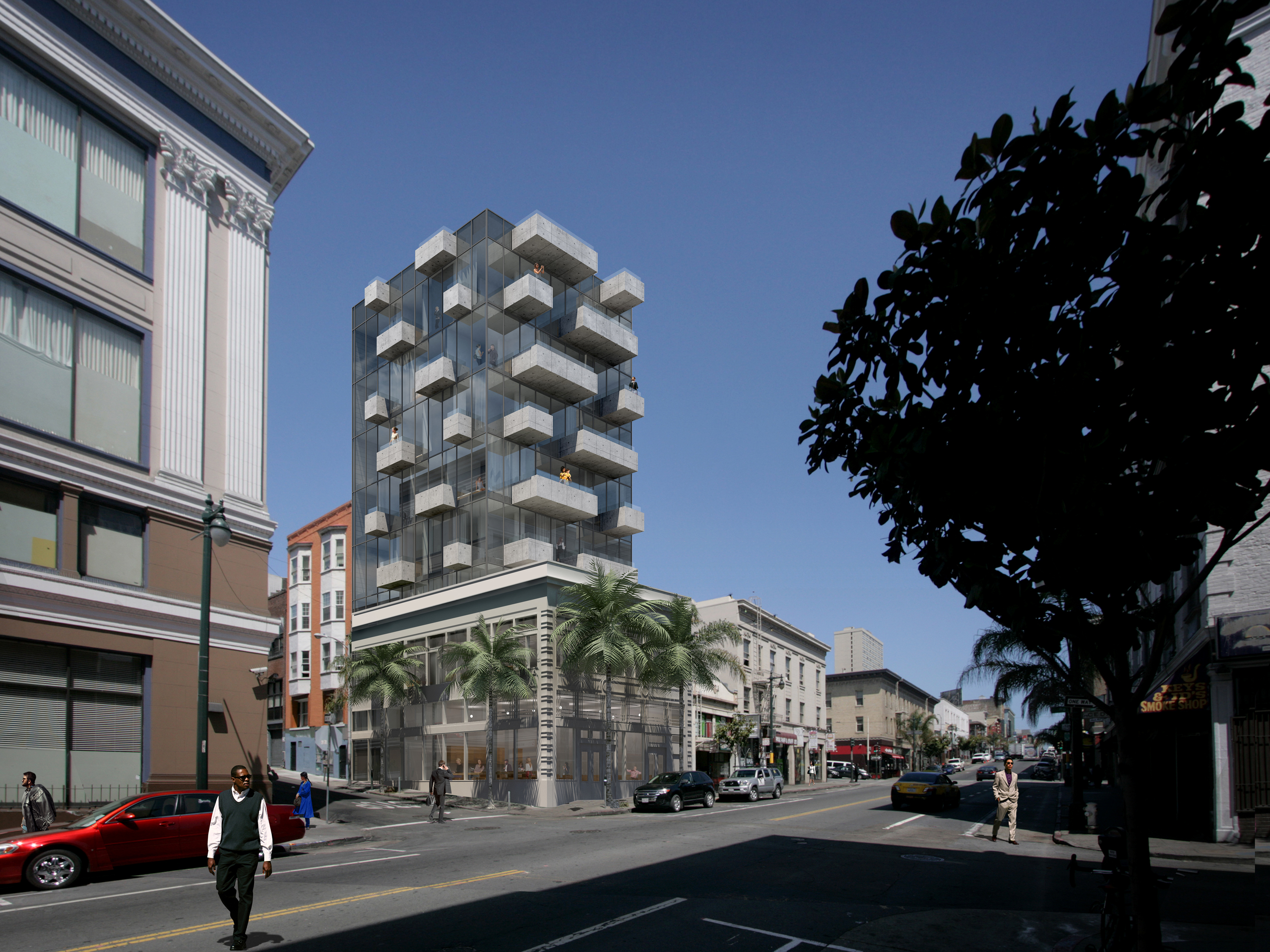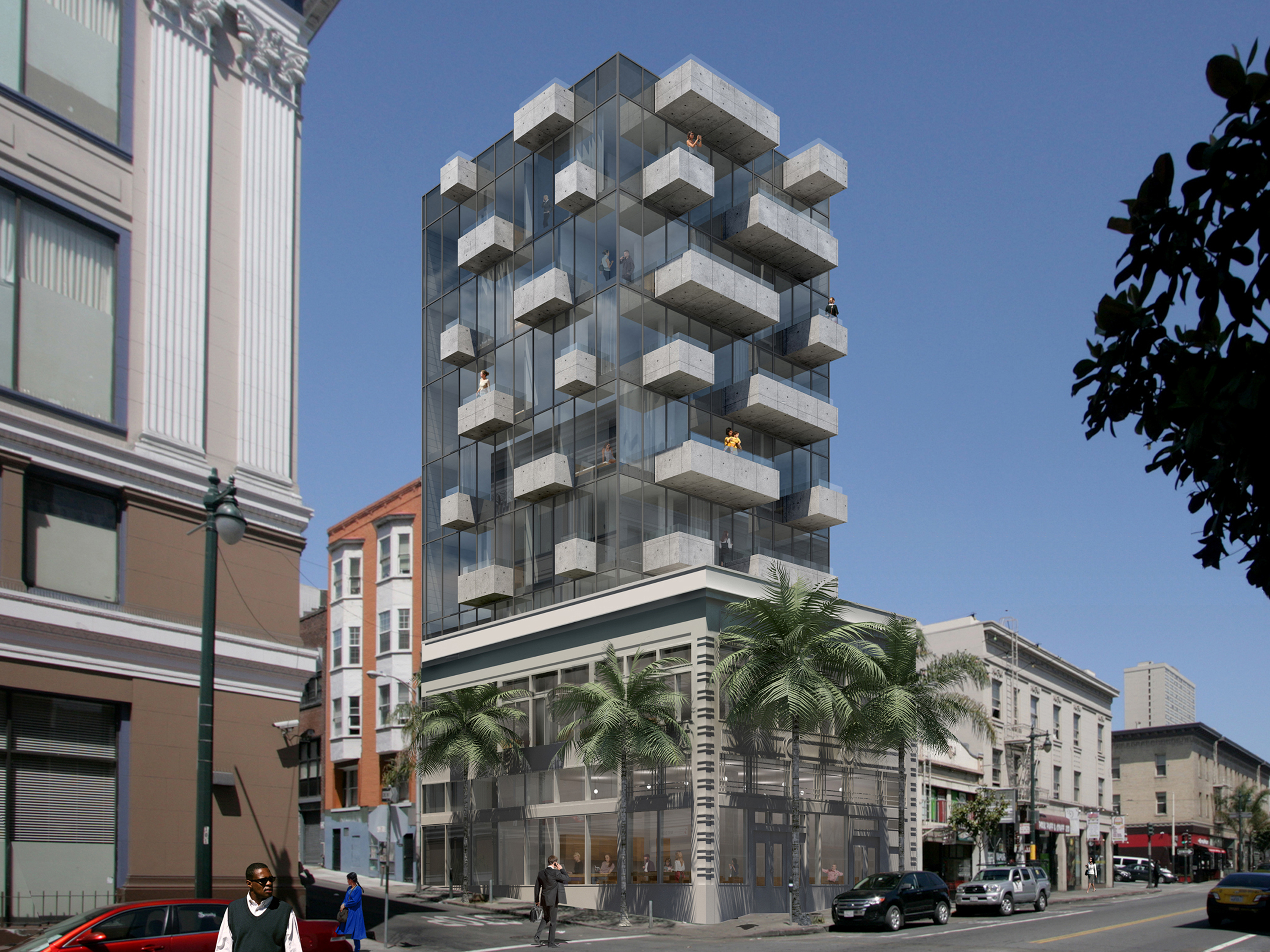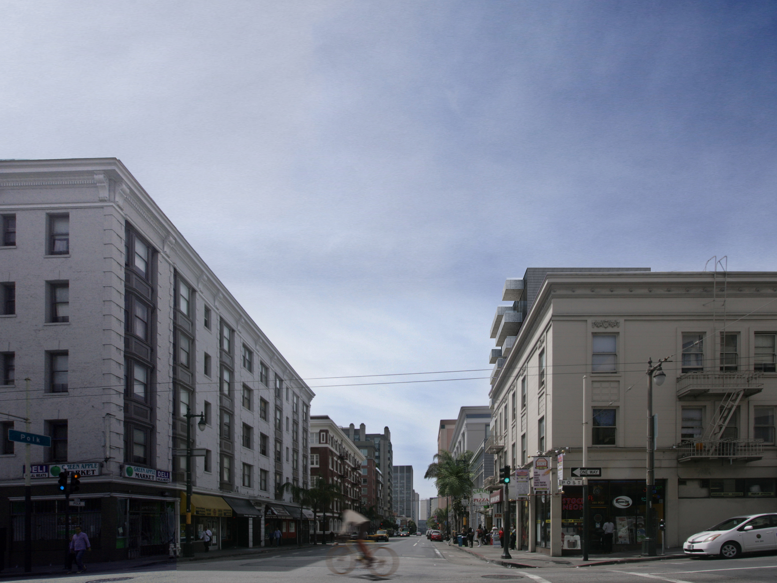 The general context of Polk Street are masonry buildings with punched openings. The new tower is inverted as a glass building with projecting solid balconies, in a similar rhythm.