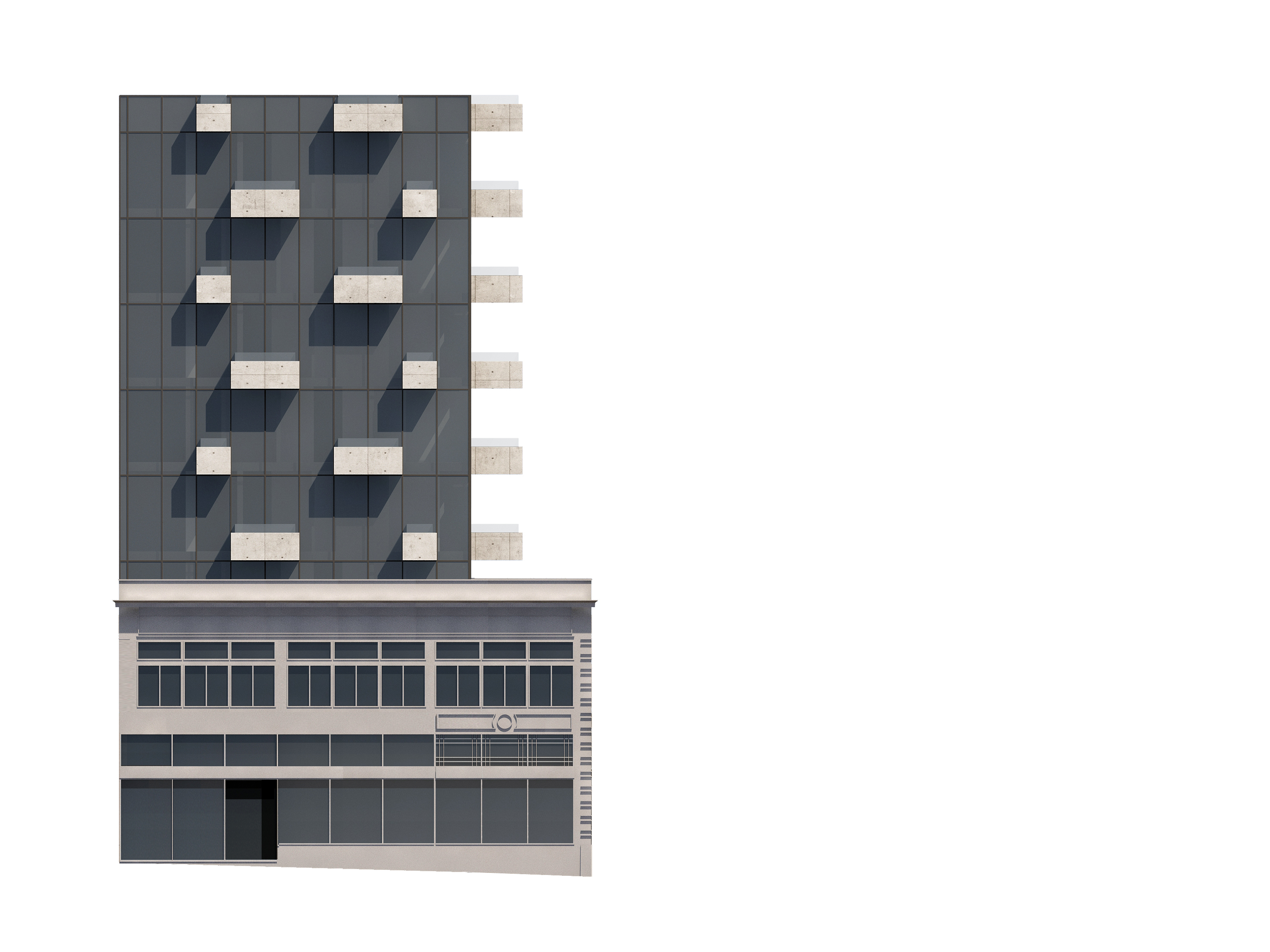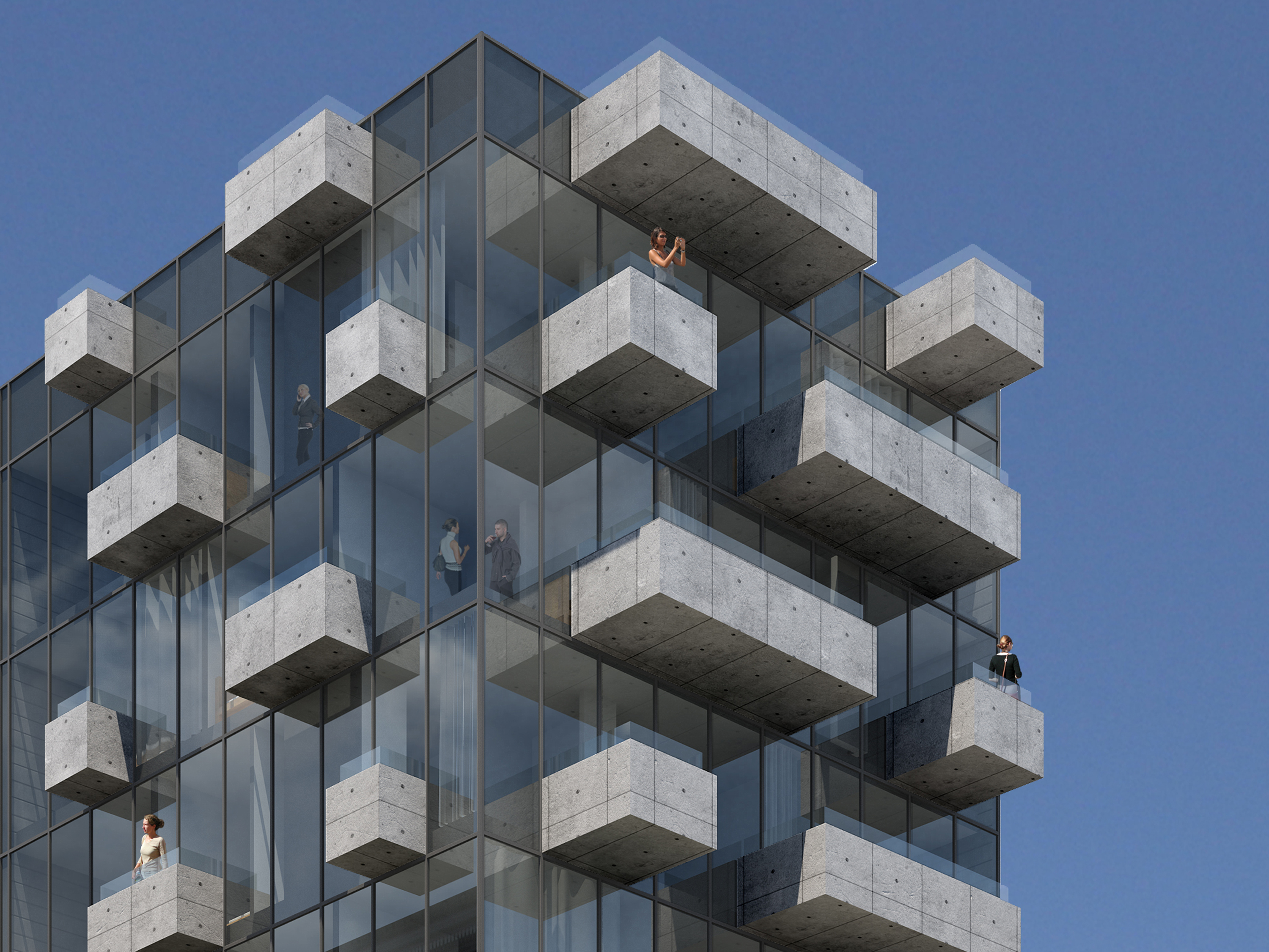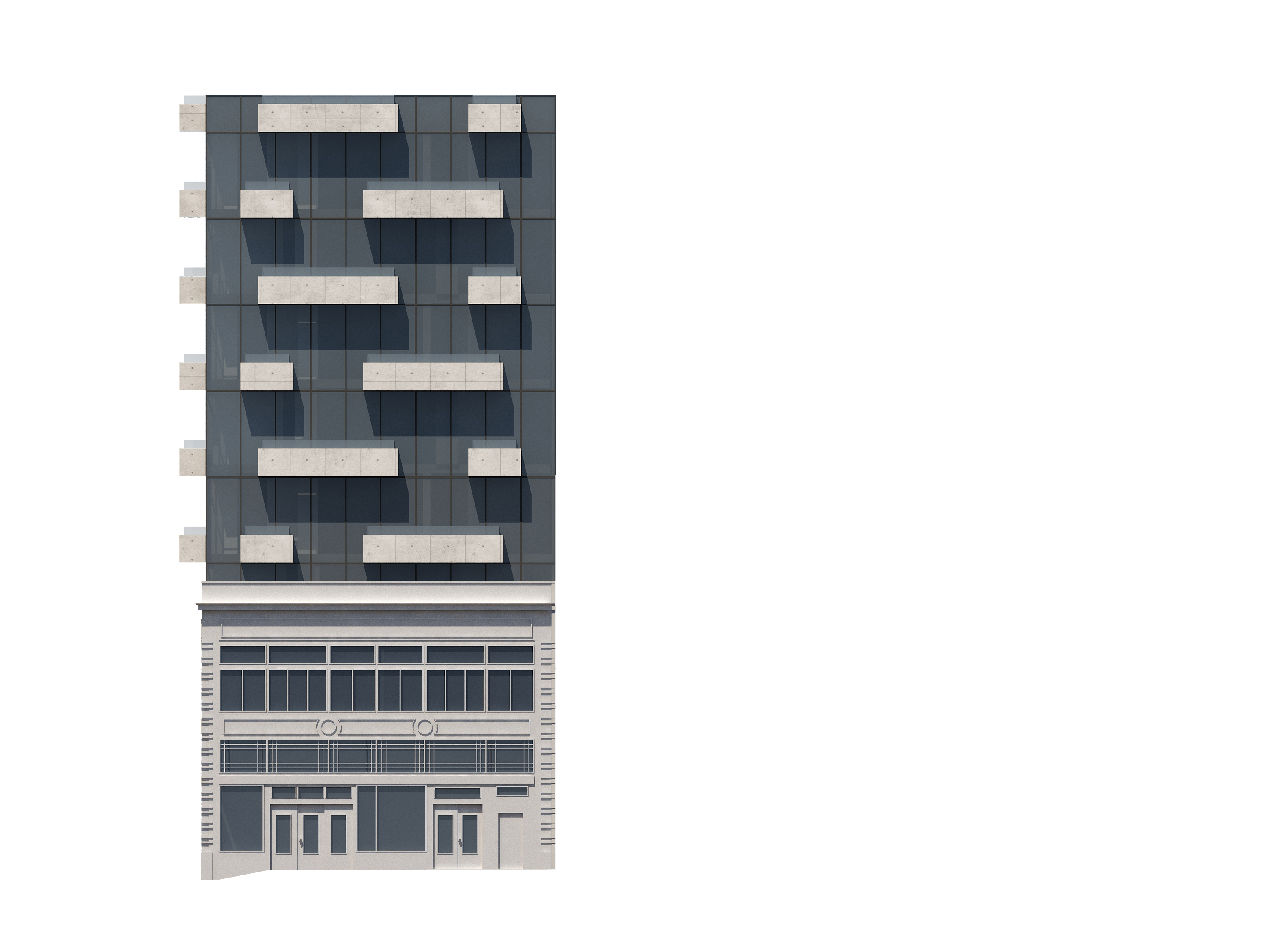 The general context of Polk Street are masonry buildings with punched openings. The new tower is inverted as a glass building with projecting solid balconies, in a similar rhythm.
