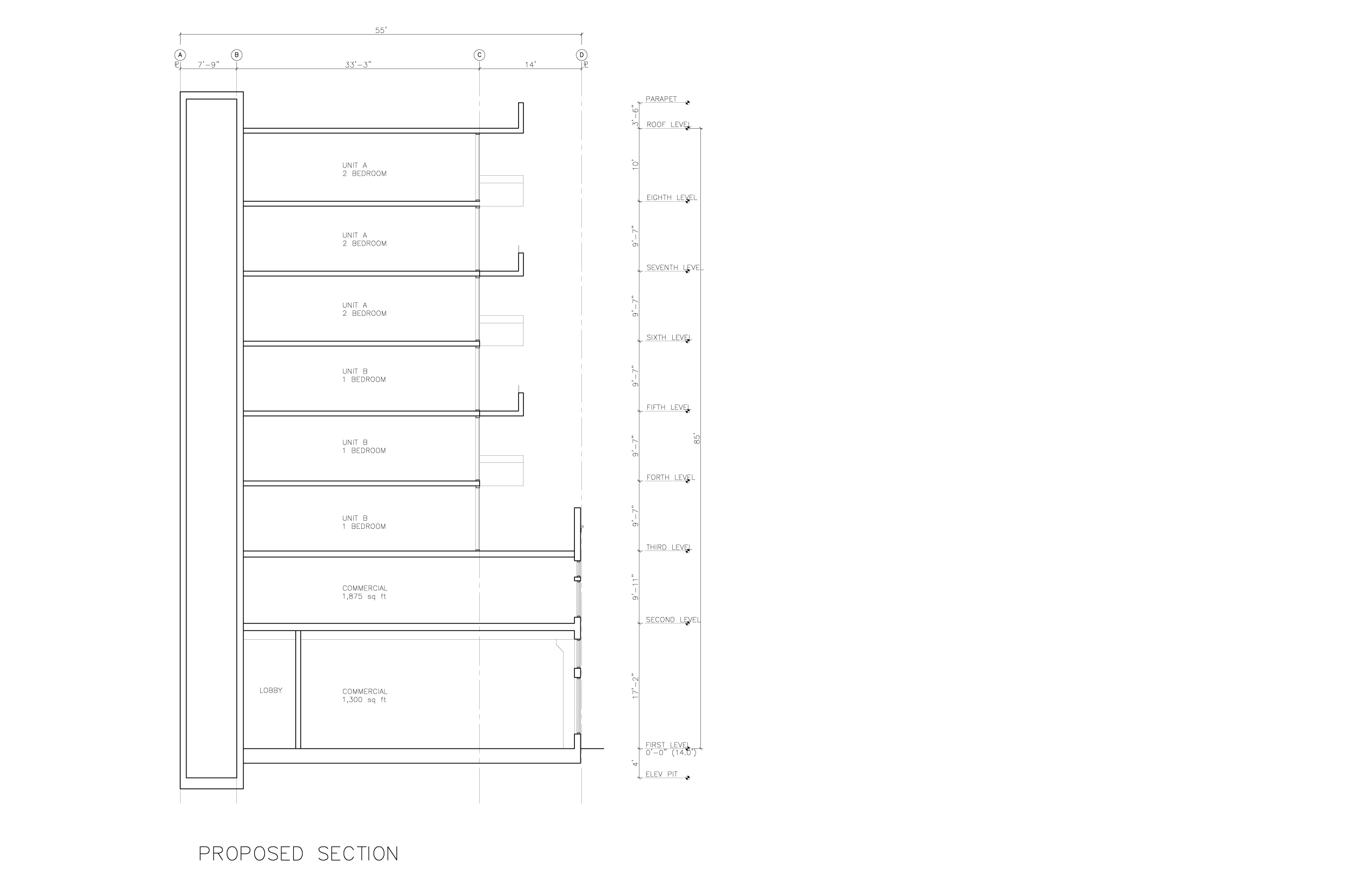 The tower houses residential units, two per floor for the lower floors, and larger penthouse units at the top. The historic base is commercial space.