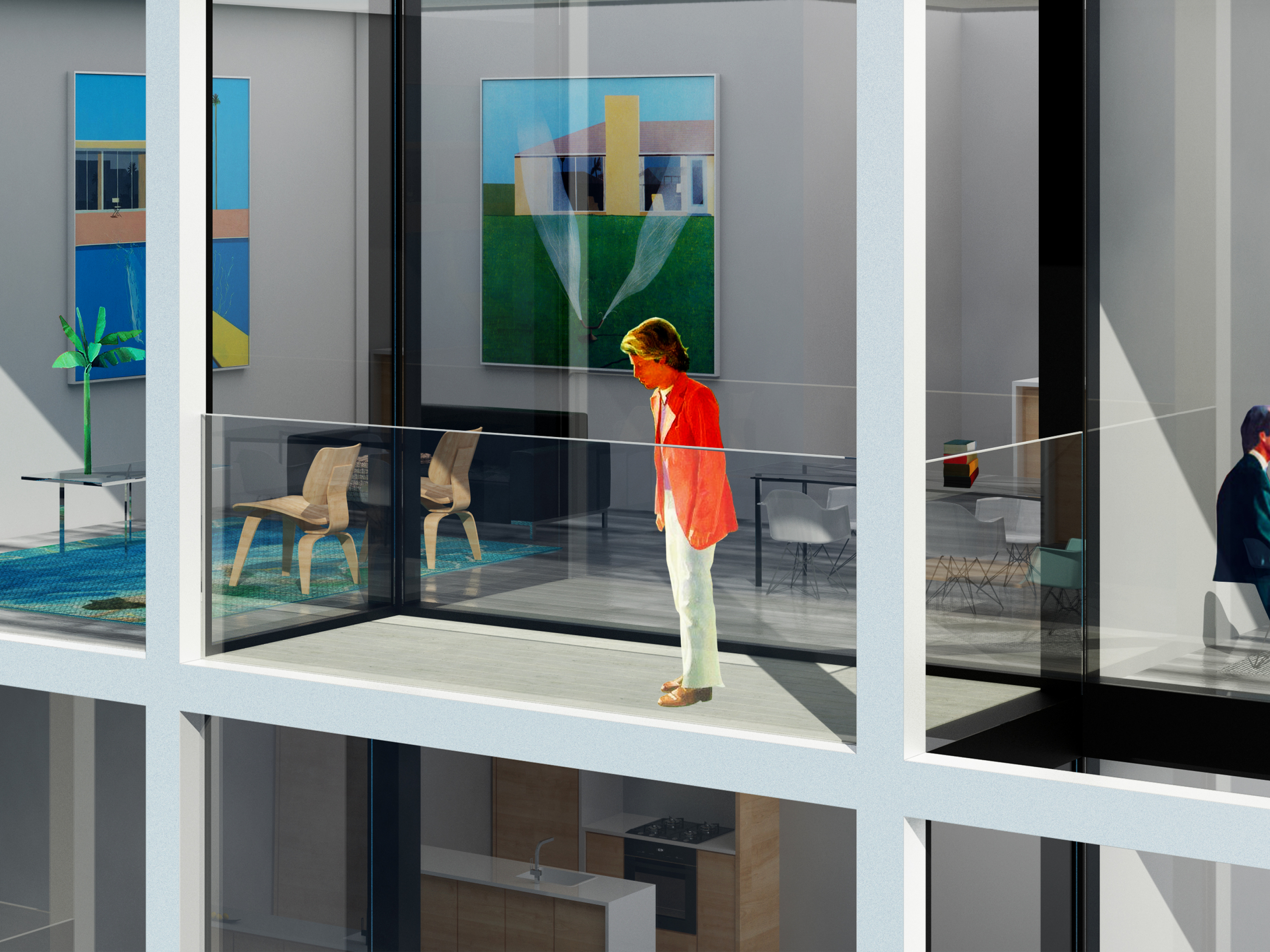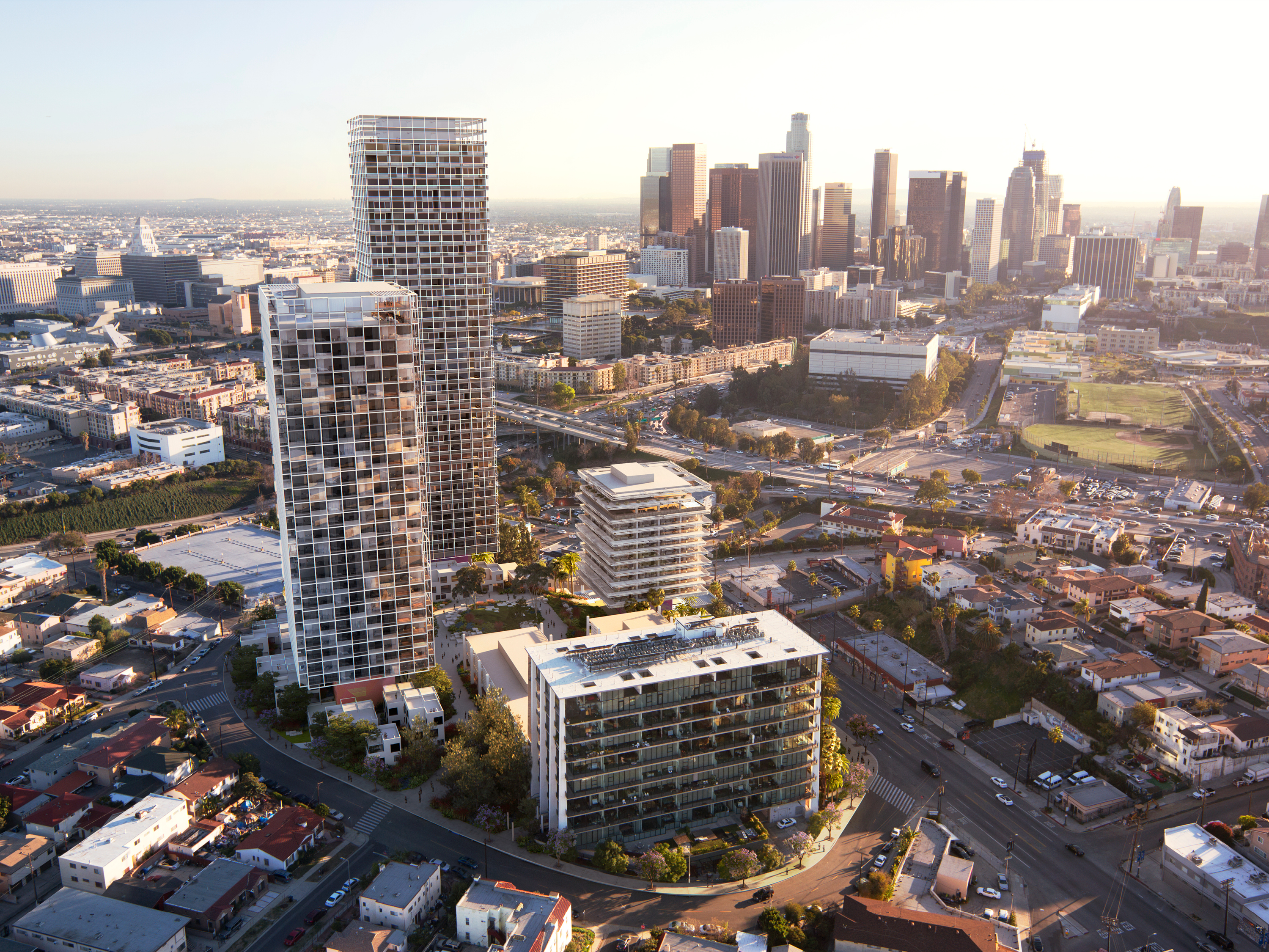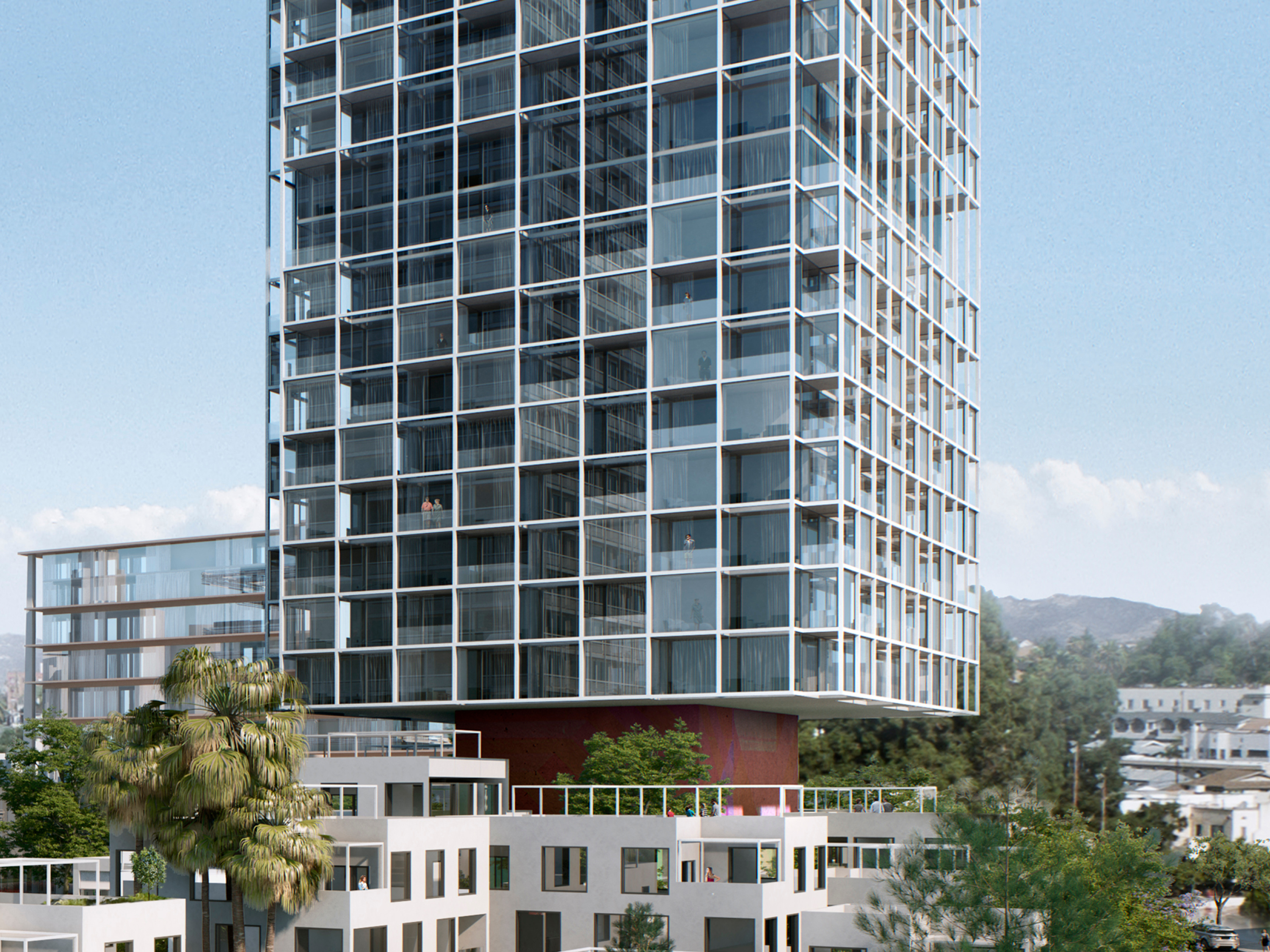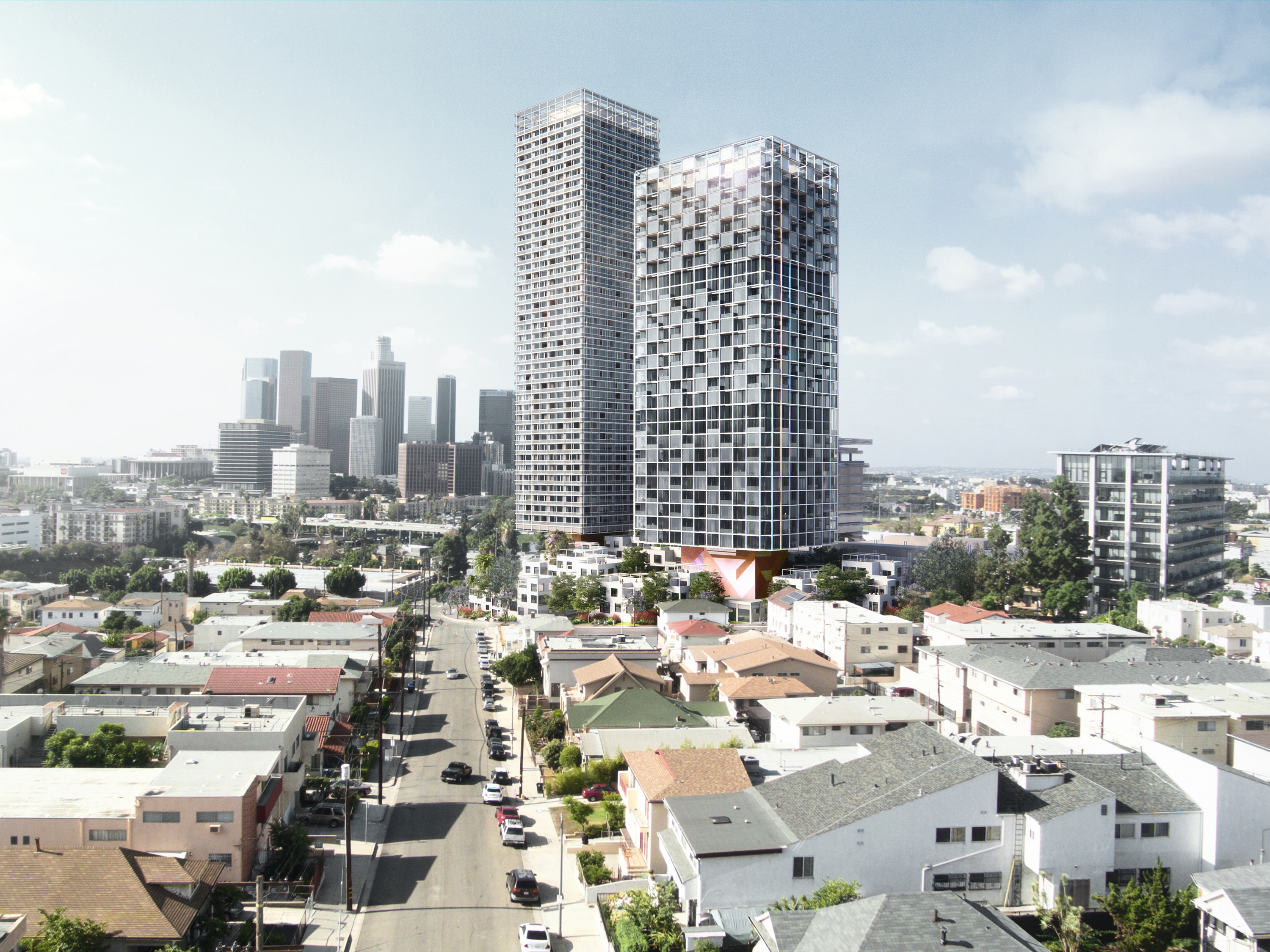 Our tower continues the search for new Los Angeles form, for sprawl condensed and turned vertical. A six foot wide perimeter zone wraps the four faces of the tower. This band of oscillating bays, balconies, and voids, creates a rich middle field between interior and exterior, open and closed, public and private, an upturned porch hovering in sky.