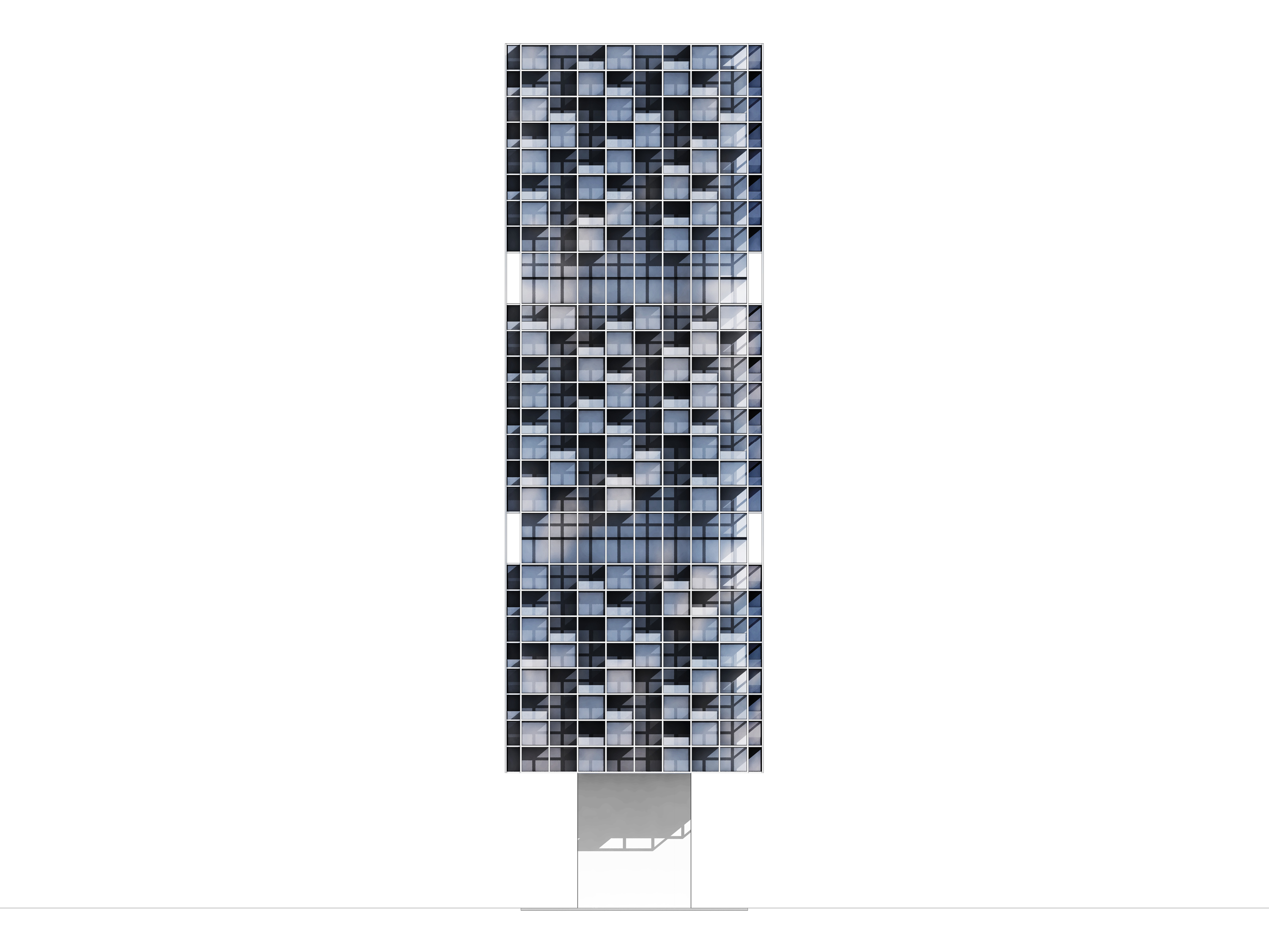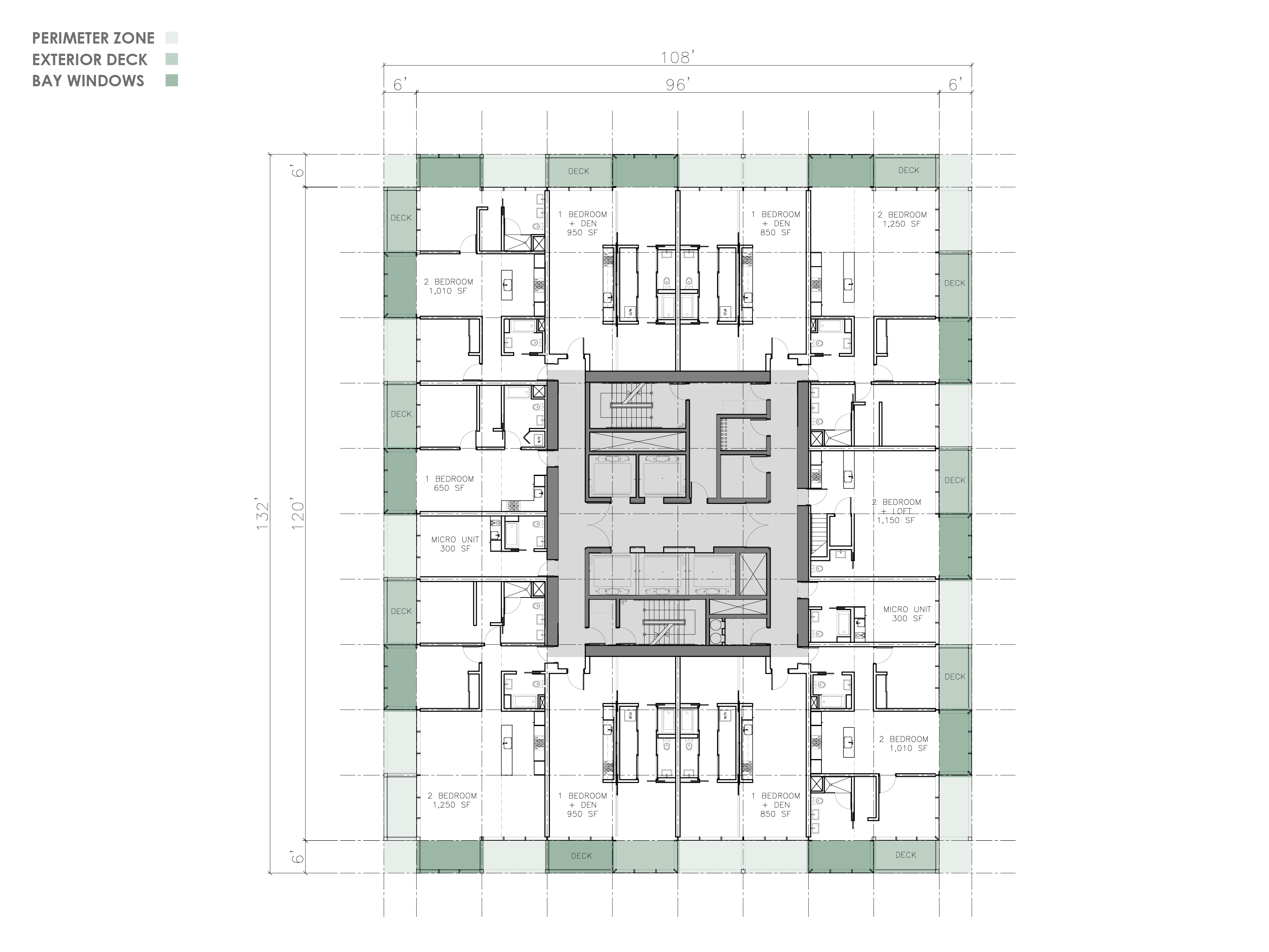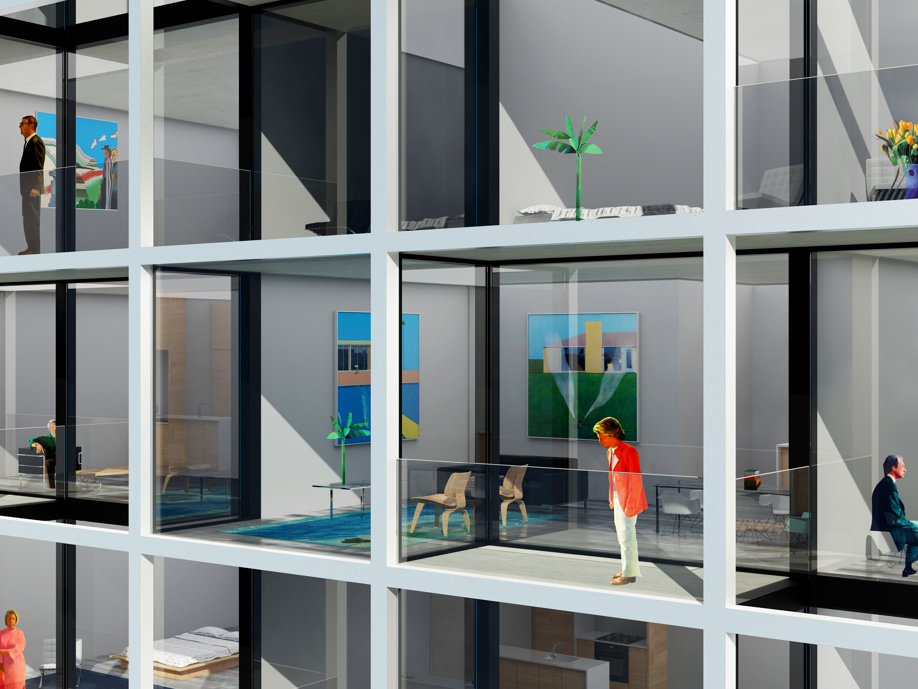 Our tower continues the search for new Los Angeles form, for sprawl condensed and turned vertical. A six foot wide perimeter zone wraps the four faces of the tower. This band of oscillating bays, balconies, and voids, creates a rich middle field between interior and exterior, open and closed, public and private, an upturned porch hovering in sky.