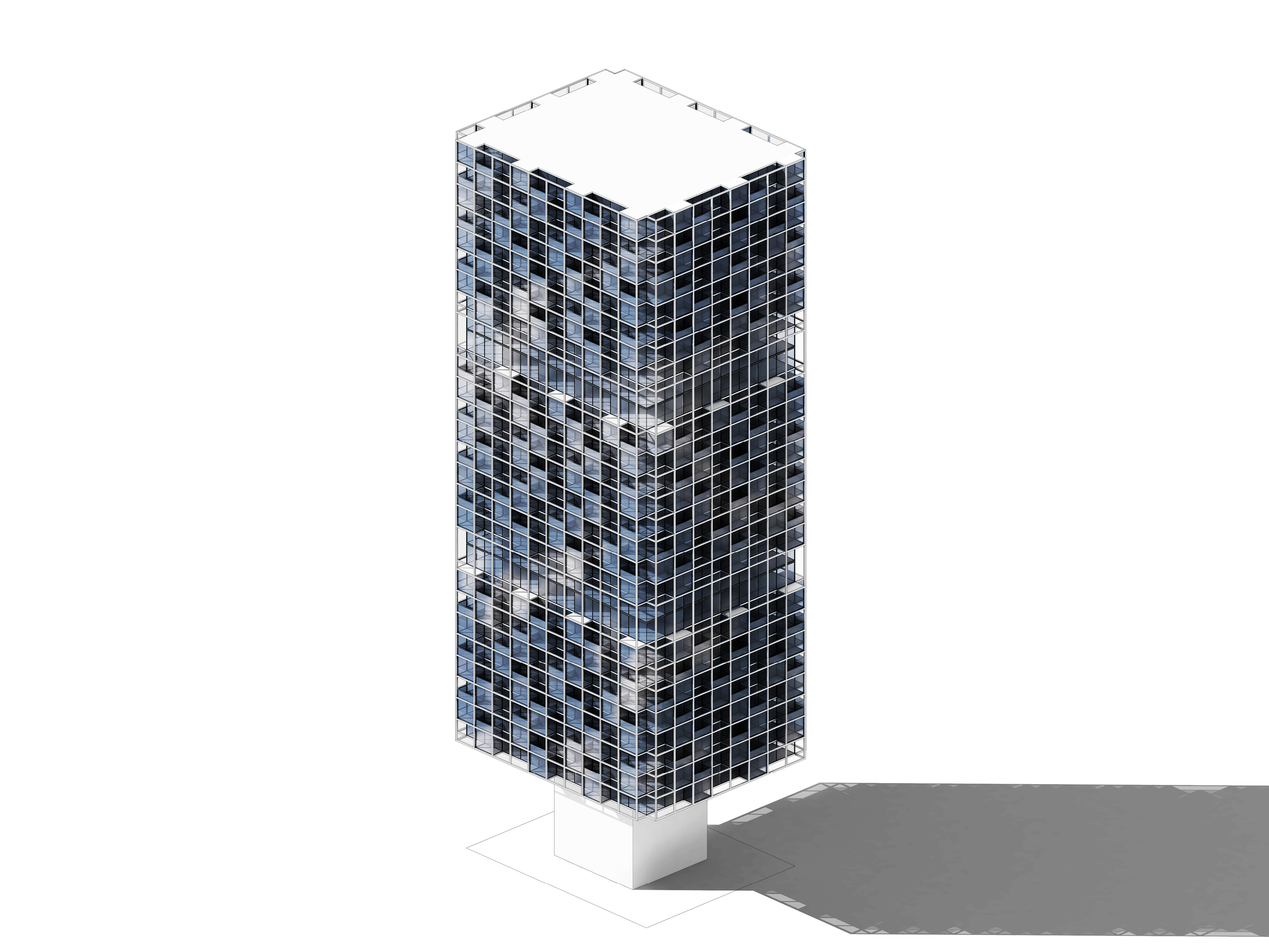 Behind this zone of connection, individual units are sliced. Surrounding the central core and circulation, a thickened wall compacts services. A variety of units including stacked townhouses as well as flats, fill in the gridded tower.