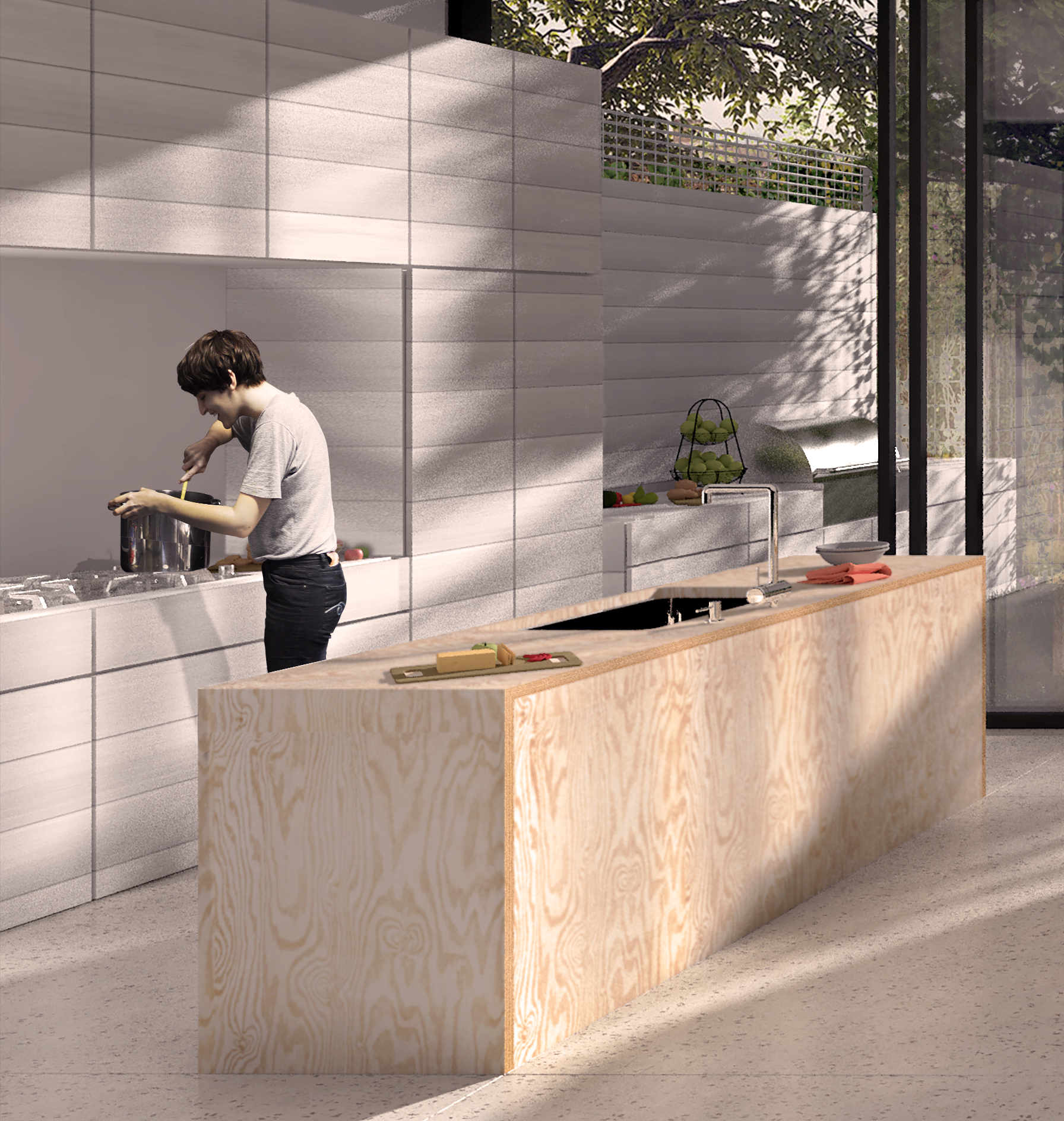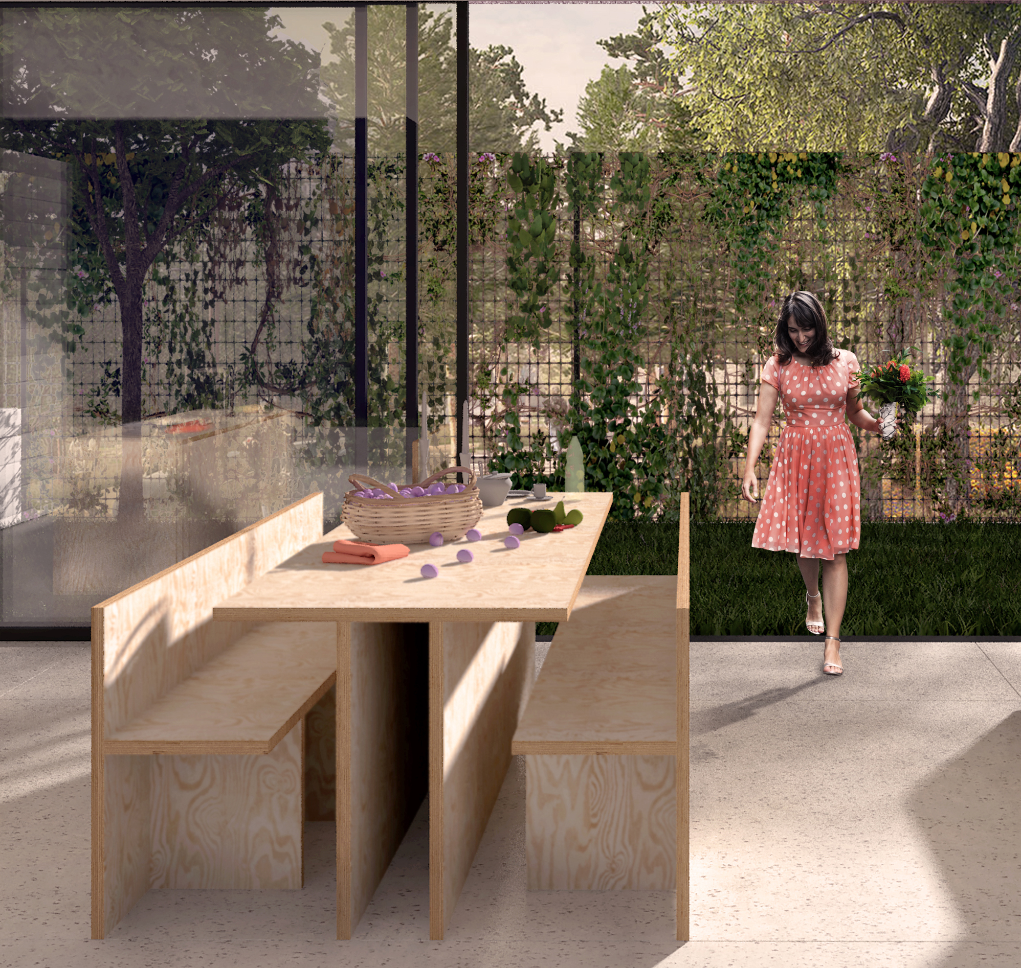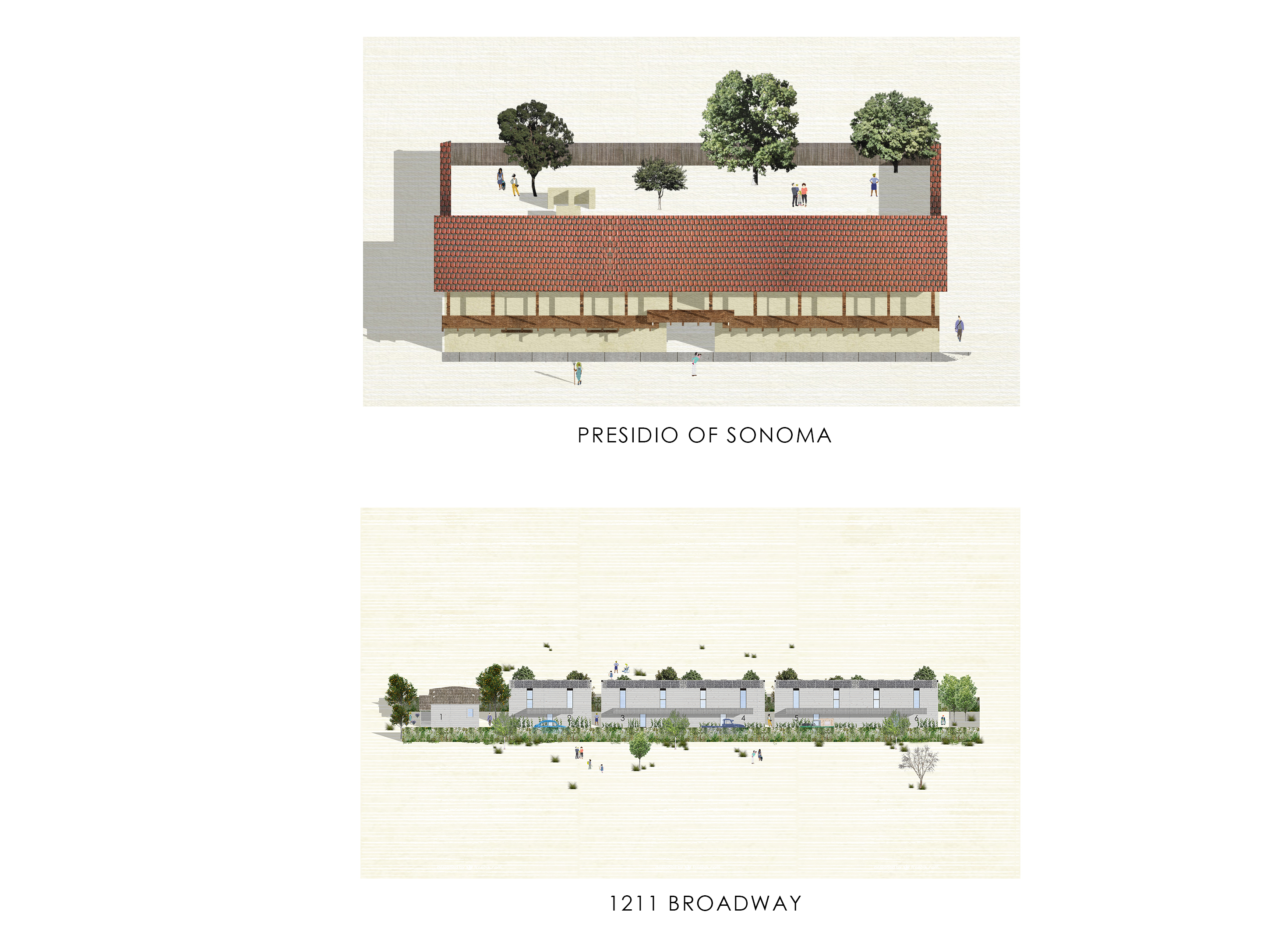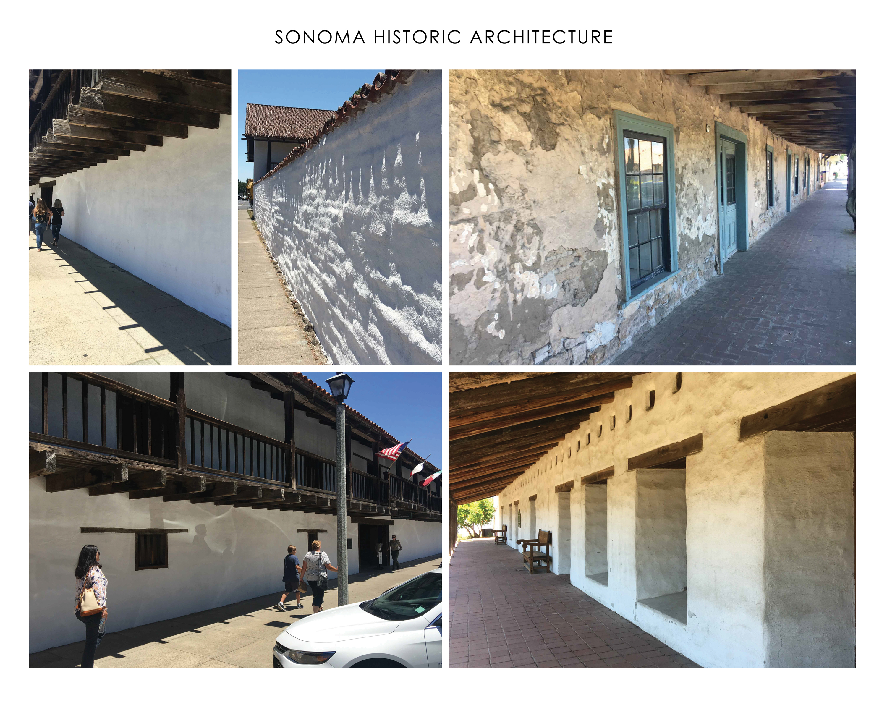 The architecture is derived from the Spanish Colonial and Monterey Colonial buildings in the Sonoma Historic Core. The defining characteristics of these buildings include linear plans, absence of ornament, repetitive rhythmic full height fenestration, low pitched or flat roofs, cantilevered porches, wood cladding, and the expression of material and construction as the form. The design ethic of this pragmatic and economical architecture is reinterpreted in a contemporary way for our project.
