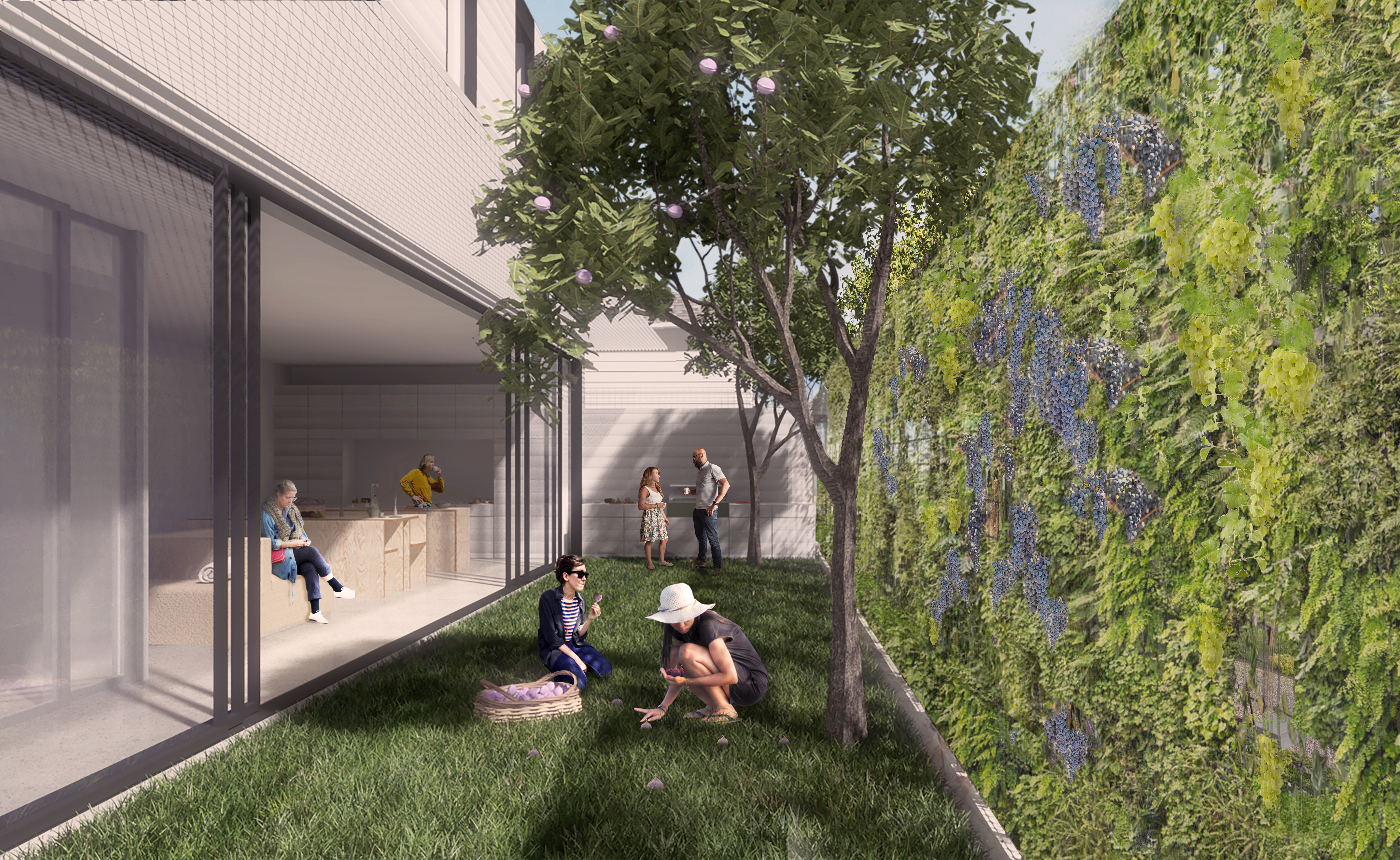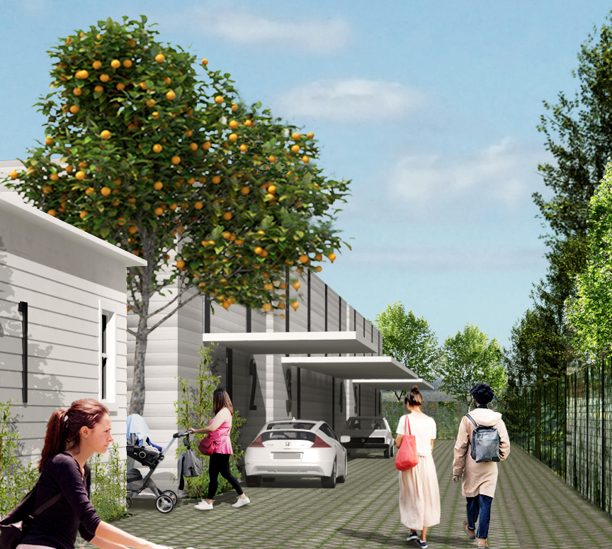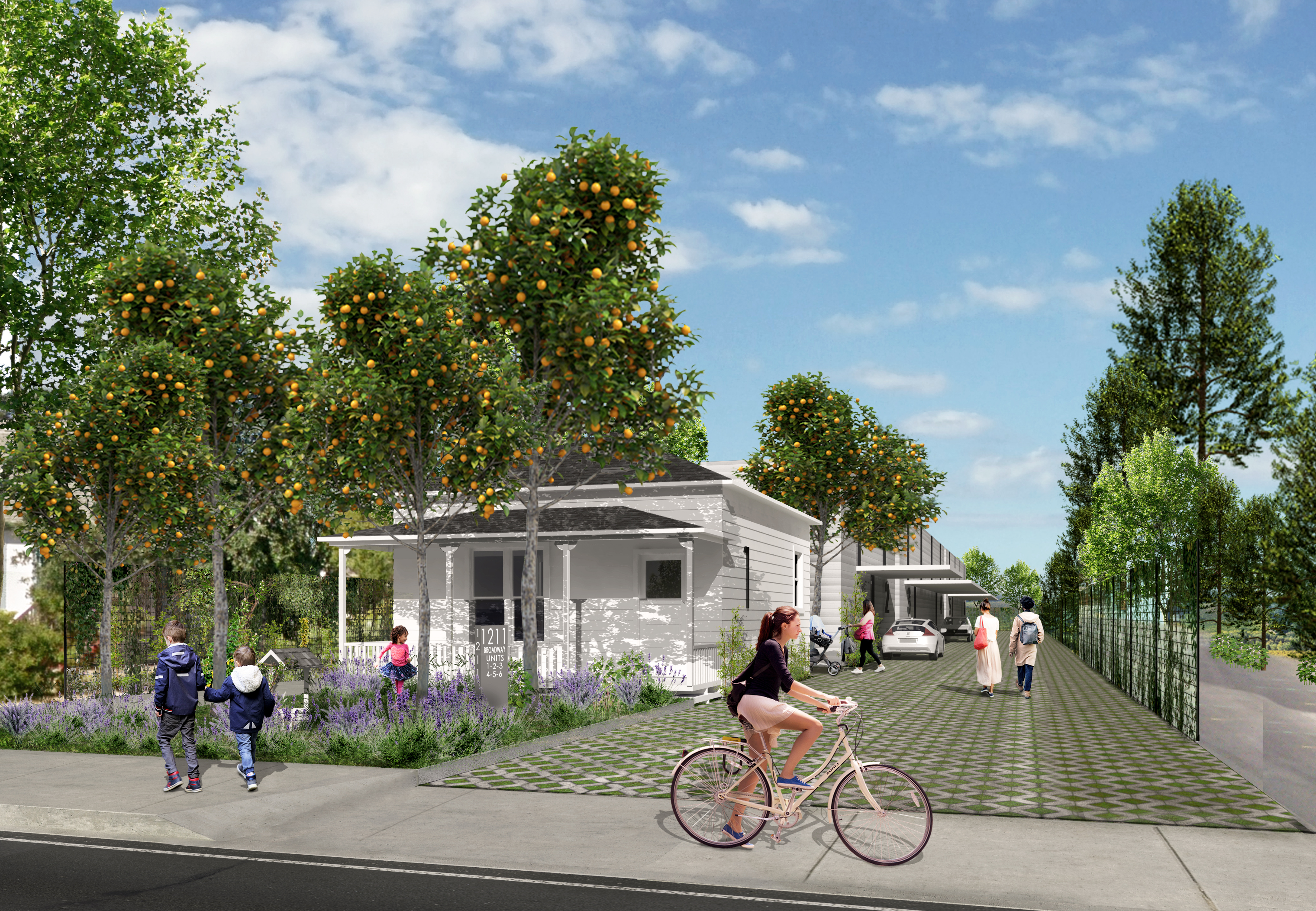 The simple palette of materials includes clapboard siding, vertical proportioned windows to match the Victorian, and diagonally braced steel cantilevered carport porches. Photovoltaics on the rooftop are kept flat to reduce height and visual impact on the original house. The project demonstrates a way to densify downtown deep lots using traditional Sonoma types without significantly changing streetscape character.