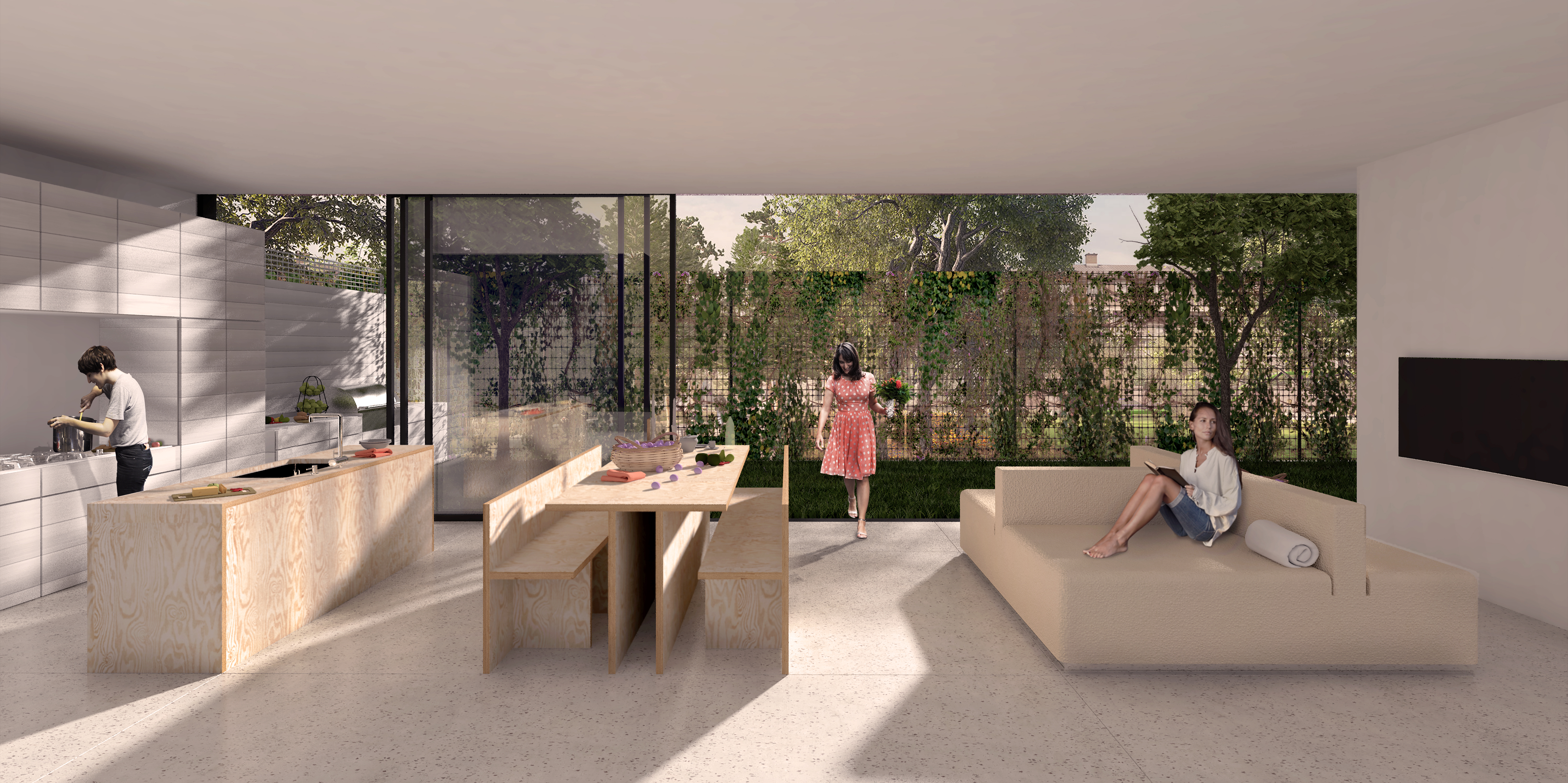 This project involves the restoration of an existing 113 year old Victorian house at 1211 Broadway, and the construction of 5 new two story townhouses behind it. They are arranged in three buildings, one single, and two duplexes. Each of the new units have courtyards the same size as the ground floor interiors, with large sliding doors that dissolve into a common walled living space. The kitchen slides into the court for outdoor cooking. On the second level, two bedrooms and two bathrooms overlook the courtyards. Driveway and parking are on the opposite side, with a series of carports cantilevered off the buildings.