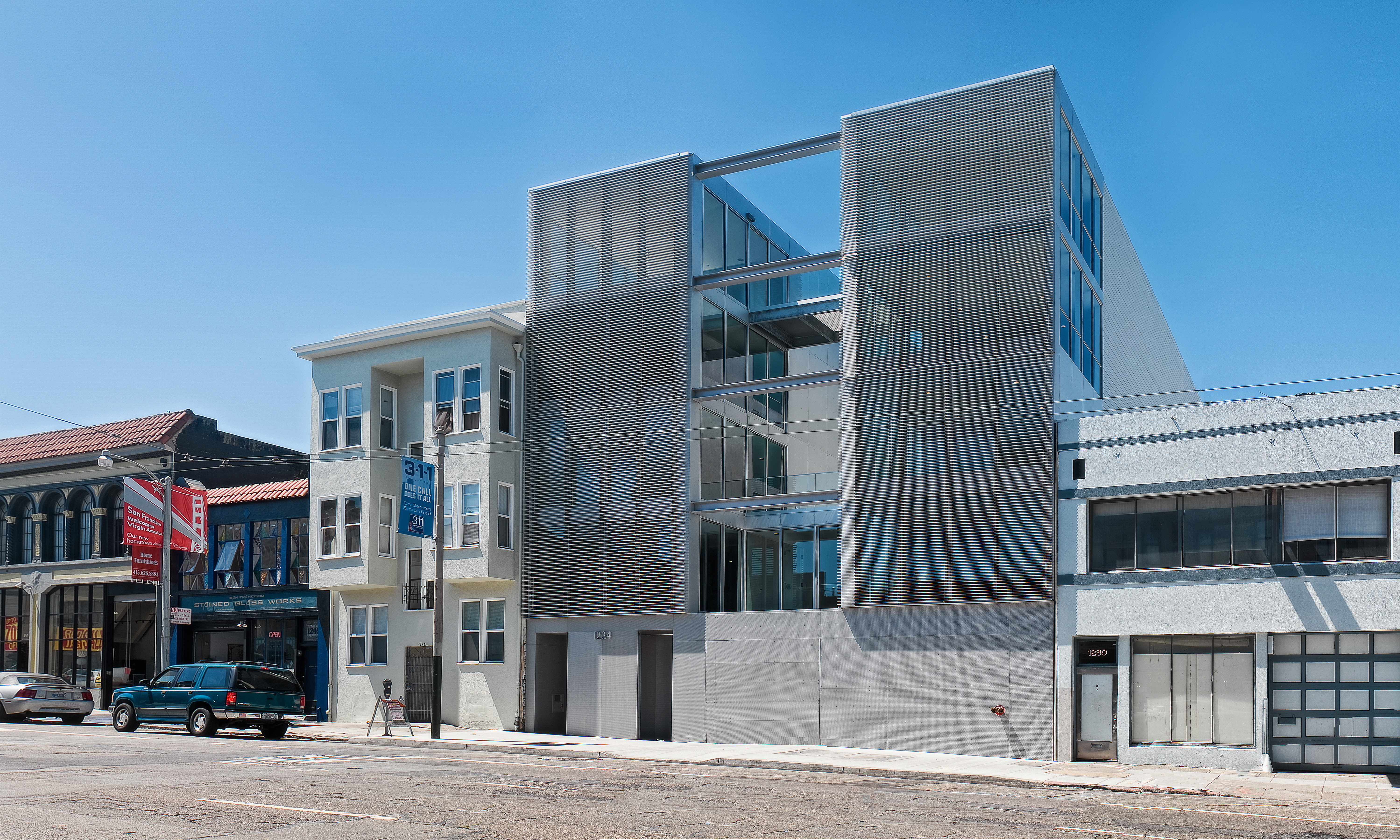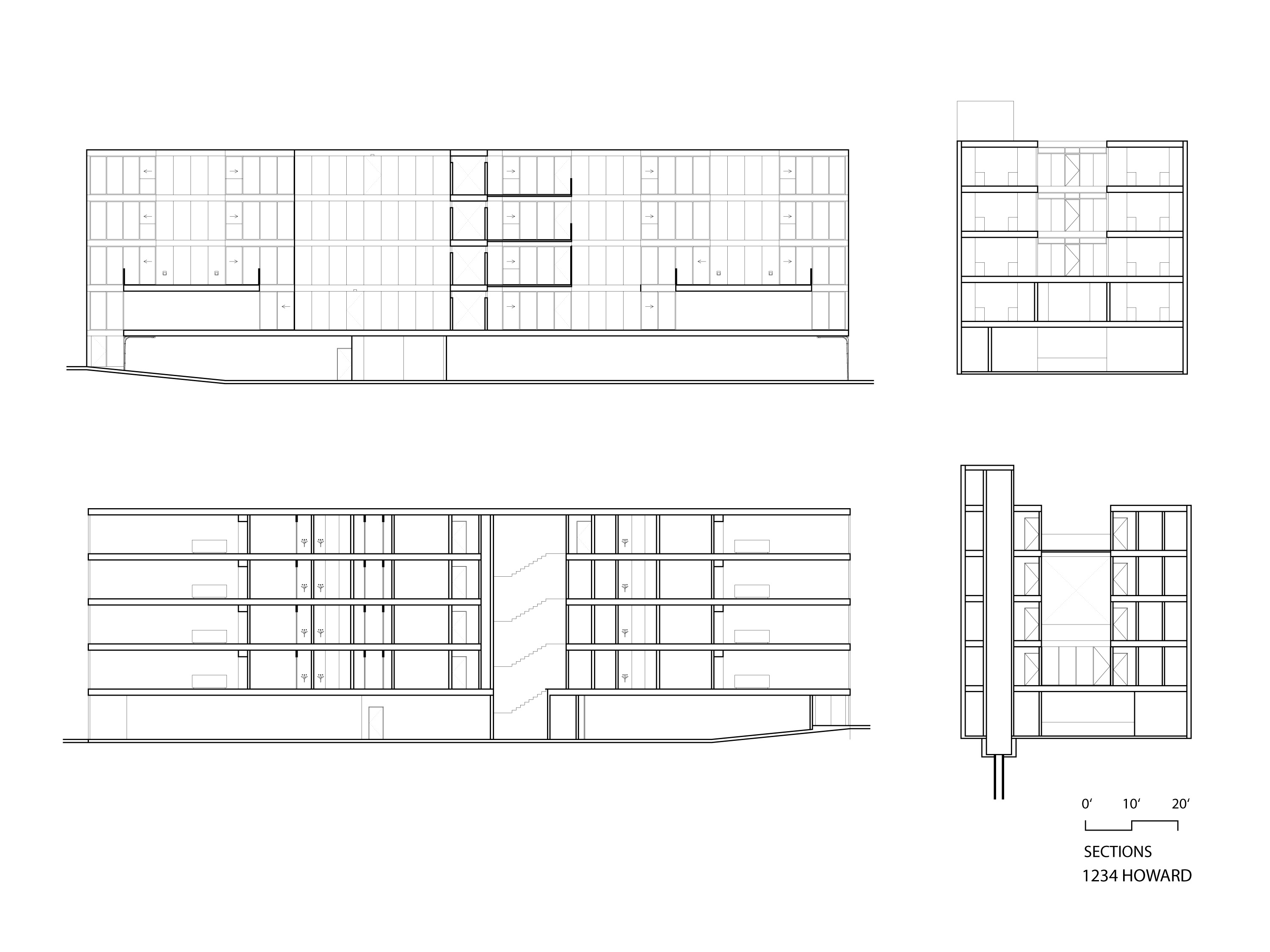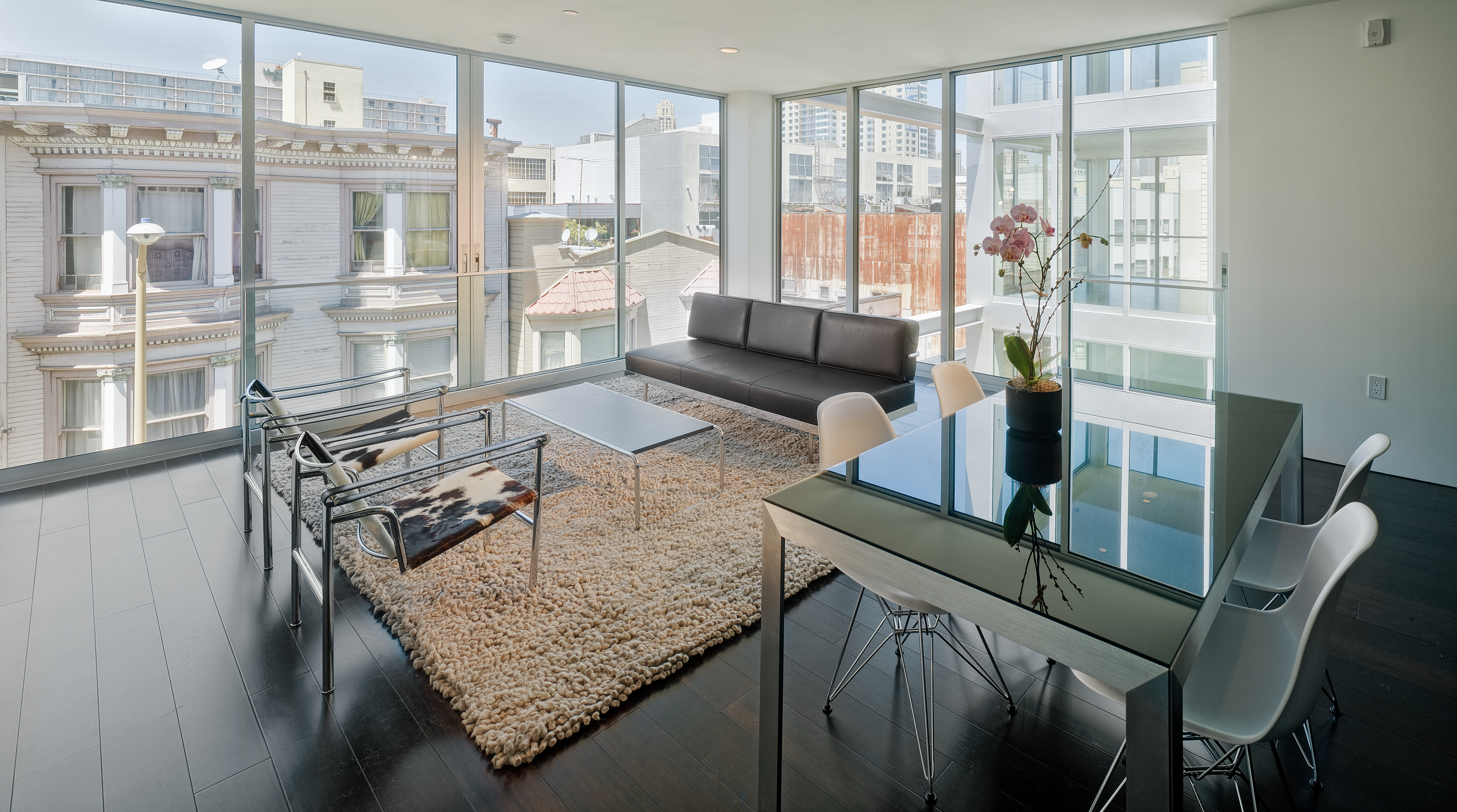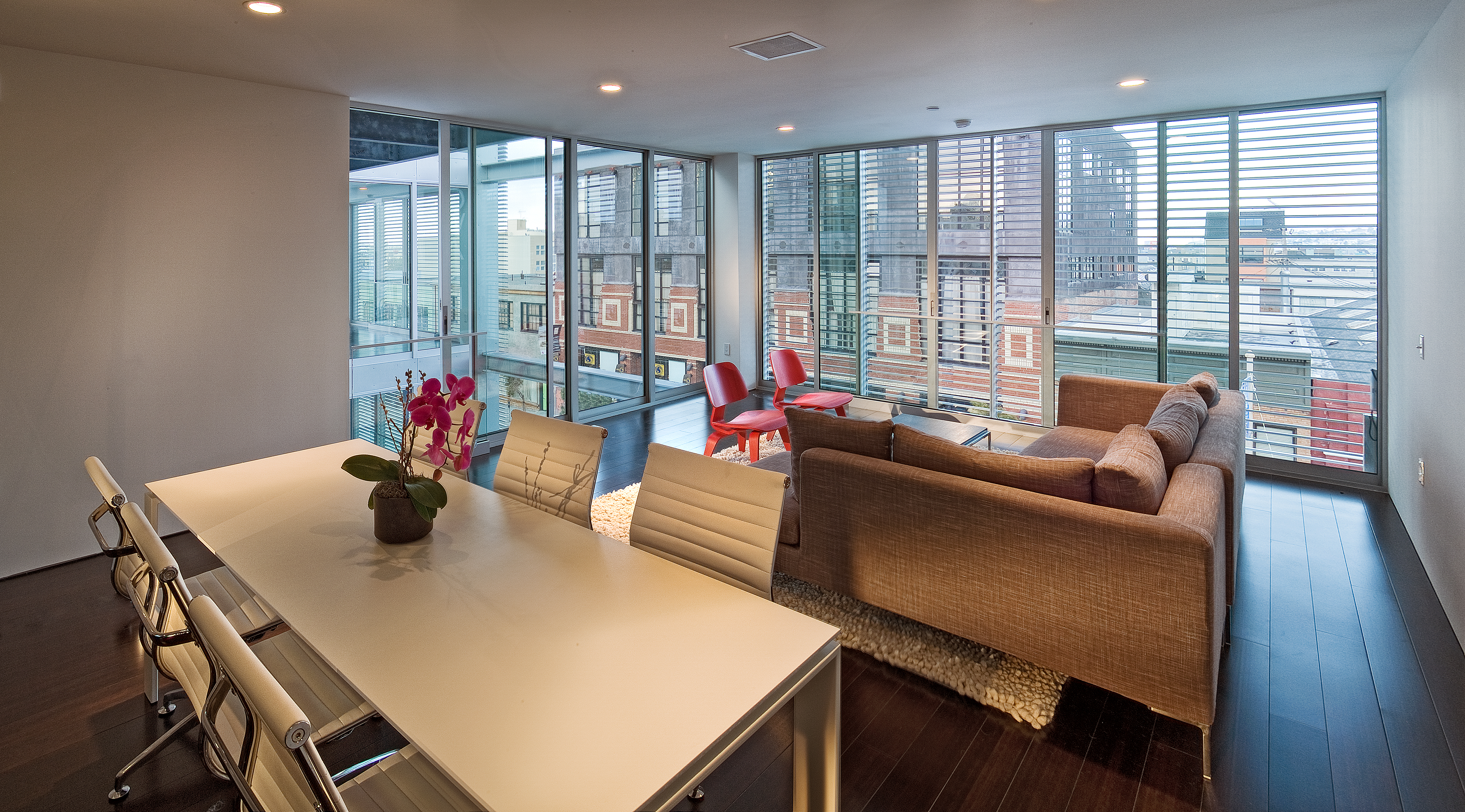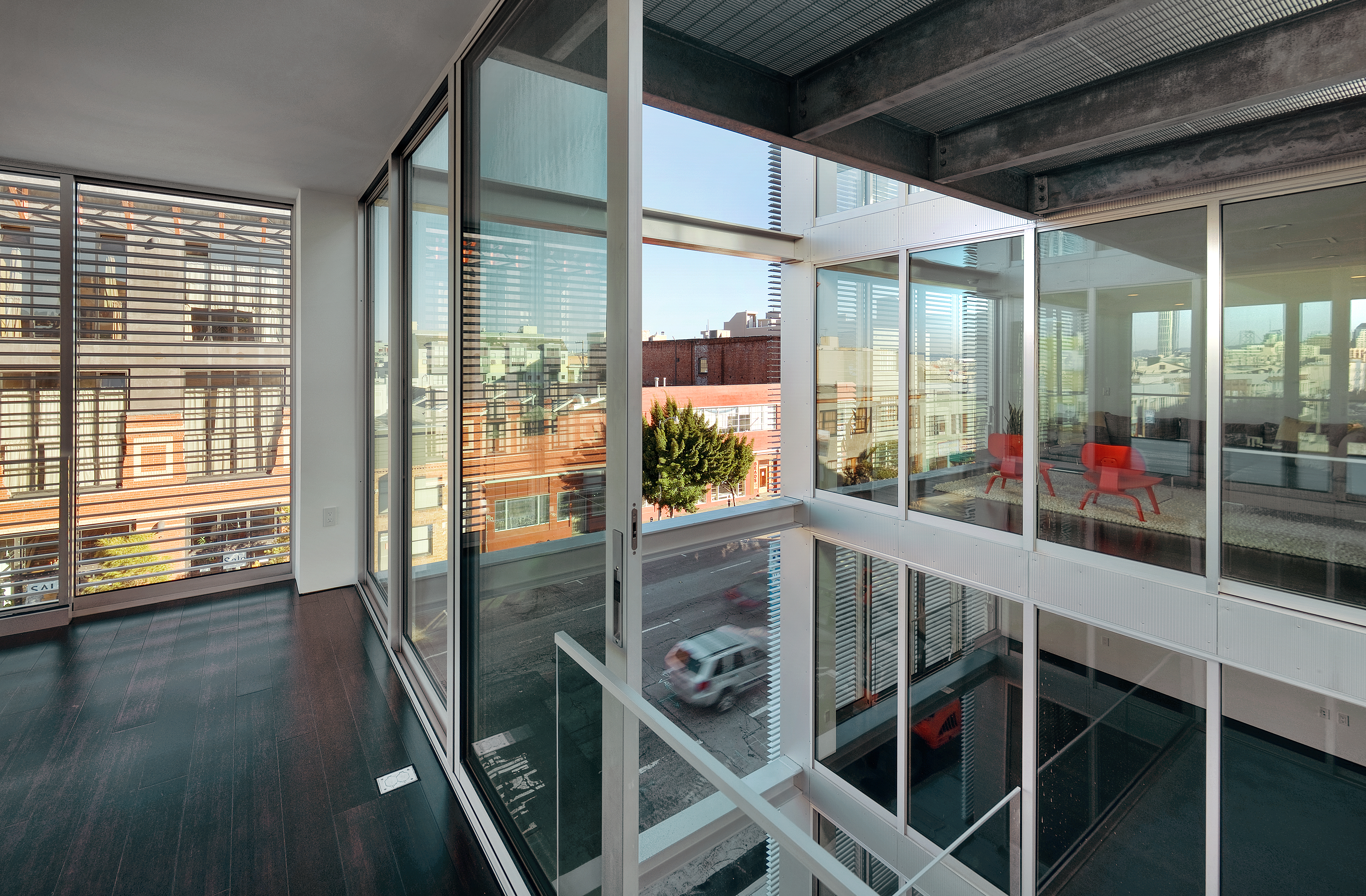 The 50-by-165 foot site stretches from Howard Street on one side to Natoma Street on the other. A one-way drive, with parking on one side and lobby and circulation on the other, links the streets. Above the drive a court is carved through the block, dividing the width of the building into three equal bars. The central bar remains empty; those on either side are again divided, into two halves. The east bar contains two-bedroom units; the west bar, which also accommodates the elevator and stairs, one-bedroom units. Floating service walls create a sense of spaciousness and indeterminacy. Bridges cross the central court, giving access from the east bar to the west bar. In a loft-saturated housing environment, this complex offers an alternative, providing more privacy to accommodate family living. Unlike typical urban housing, these units have abundant light from windows along the length of the court.