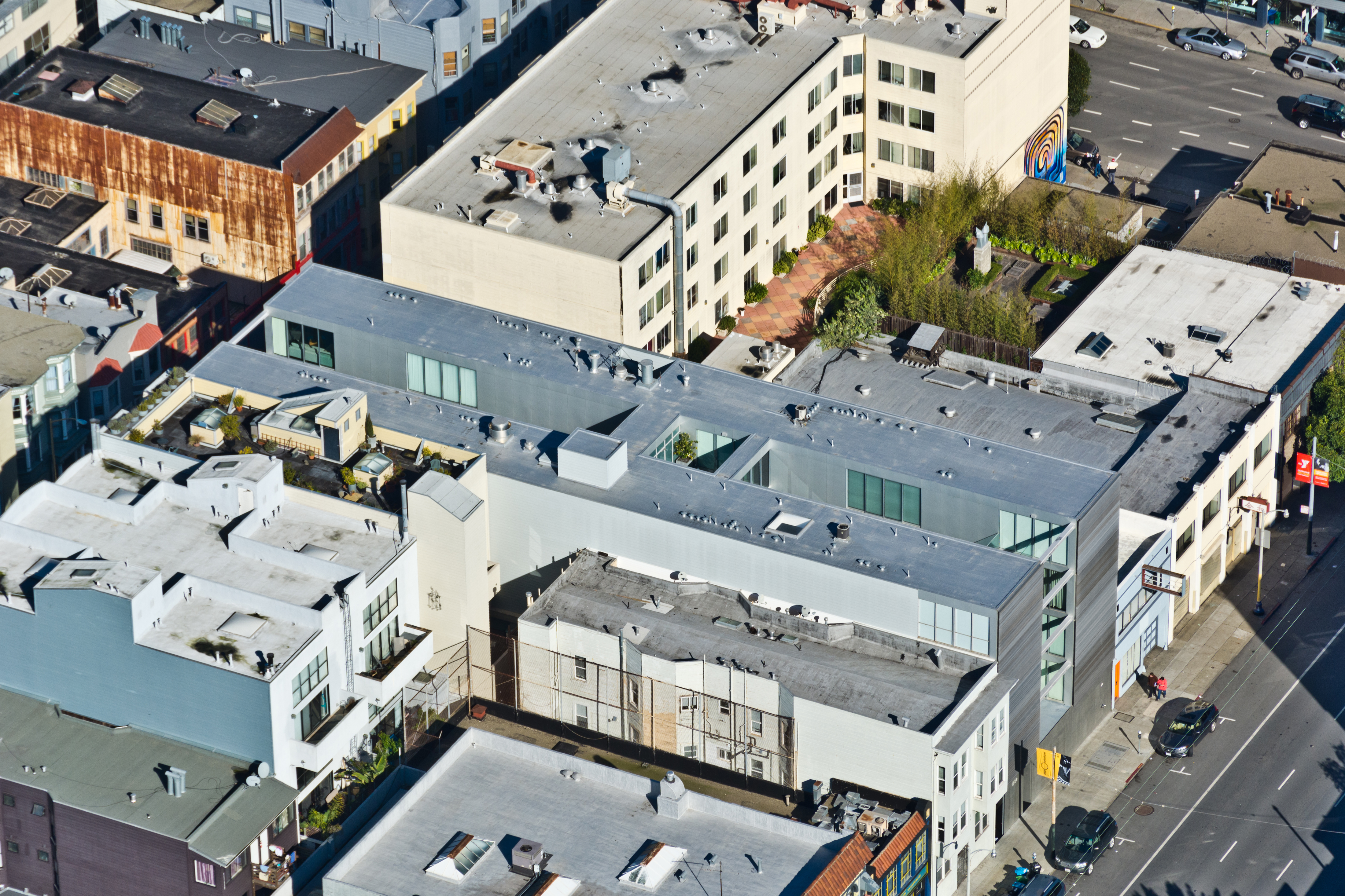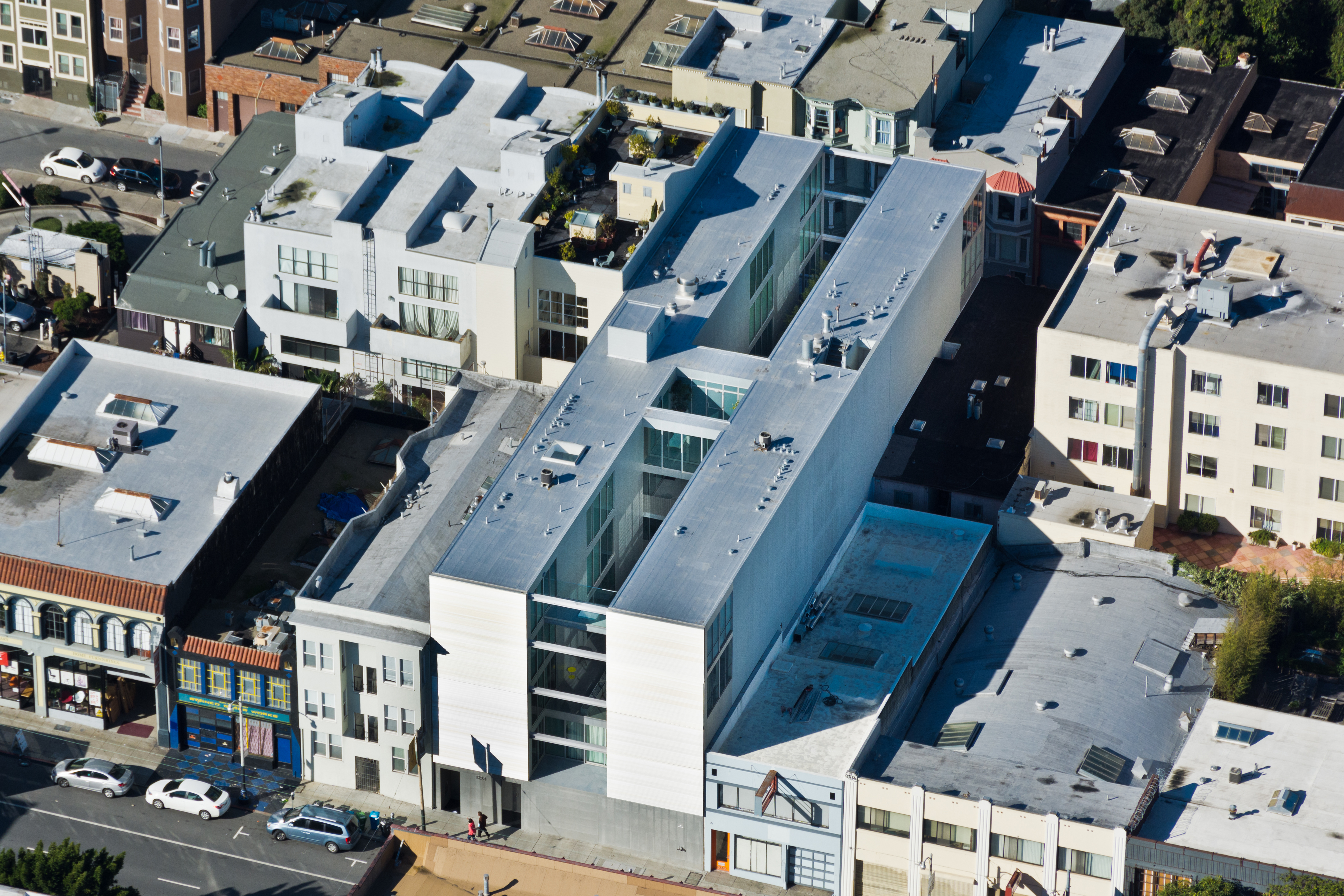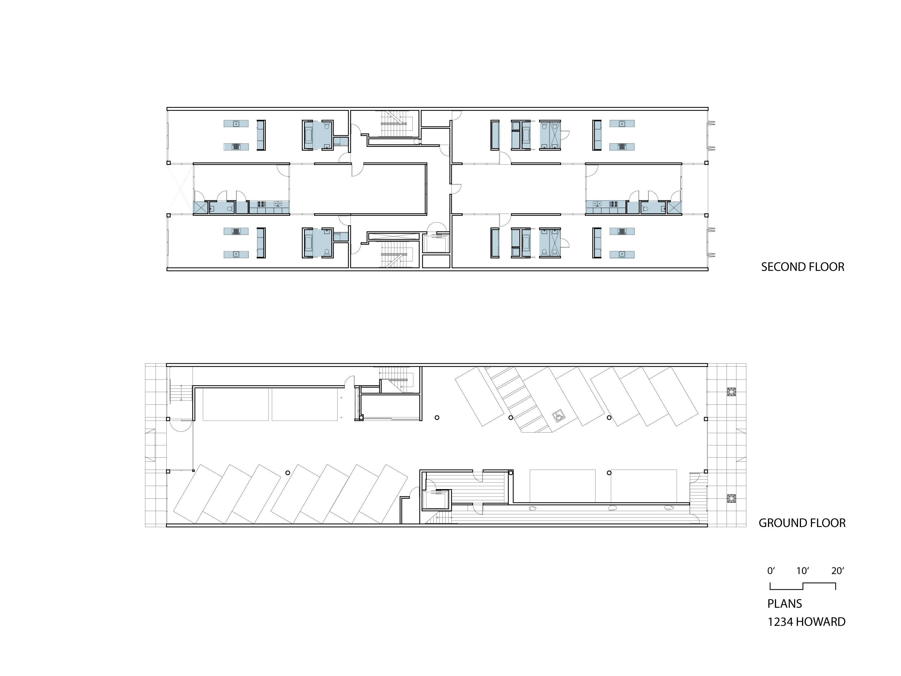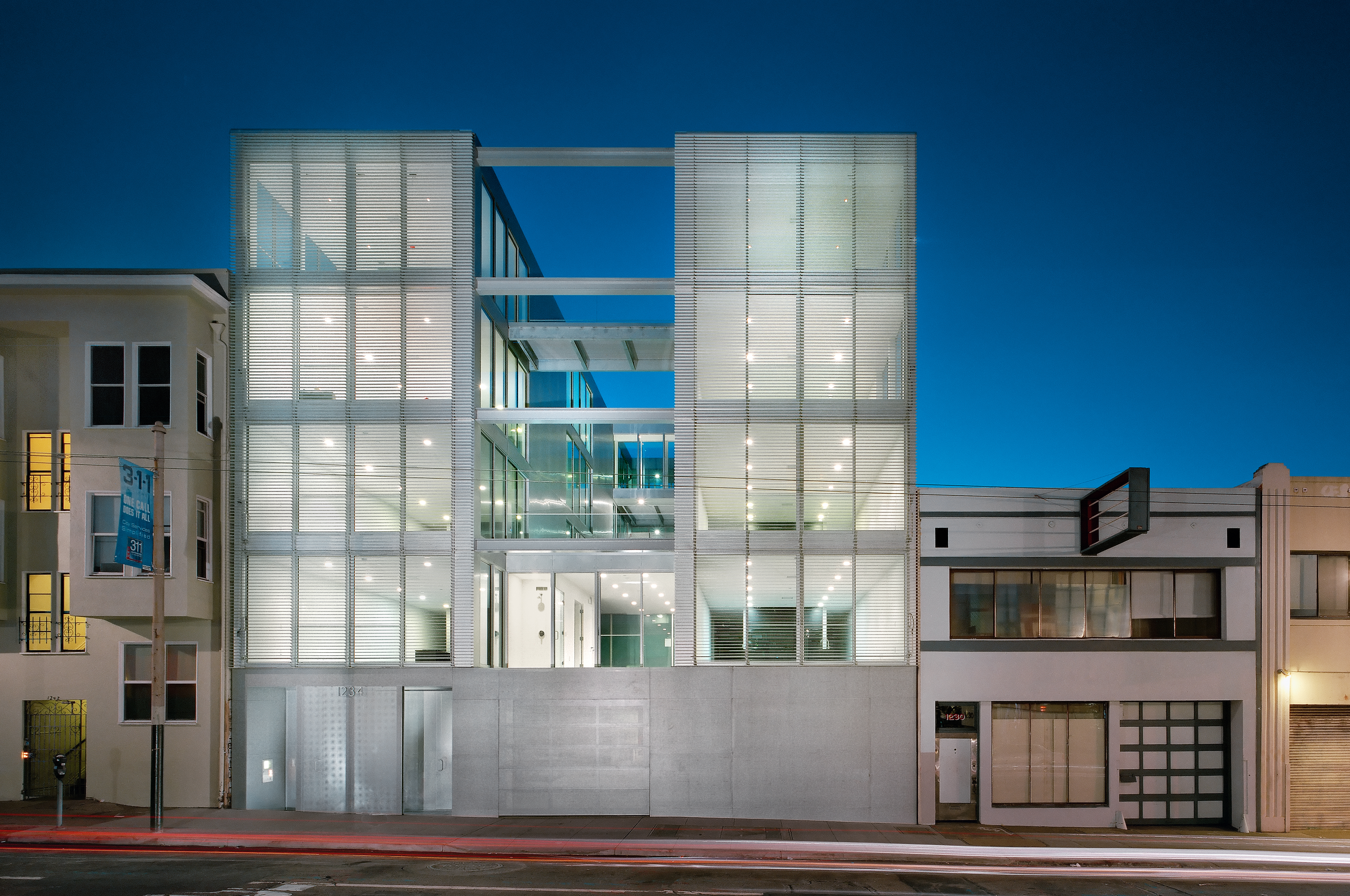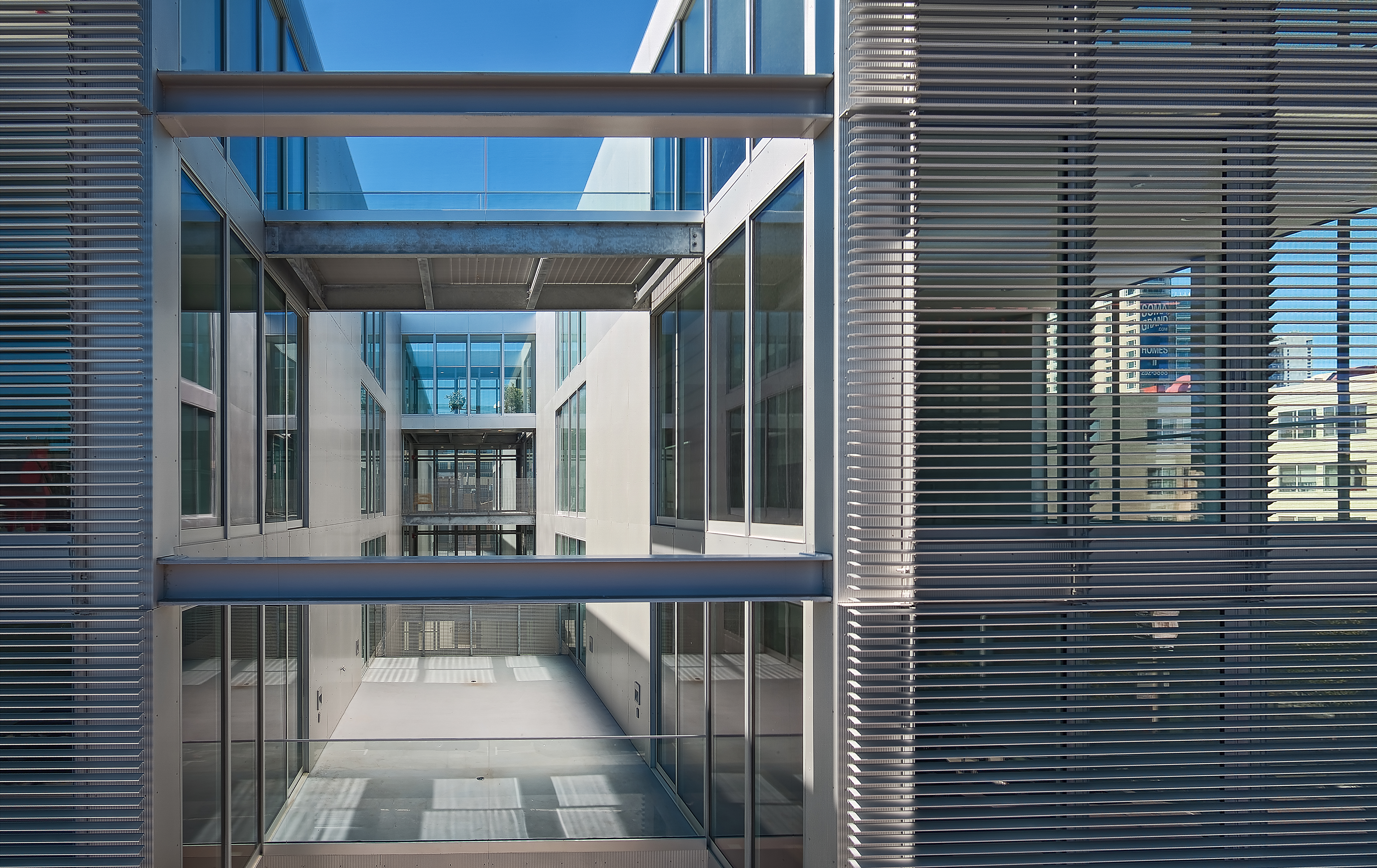 The 50-by-165 foot site stretches from Howard Street on one side to Natoma Street on the other. A one-way drive, with parking on one side and lobby and circulation on the other, links the streets. Above the drive a court is carved through the block, dividing the width of the building into three equal bars. The central bar remains empty; those on either side are again divided, into two halves. The east bar contains two-bedroom units; the west bar, which also accommodates the elevator and stairs, one-bedroom units. Floating service walls create a sense of spaciousness and indeterminacy. Bridges cross the central court, giving access from the east bar to the west bar. In a loft-saturated housing environment, this complex offers an alternative, providing more privacy to accommodate family living. Unlike typical urban housing, these units have abundant light from windows along the length of the court.