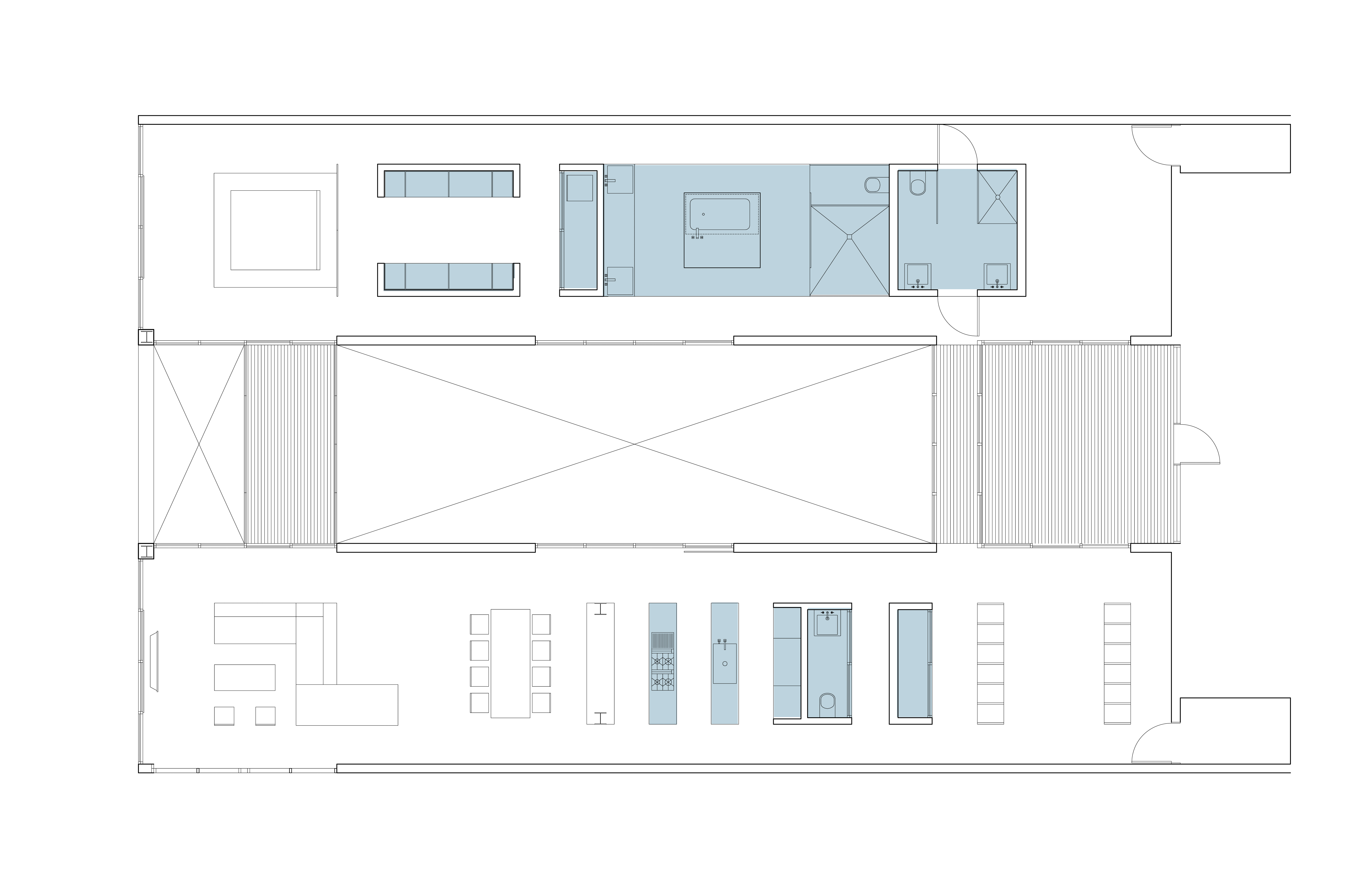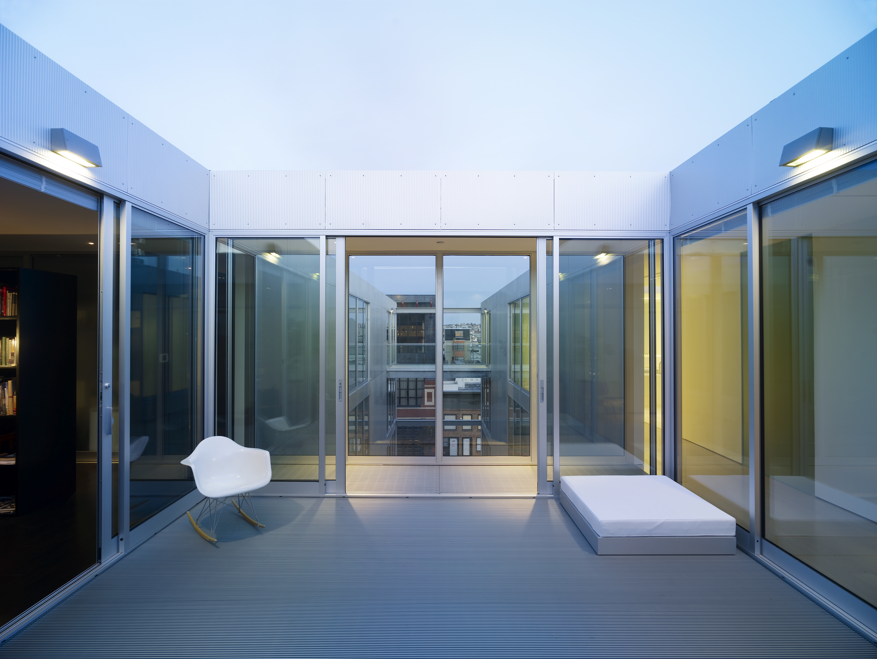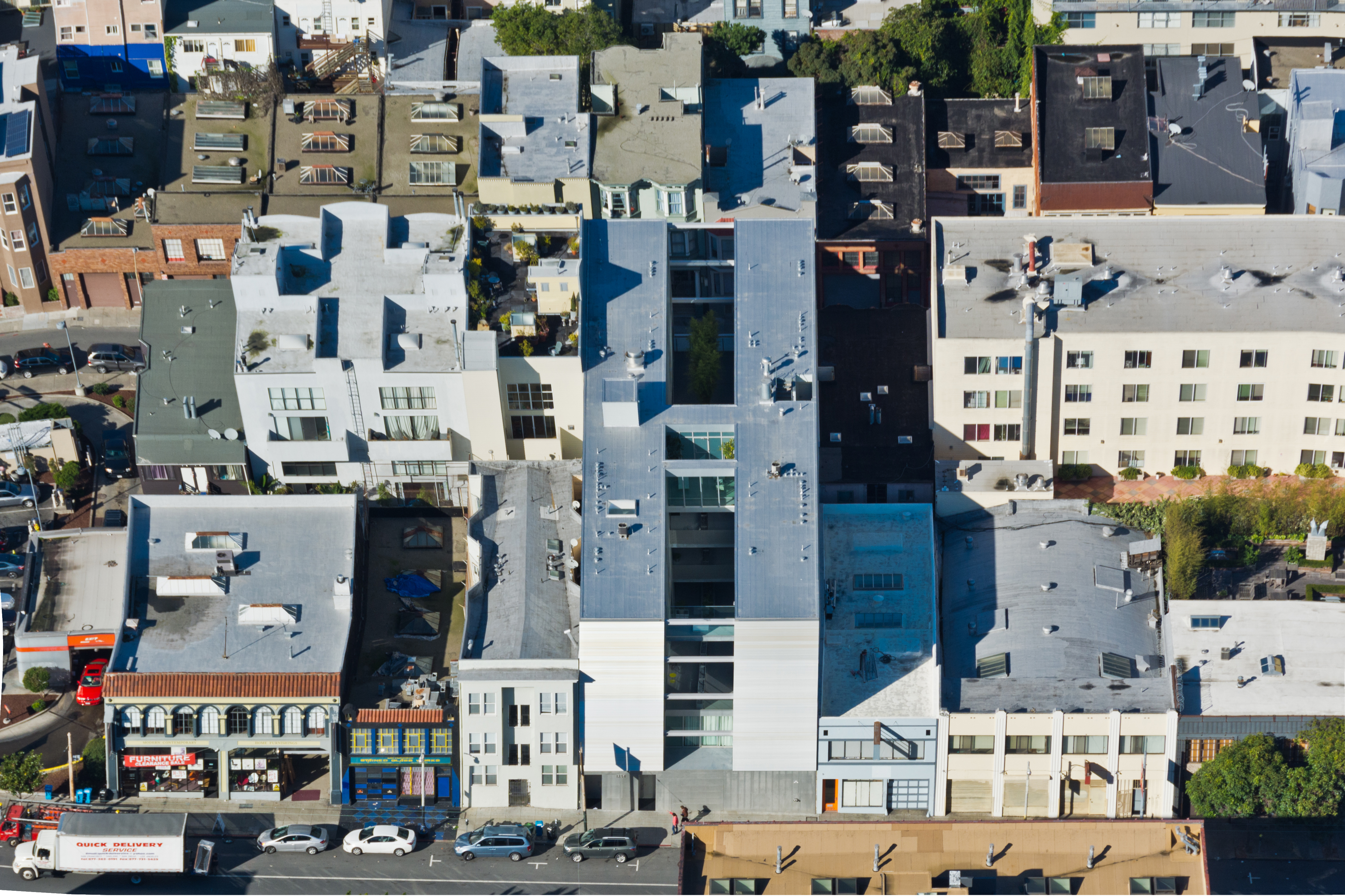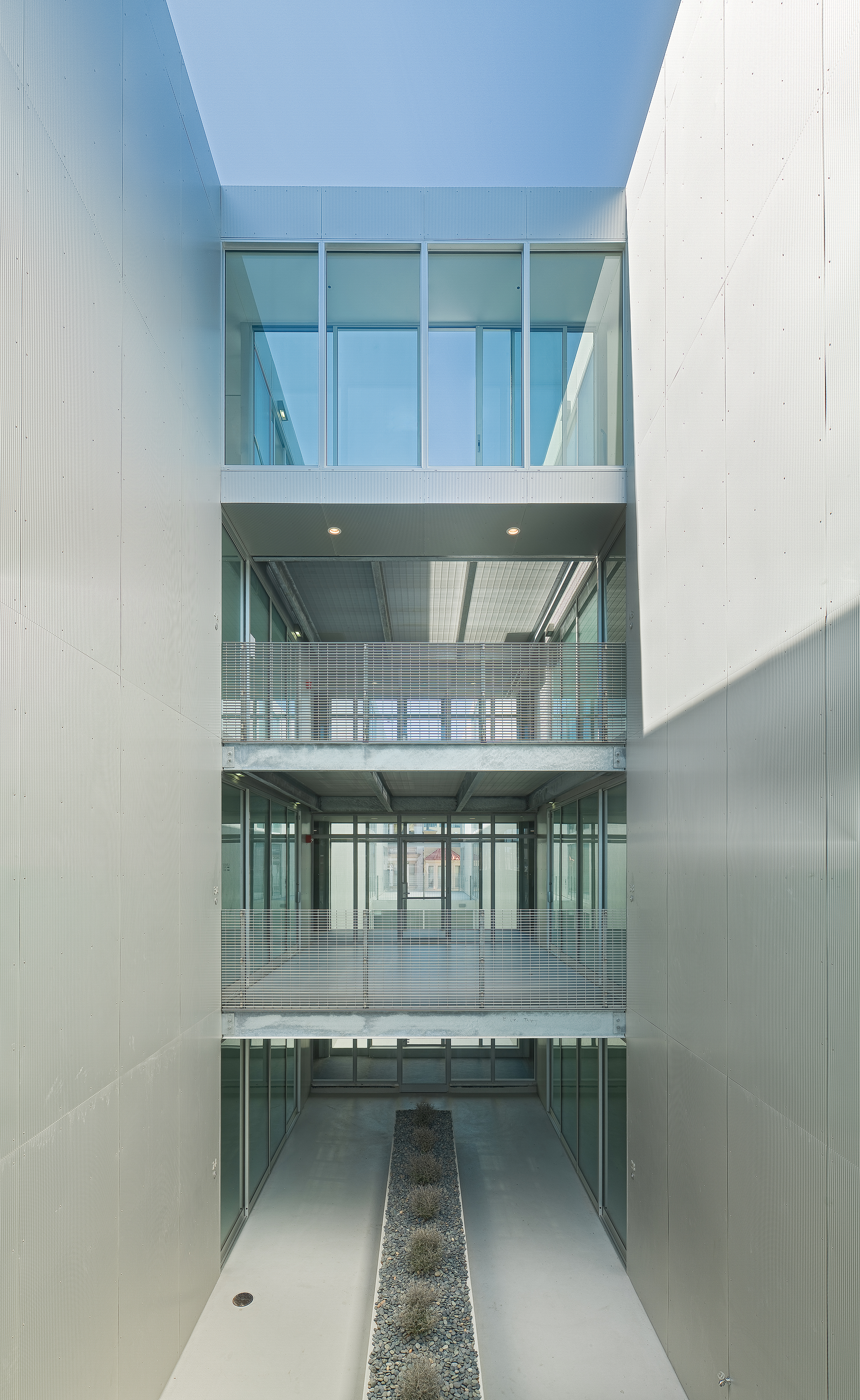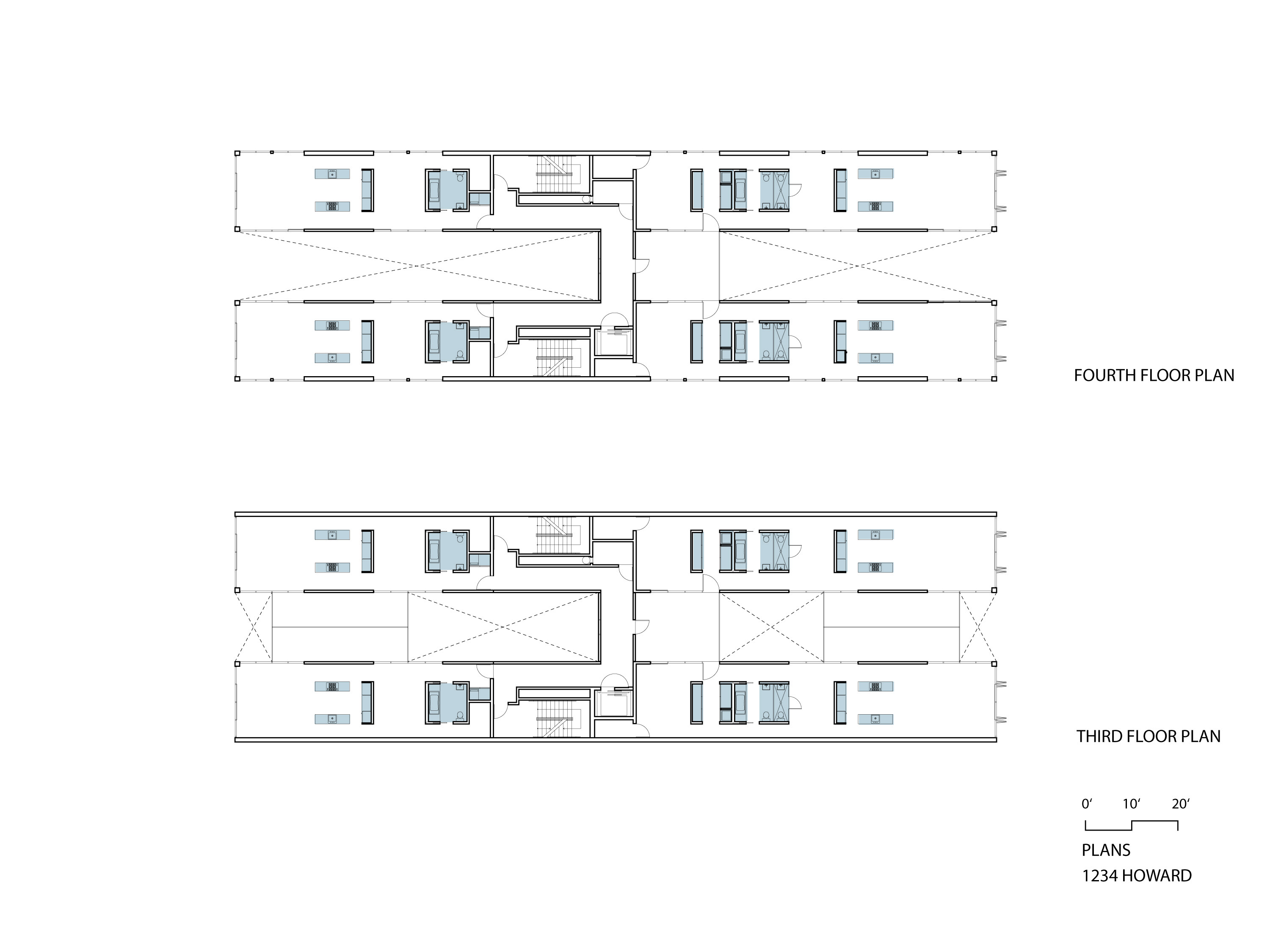 The 50-by-165 foot site stretches from Howard Street on one side to Natoma Street on the other. A one-way drive, with parking on one side and lobby and circulation on the other, links the streets. Above the drive a court is carved through the block, dividing the width of the building into three equal bars. The central bar remains empty; those on either side are again divided, into two halves. The east bar contains two-bedroom units; the west bar, which also accommodates the elevator and stairs, one-bedroom units. Floating service walls create a sense of spaciousness and indeterminacy. Bridges cross the central court, giving access from the east bar to the west bar. In a loft-saturated housing environment, this complex offers an alternative, providing more privacy to accommodate family living. Unlike typical urban housing, these units have abundant light from windows along the length of the court.