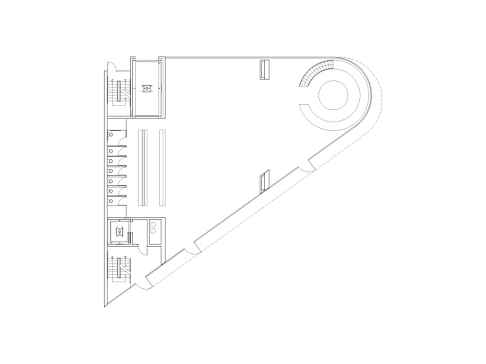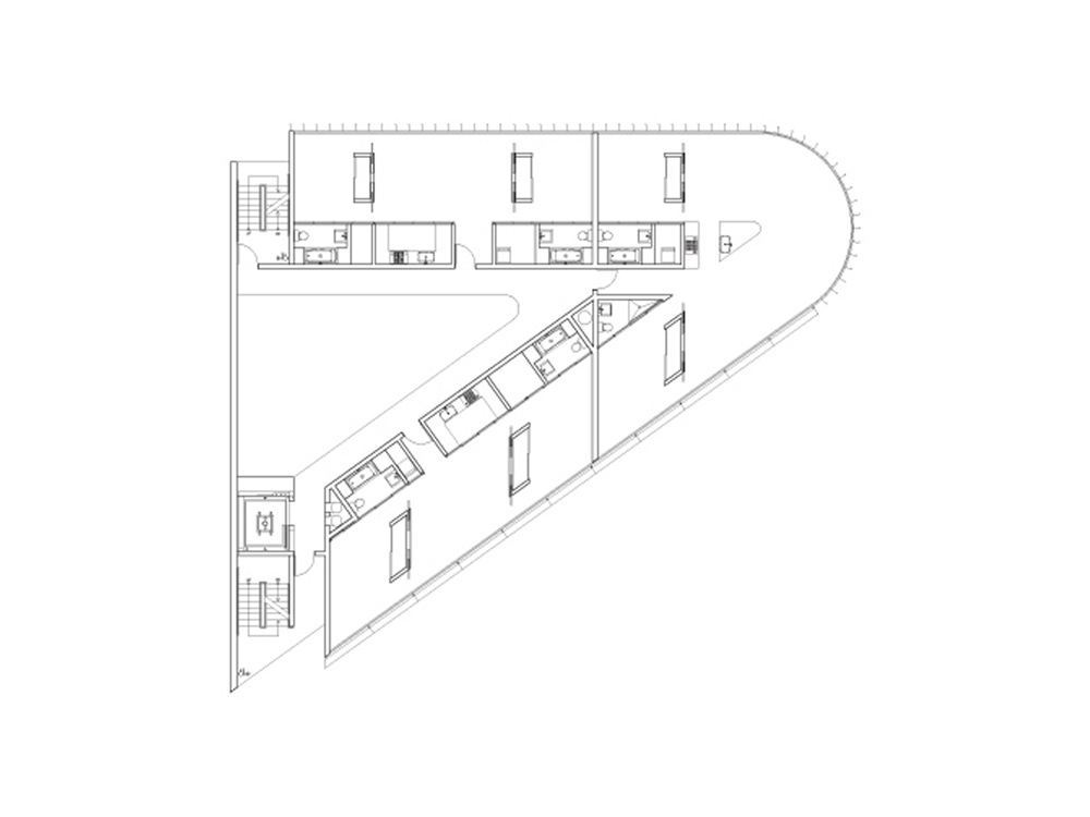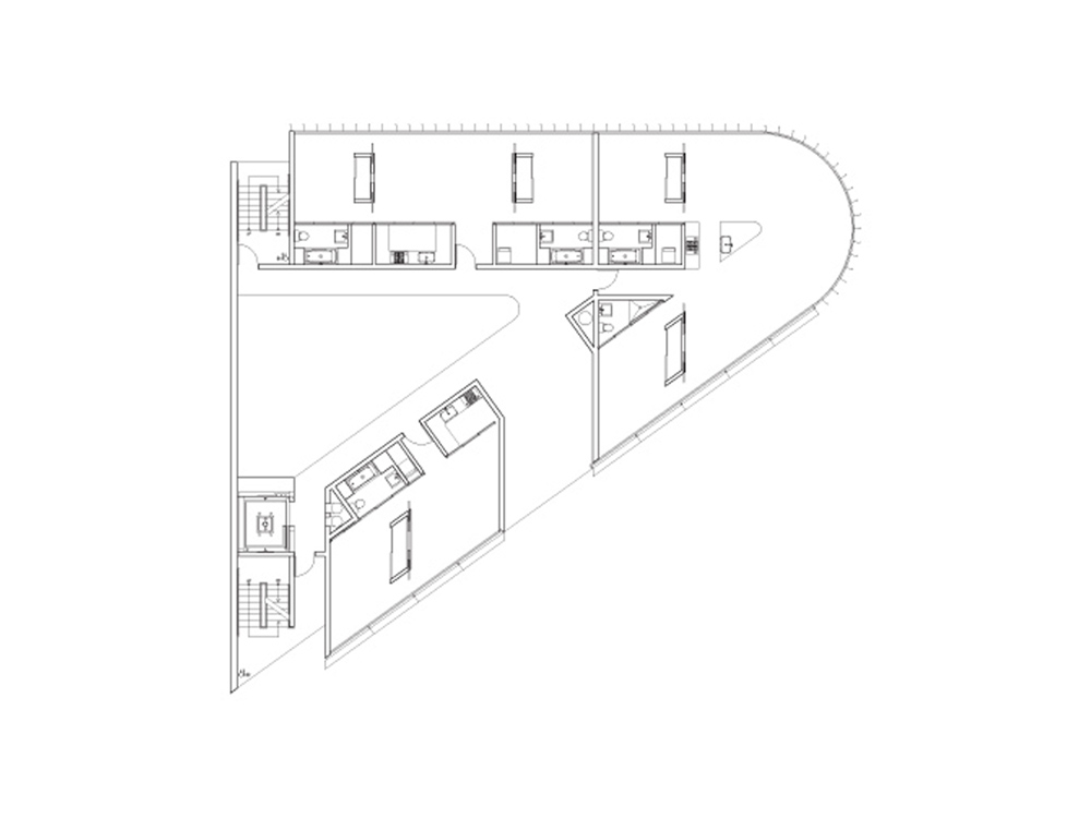 The rectangular South of Market street grid intersects the older northern grid diagonally at Market Street, creating a series of triangular sites at the points of connection. This is one of those triangular lots at the corner of Market and Page Streets. This flatiron site is lined with thick wall units along the two frontages, creating a smaller triangular rear yard at the center of the lot.