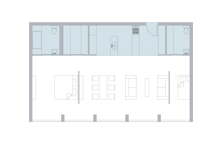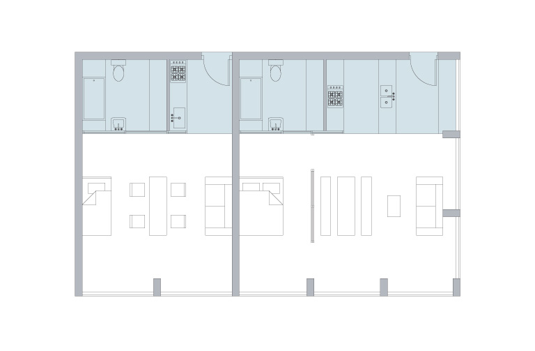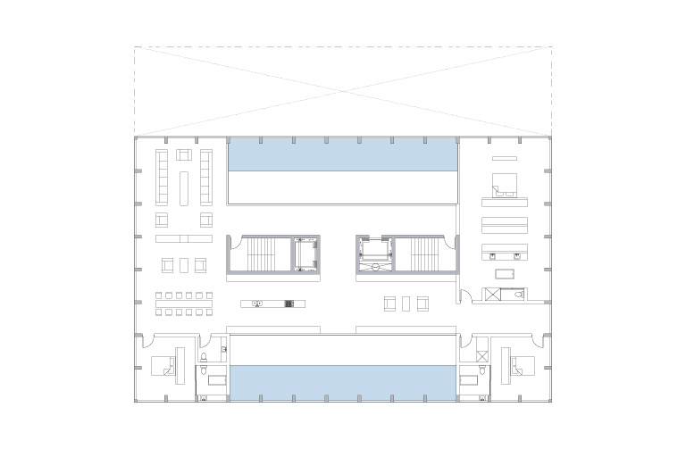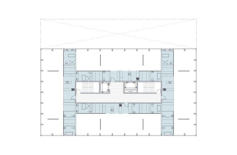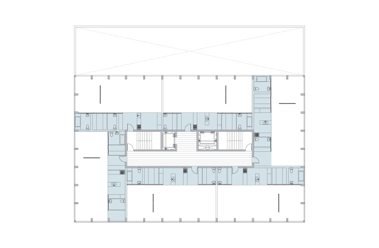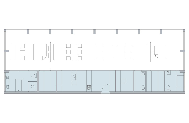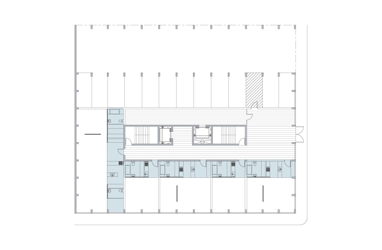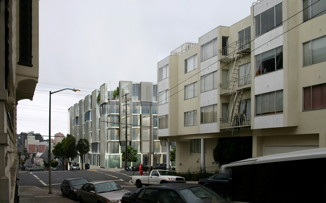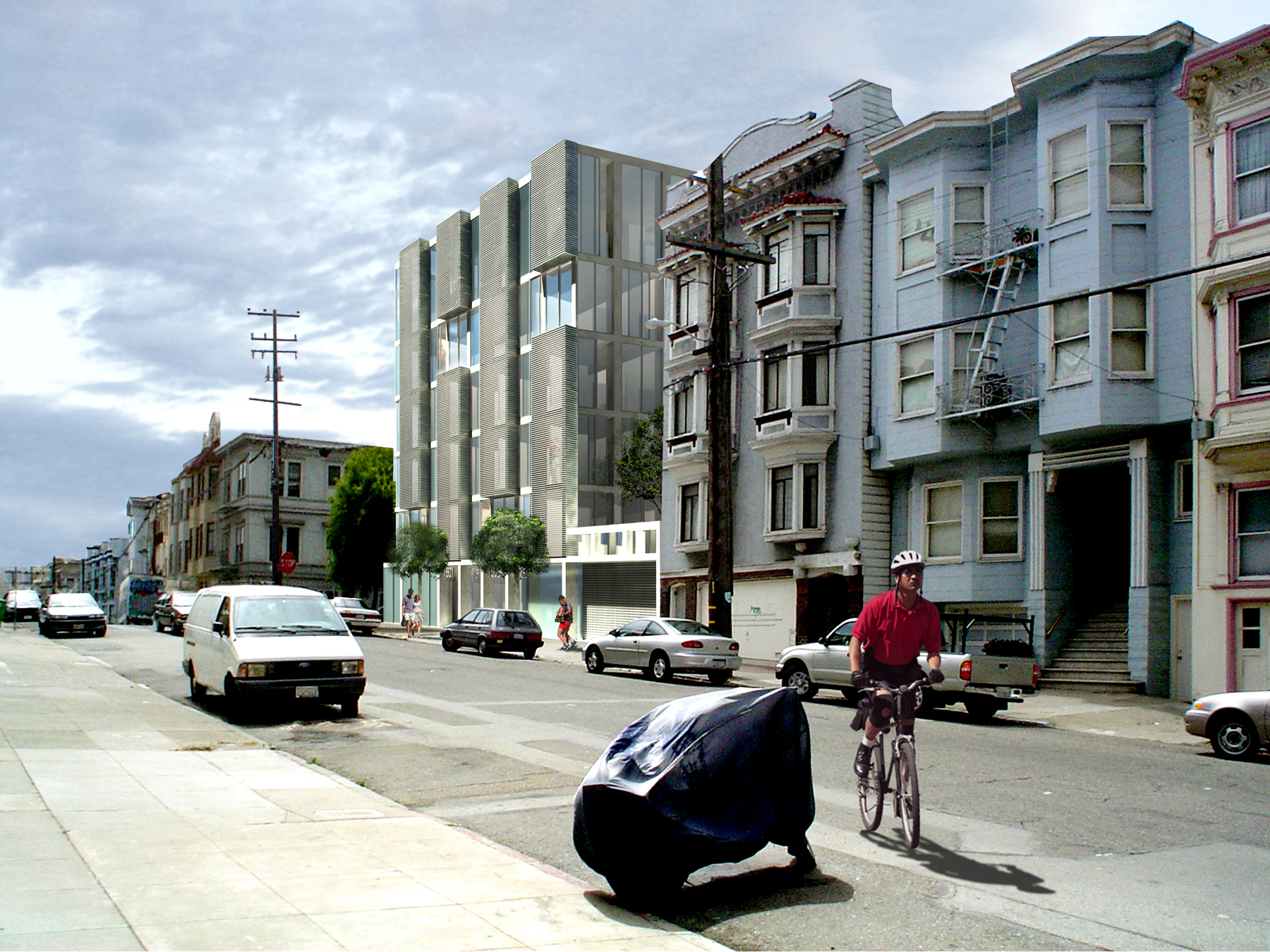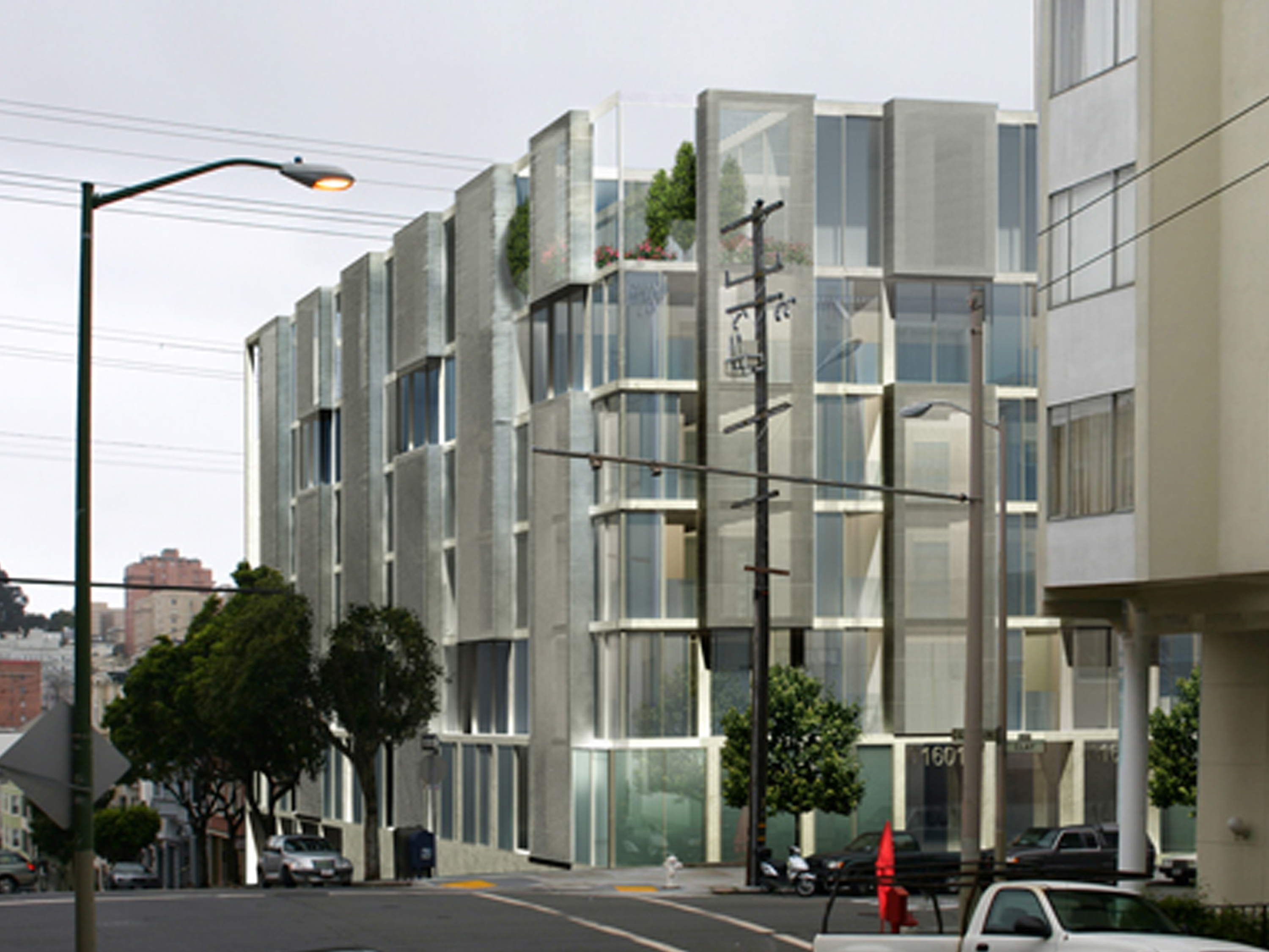 1601 Larkin is a further exploration of the thickened wall/open space type that originated with 1022 Natoma Street. The building is a hybrid, a combination of loft and apartment, offering the neutral space of a warehouse along with areas that allow separation and compressed services. The services, accommodating both vertical and horizontal distribution for mechanical, electrical, plumbing, and sprinkler systems, line the access core. This is efficient and cost-effective, providing optimal indeterminate space. The habitable rooms fold out of the service bar as continuous open area divided by floating walls and sliding doors. The lowest point of the site, on Clay Street, is the entrance to basement parking. On the Larkin Street side are the lobby and a second level of parking. Five smaller units are on the first floor; the second, third, and fourth levels each have six units cartwheeling around the core. The fifth floor has four larger units, and the sixth, an H-shaped, six-thousand-square-foot penthouse with courtyards facing north and south. The exterior is a concrete frame. Alternating clear- and channel-glass bays connect to the rhythmic streetscape of the area.