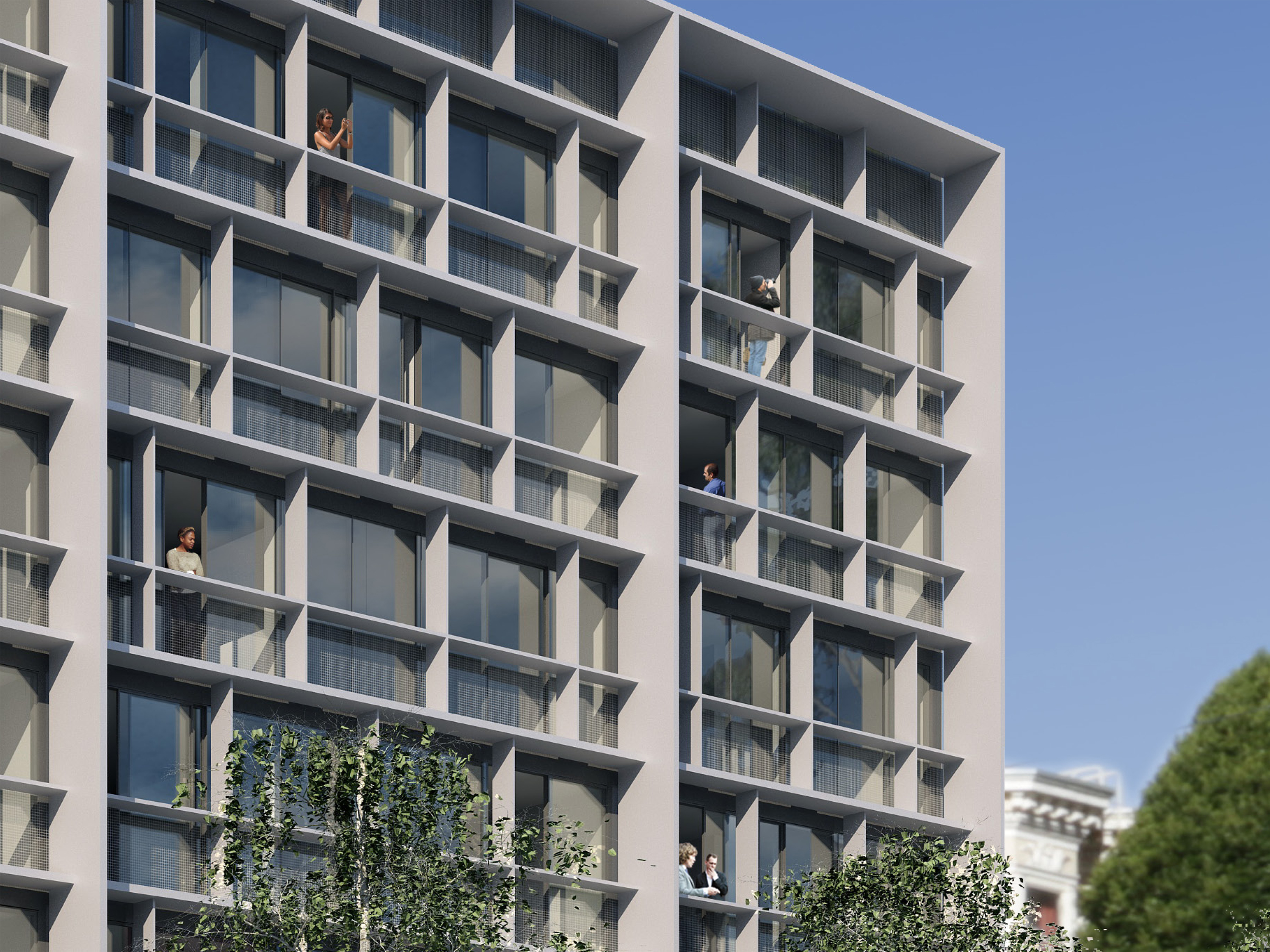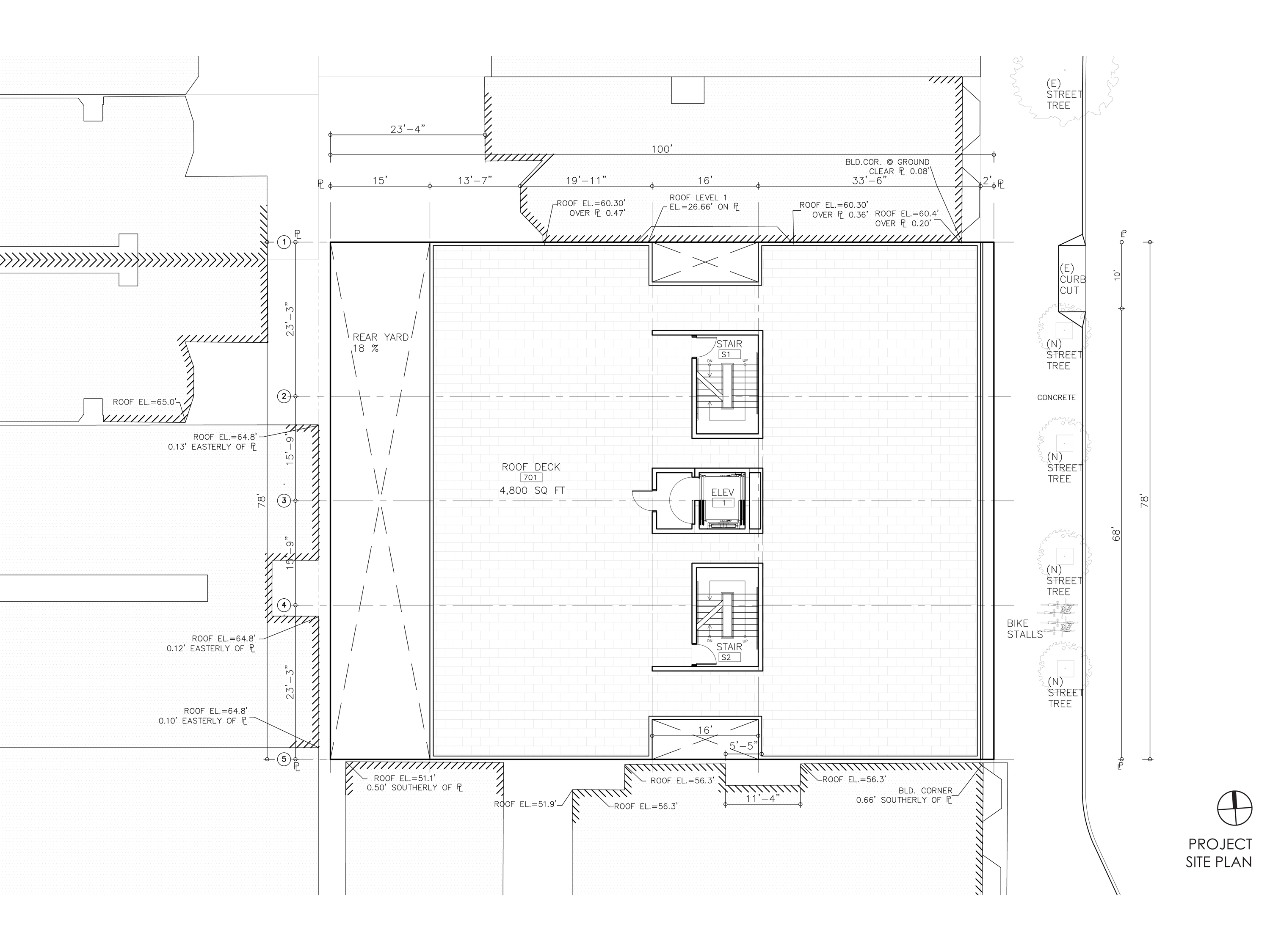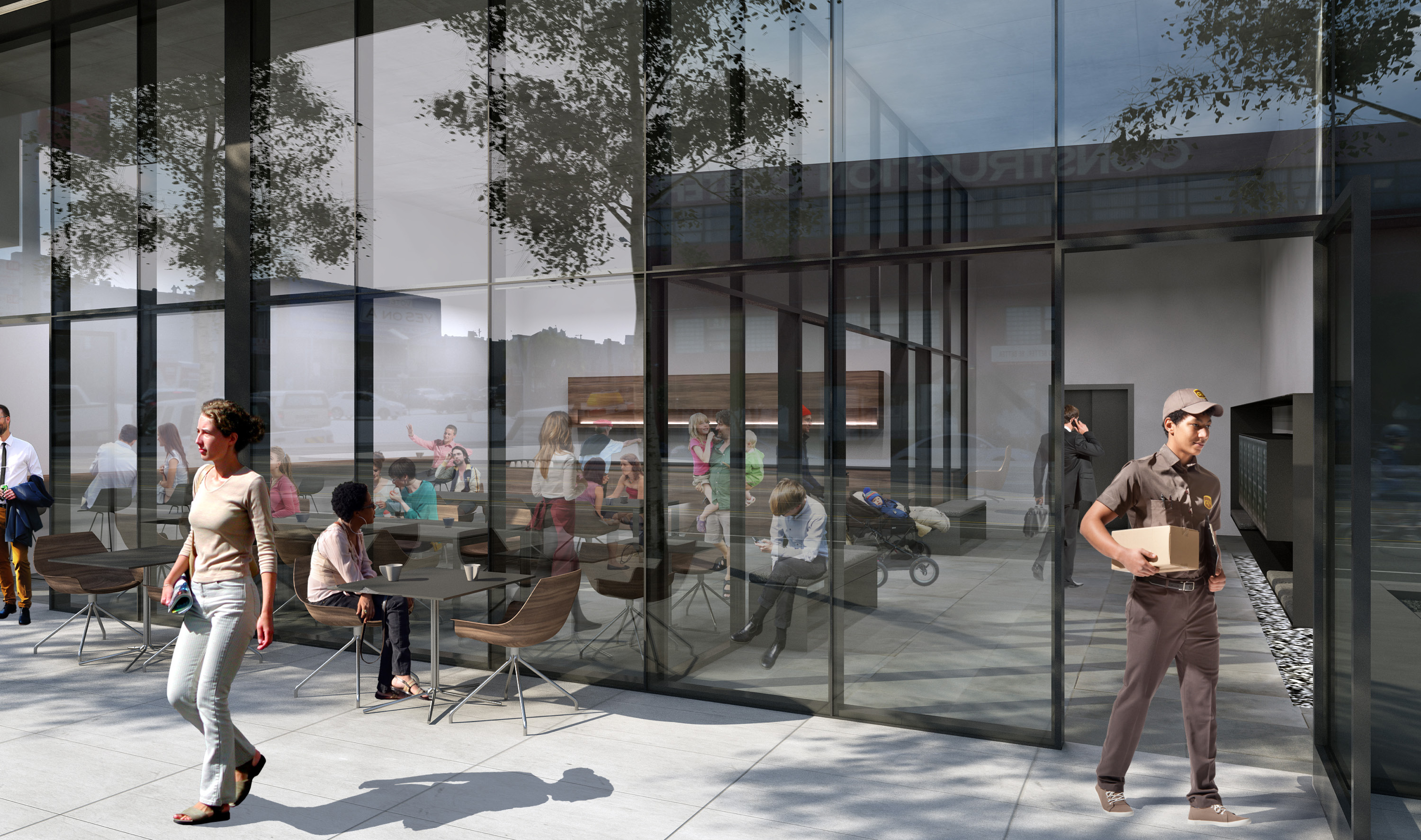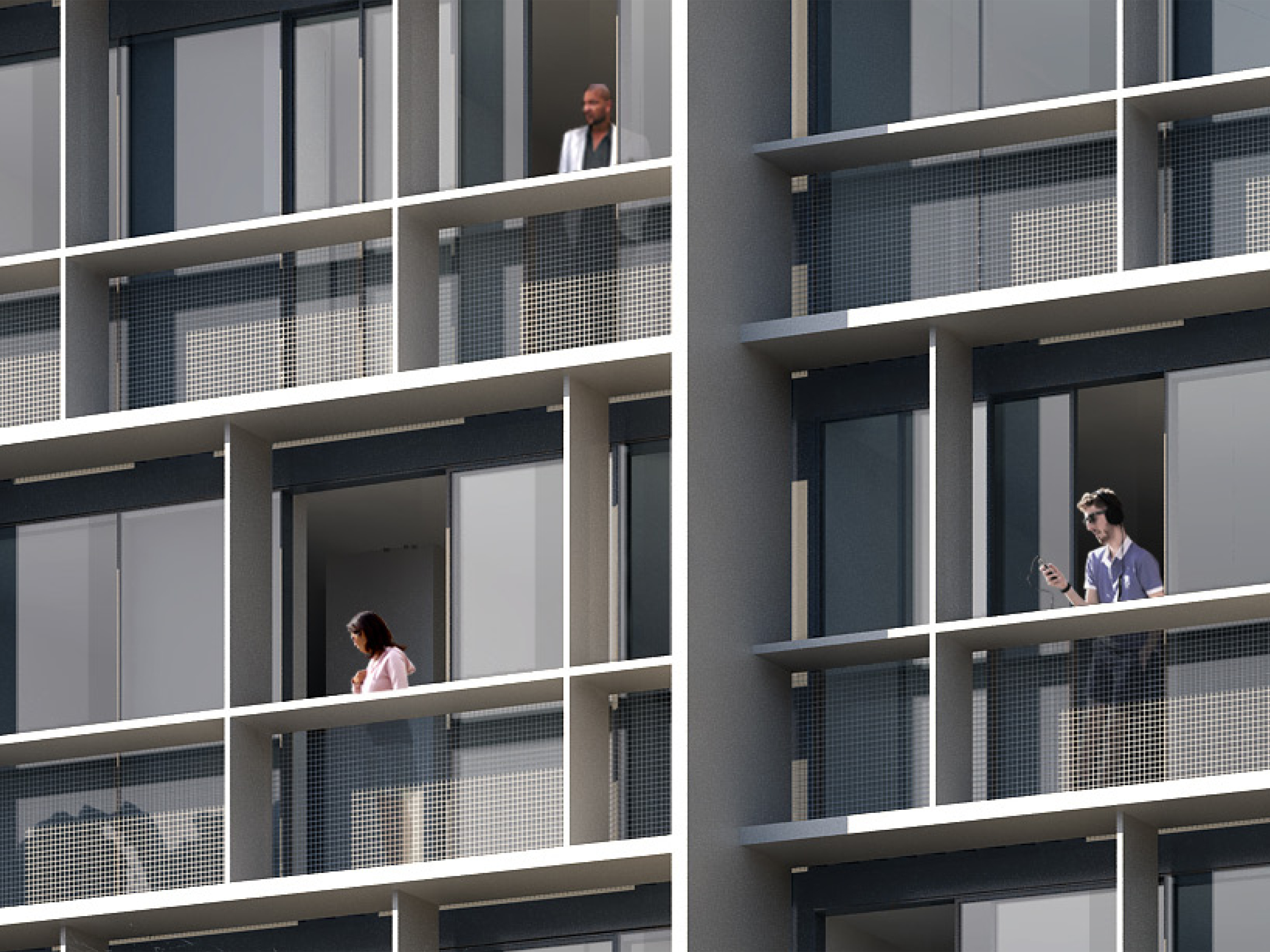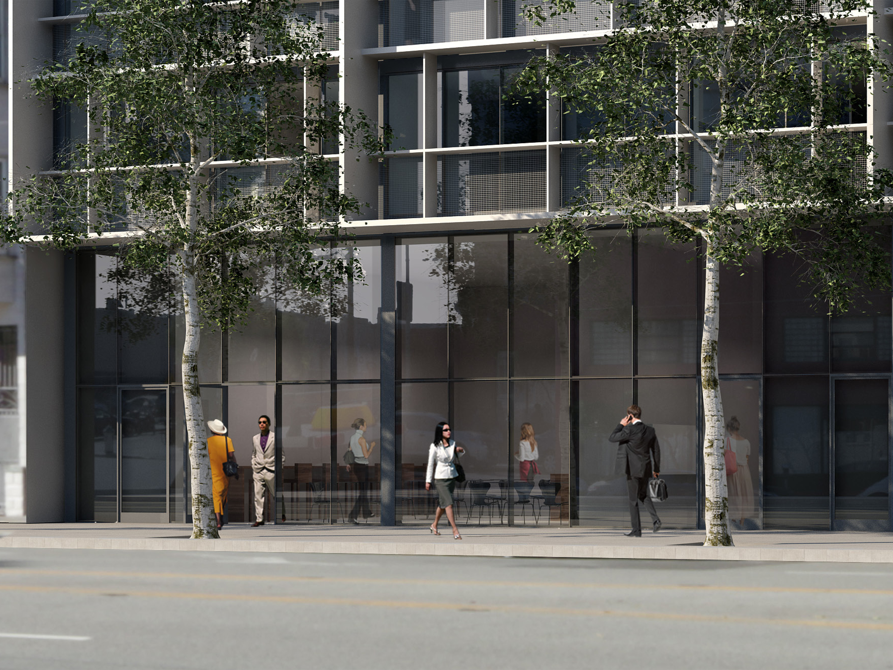 The ground floor has retail space which connects to the building lobby, with parking set back from the street at the rear of the lot. Each of the four corners of the building are two bedroom pod units with second bedrooms adjacent to light courts, one of which matches the light court of the neighboring building. Between these four bedroom corner units, on the lower levels, four thickened wall studio units fill in the center. On the top two levels these are combine to make larger two bedroom units.