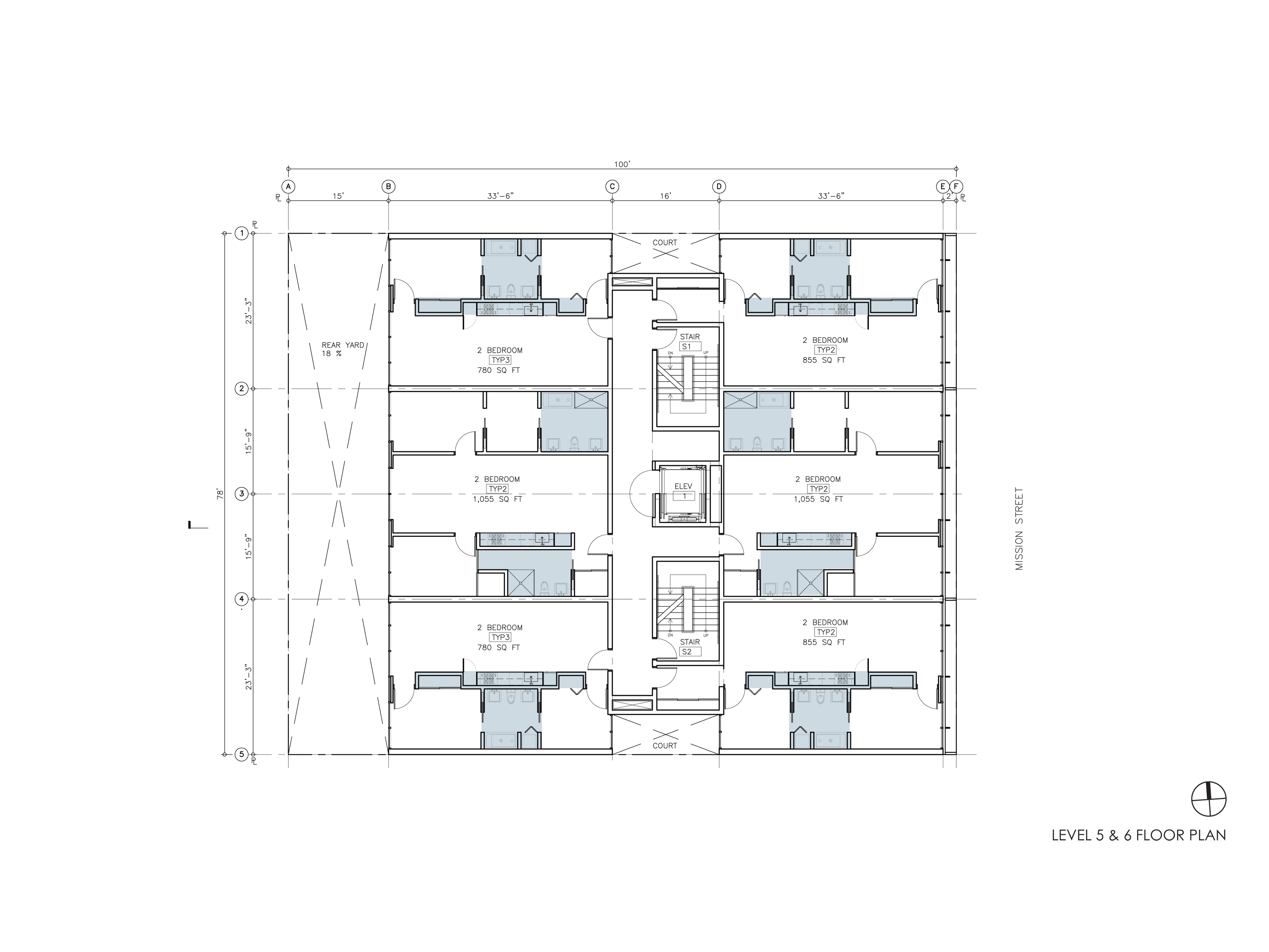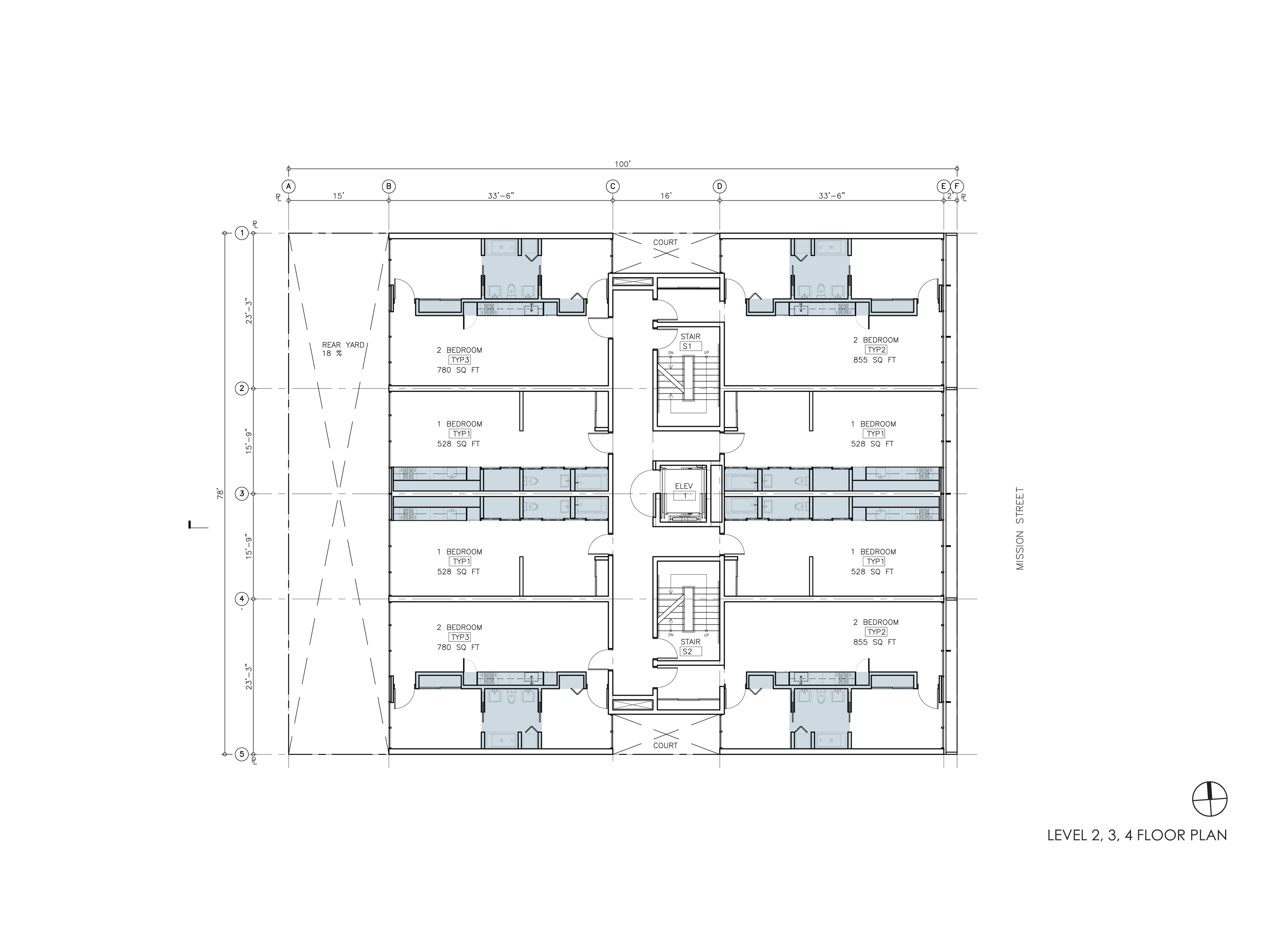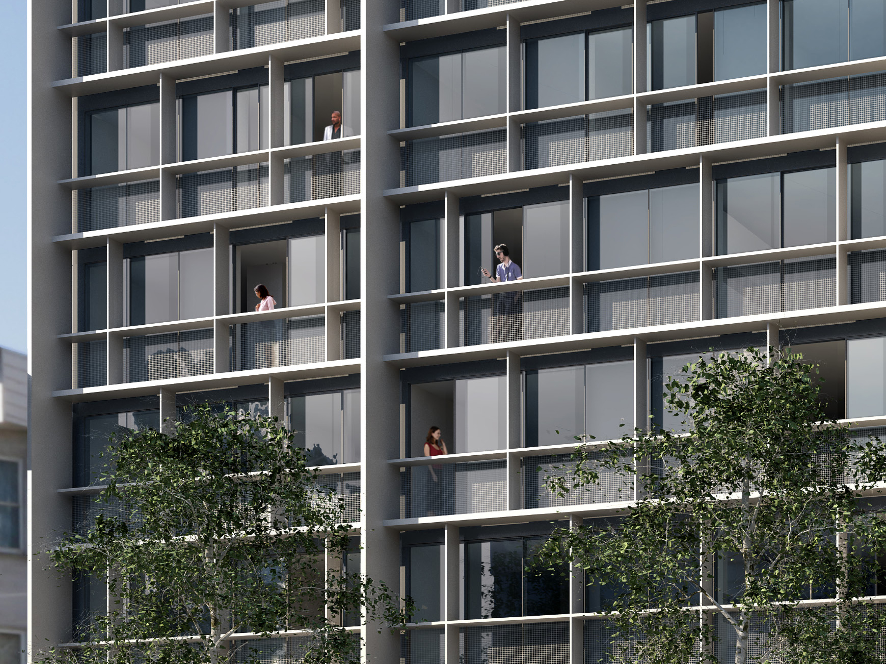 1726 Mission is a half a block from the last elevated section of the 101 Freeway, close to the Mission St off ramp. A grid of baffles deflects sound from the glazed façade. Sliding doors open to provide ‘French Balconies’ to the units.