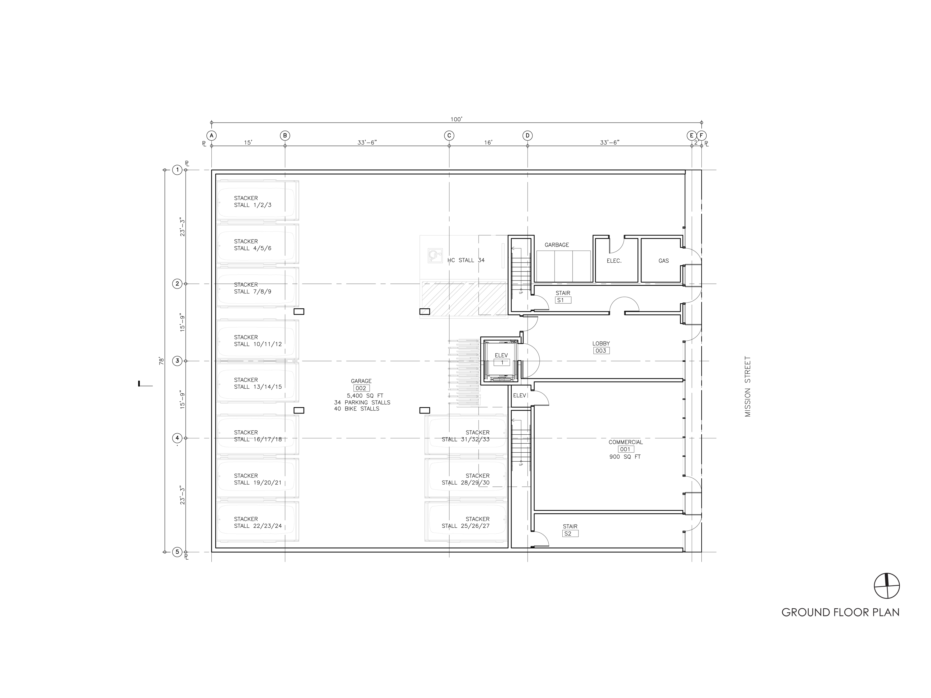 This section of Mission Street comprises a diverse variety of building types and scales – across the street is a large brick ribbon window industrial building, mixed with repair shops and bay window residential structures. This new building is articulated at a residential scale using materials related to other building types on the street.