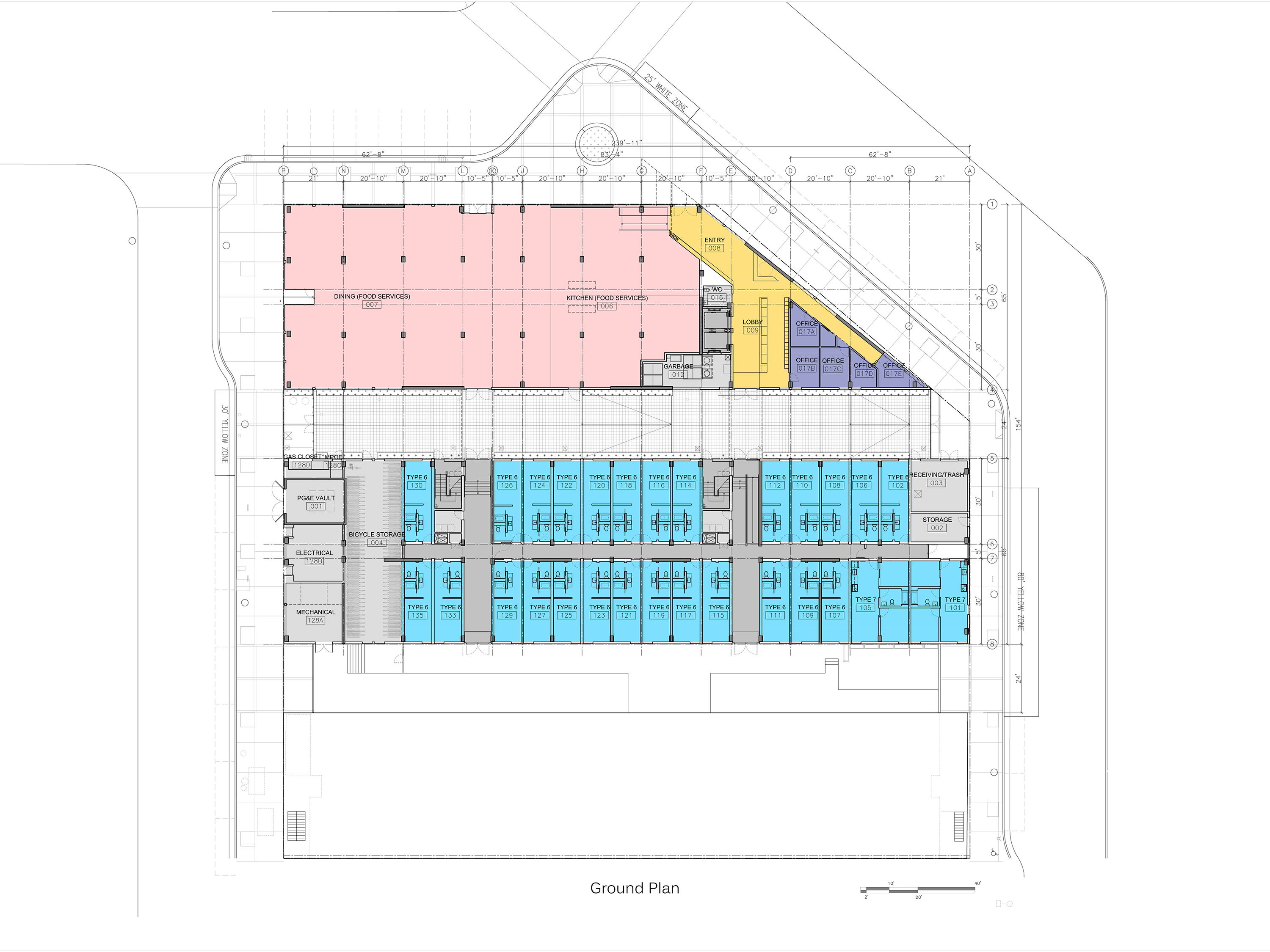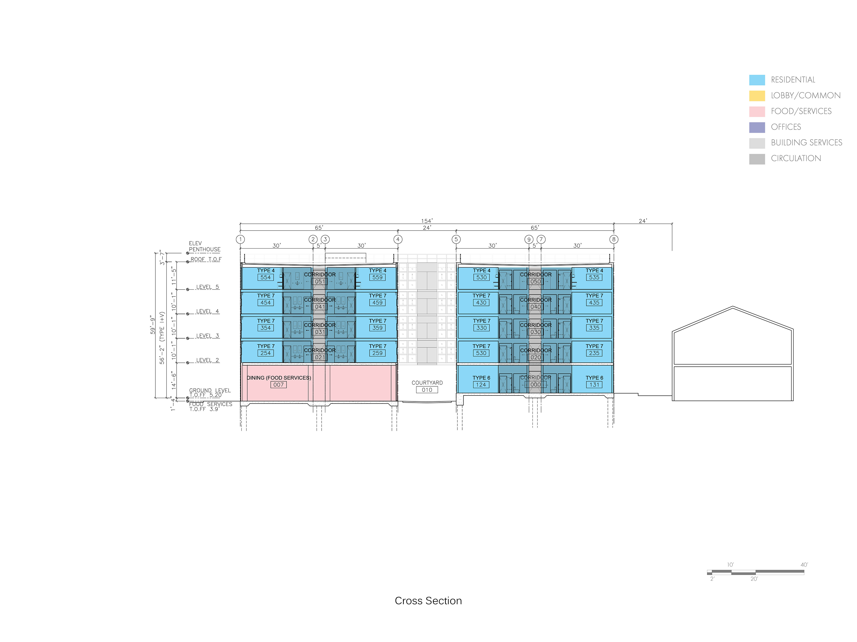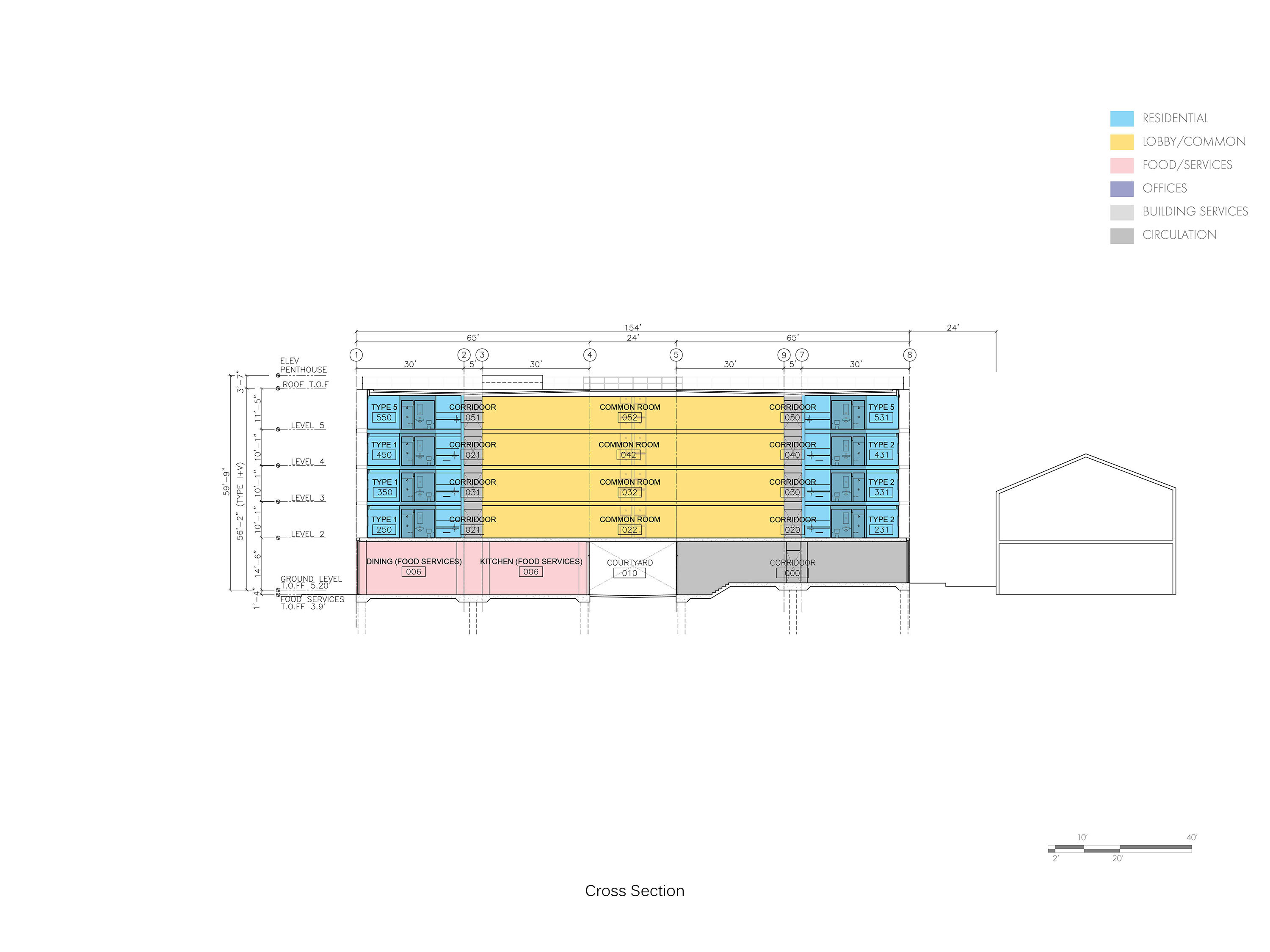 The top floor has single rooms for seniors, and an outdoor terrace at the triangular corner which overlooks the city skyline.