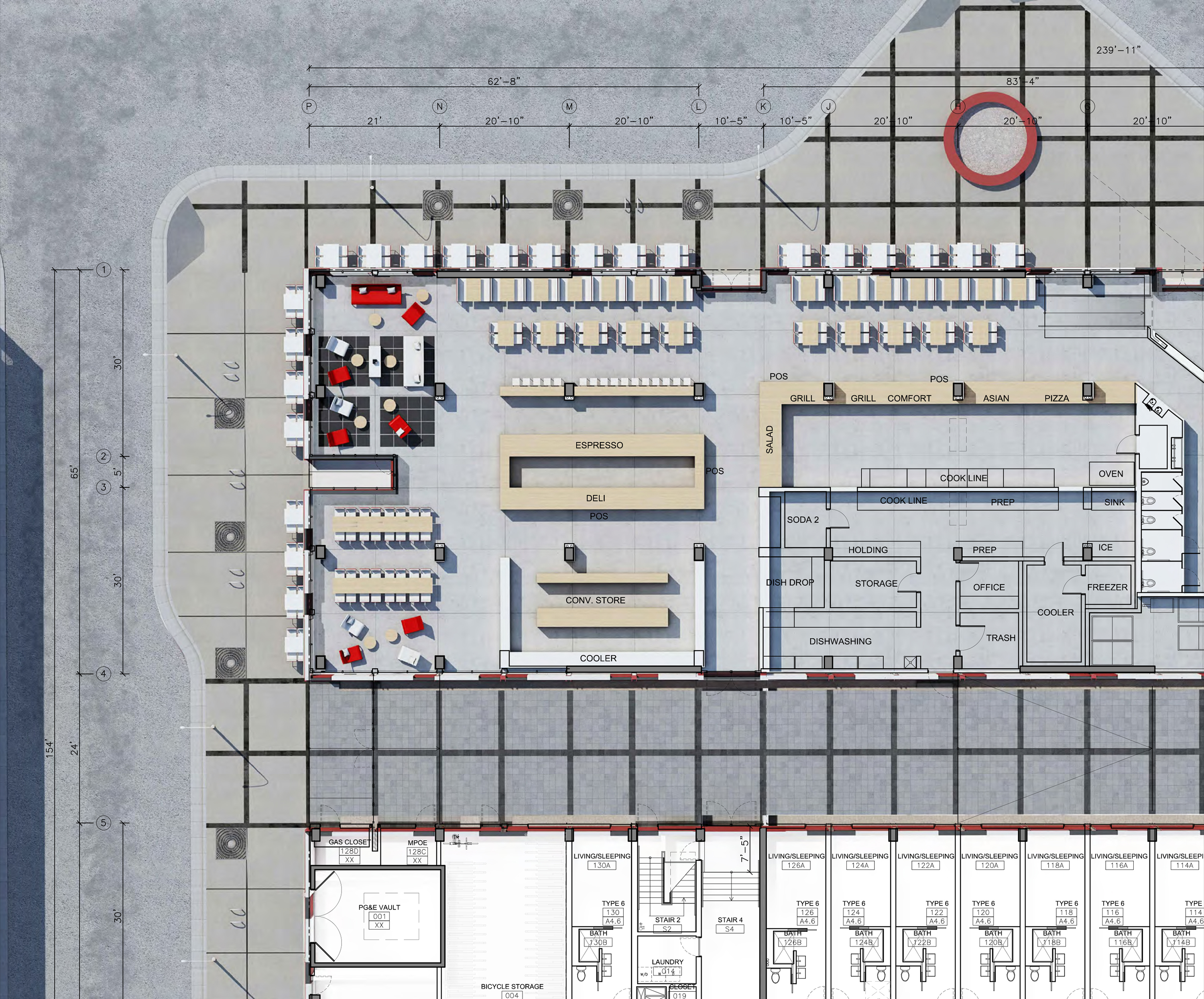 A wide range of seating options match the wide range of food choices. Counters, four tops, banquets, communal tables, lounging around a fire, and outdoor tables provide options to enjoy the expresso bar, deli, pizza, comfort and ethnic foods.