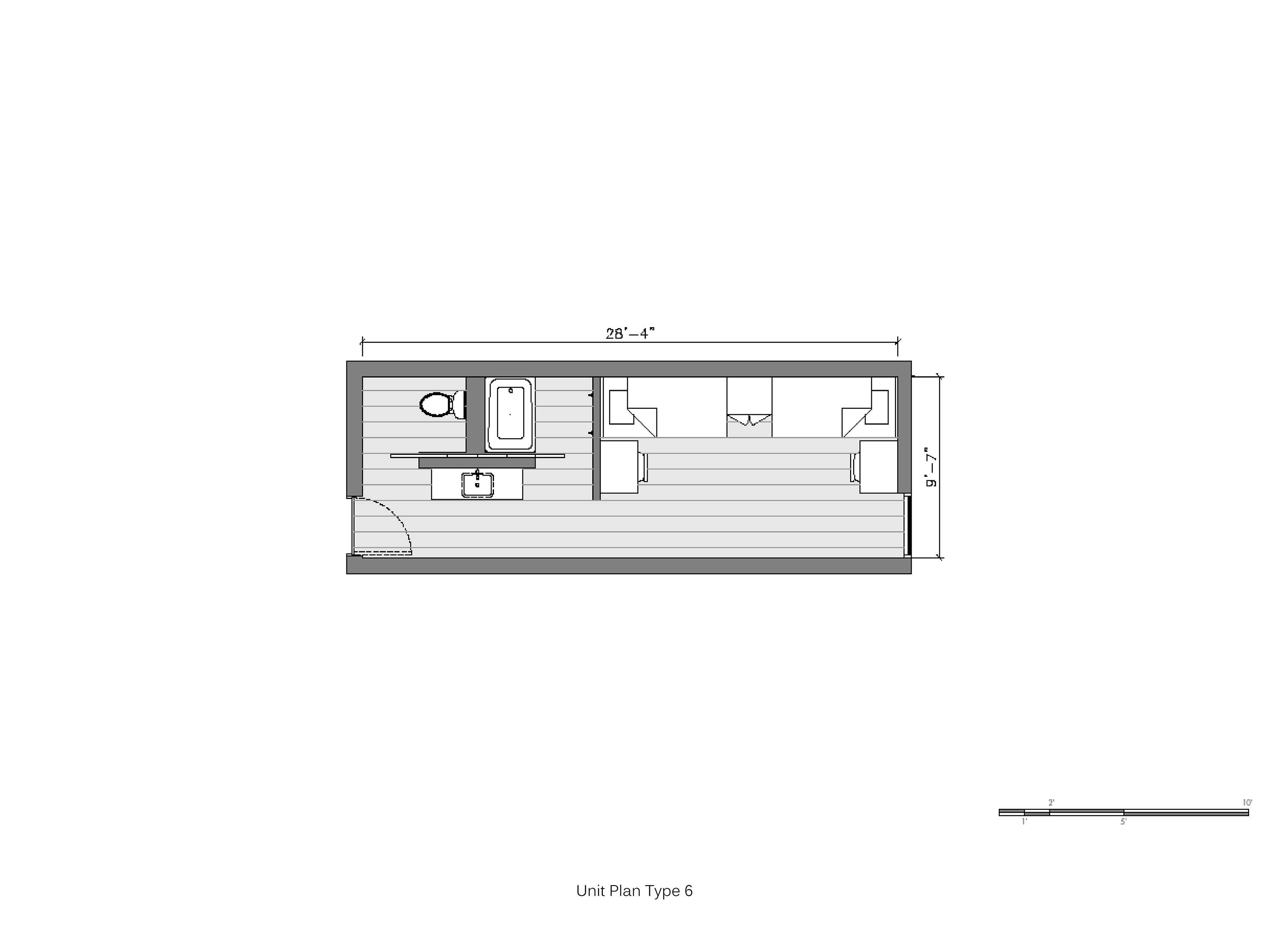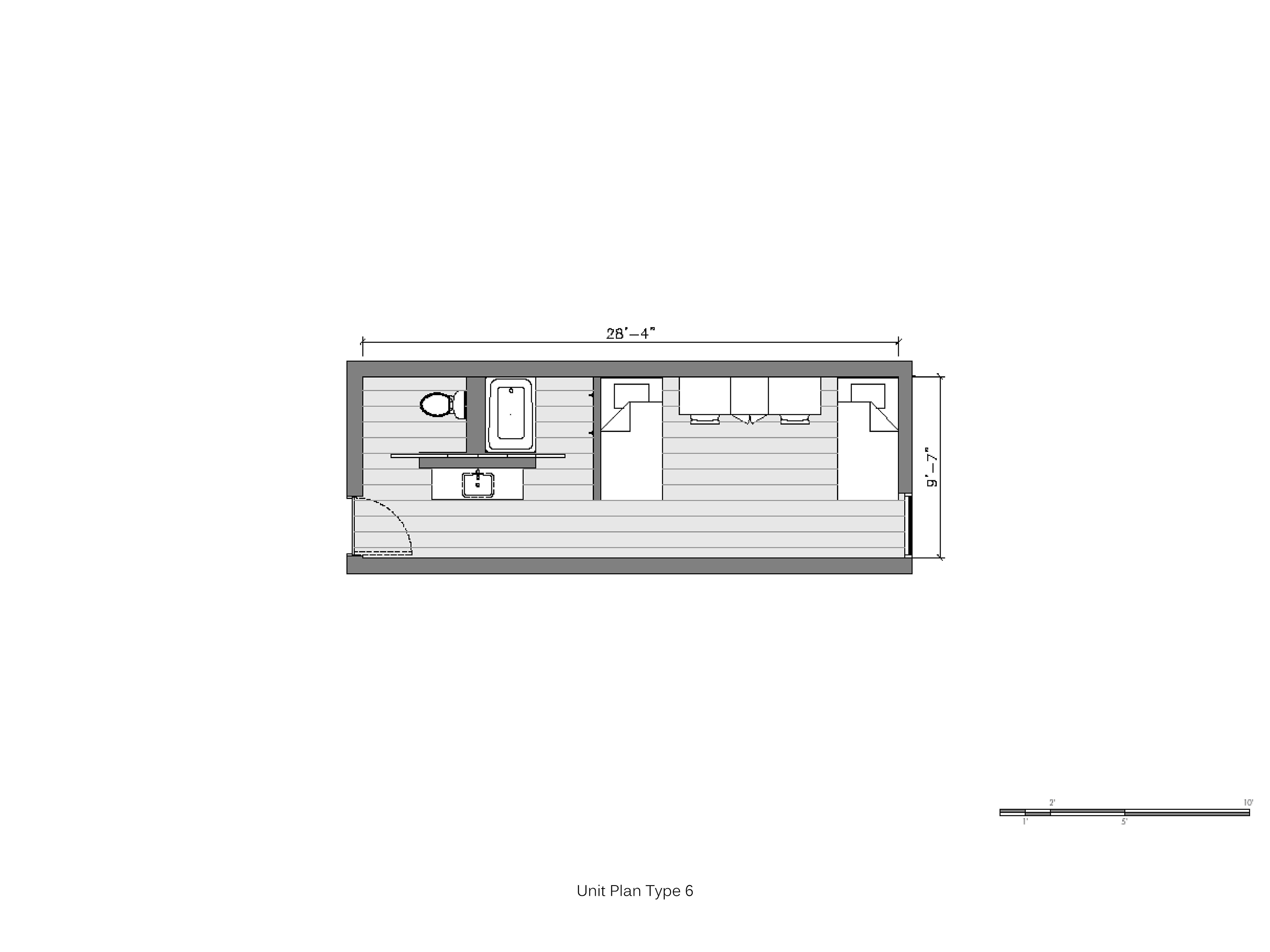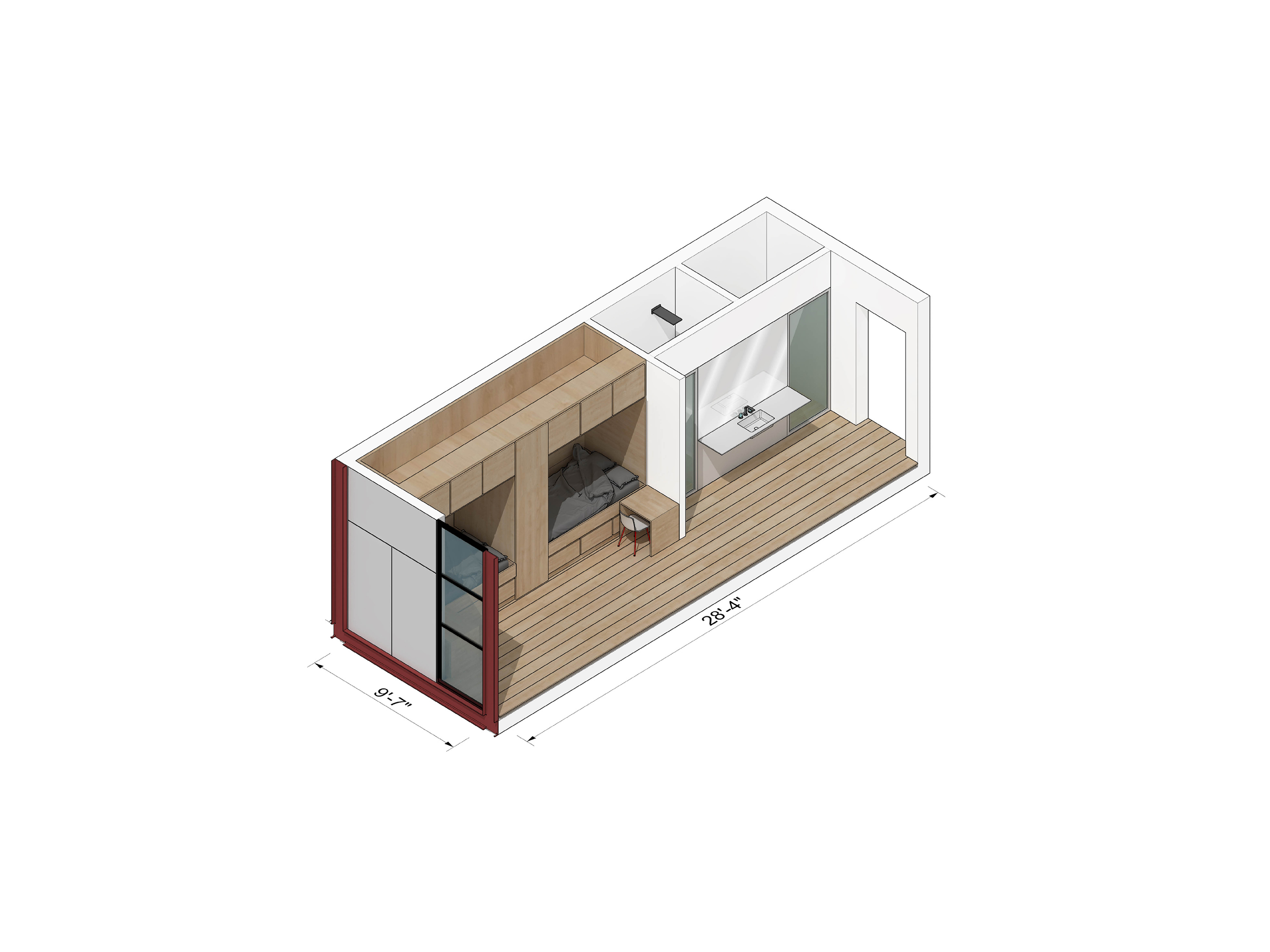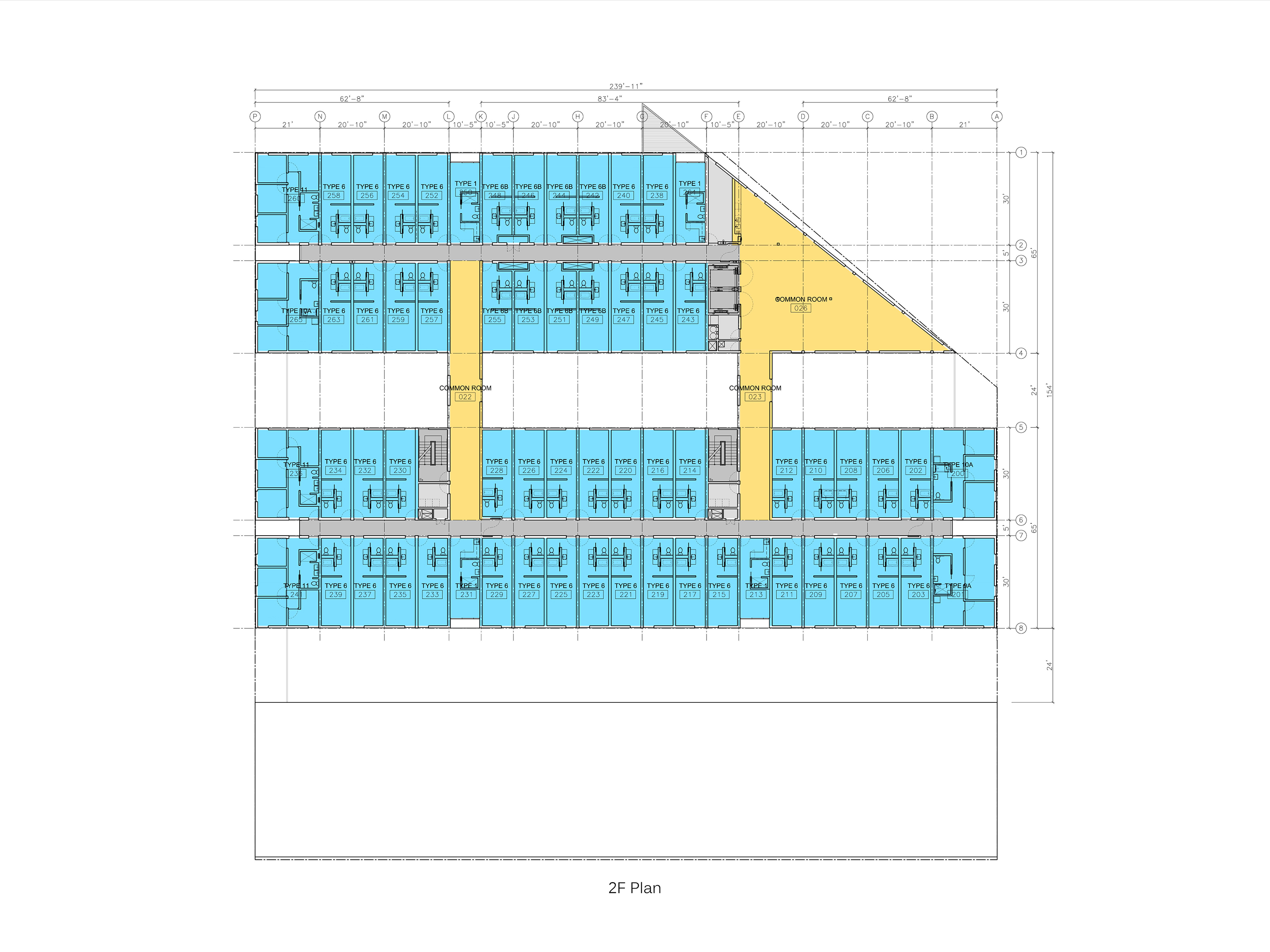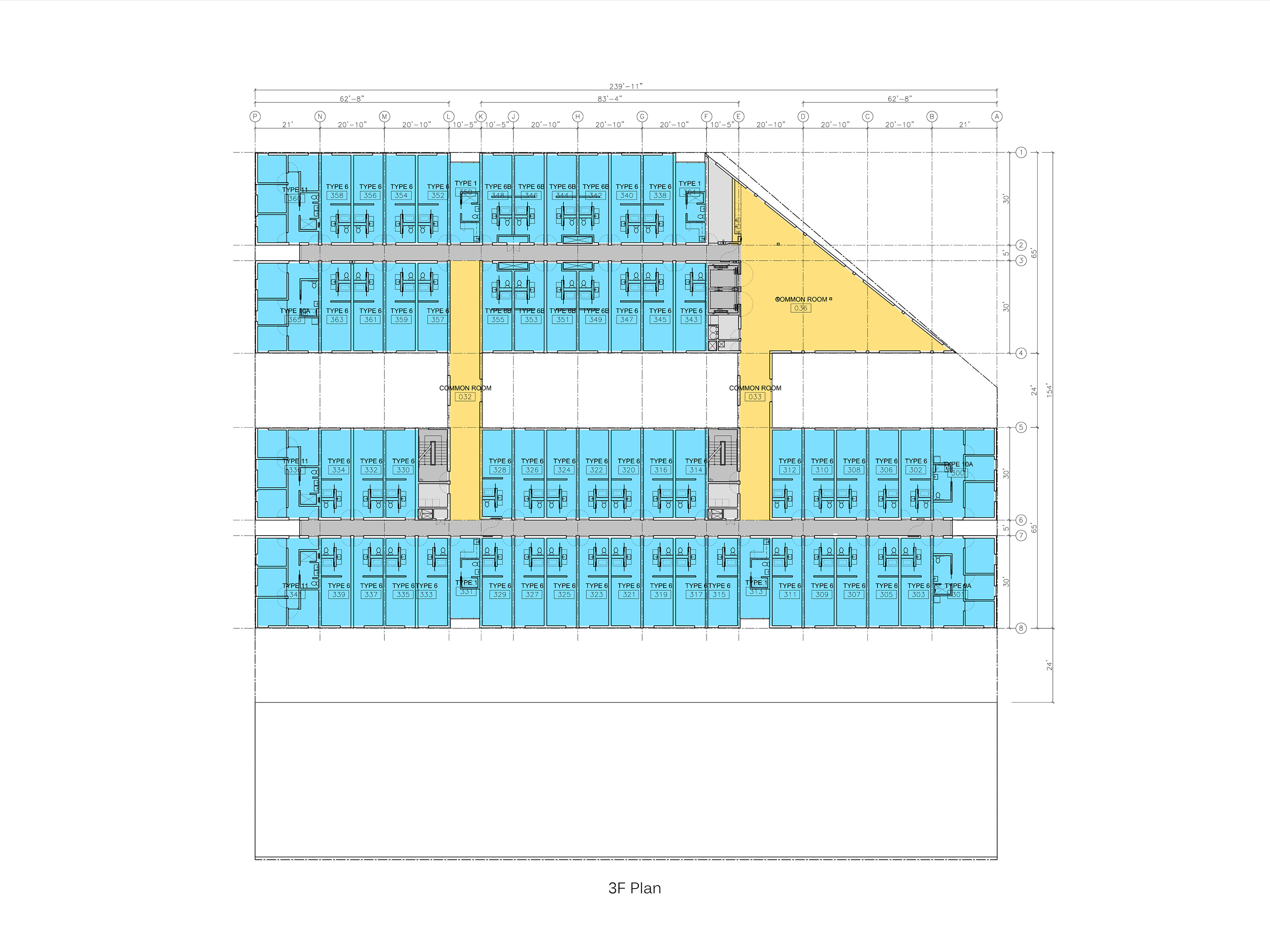 Above, four floors are gridded into five houses, connected by the open court and a pair of common spaces which bridge over it. Each of the houses are made up of double loaded corridors with student rooms on either side. The rooms are compact and efficient, with furniture for storage, beds and desks, and a compartmentalized bathroom. There are 520 beds in single, double and quadruple occupancy configurations.