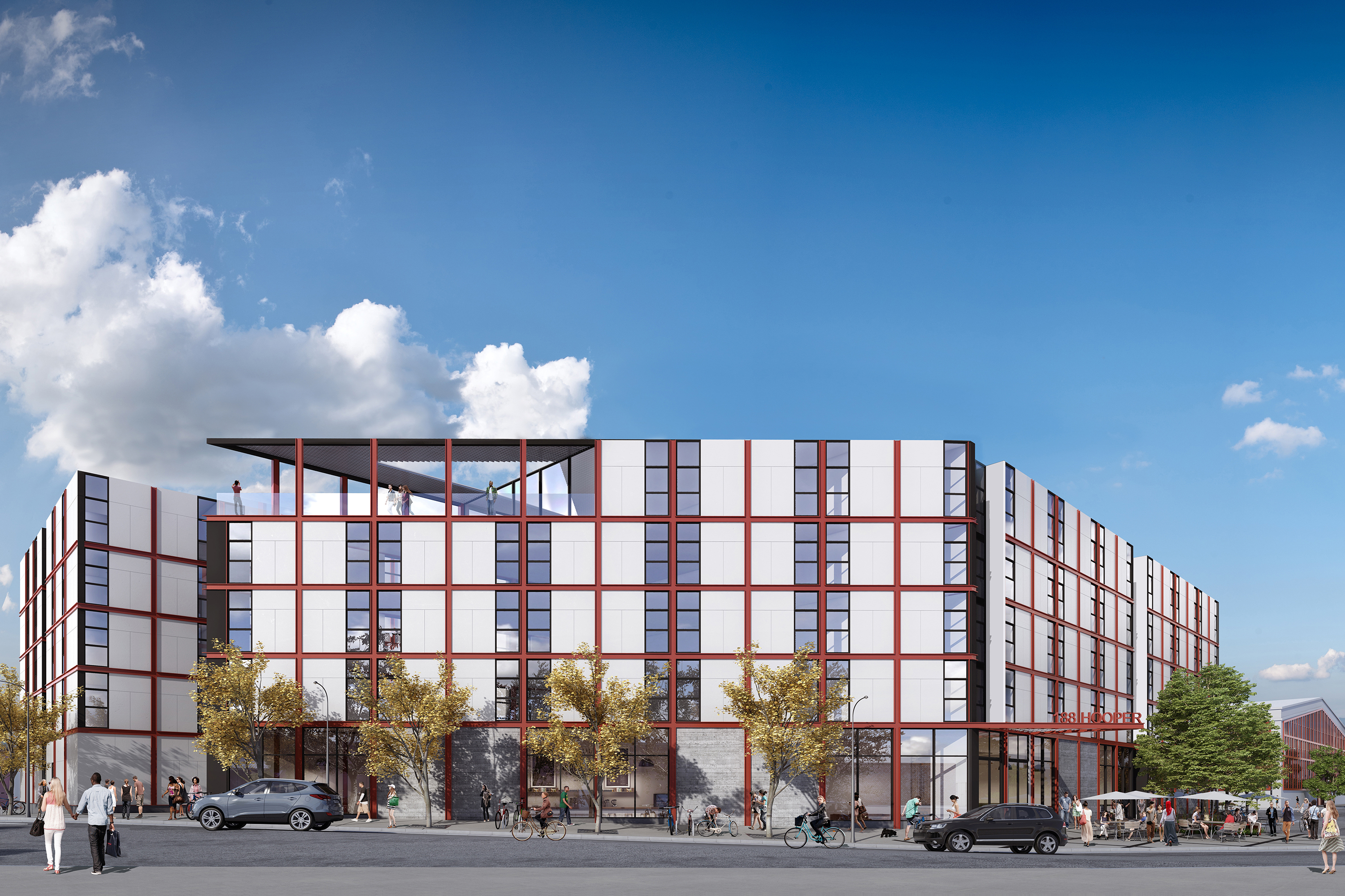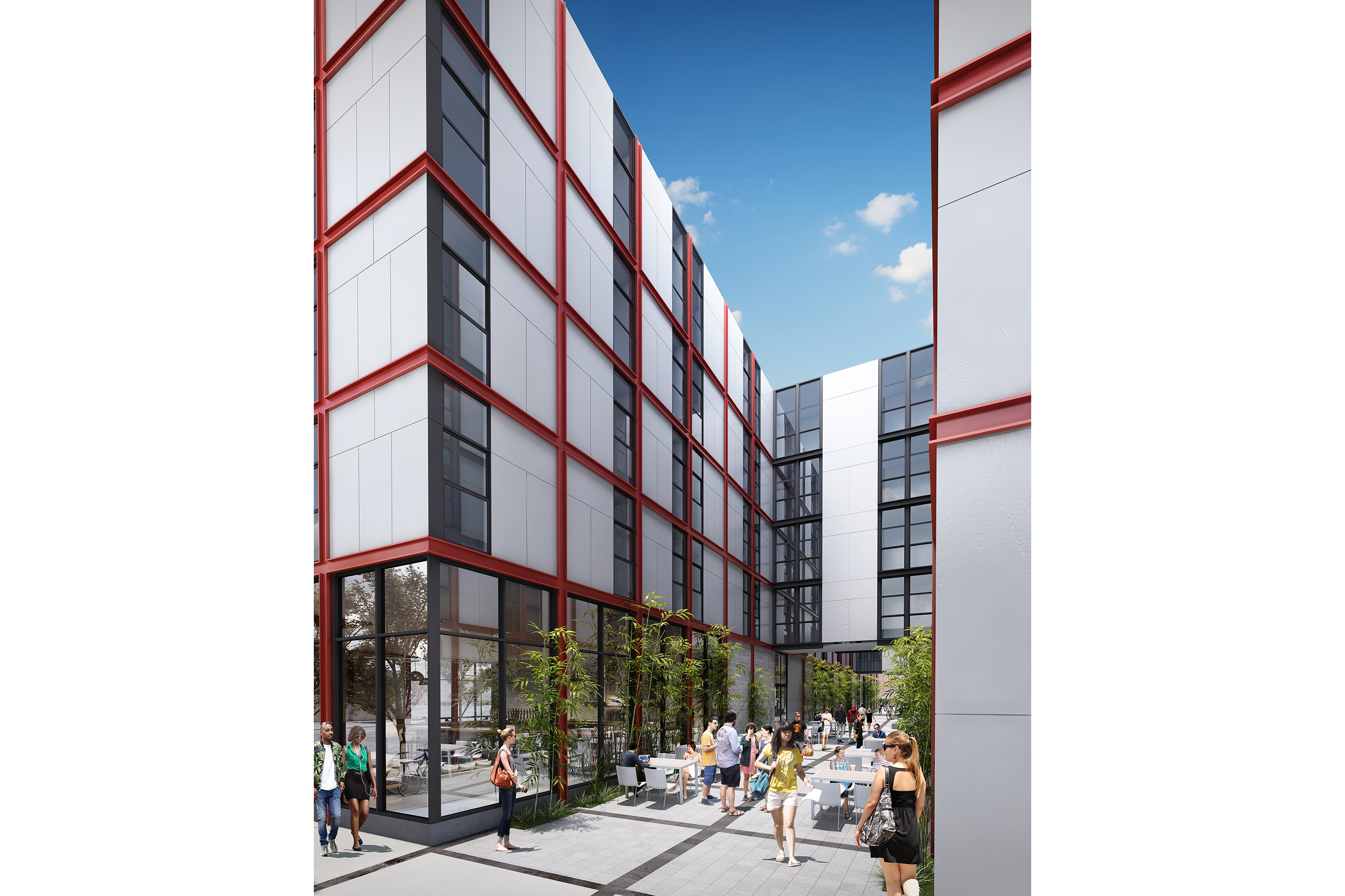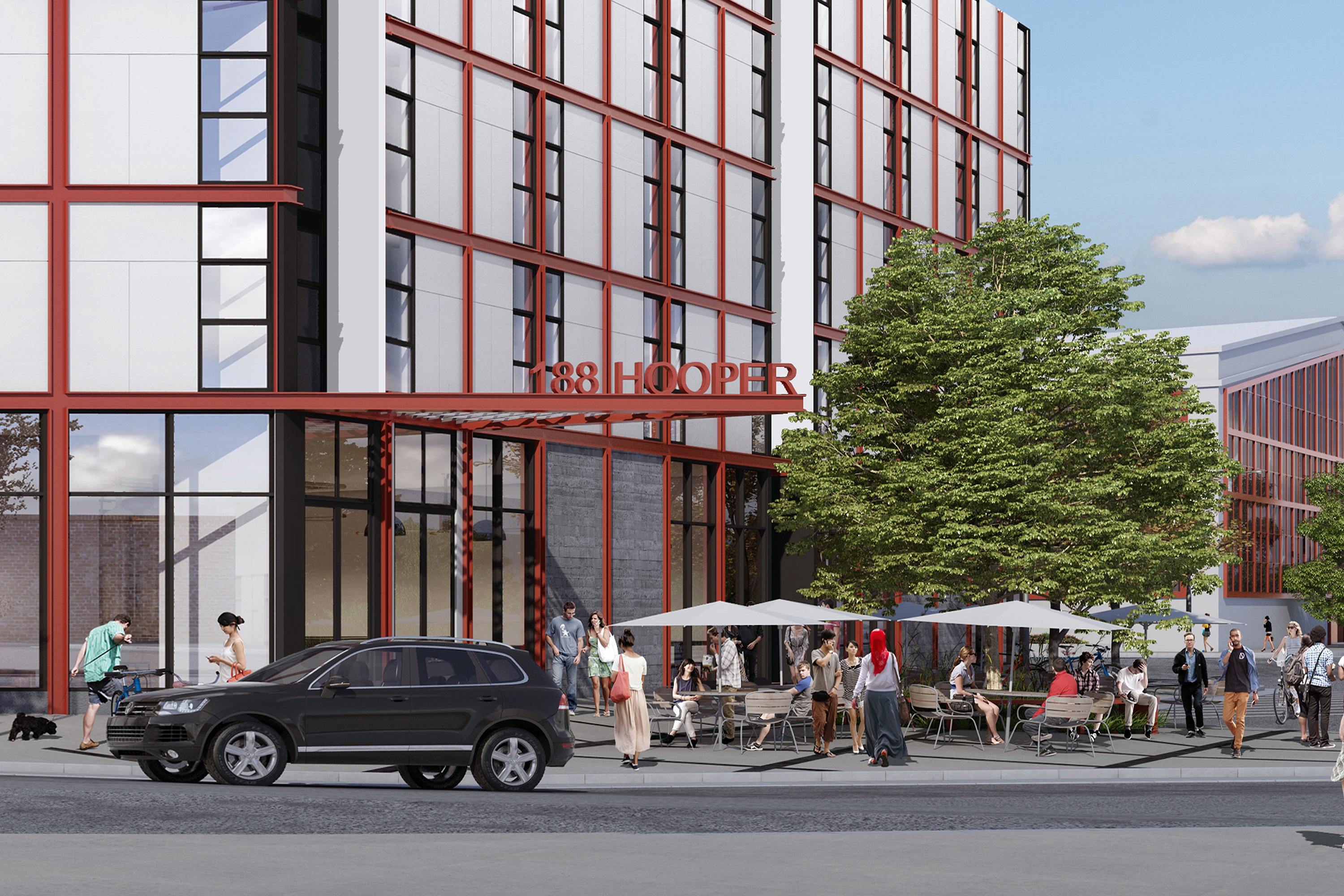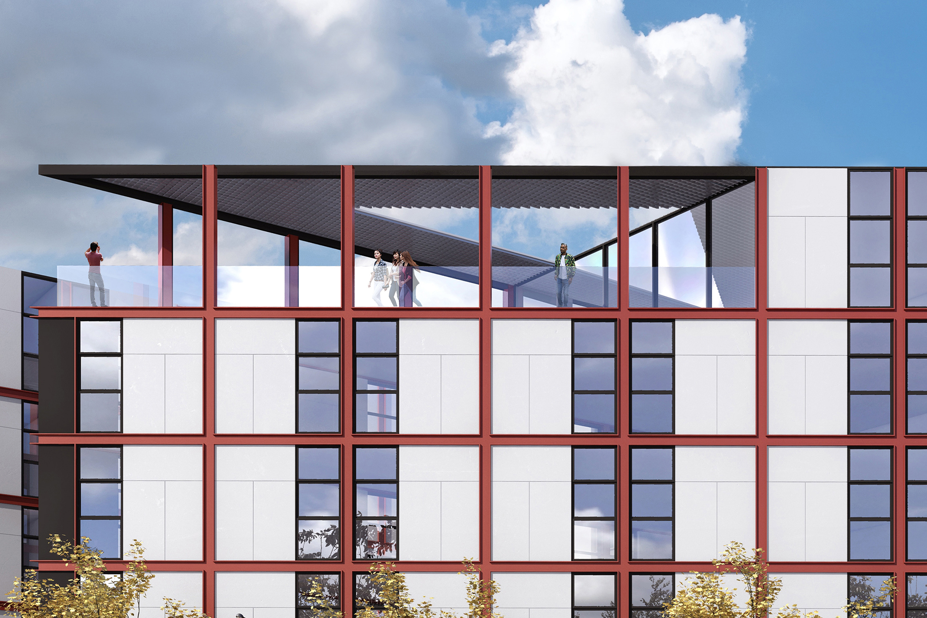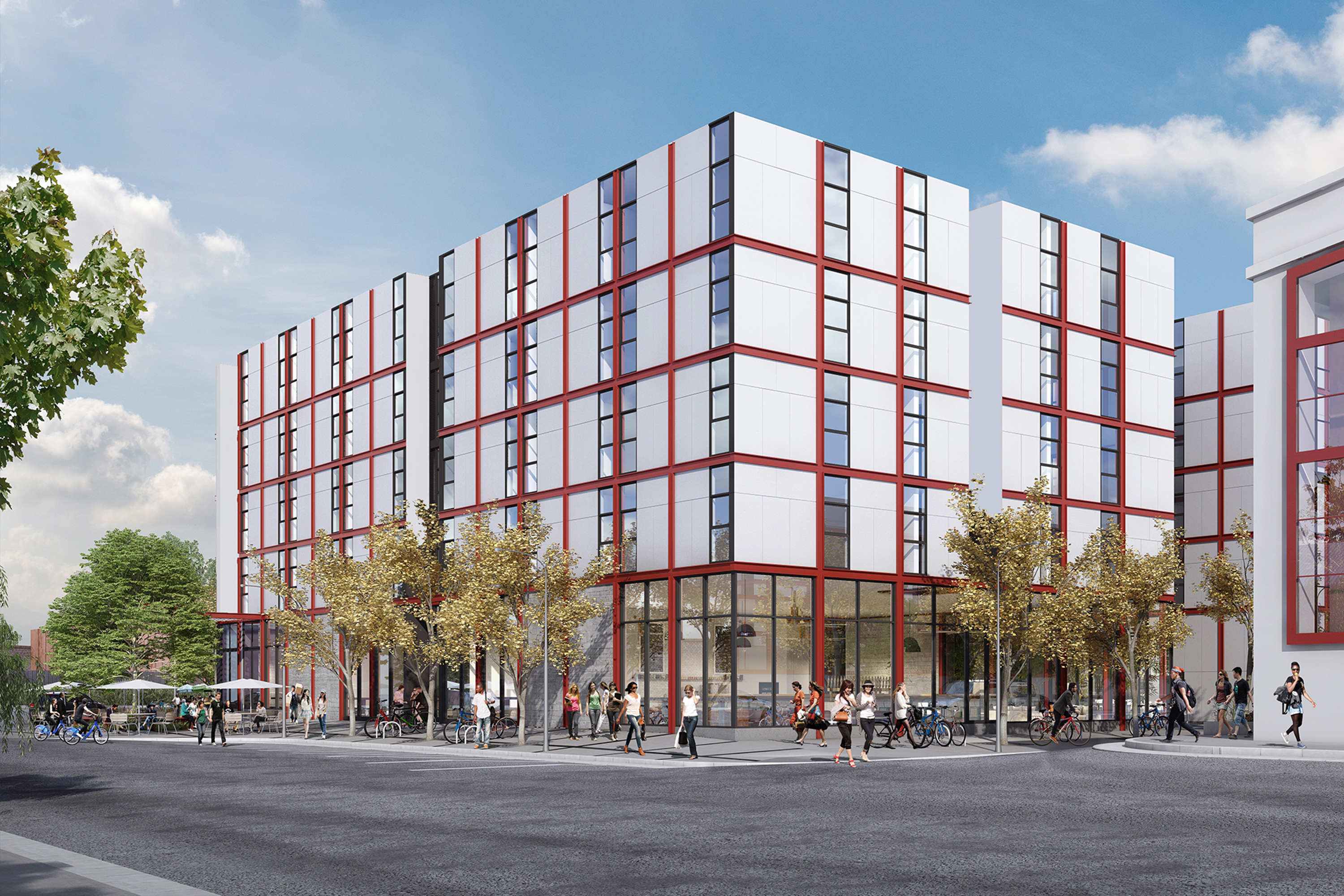 CCA’s Main Building, 1111 Eighth, is the starting point for 188 Hooper Freshmen Residences. The converted 1950’s SOM/Walter Netsch Greyhound Bus Building was designed under the influence of Mies and IIT. Our goal is to use this building, with its red grids and glass, as the basis of an identifiable language to build a campus identity for CCA.