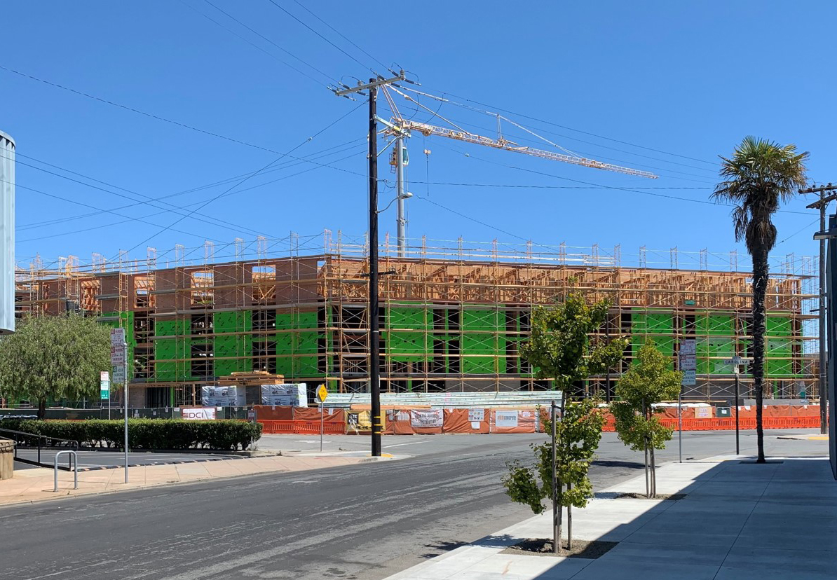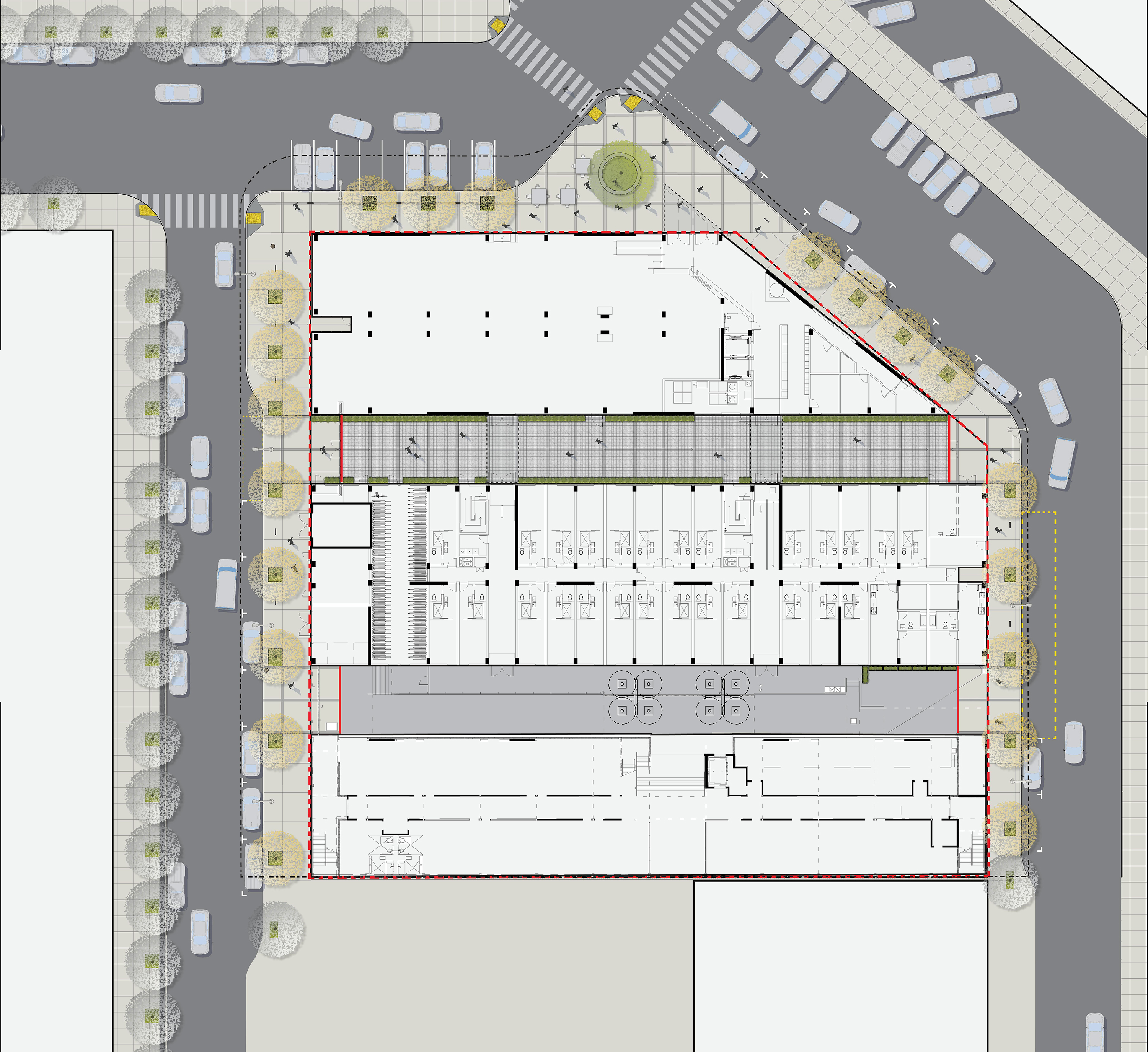 Our site is immediately adjacent to the main building. By reconfiguring the intersections at either end of Eighth Street, a mall is established, with gateways, widened sidewalks and landscape, onto which the ground floor of the new building expands. A large sidewalk bulbout rationalizes the colliding street grids at 8th and Carolina, decreasing the asphalt and providing a triangular parklet with seating and landscape at the main entry to the building, demarcated with a triangular projecting canopy.