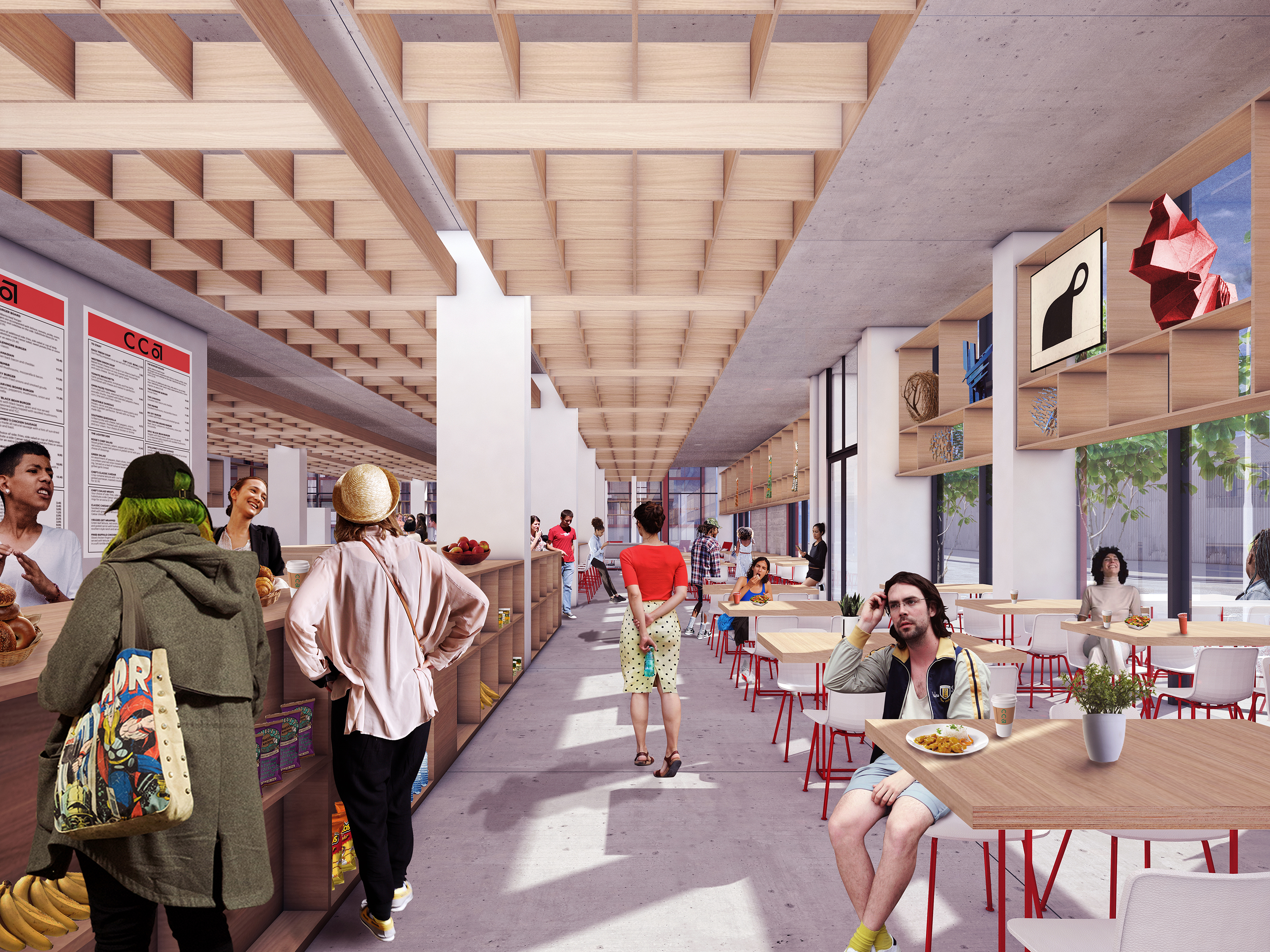 The large glass storefronts on Hooper and Eighth activate the streetscape, making the CCA Café and Gallery a lively part of the urban realm.