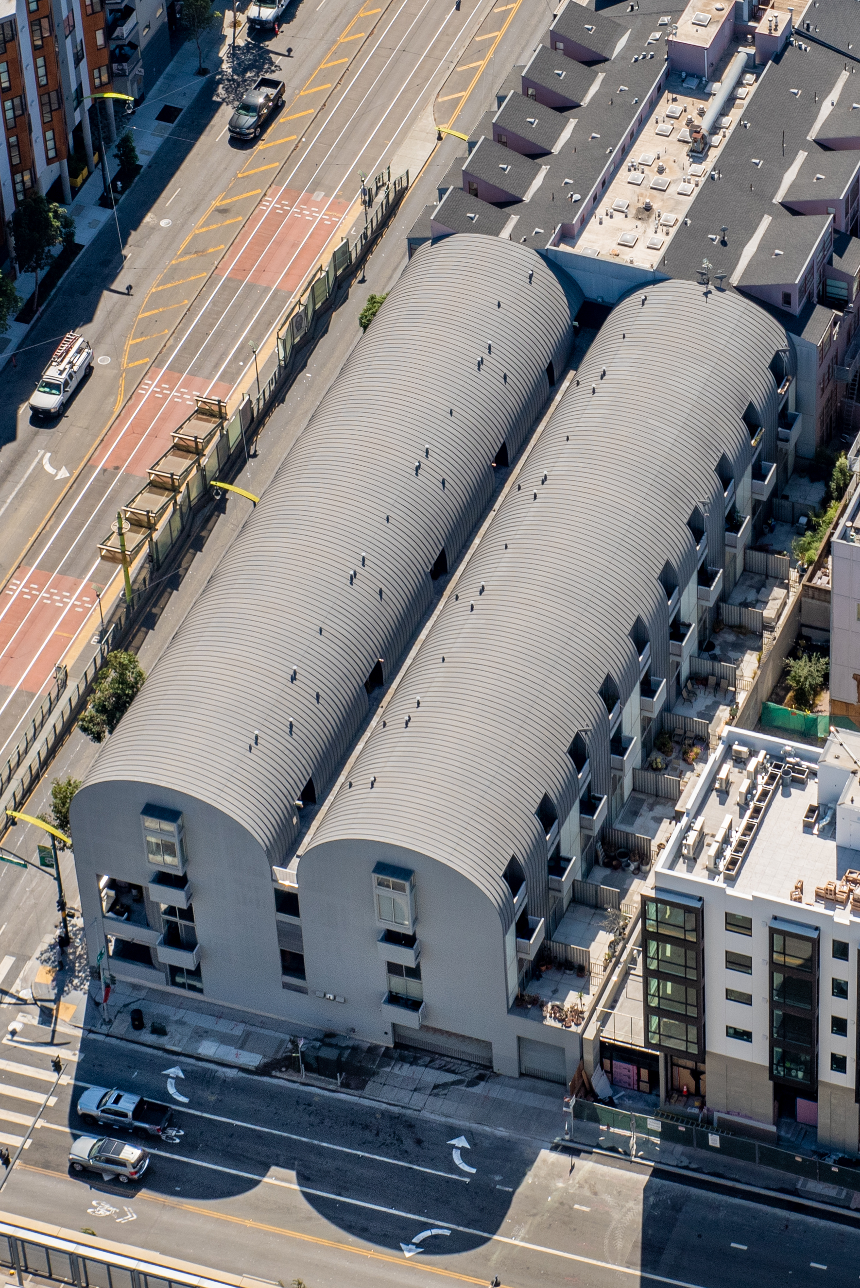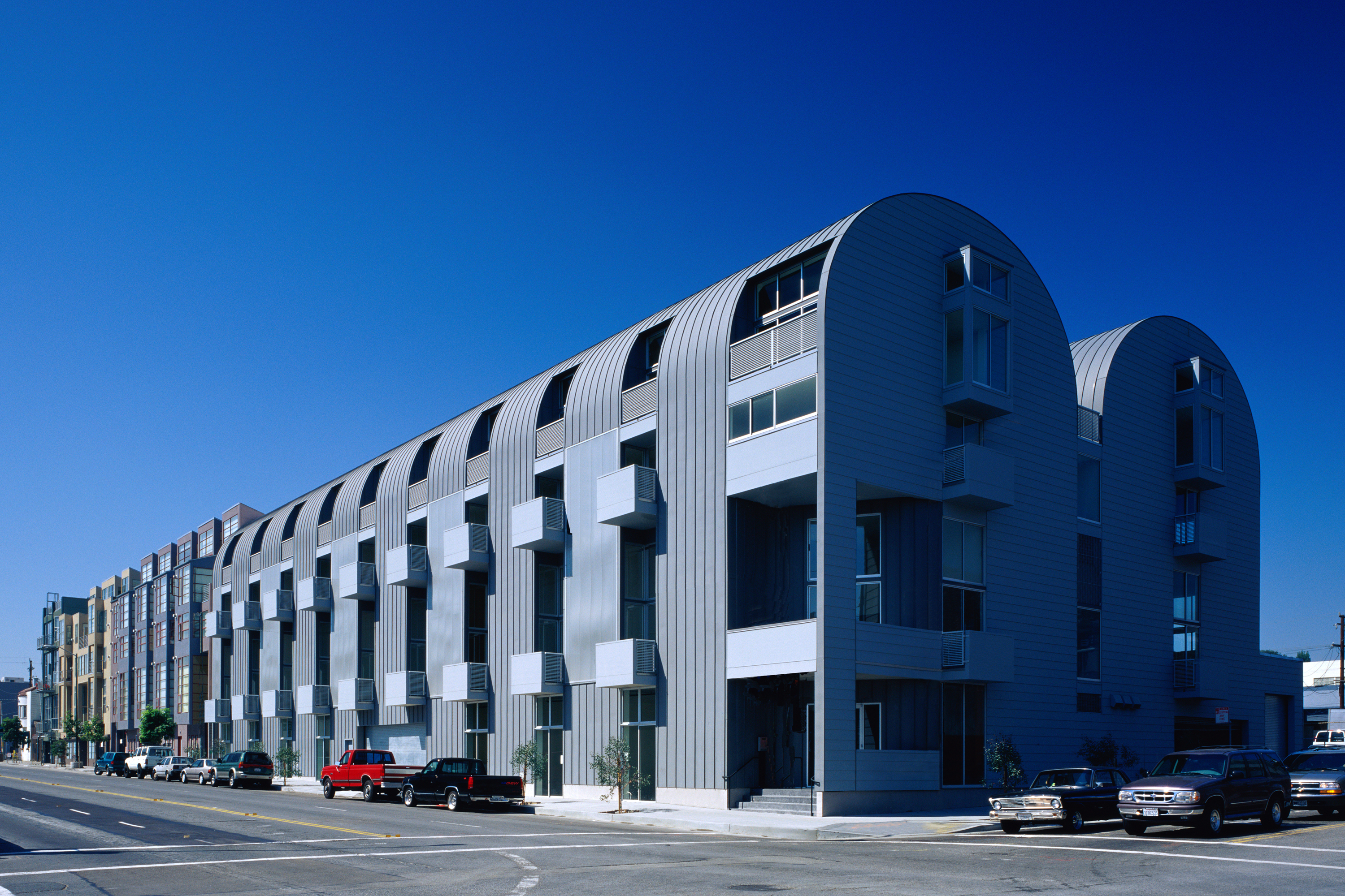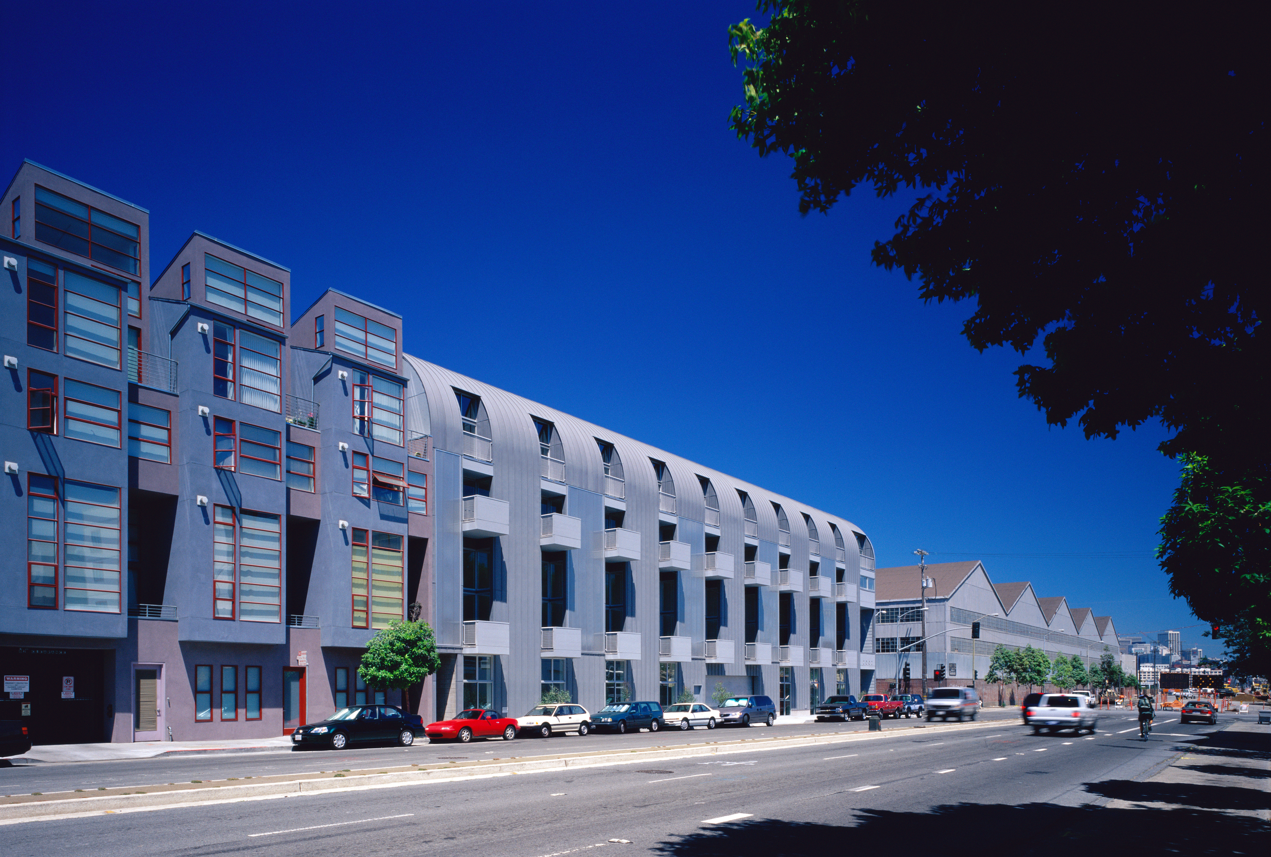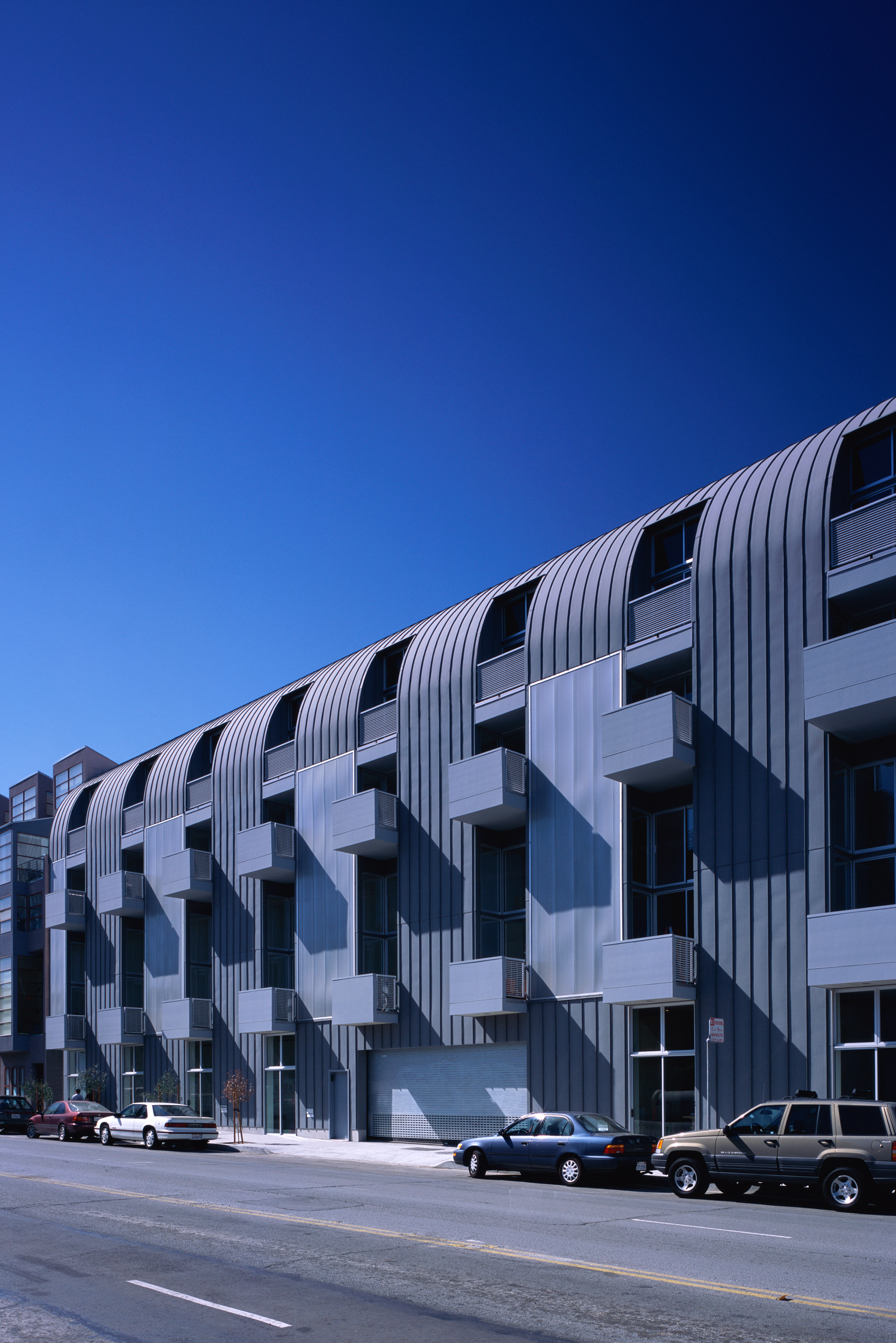 The infill project consists of thirty-eight live/work units. The corner at Third and Mariposa Streets is carved away, allowing public urban space to flow through; the angled corner is also the lobby entrance. Along Third Street, seven artisan units have direct entry from the street to a workspace; above are two-story living volumes with mezzanines. The garage parallels Third Street on the rear of the building. Lofts with large terraces sit above the garage; these are set back fifteen feet from the lot line, so that a space of thirty feet—the width of a typical small street—separates them from adjacent buildings. The upper units, front and rear, have three stories: tall vaulted living volumes with private master suites below and mezzanines that float under the curved roofs above. Large areas of glass provide light for the interior volumes, and all units have private balconies. The repeating bays, balconies, and walls on Third Street continue the traditional fabric of San Francisco. In this neighborhood of unusually diverse architecture, ranging from full-block industrial warehouses to twenty-five-foot-wide Victorian facades, the articulated wall adds a new synthesis of materials, scale, and rhythms. The vaulted ends of the building are sheathed in lapped siding; on the long sides, metal-clad walls meld into the vaulted roof, meeting the sky, enclosing the protected interiors. The image of the building is rich and clear; it is a memorable object on this new boulevard.