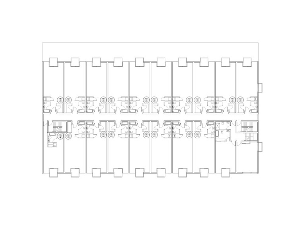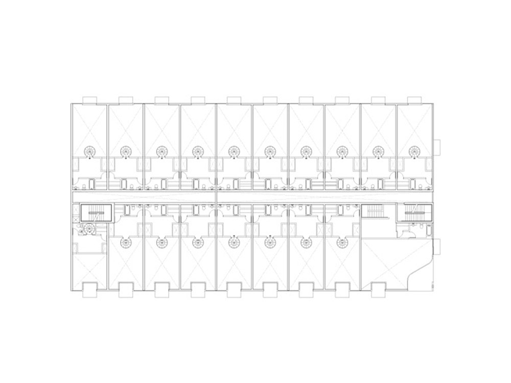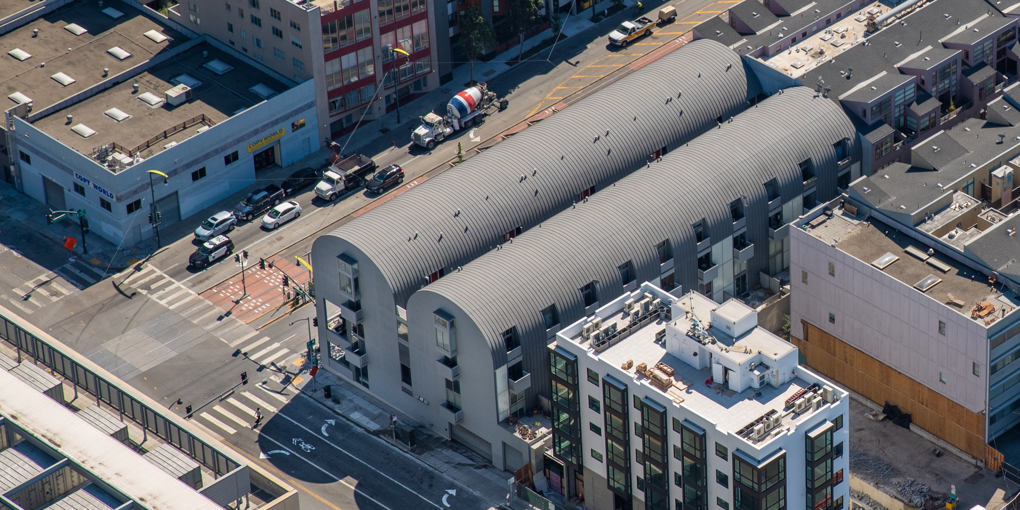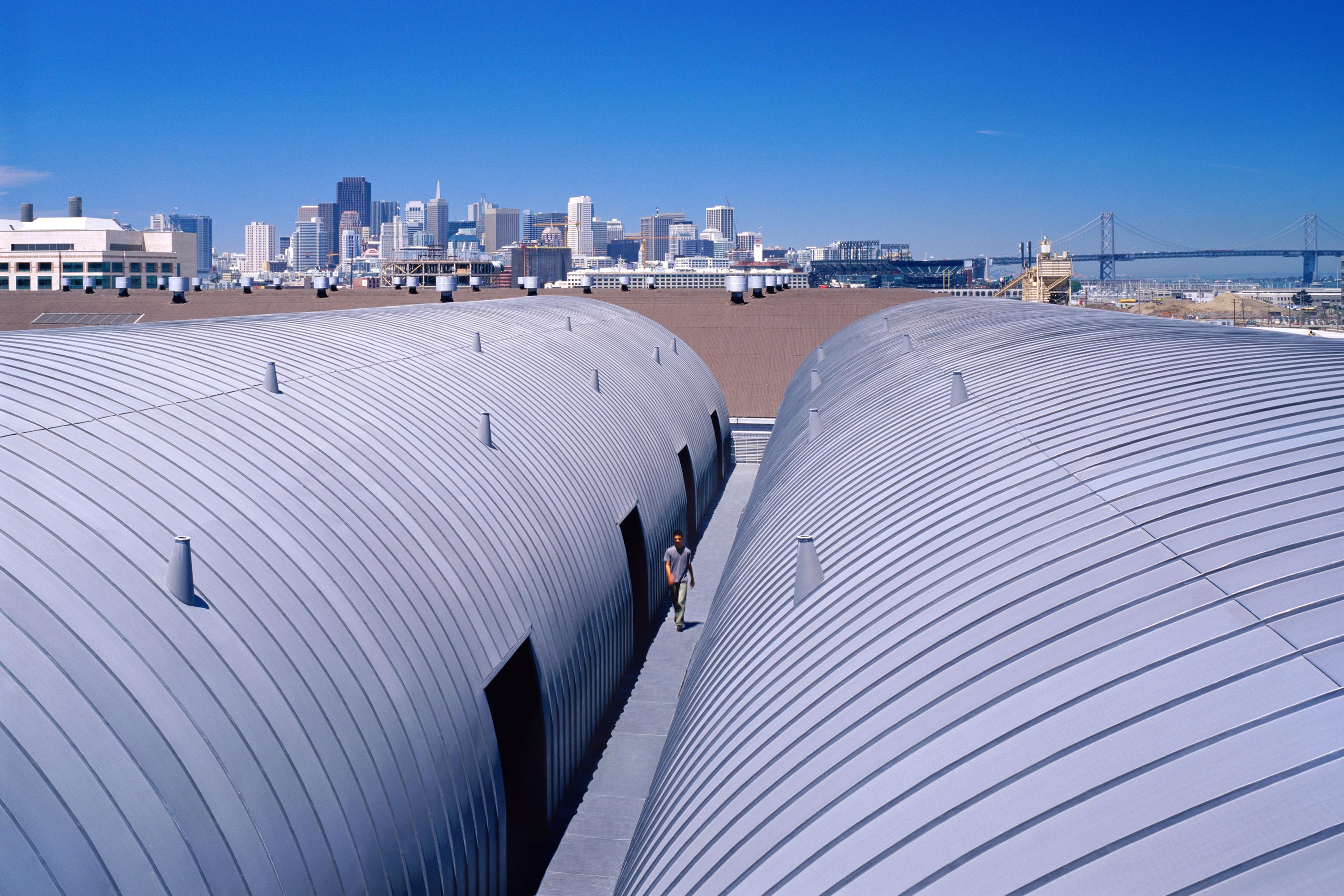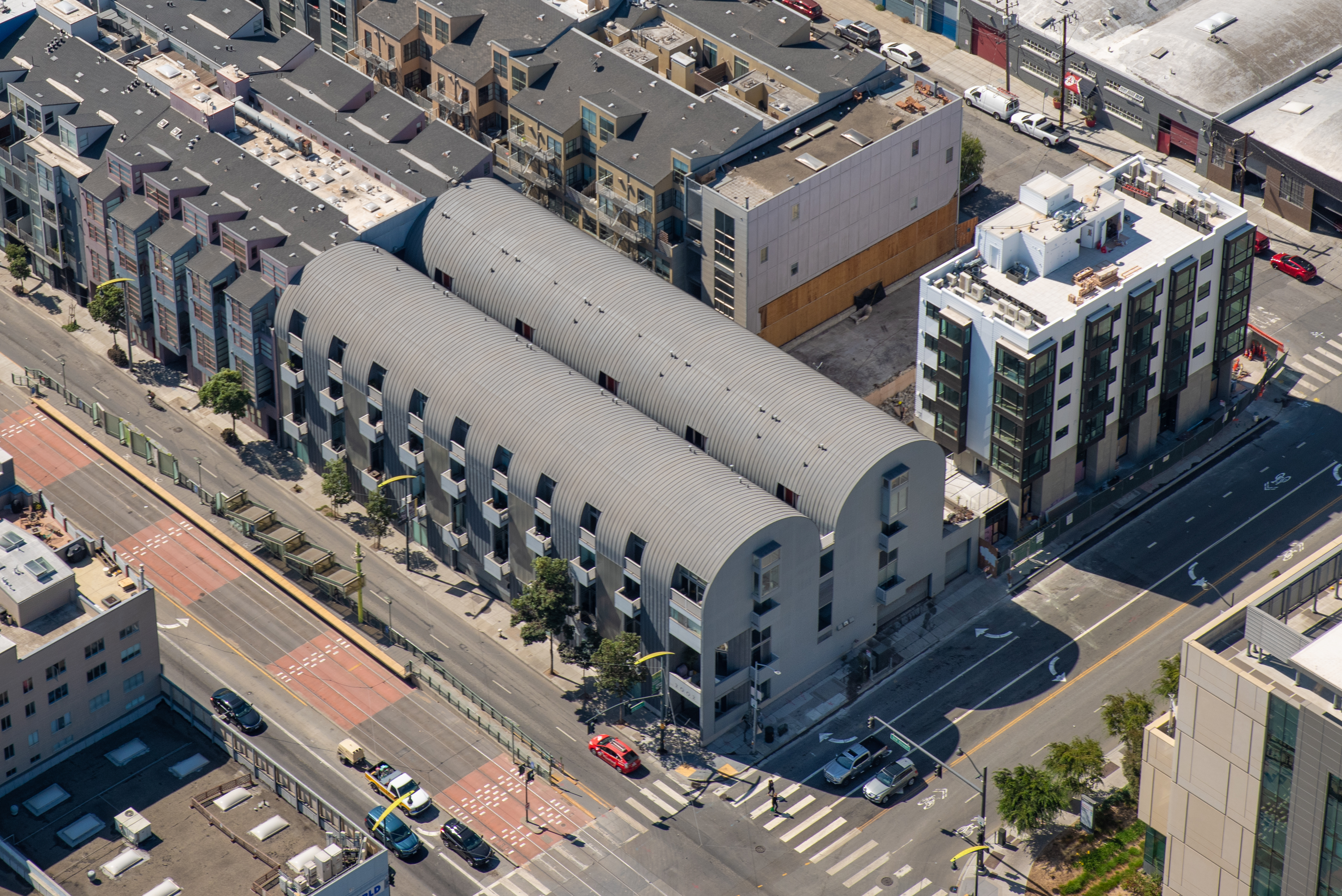 The infill project consists of thirty-eight live/work units. The corner at Third and Mariposa Streets is carved away, allowing public urban space to flow through; the angled corner is also the lobby entrance. Along Third Street, seven artisan units have direct entry from the street to a workspace; above are two-story living volumes with mezzanines. The garage parallels Third Street on the rear of the building. Lofts with large terraces sit above the garage; these are set back fifteen feet from the lot line, so that a space of thirty feet—the width of a typical small street—separates them from adjacent buildings. The upper units, front and rear, have three stories: tall vaulted living volumes with private master suites below and mezzanines that float under the curved roofs above. Large areas of glass provide light for the interior volumes, and all units have private balconies. The repeating bays, balconies, and walls on Third Street continue the traditional fabric of San Francisco. In this neighborhood of unusually diverse architecture, ranging from full-block industrial warehouses to twenty-five-foot-wide Victorian facades, the articulated wall adds a new synthesis of materials, scale, and rhythms. The vaulted ends of the building are sheathed in lapped siding; on the long sides, metal-clad walls meld into the vaulted roof, meeting the sky, enclosing the protected interiors. The image of the building is rich and clear; it is a memorable object on this new boulevard.