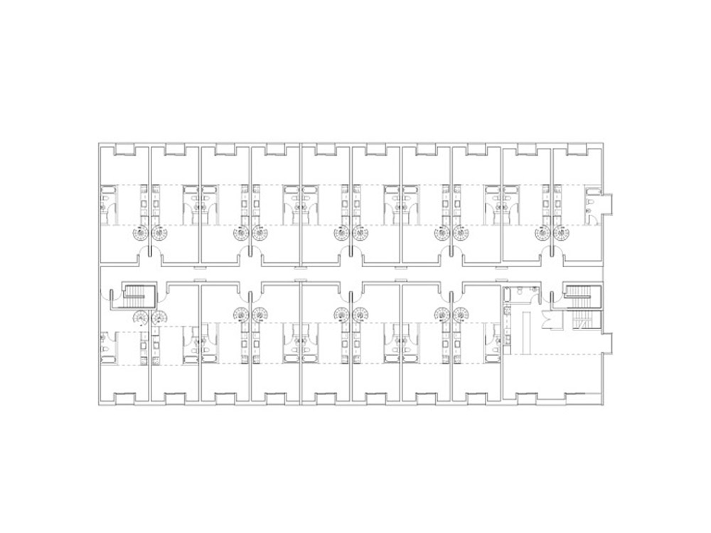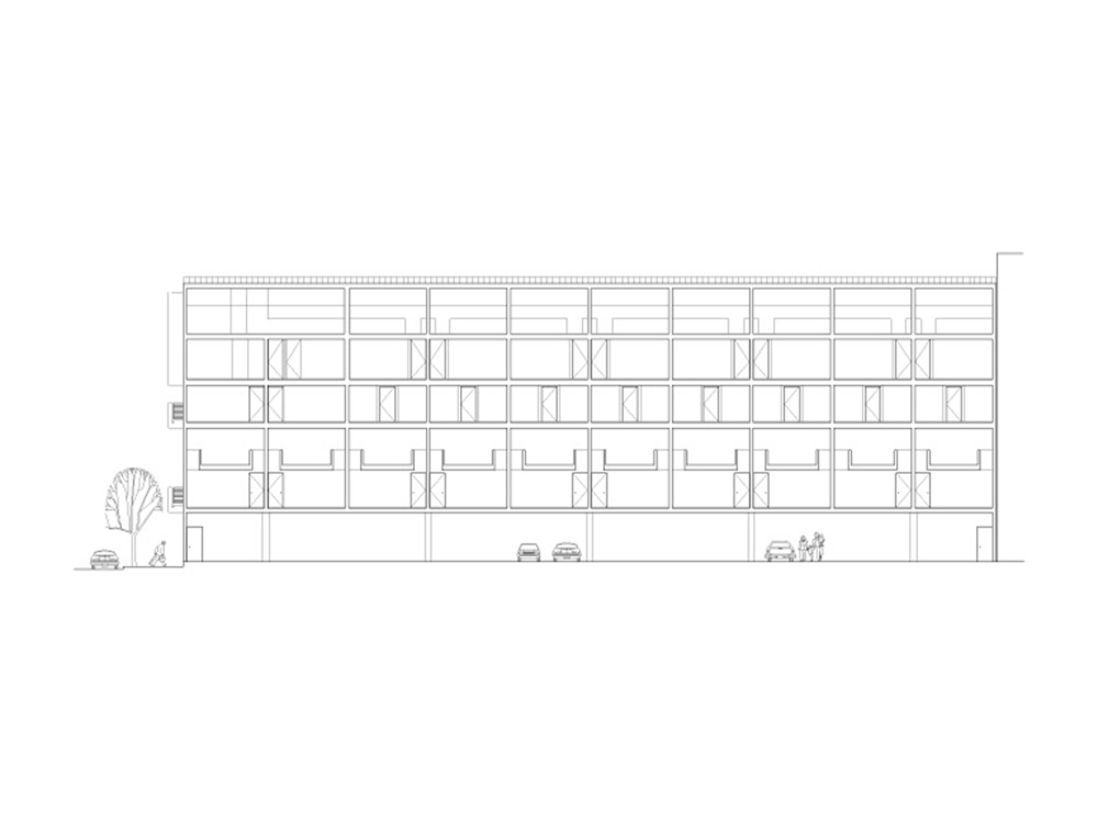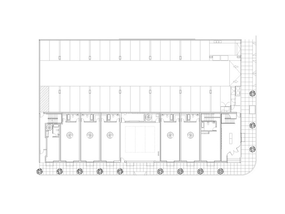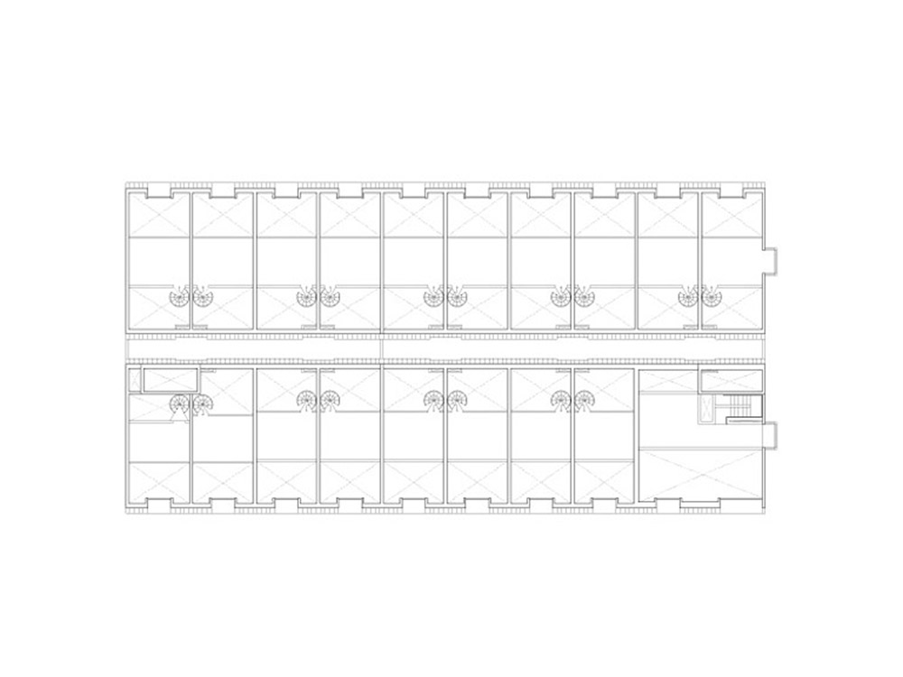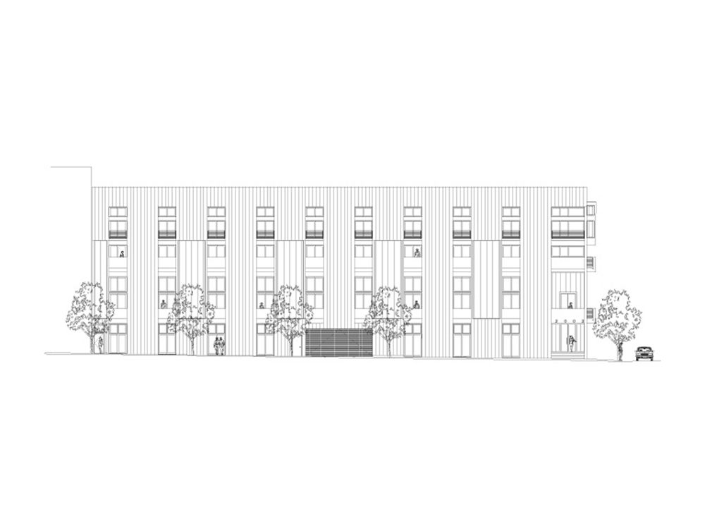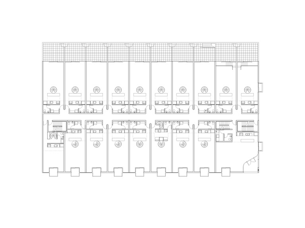 The infill project consists of thirty-eight live/work units. The corner at Third and Mariposa Streets is carved away, allowing public urban space to flow through; the angled corner is also the lobby entrance. Along Third Street, seven artisan units have direct entry from the street to a workspace; above are two-story living volumes with mezzanines. The garage parallels Third Street on the rear of the building. Lofts with large terraces sit above the garage; these are set back fifteen feet from the lot line, so that a space of thirty feet—the width of a typical small street—separates them from adjacent buildings. The upper units, front and rear, have three stories: tall vaulted living volumes with private master suites below and mezzanines that float under the curved roofs above. Large areas of glass provide light for the interior volumes, and all units have private balconies. The repeating bays, balconies, and walls on Third Street continue the traditional fabric of San Francisco. In this neighborhood of unusually diverse architecture, ranging from full-block industrial warehouses to twenty-five-foot-wide Victorian facades, the articulated wall adds a new synthesis of materials, scale, and rhythms. The vaulted ends of the building are sheathed in lapped siding; on the long sides, metal-clad walls meld into the vaulted roof, meeting the sky, enclosing the protected interiors. The image of the building is rich and clear; it is a memorable object on this new boulevard.