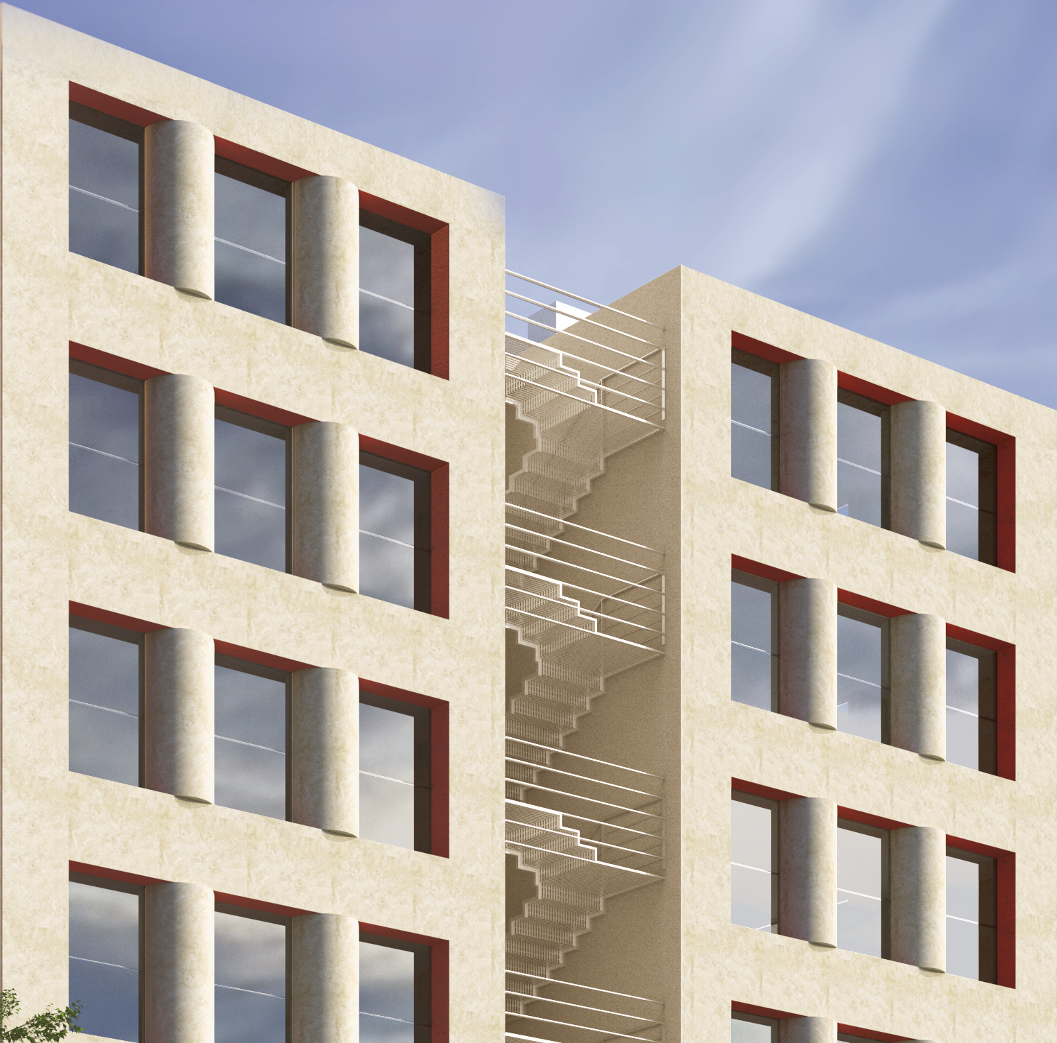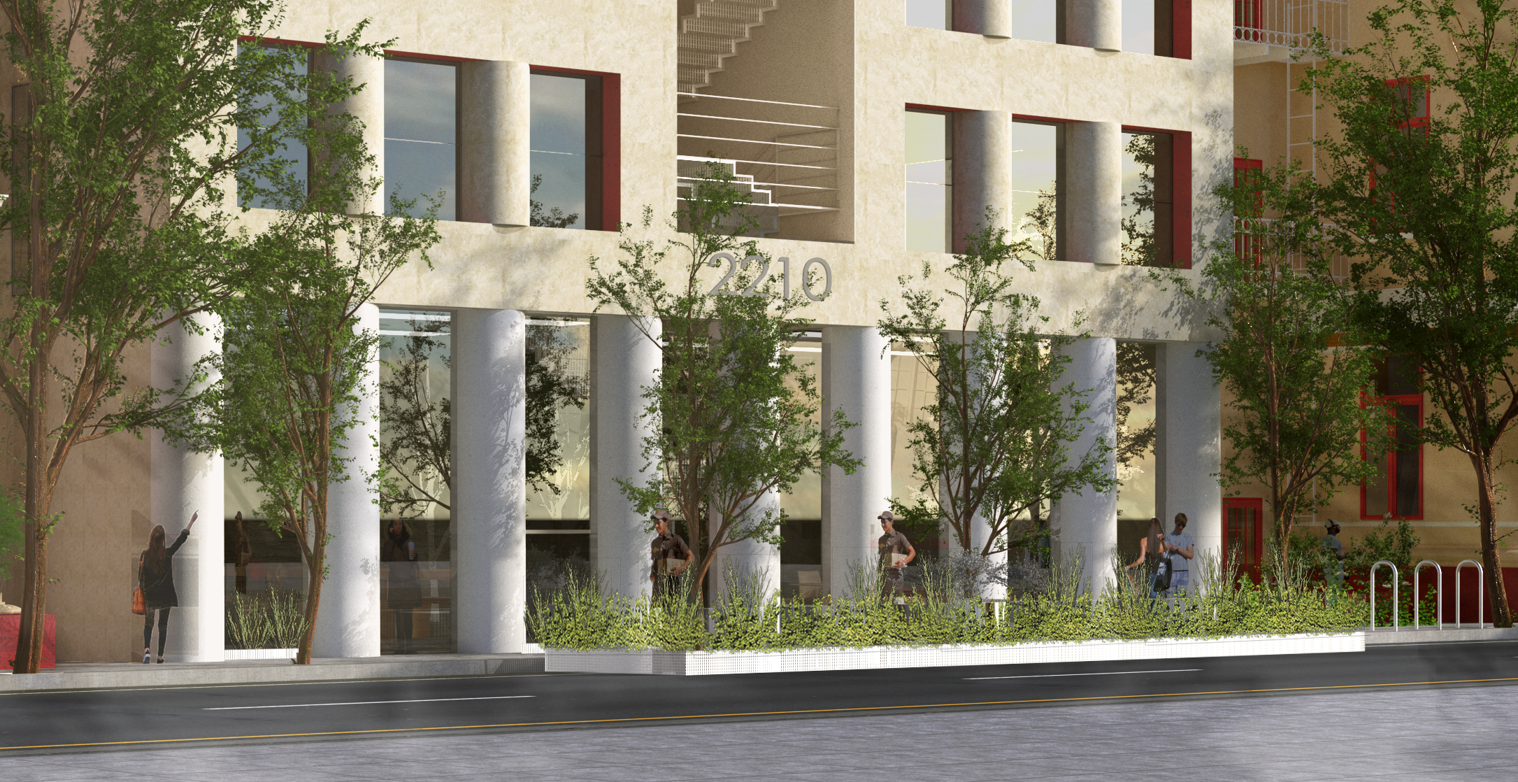 A colonnade at the base of the building creates a transparent connection between interior and street. The 60’ wide façade is divided by an open stair, threading the street up the two flanks of building. Light wells and recessed windows carve the sides of the building to ventilate and illuminate the rooms within.