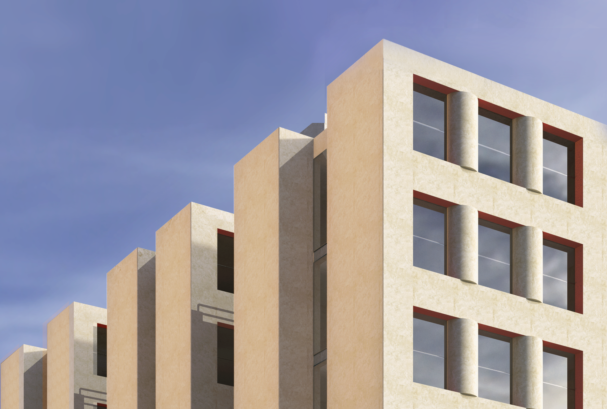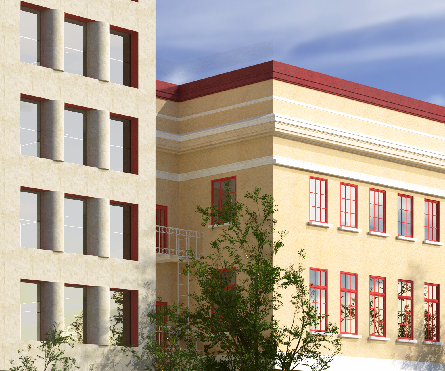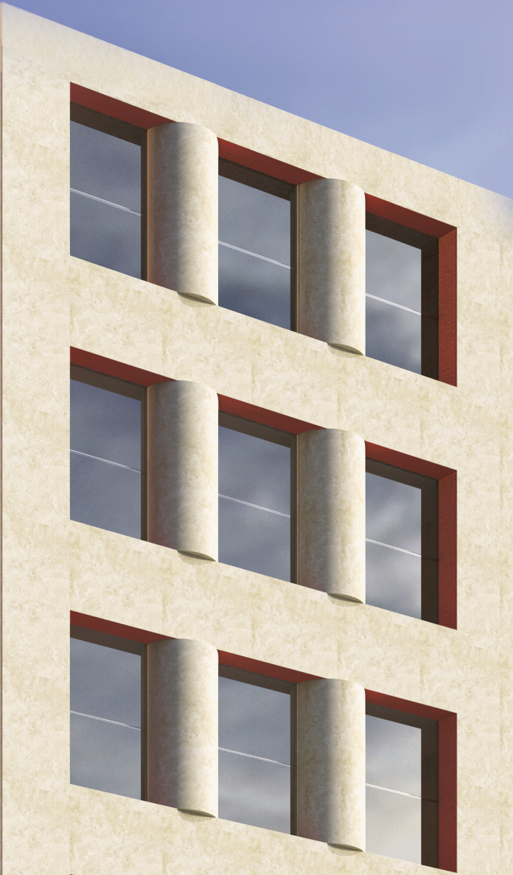 The columns which form the colonnade continue up the face of the building, articulating the window openings lined with terracotta which continue the tile of the adjoining roofs. The building surface of stucco perforated with windows mirrors the neighbors. The façade is both complimentary and contemporary.