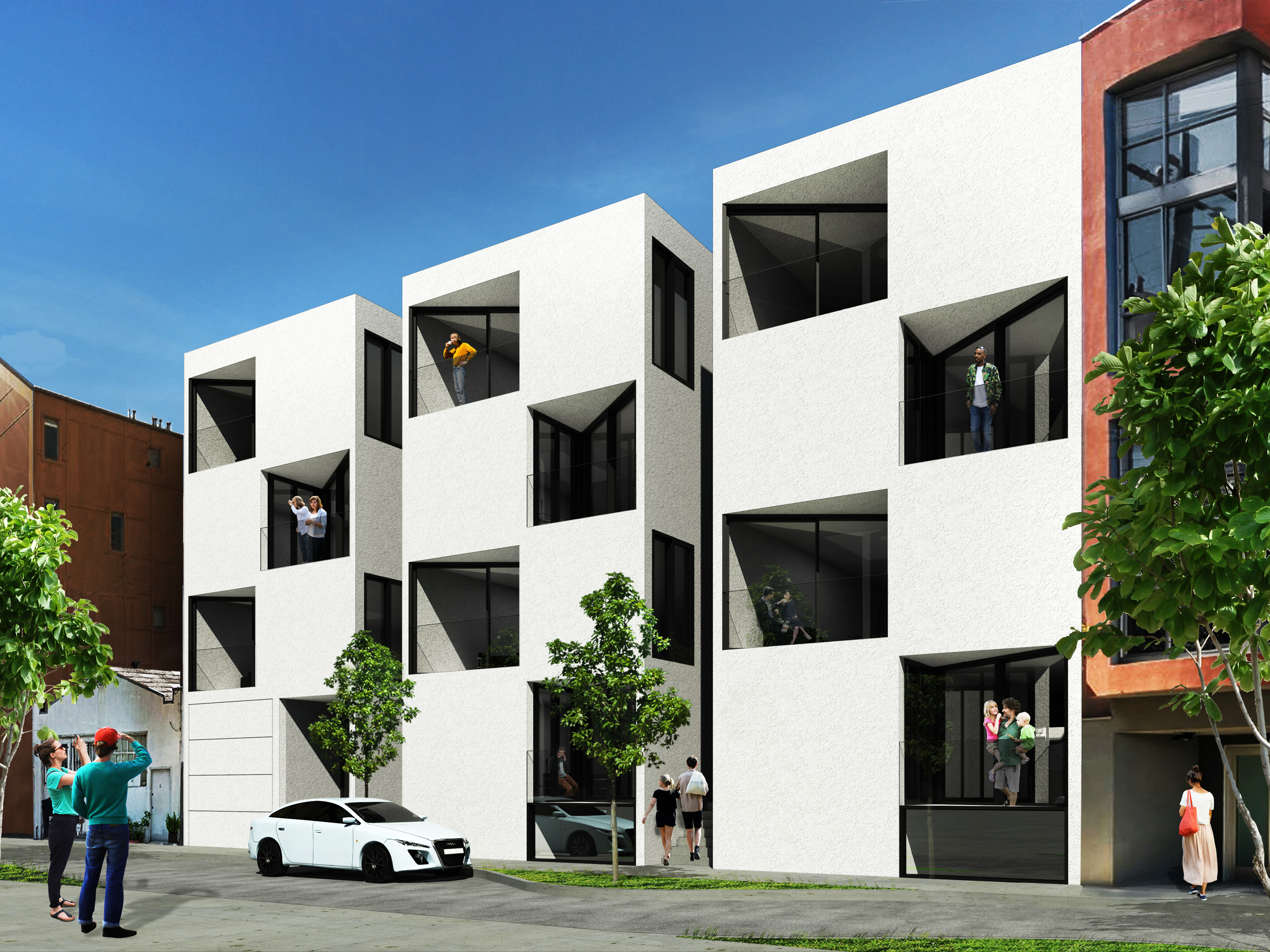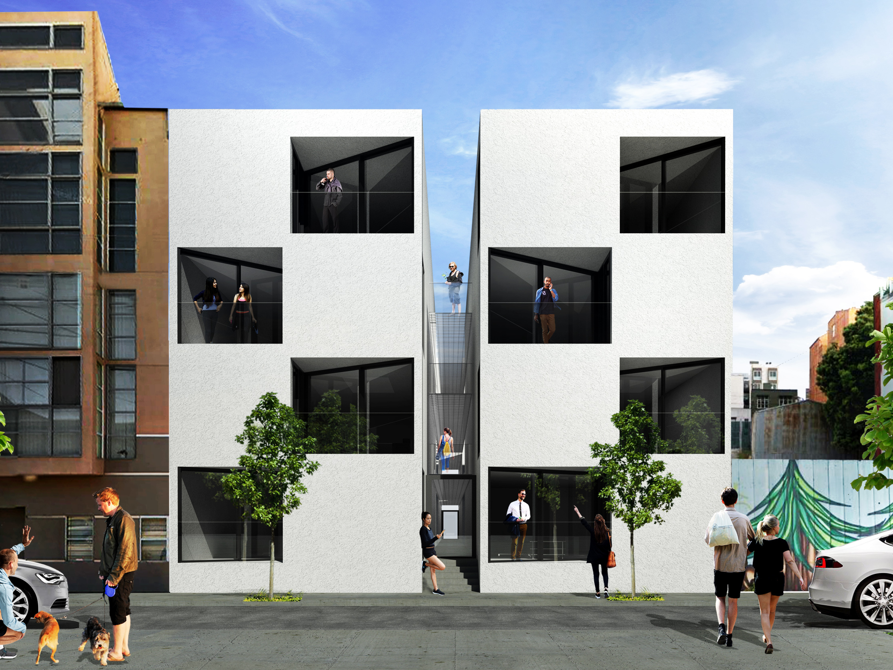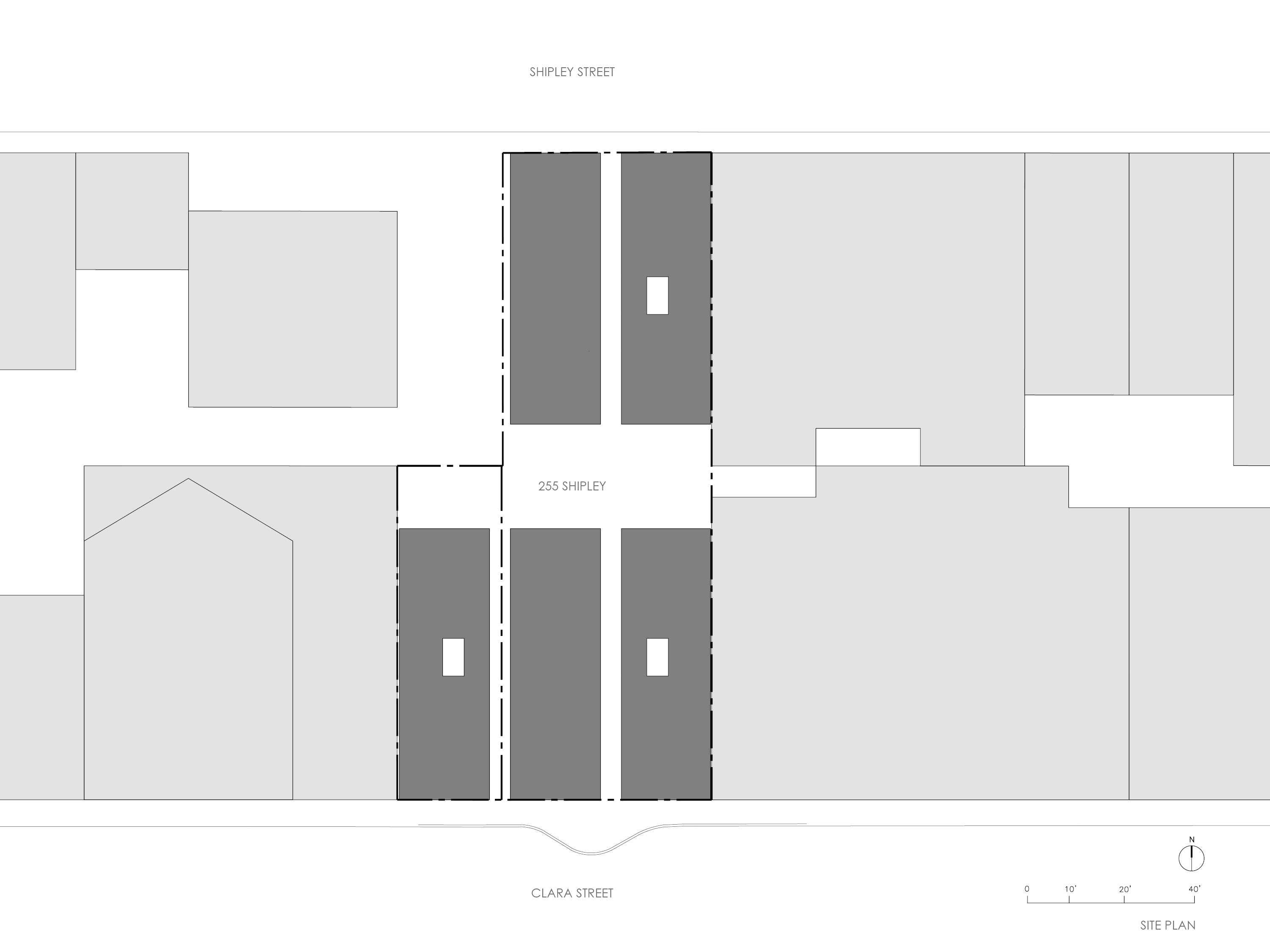 255 Shipley is a SOMA mid-block site with two 25’ wide lots on Shipley, and three 25’ lots on Clara. A building is built on each lot, with slots of open circulation connecting them, and a shared mid-block rear yard. These five buildings become a village like ensemble with opportunities for light and neighborliness in the slots. On both Shipley and Clara, incised bays create balconies for the units while maintaining the flat street walls typical of alleyways. The shared rear yard is bridged by a link that connects the buildings. On Clara, a half sunken PDR space is provided, with parking occupying the remainder of the site. Each floor of each of the 5 buildings is an independent detached dwelling.