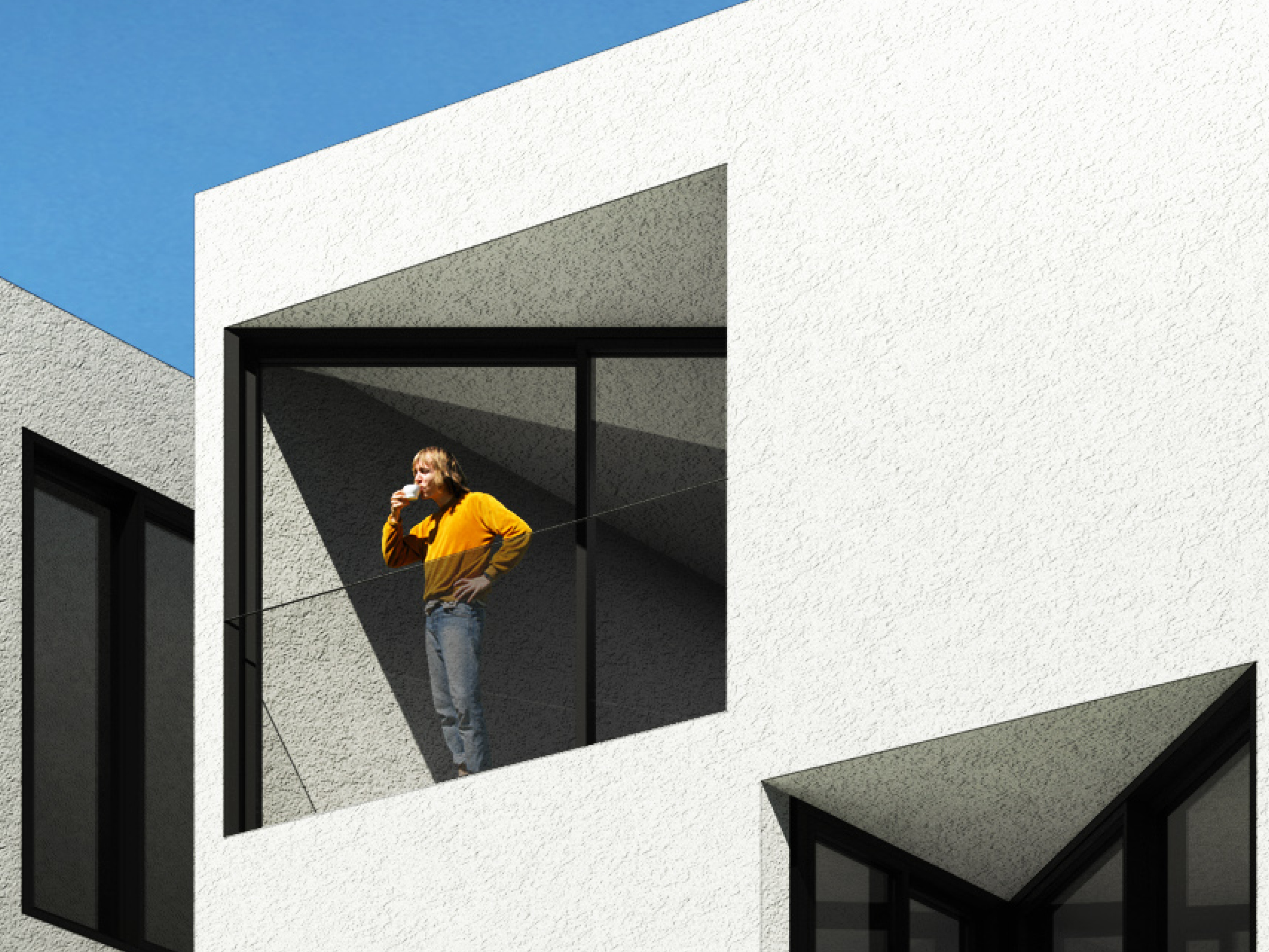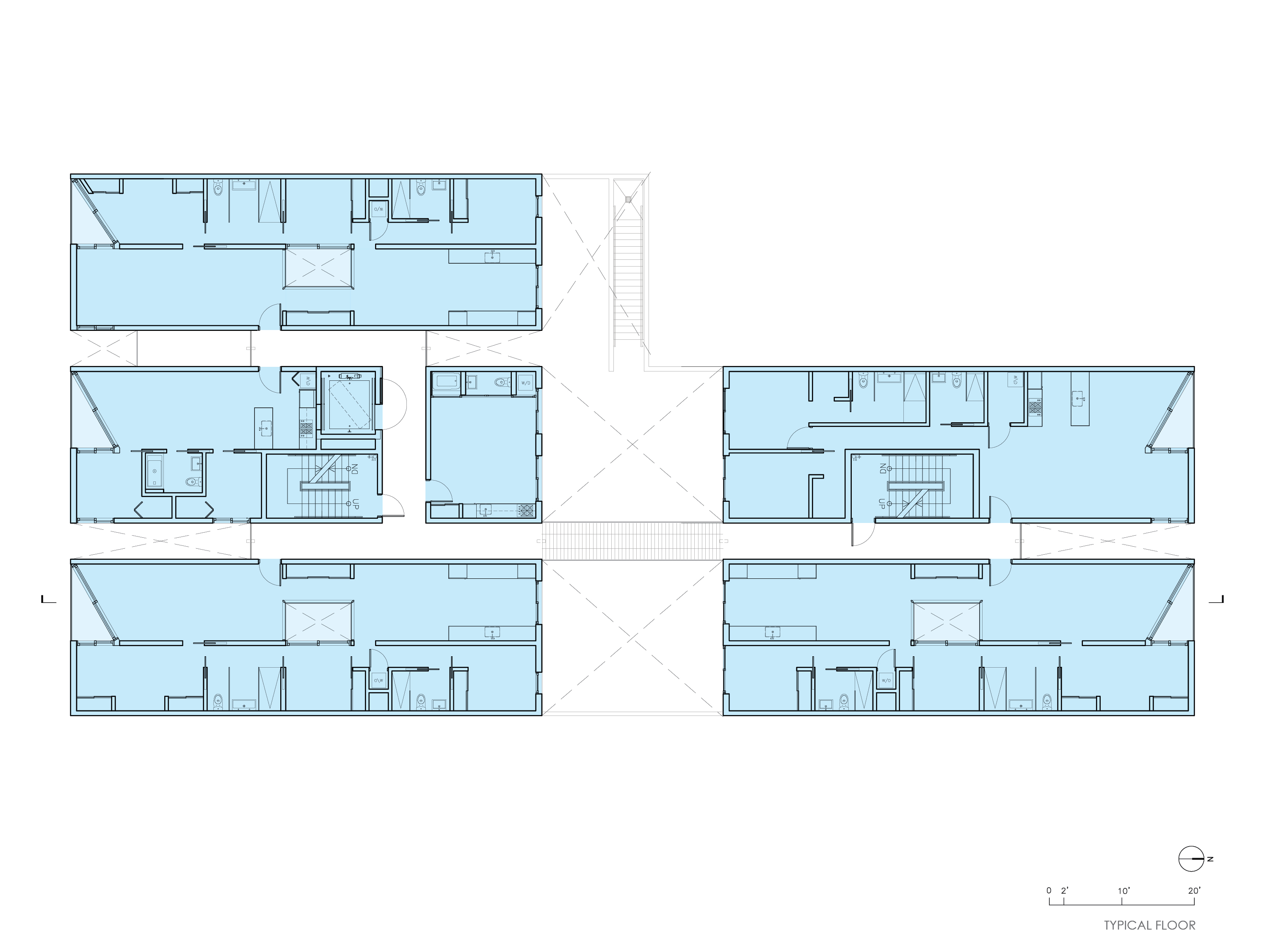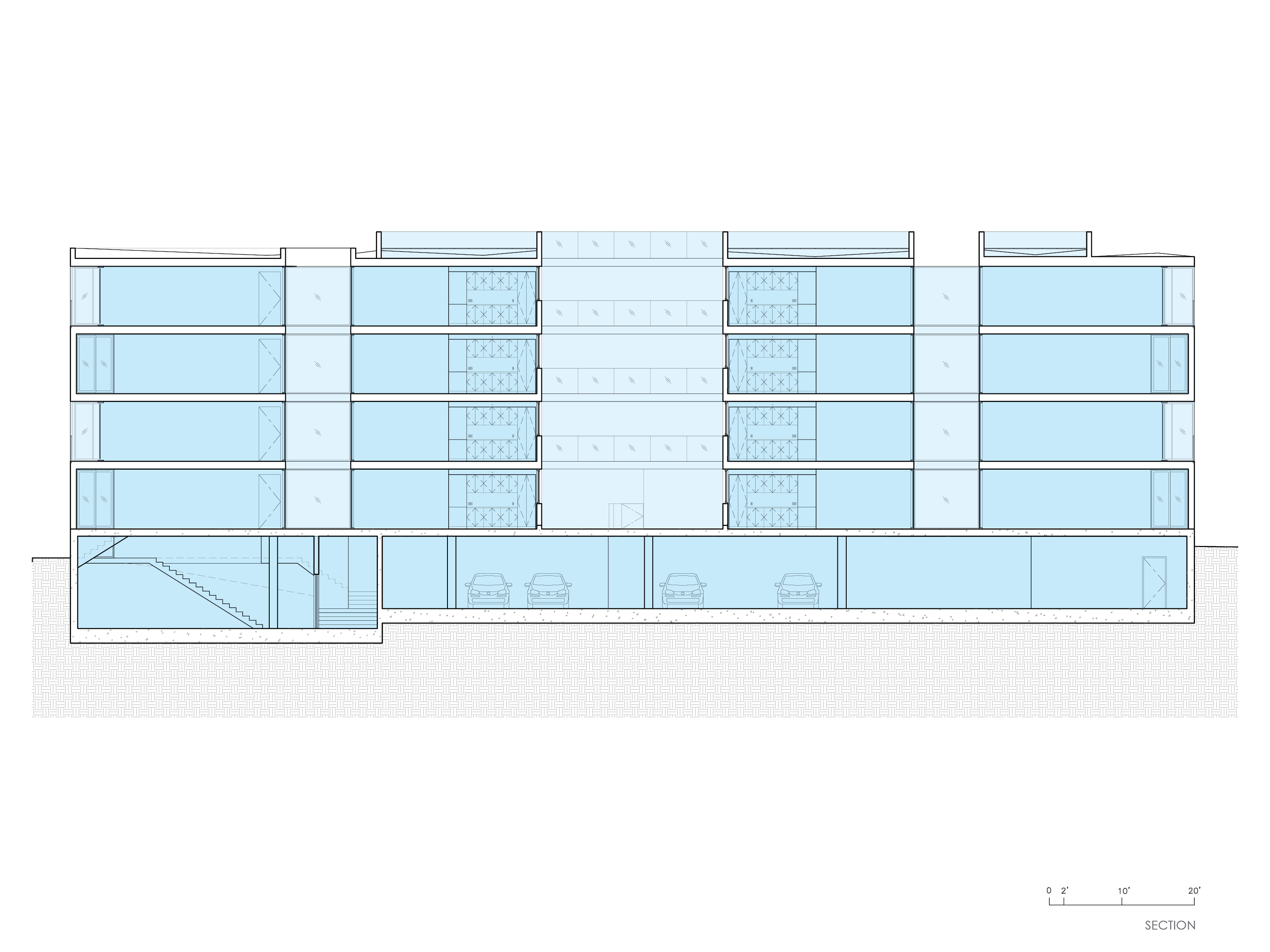 255 Shipley is a SOMA mid-block site with two 25’ wide lots on Shipley, and three 25’ lots on Clara. A building is built on each lot, with slots of open circulation connecting them, and a shared mid-block rear yard. These five buildings become a village like ensemble with opportunities for light and neighborliness in the slots. On both Shipley and Clara, incised bays create balconies for the units while maintaining the flat street walls typical of alleyways. The shared rear yard is bridged by a link that connects the buildings. On Clara, a half sunken PDR space is provided, with parking occupying the remainder of the site. Each floor of each of the 5 buildings is an independent detached dwelling.