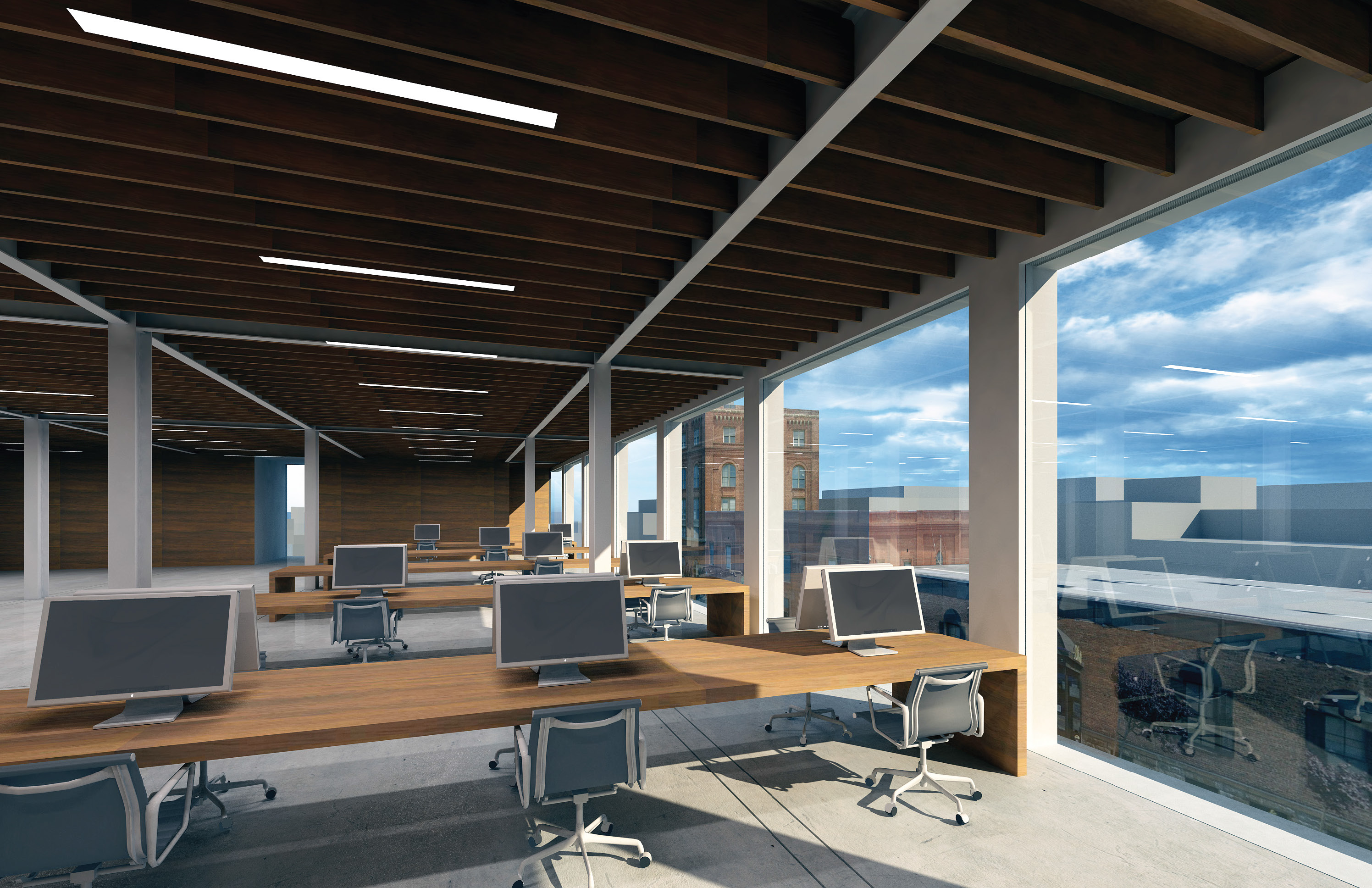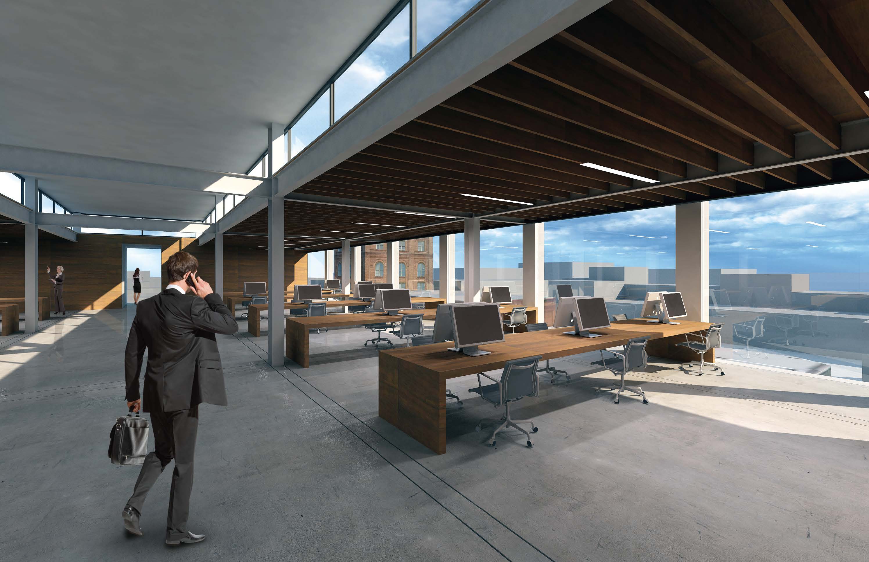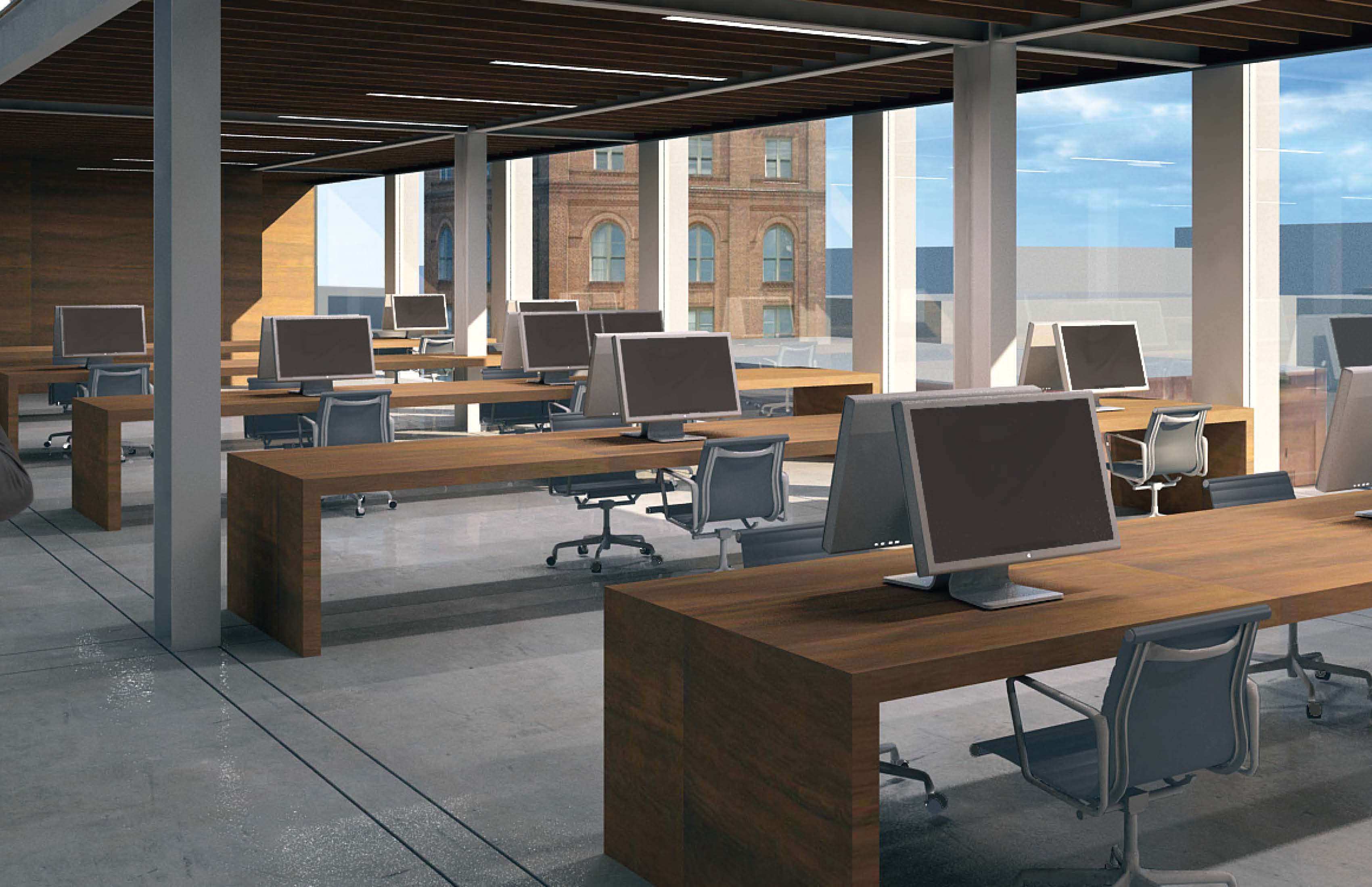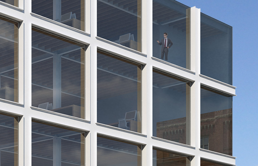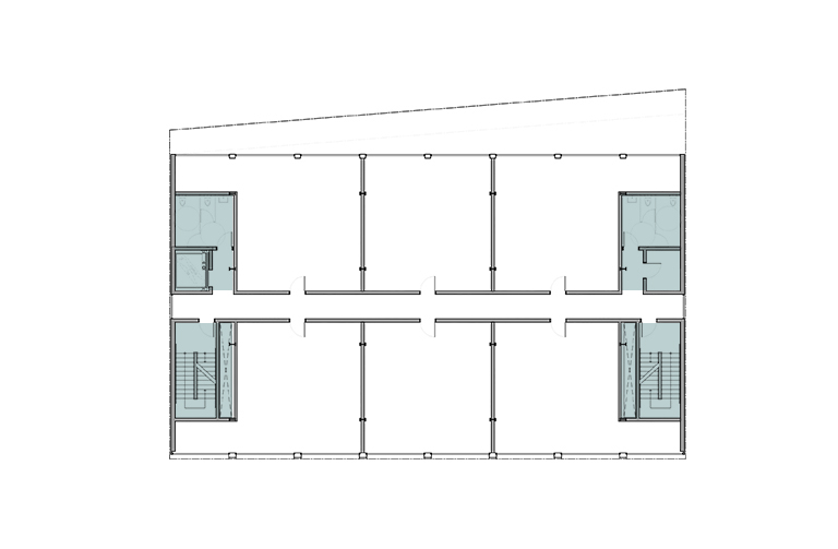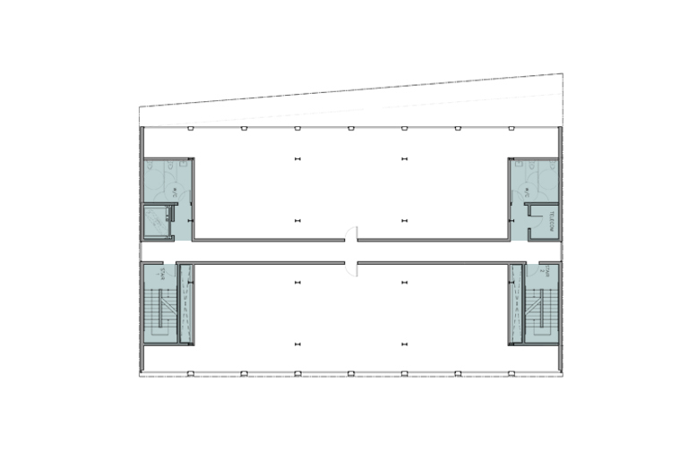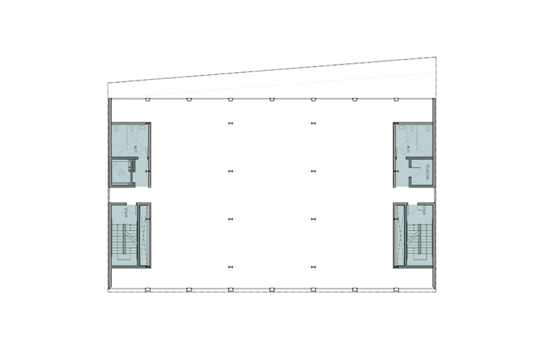 340-350 11th Street is a contemporary version of this building type. Construction now is lighter and more efficient. Glazing is larger, and structure smaller steel frames, with engineered timber infill. The two party walls are thickened to contain all fixed services, stairs, elevator, bathrooms and kitchens. Mechanical systems track the glazing on the two exposed facades. The floor plates in between remain open with minimal predetermination. The structure is exposed with the construction as the finish, providing a direct undisguised aesthetic.