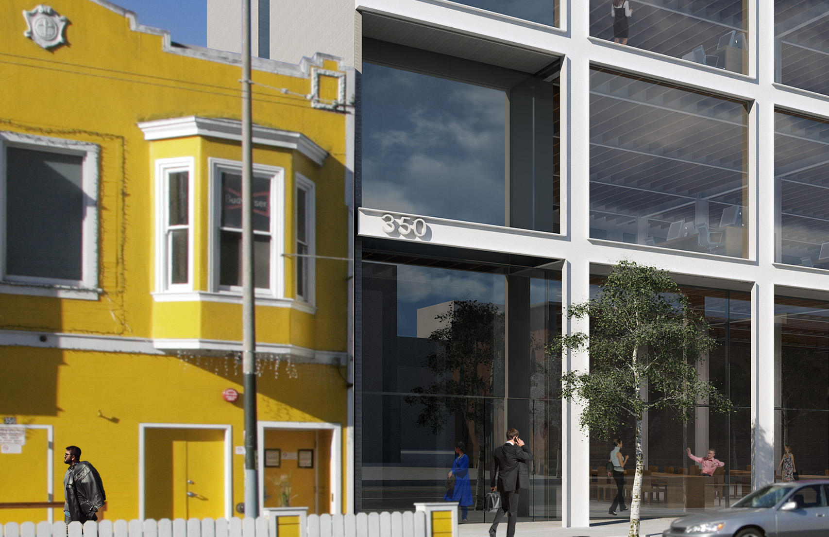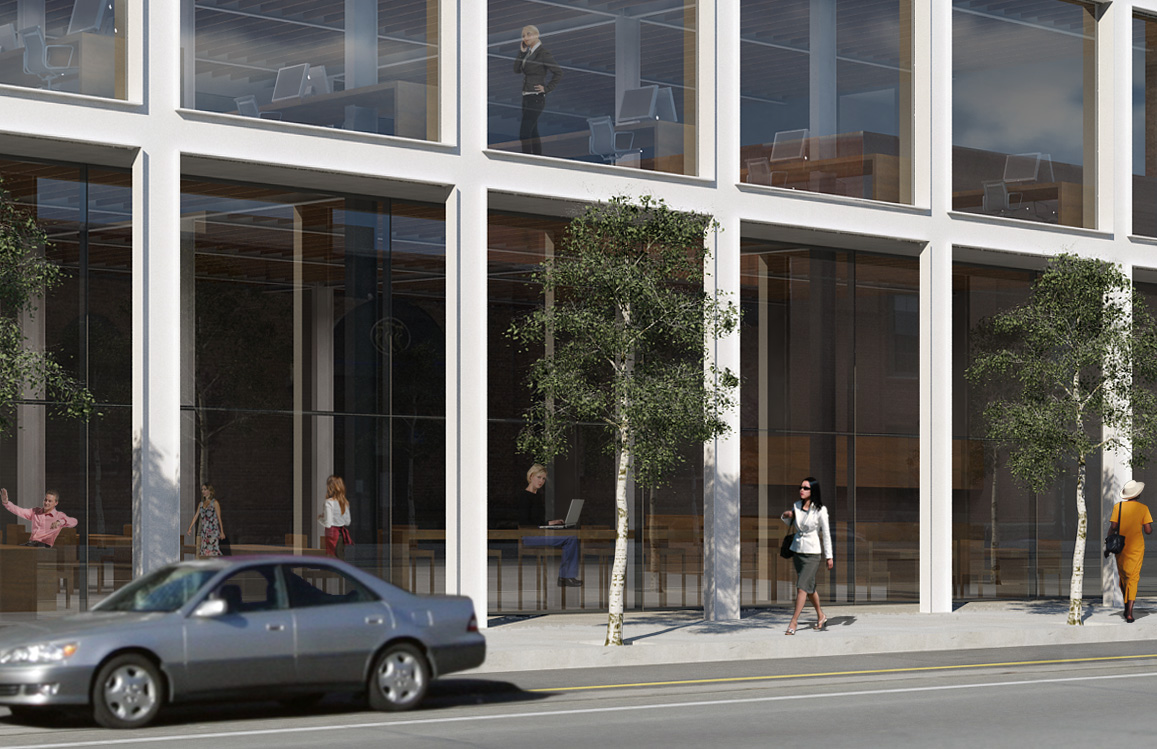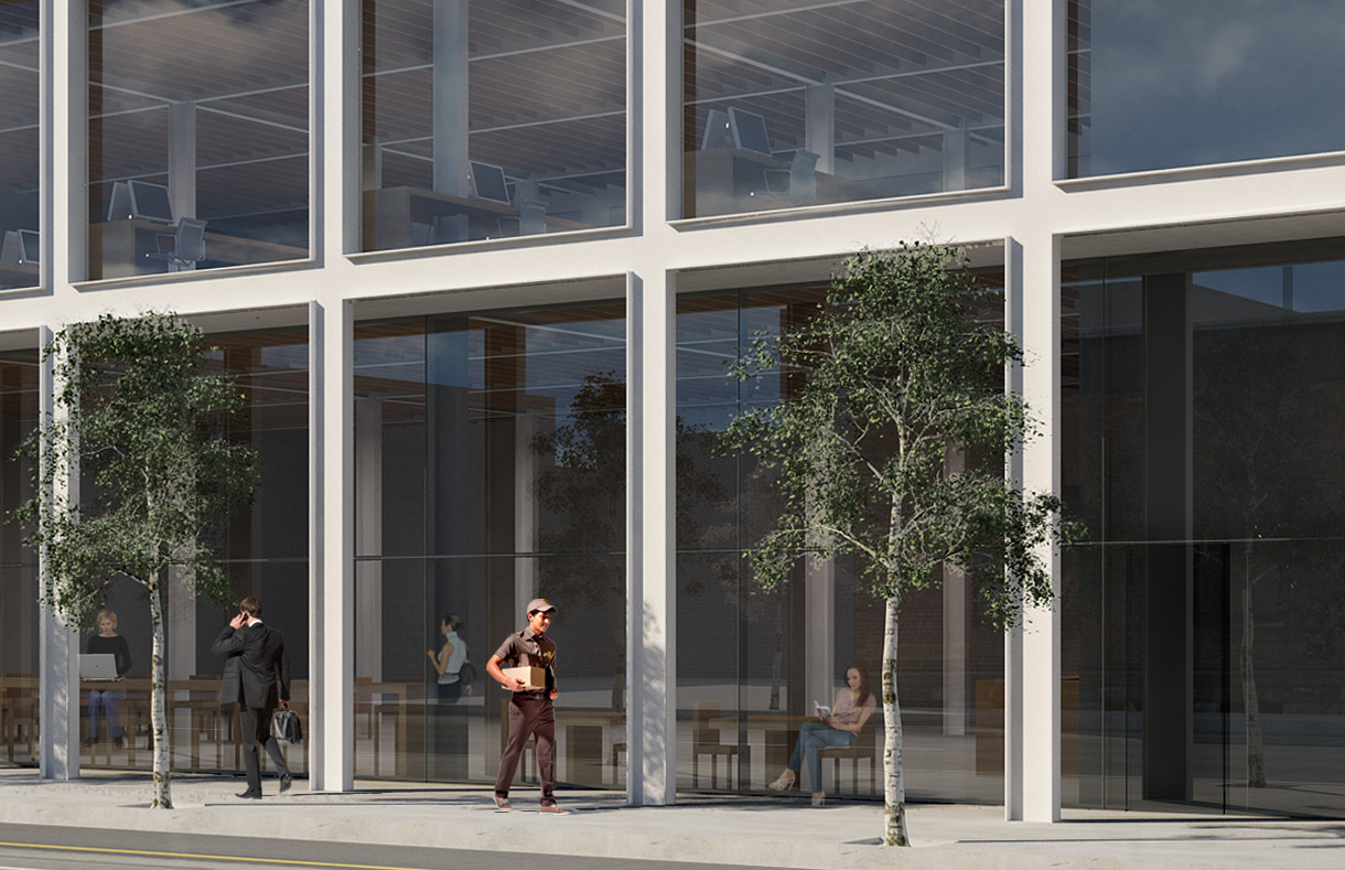 An arcade provides a boundary for commercial or restaurant use along the 11th Street frontage.