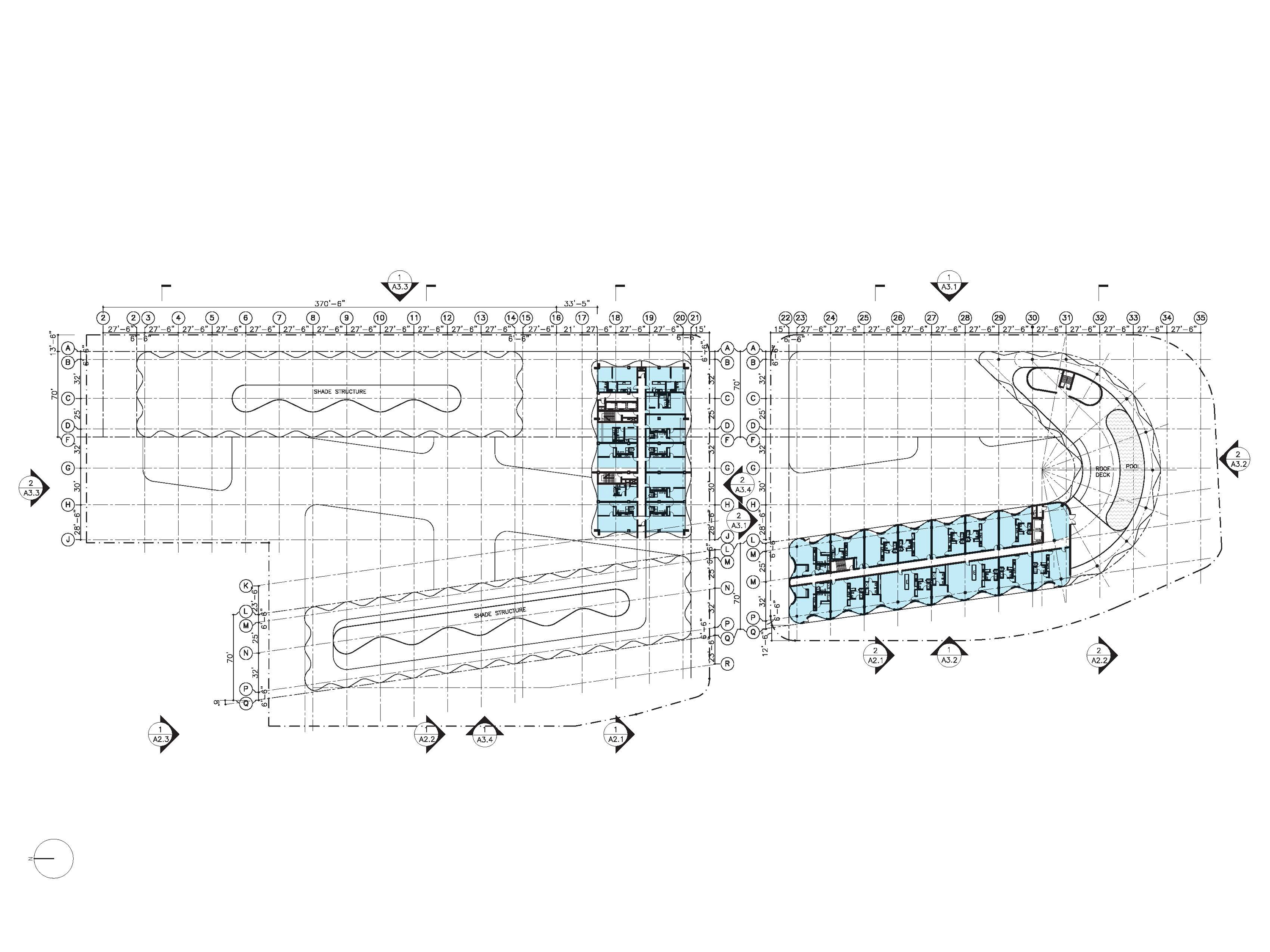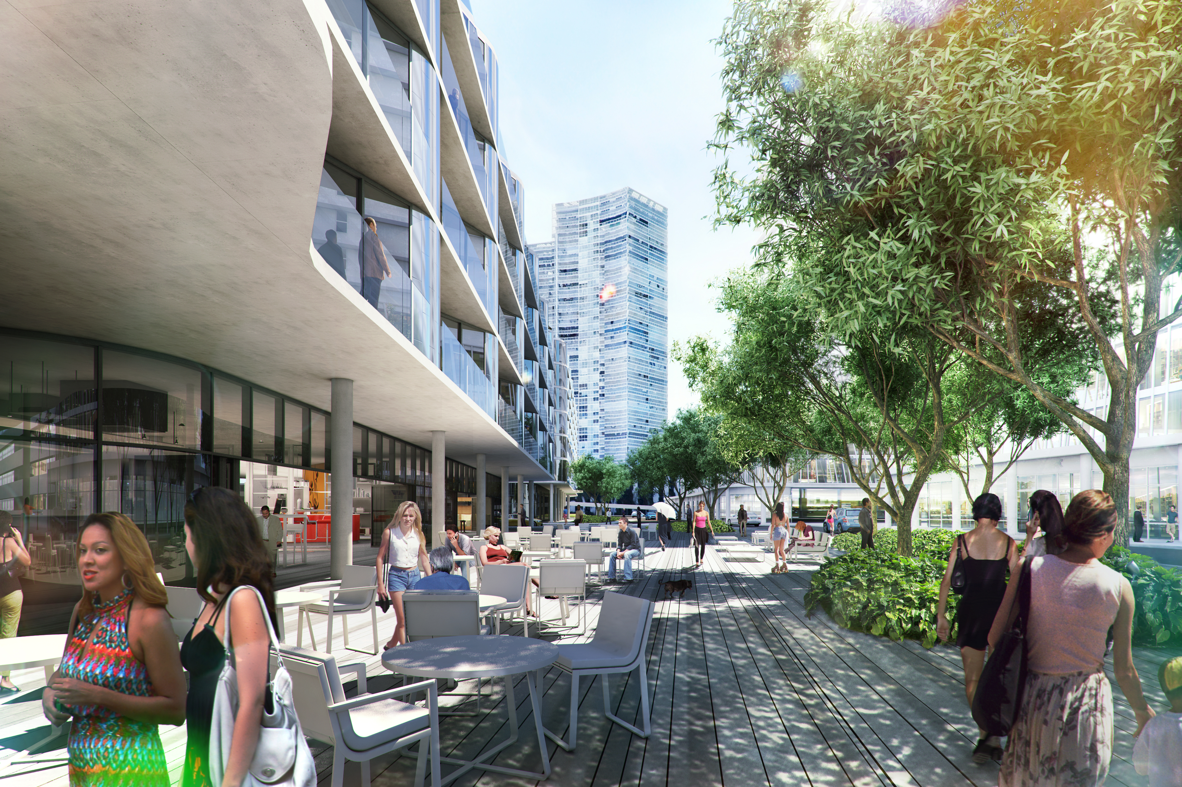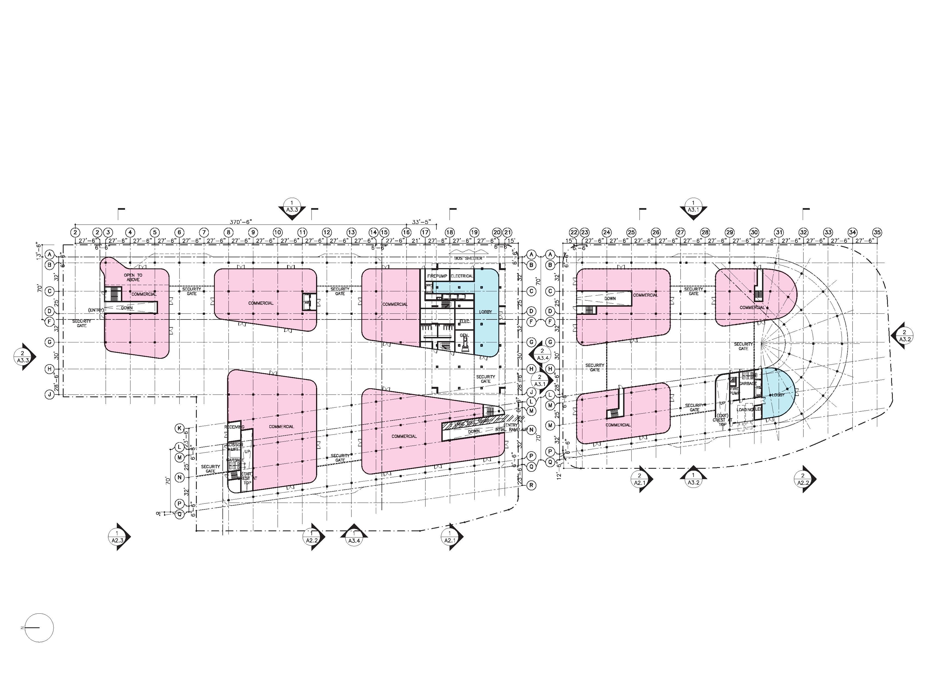 Sixth Street is the hub which links the blocks and becomes the center of access for the project. Drop off for the ground floor activities, access to the parking basements for cars and bikes, and connection to the lobbies are from this area.