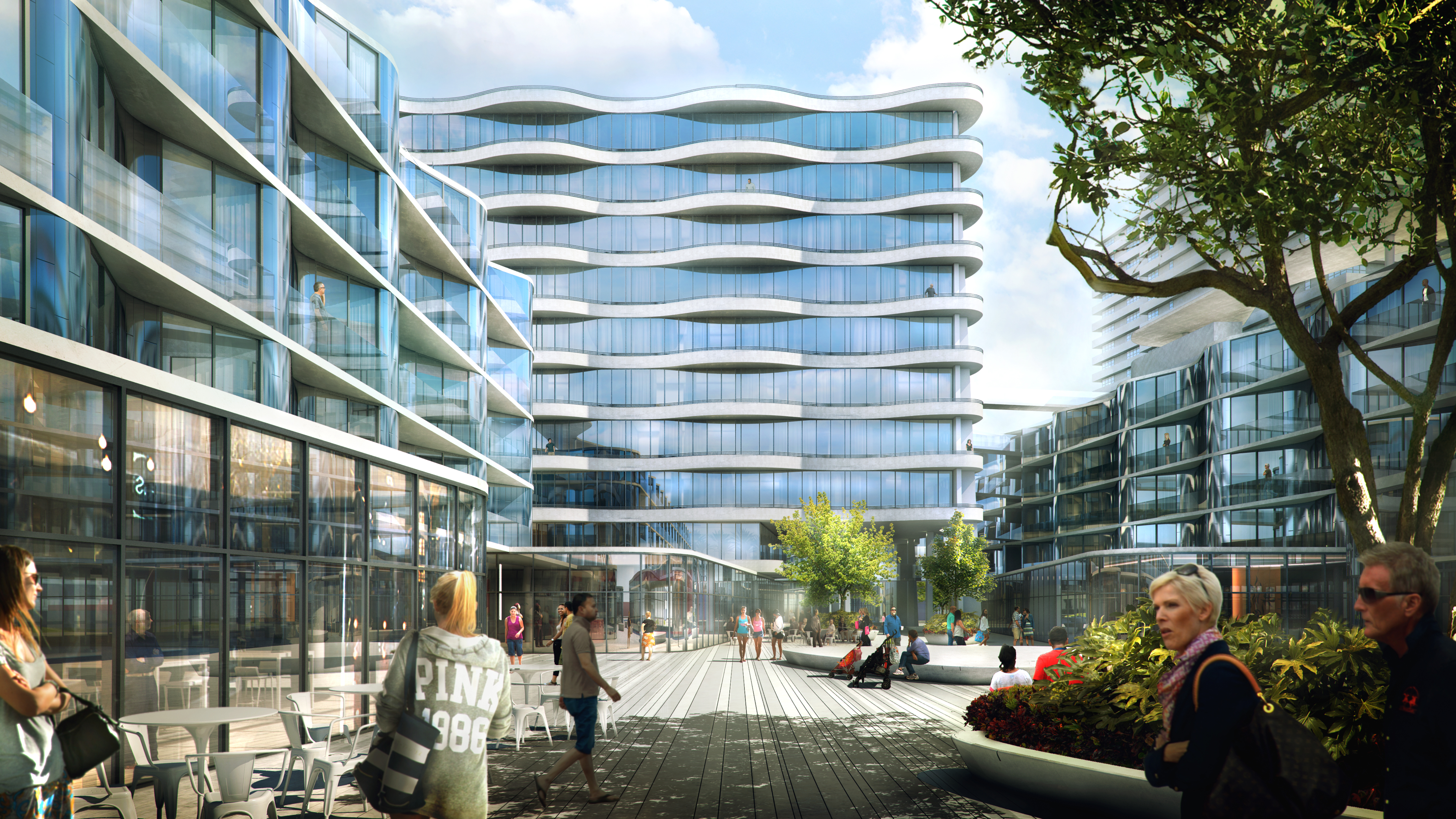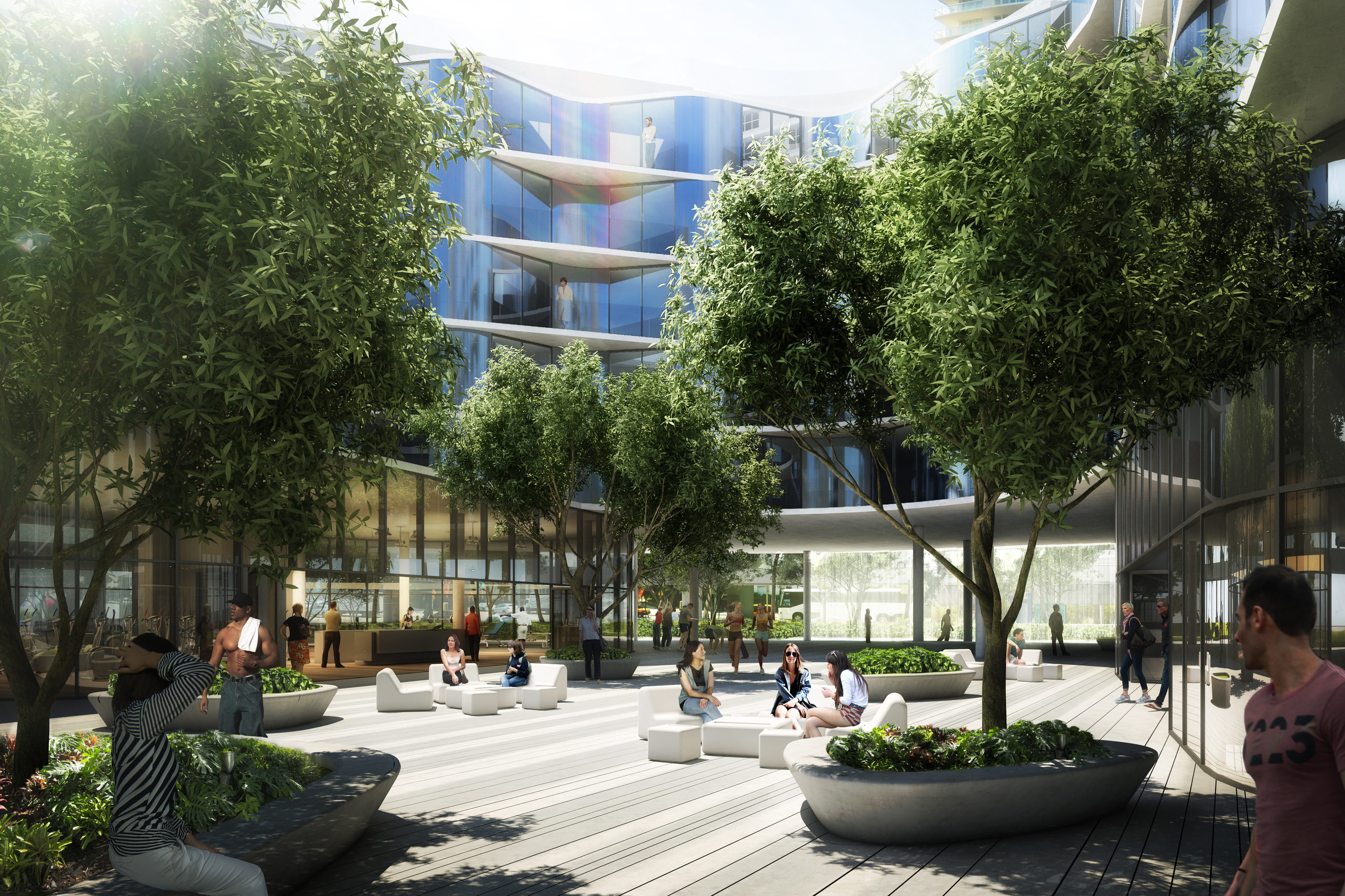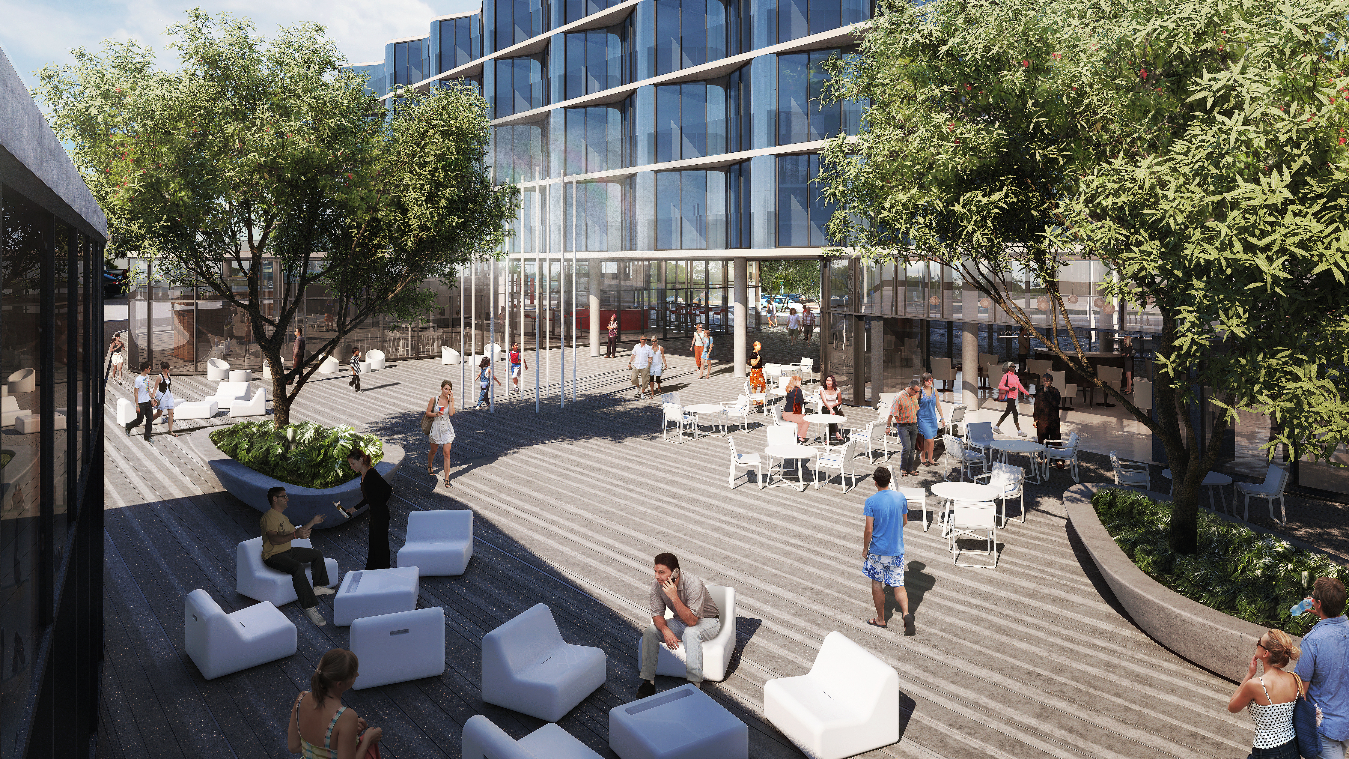 Sixth Street is the hub which links the blocks and becomes the center of access for the project. Drop off for the ground floor activities, access to the parking basements for cars and bikes, and connection to the lobbies are from this area.