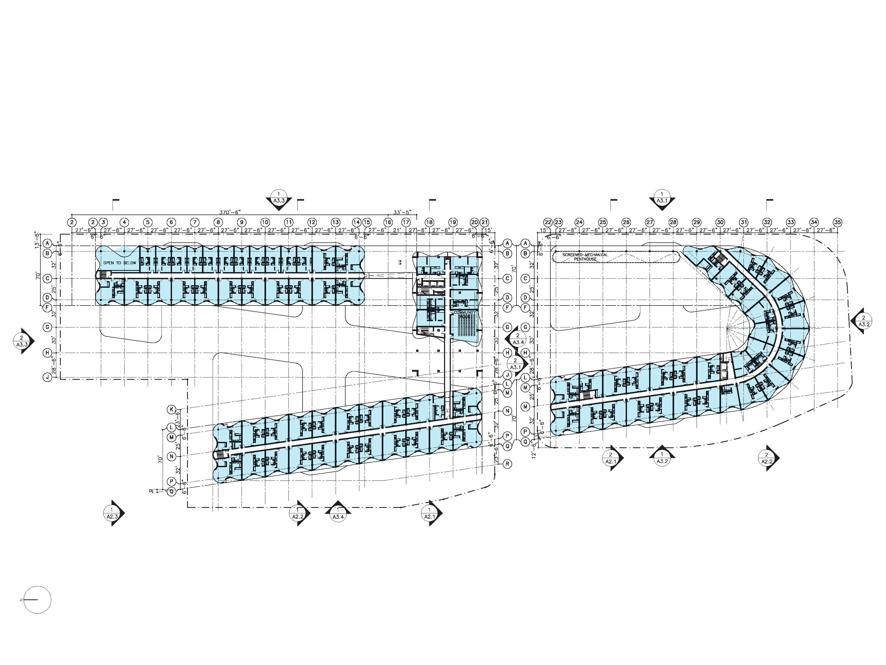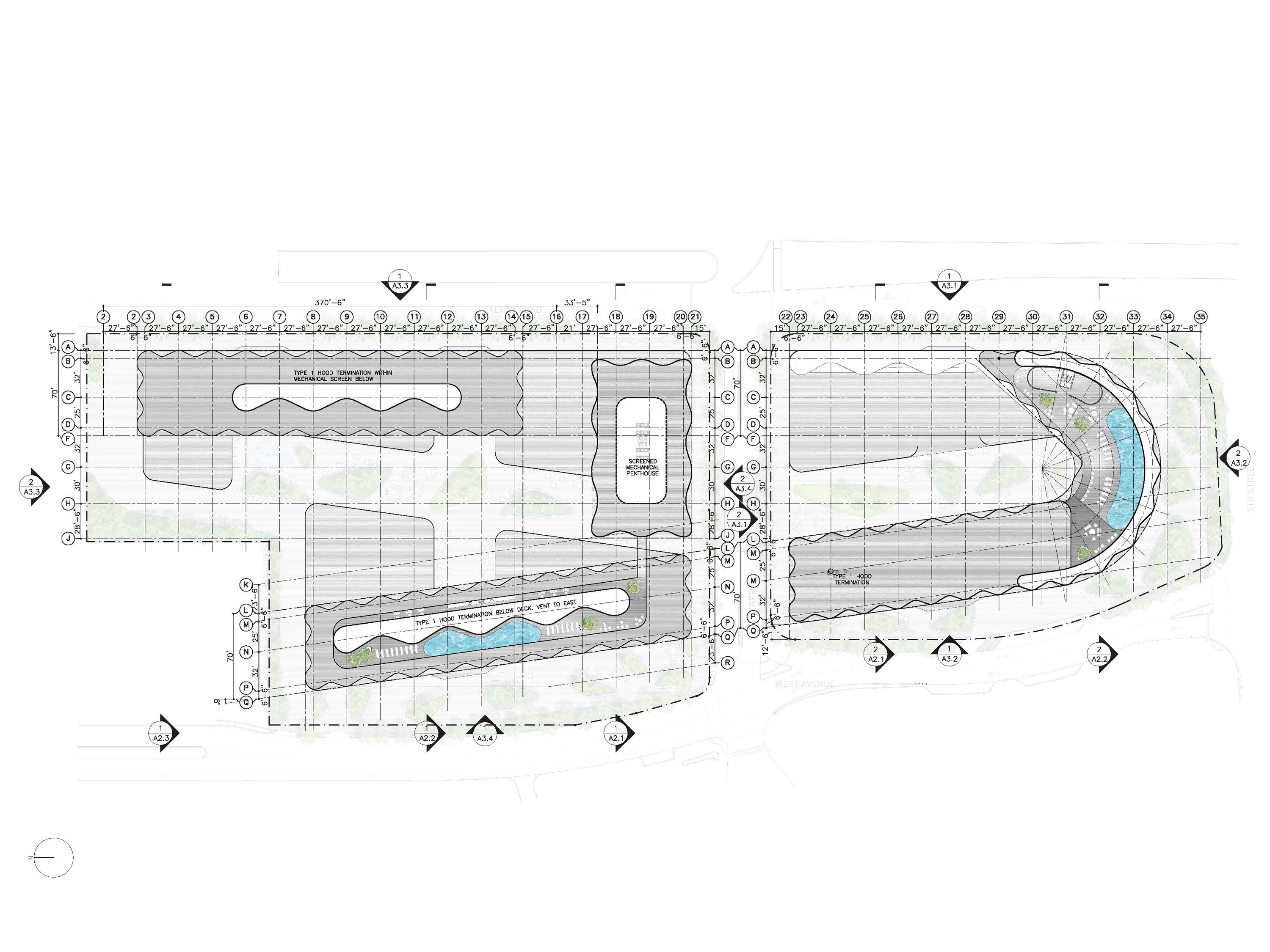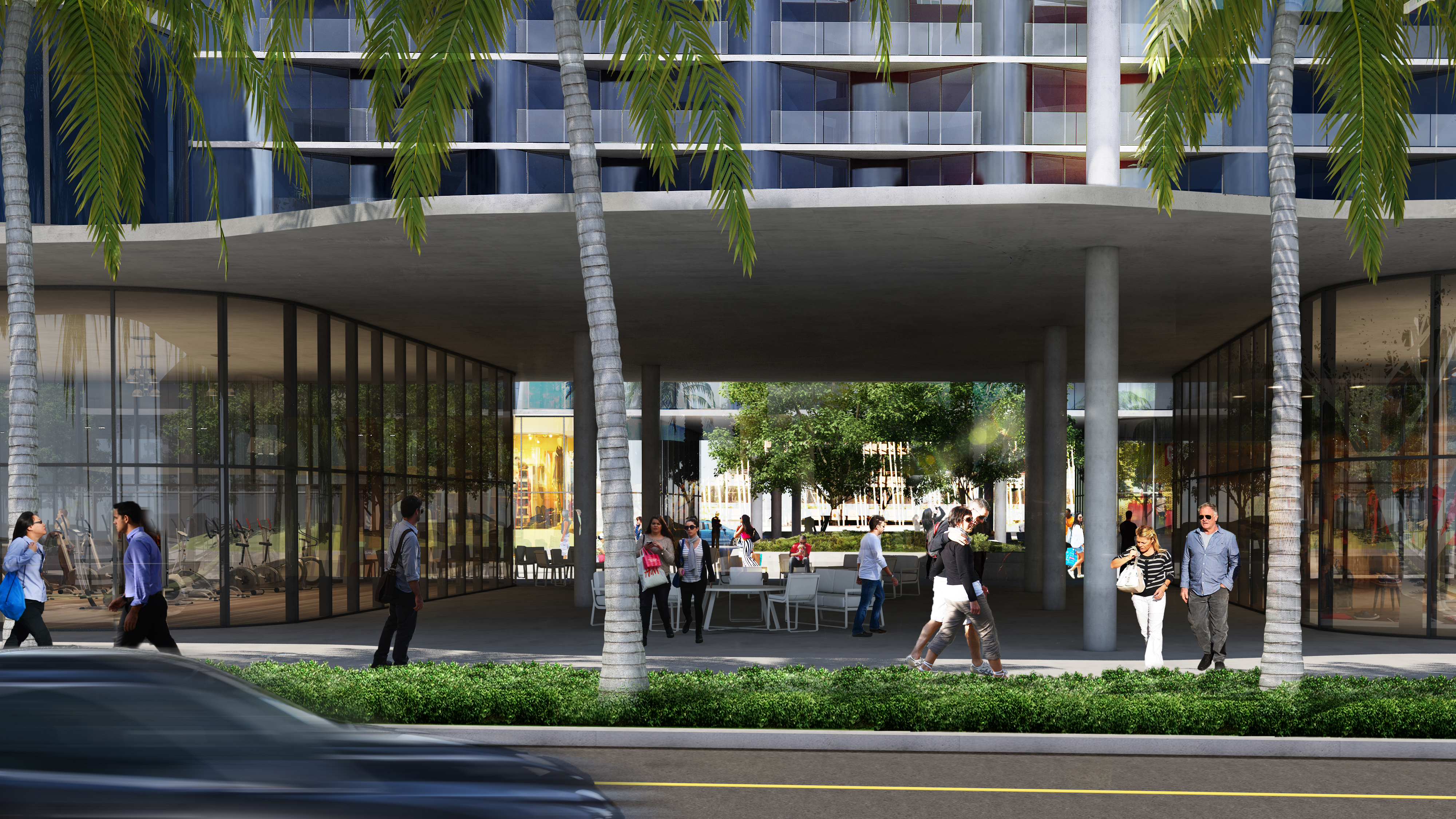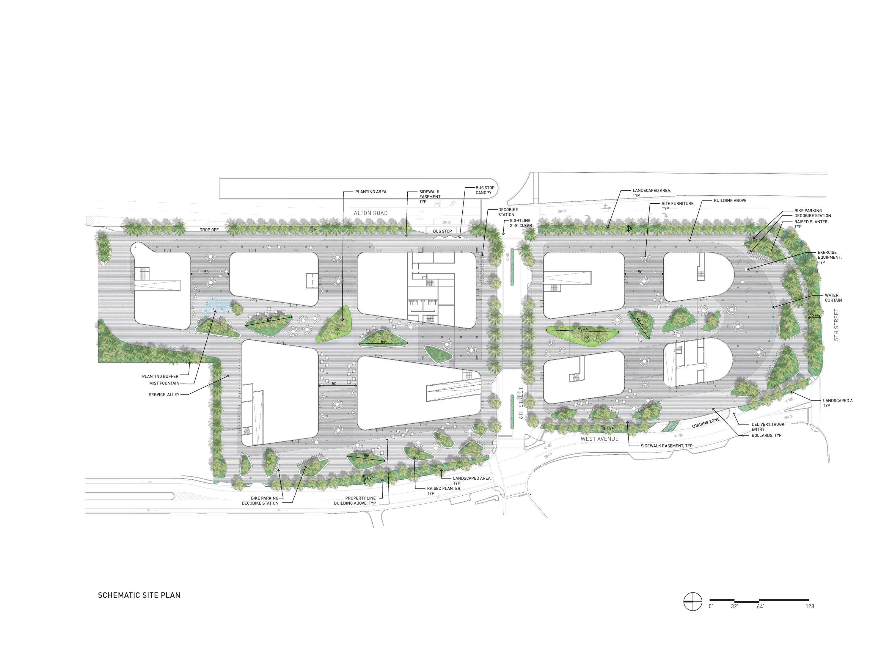 This interior is a shoreline of activities for both the residents of Waves apartments above, and the neighborhood beyond. Food, exercise, leisure, fun, and shopping are all provided. Large gateways invite Alton Road and West Avenue to flow though and connect to the grid of pedestrian passages that crisscross the two blocks, linked by a parallel path that end in a landscape at the prowl on 5th Street. This activity spills out as a promenade on West Ave where seating and café life enliven the neighborhood street.