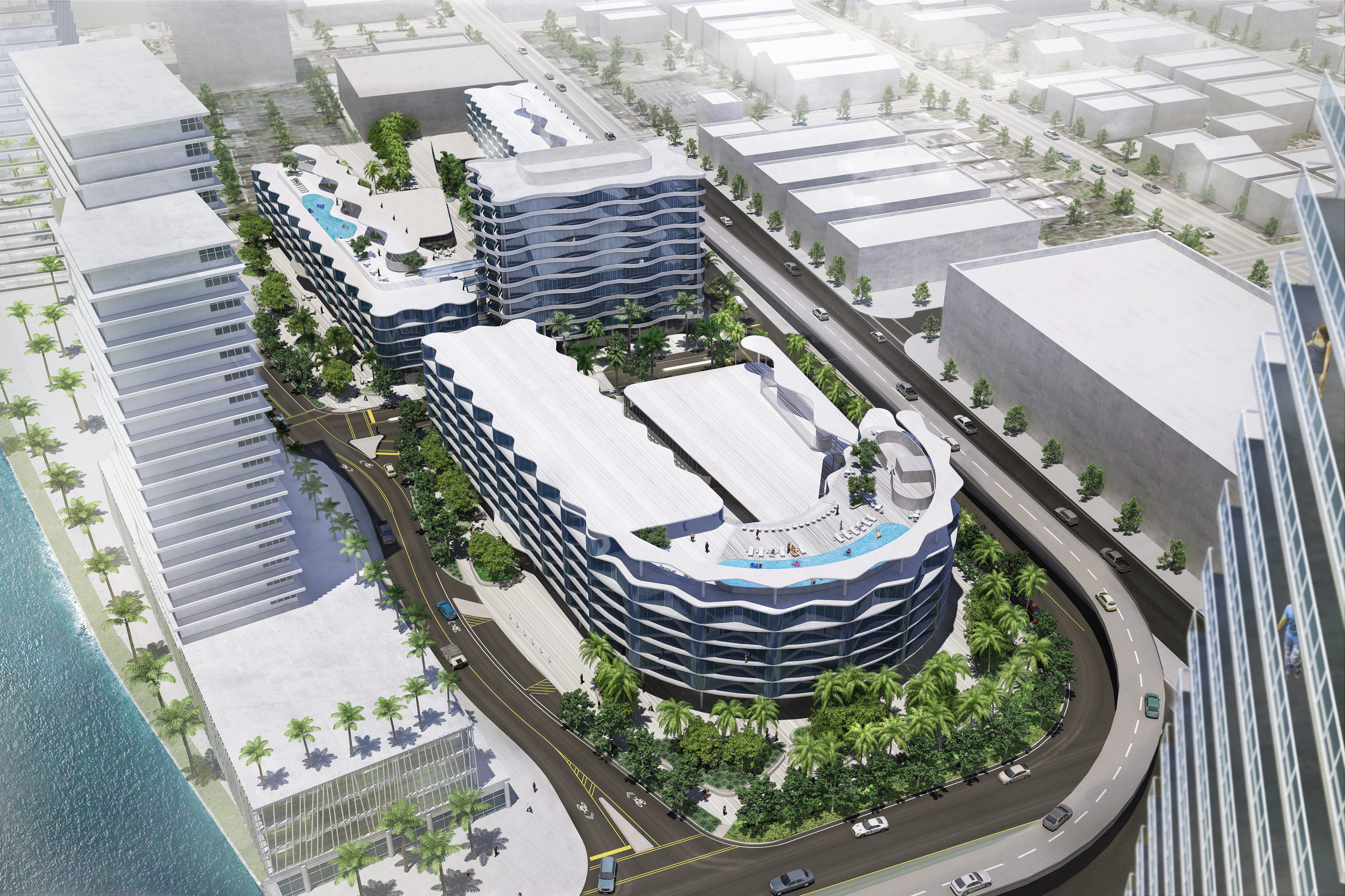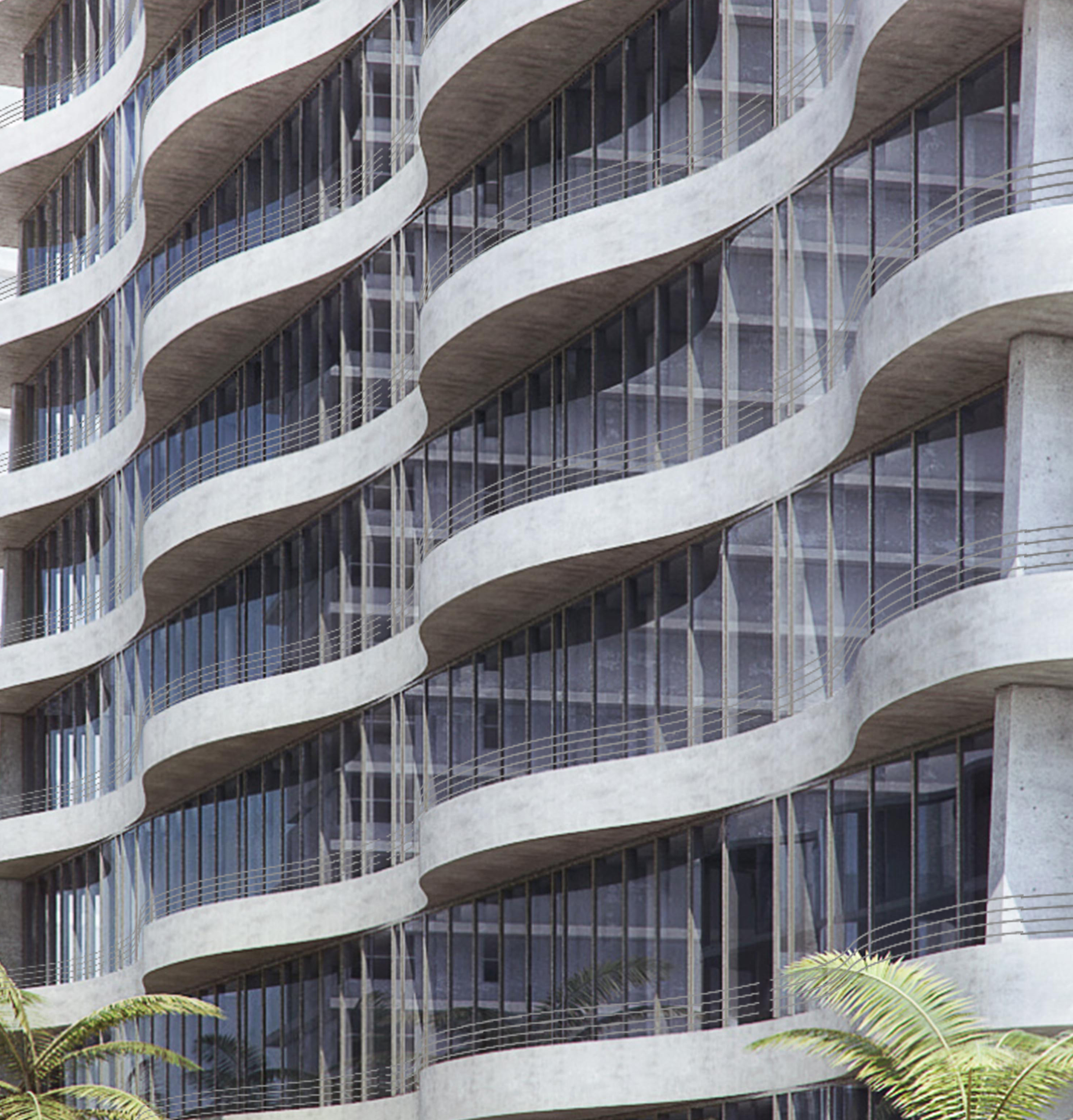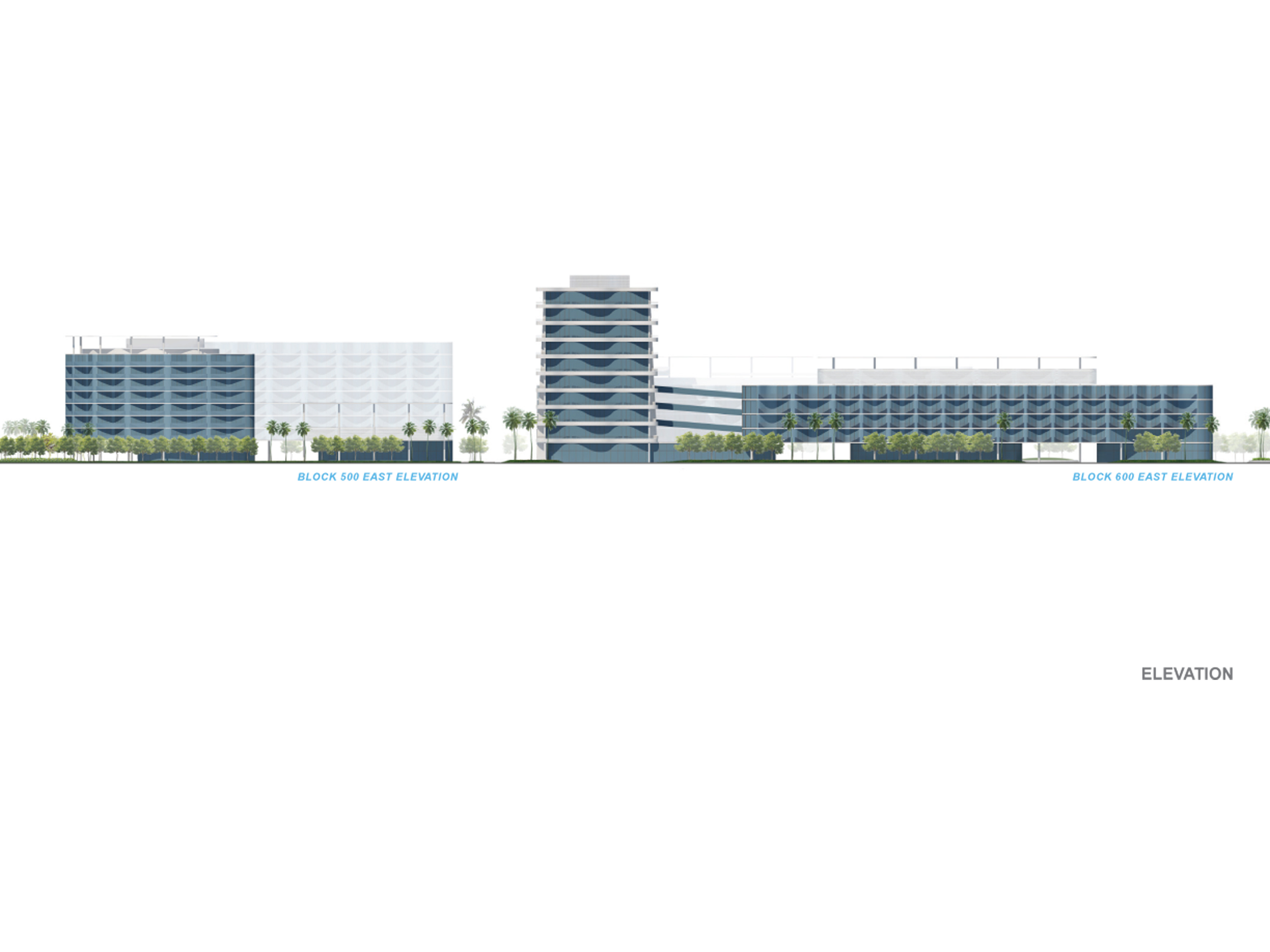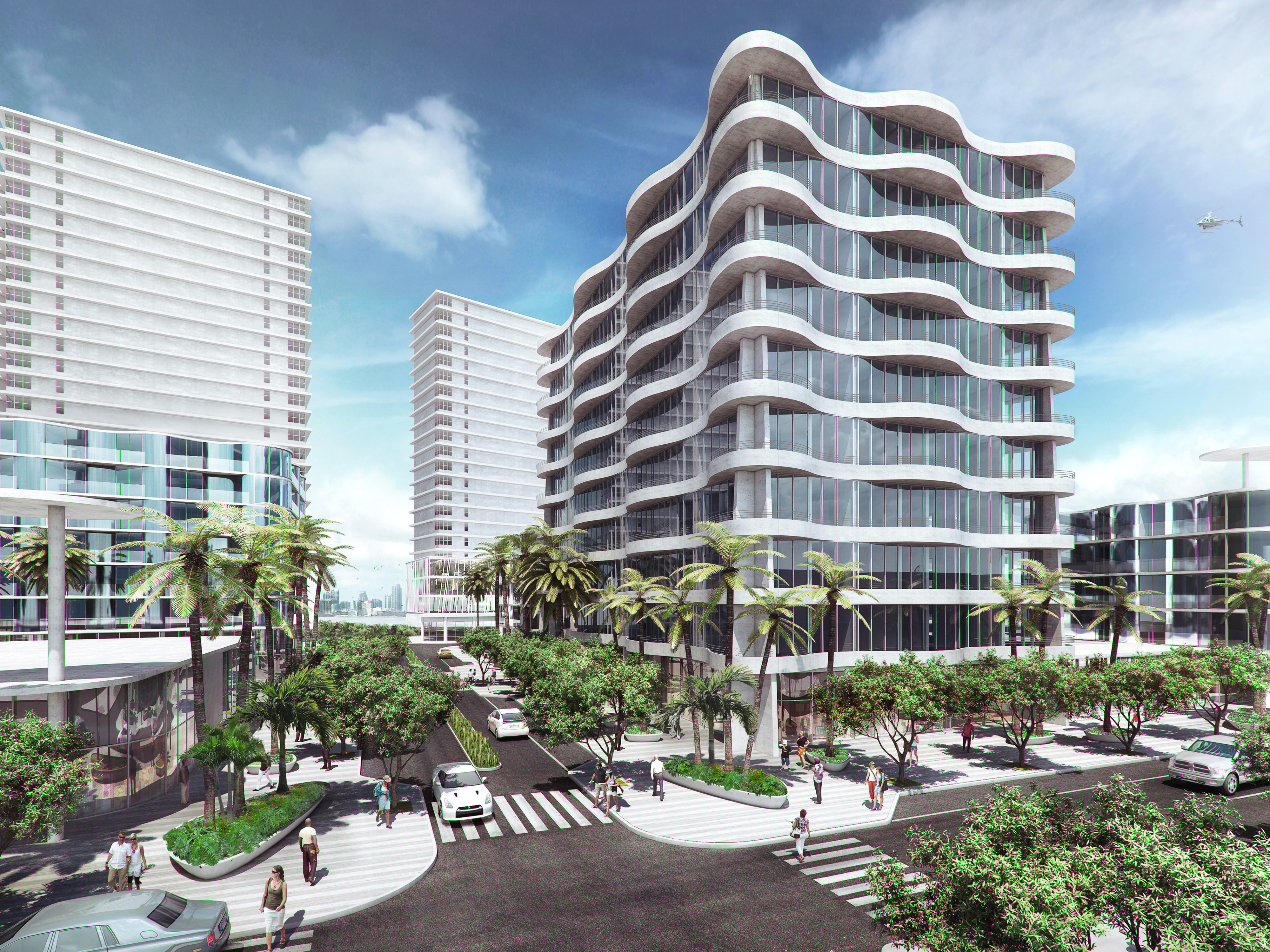 The subtropical modernism of Miami Beach, especially the resort hotels and their architecture of pleasure, is the inspiration for Waves. At this gateway site, Waves is a contemporary interpretation of this tradition.