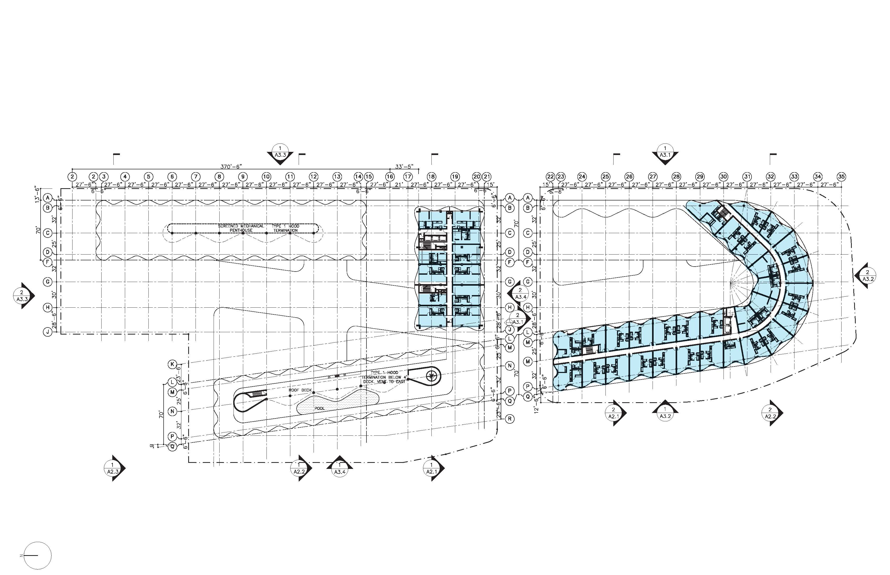 On the rooftops of both the 500 block prowl and the West Avenue leg of the 600 block are amenity areas with pools, decks, and shade structures.
