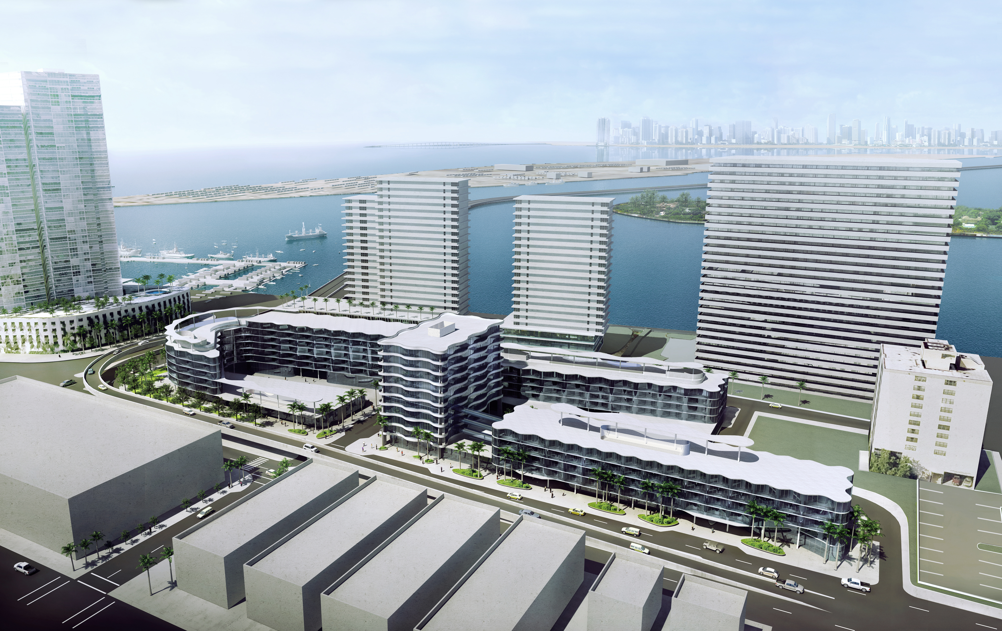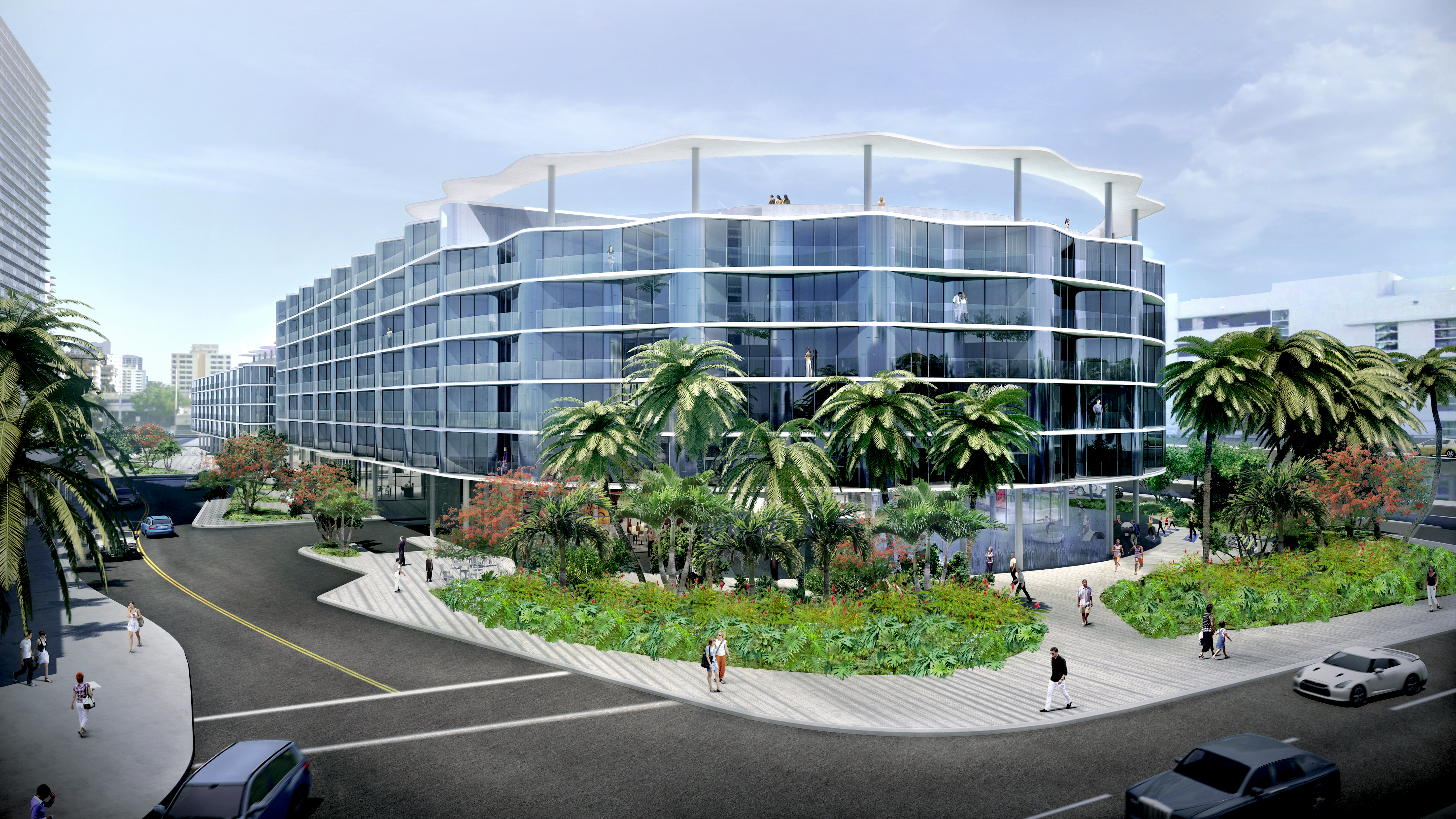 A horizontal ocean liner like building with is prowl anchored where the McArthur Causeway touches down in Miami Beach, the buildings wings reach out to connect to the city blocks it occupies, embracing a landscape within.