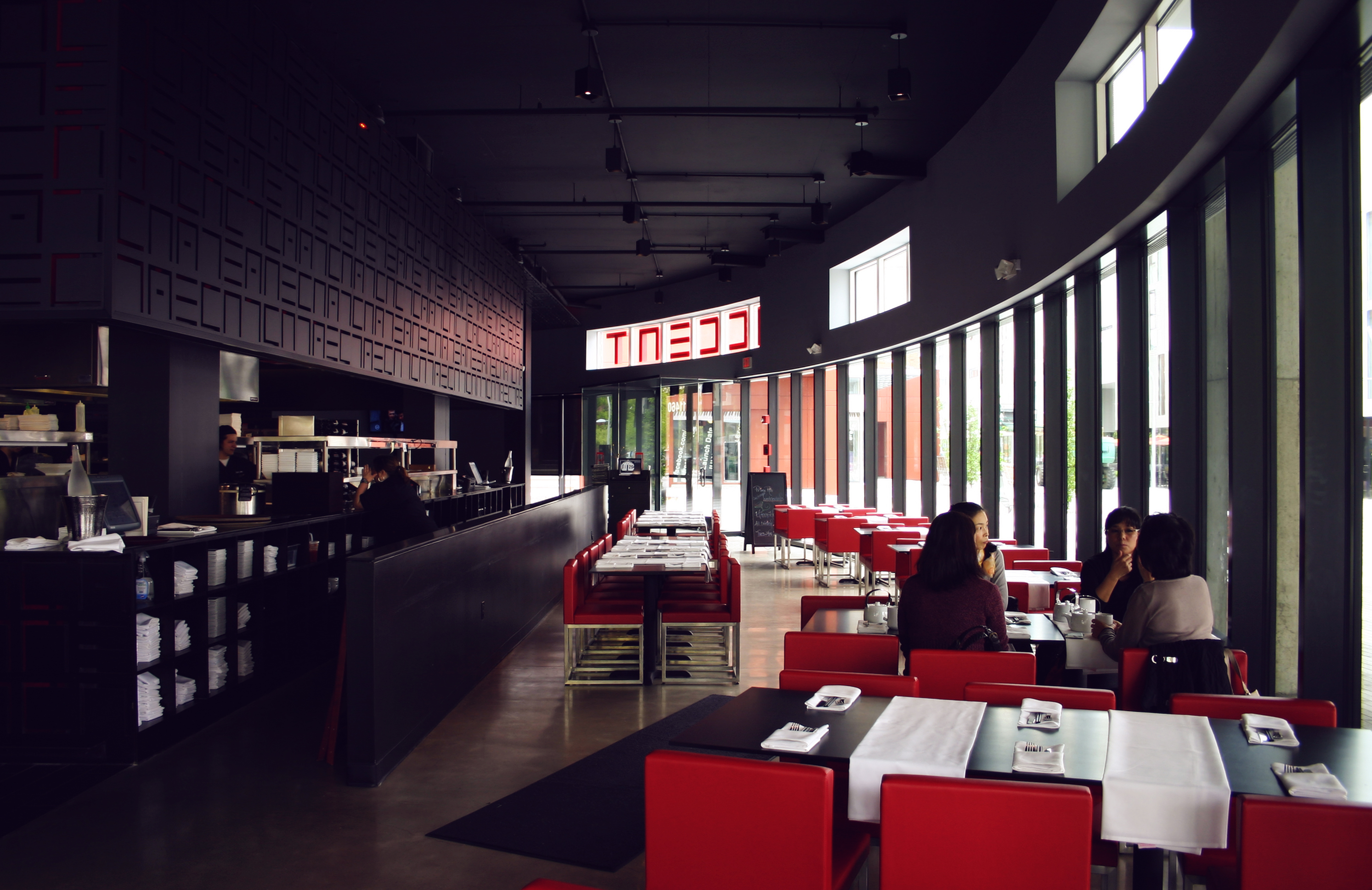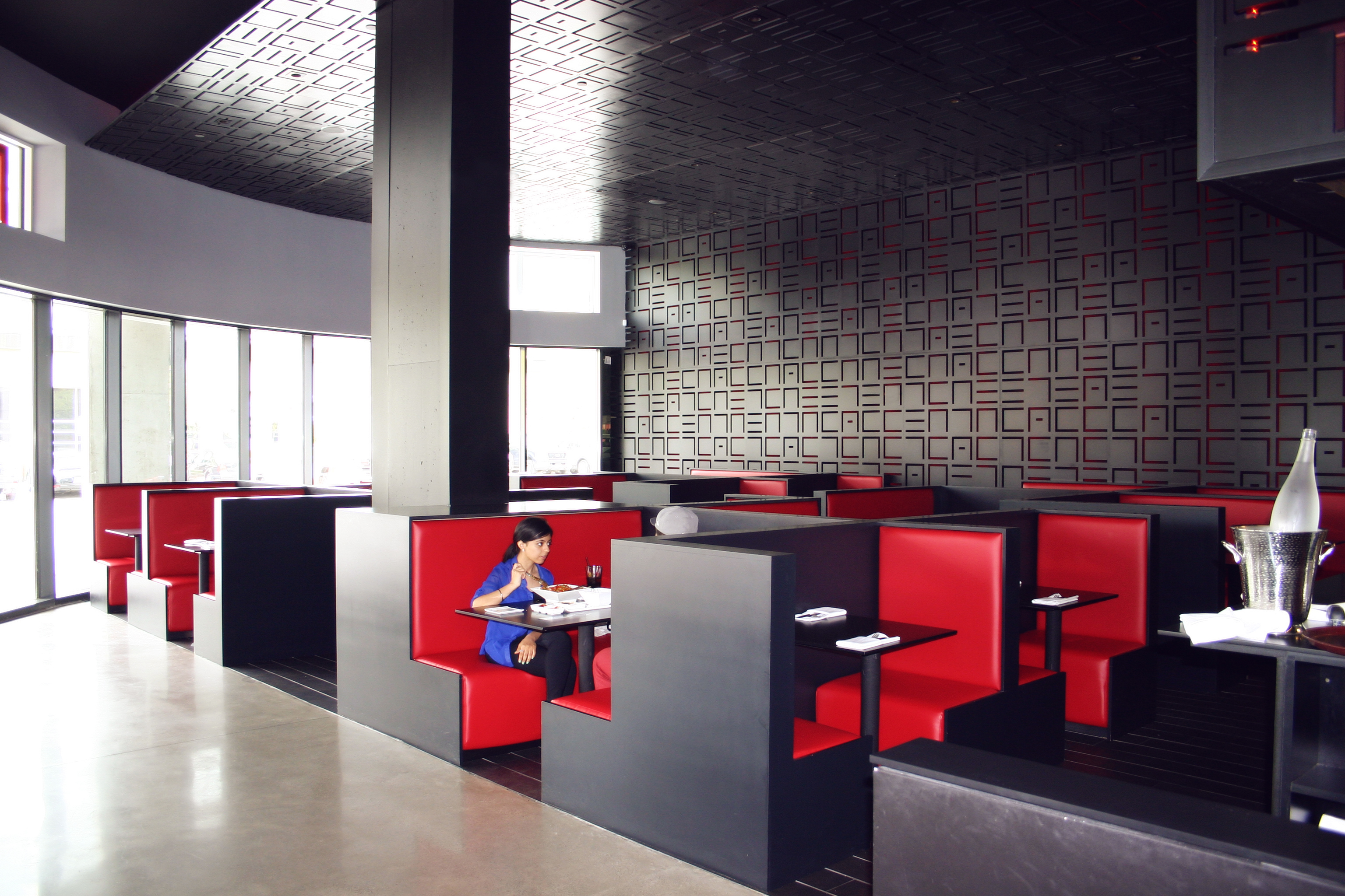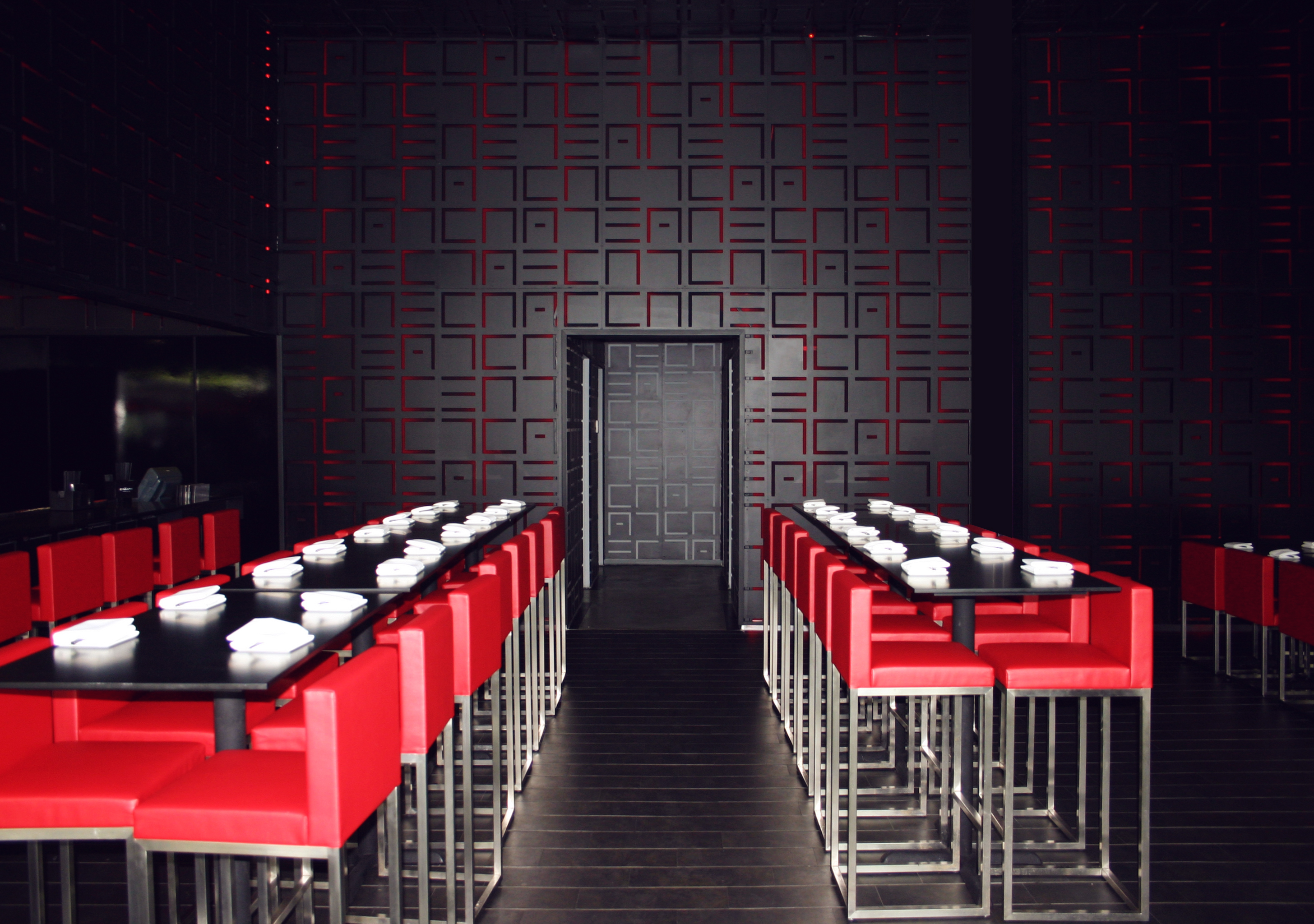The restaurant is organized in three zones: the bar area, casual seating and a formal dining area. The bar area doubles as a private dining room which can be closed off, or a stage for entertainment. The casual seating spills out to the alley outside the egg. The formal dining room is a bento box where seating with red upholstery is contained in black boxes.