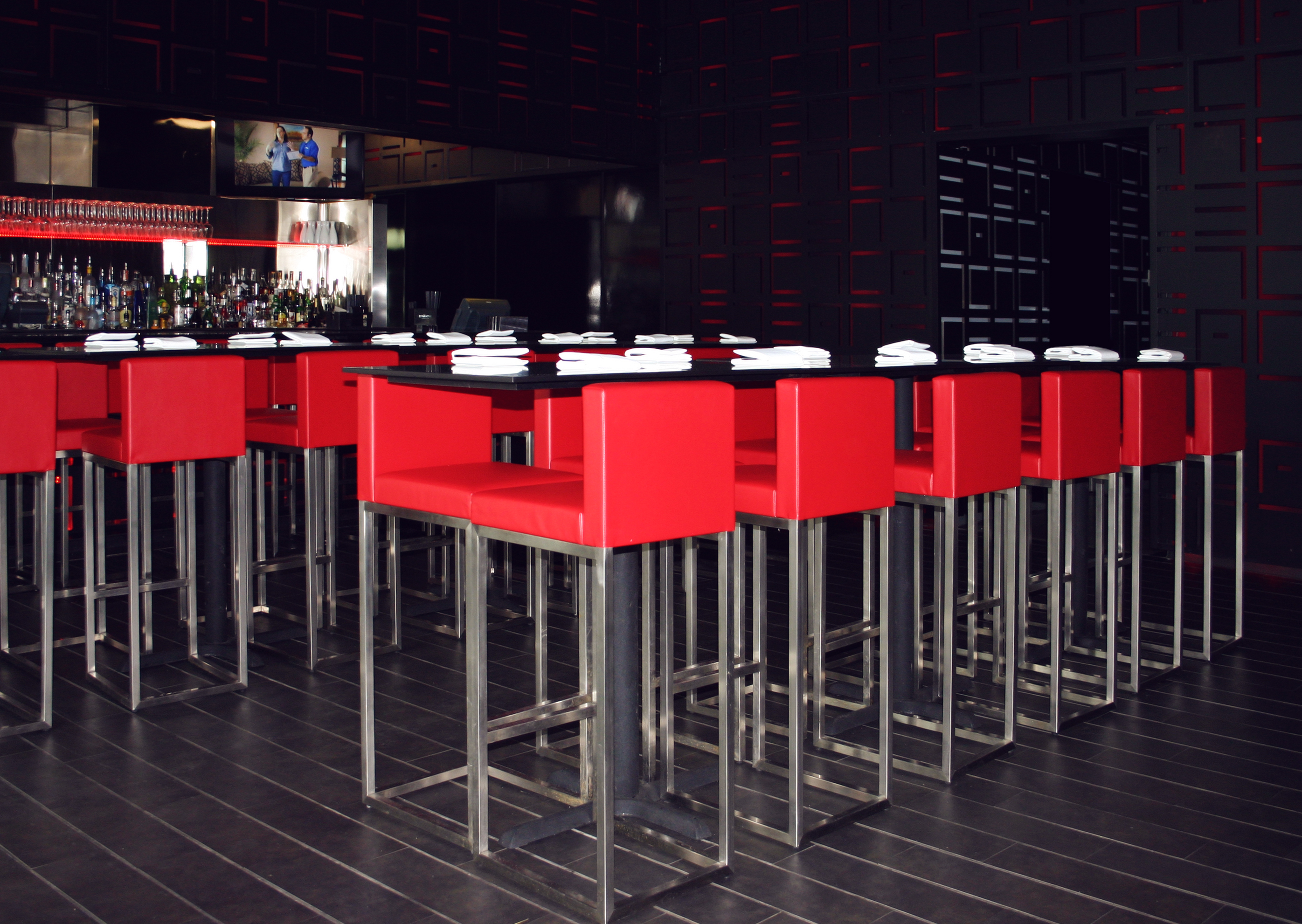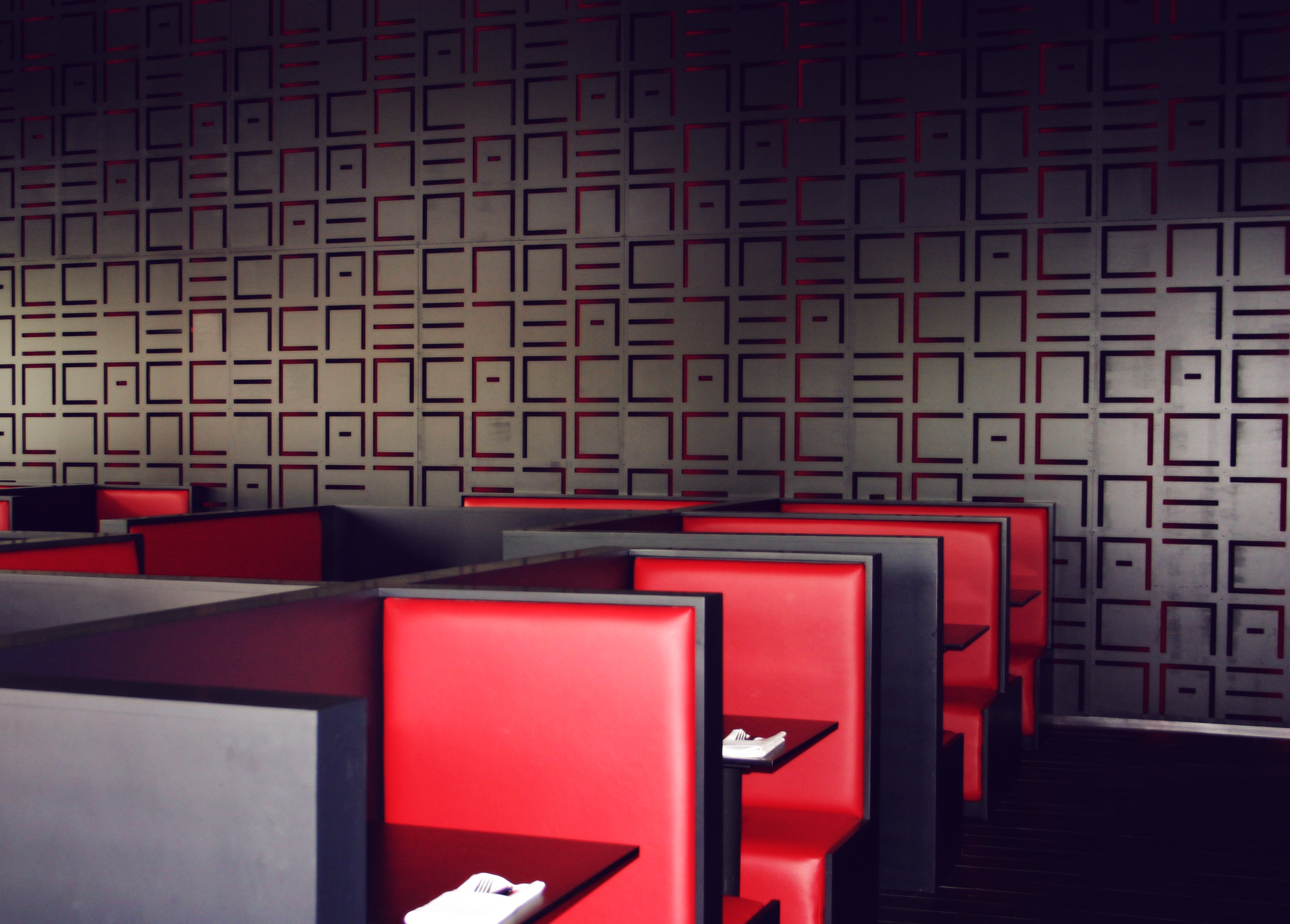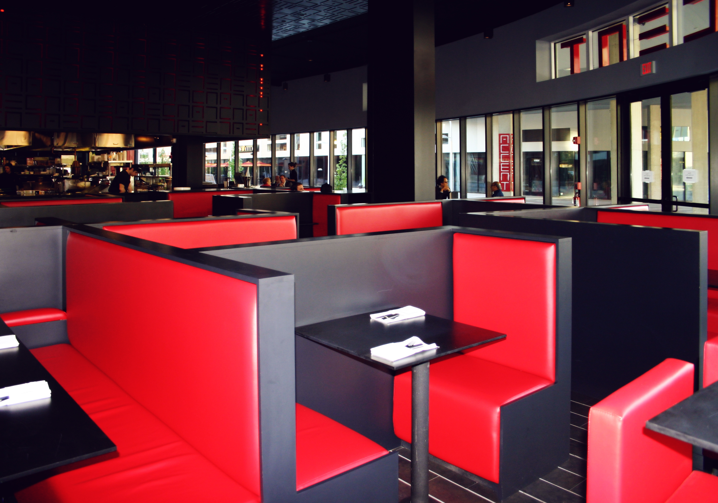 The restaurant is organized in three zones: the bar area, casual seating and a formal dining area. The bar area doubles as a private dining room which can be closed off, or a stage for entertainment. The casual seating spills out to the alley outside the egg. The formal dining room is a bento box where seating with red upholstery is contained in black boxes.
