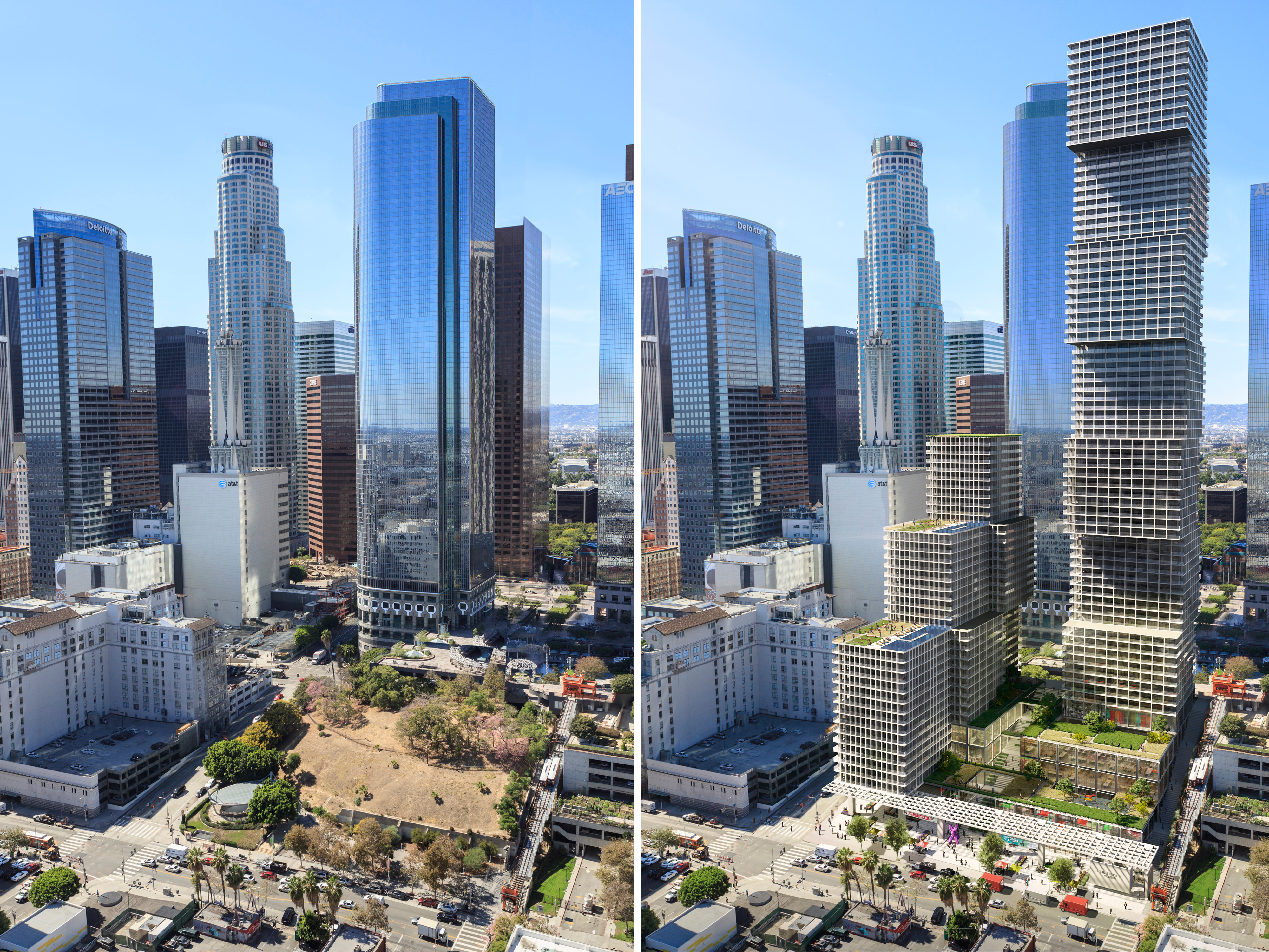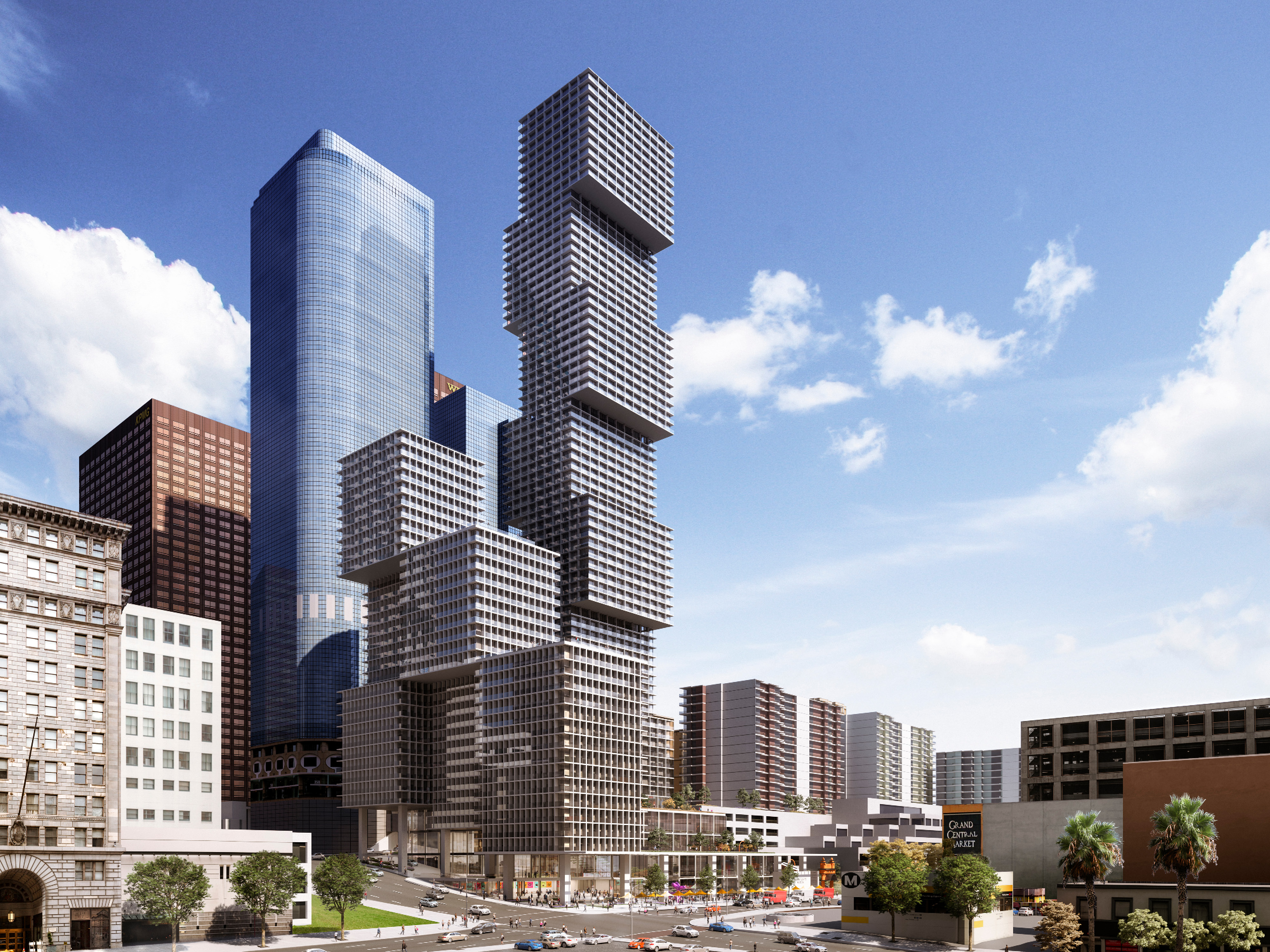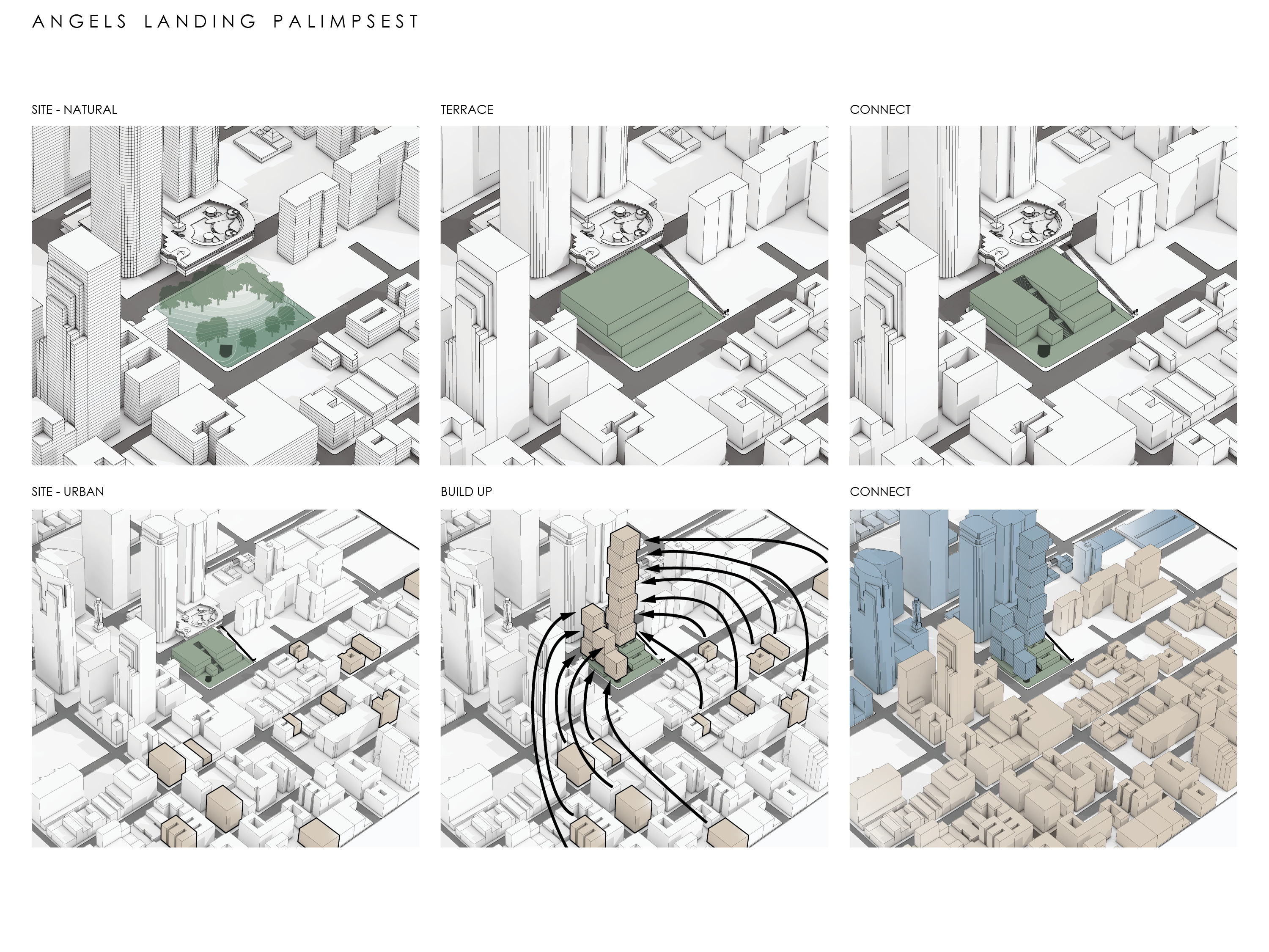 The building’s iconic quality is derived from common language, making it exceptional and ordinary simultaneously. Our hyphen architecture is a bridge, merging the grids and cubes of the Historic Core and the Towers of Bunker Hill. Angels Tower is assembled by stacking blocks in the sky, the Stepped Slab mirrors the hill and connects to the lower scale and the Terraces replicate the landscape and are incised with program.
