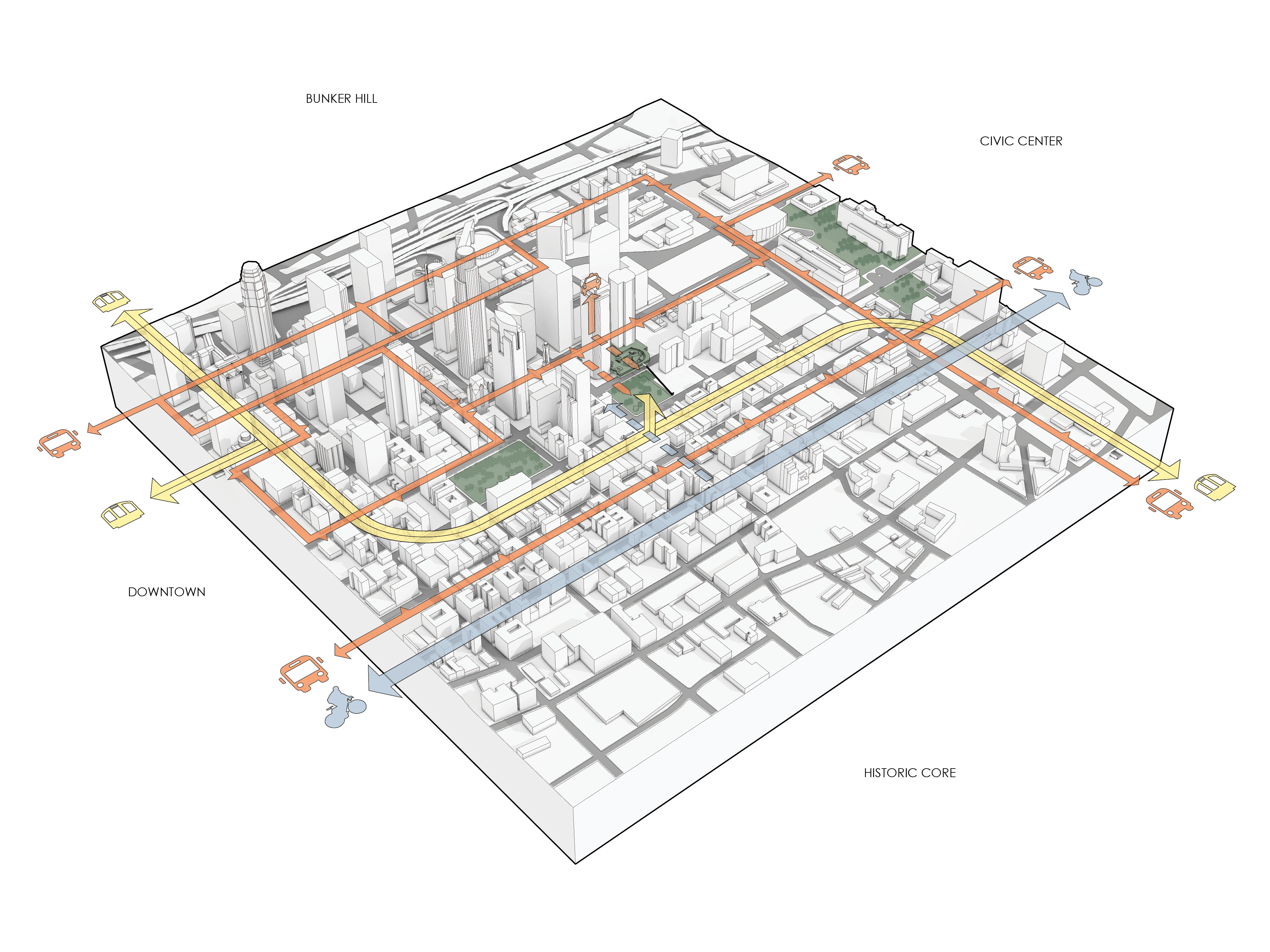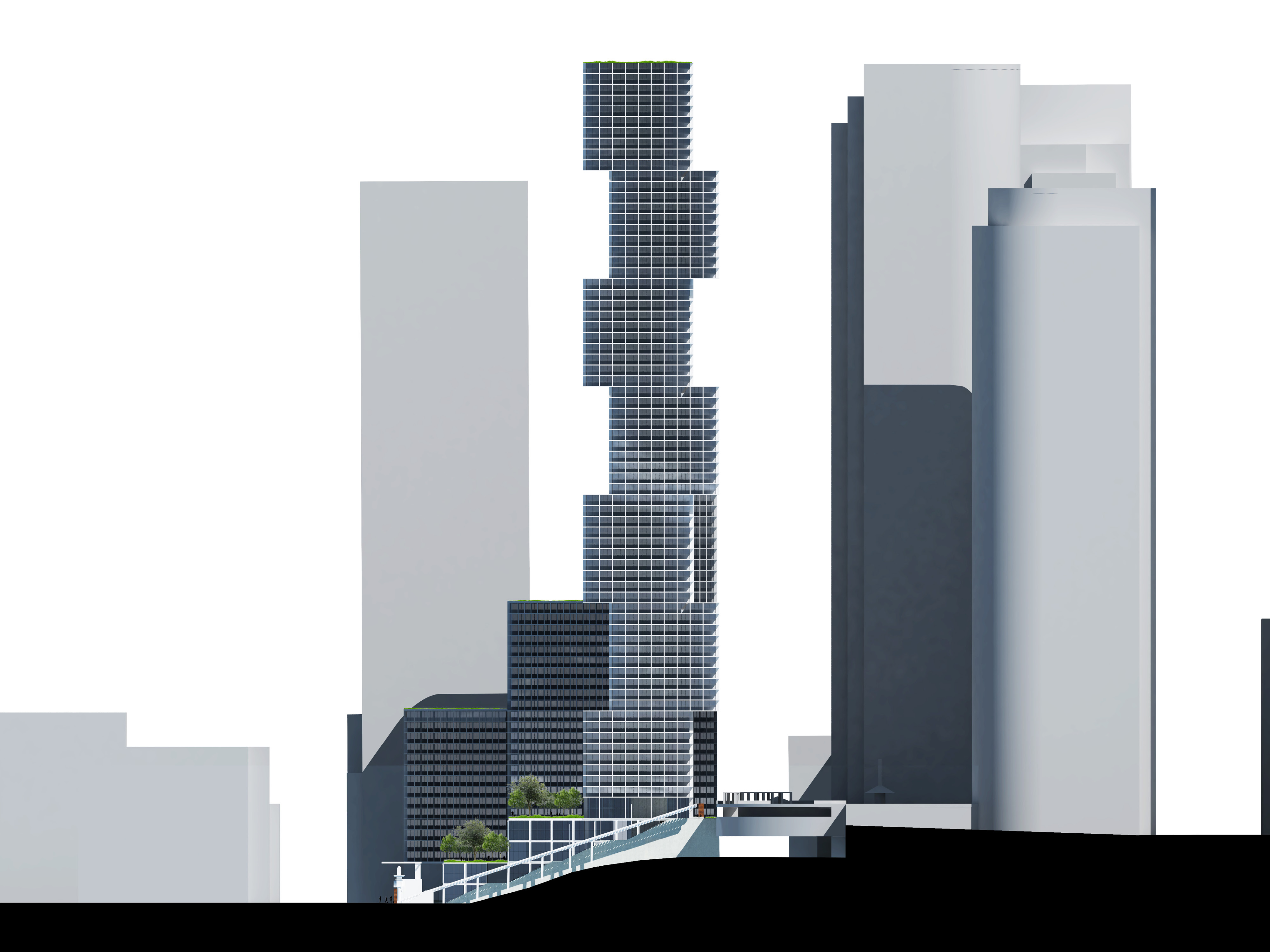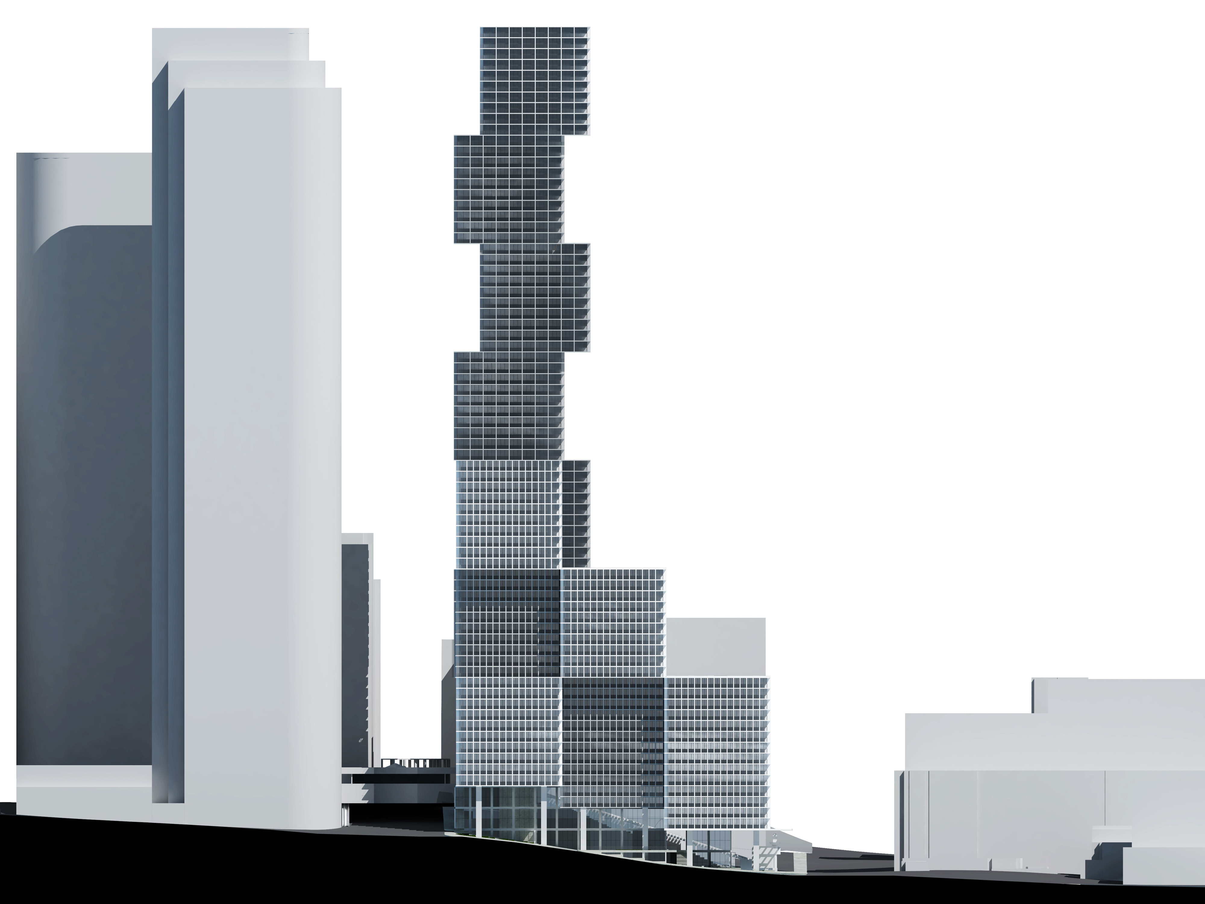 The Historic Core is an expression of traditional American Urban Development of grids and cubes. Angels Tower and Stepped Slab are assembled by stacking these blocks in the sky. Our hyphen architecture is a bridge, merging the grids and cubes of the Historic Core and the towers of Bunker Hill.