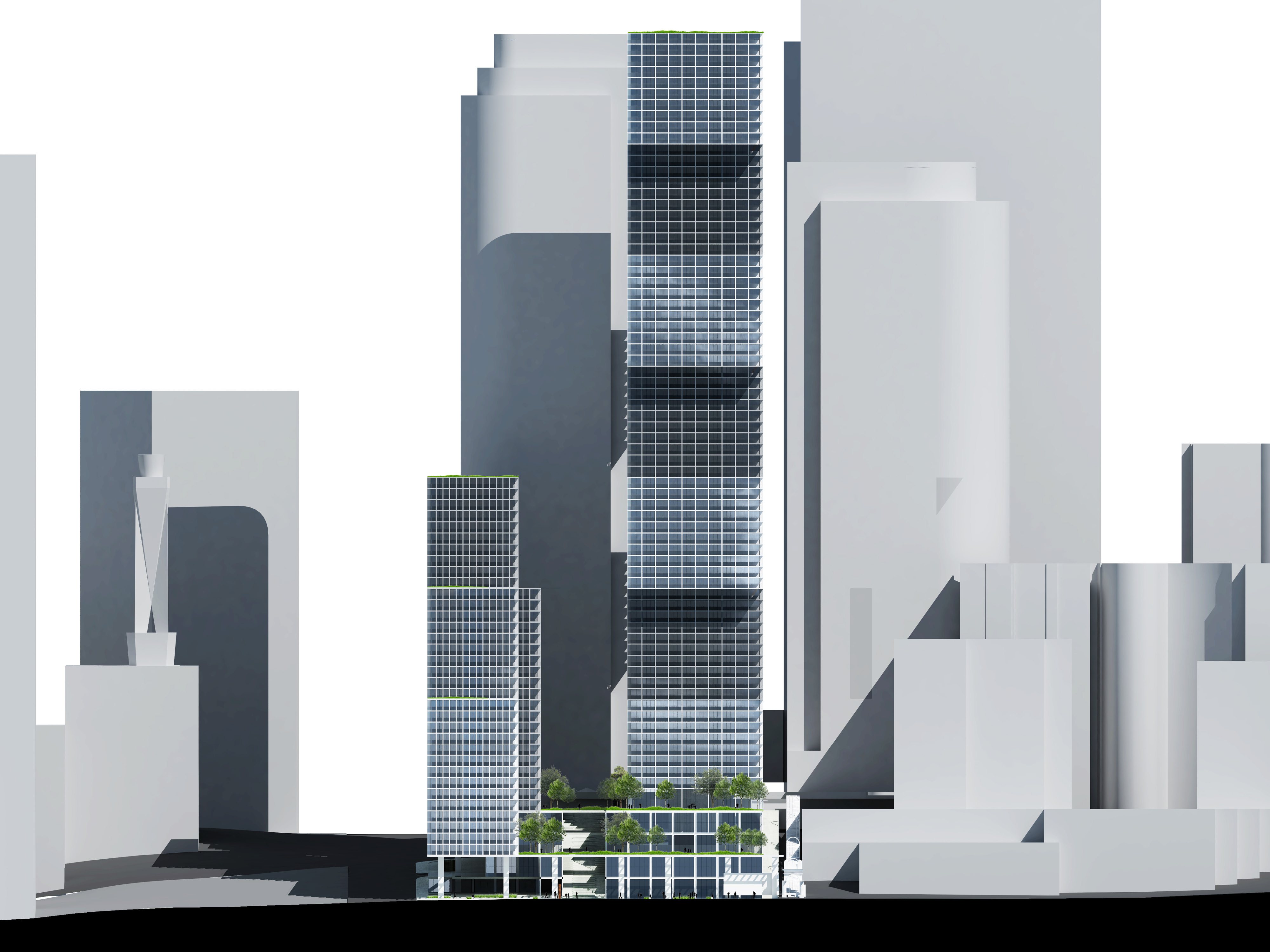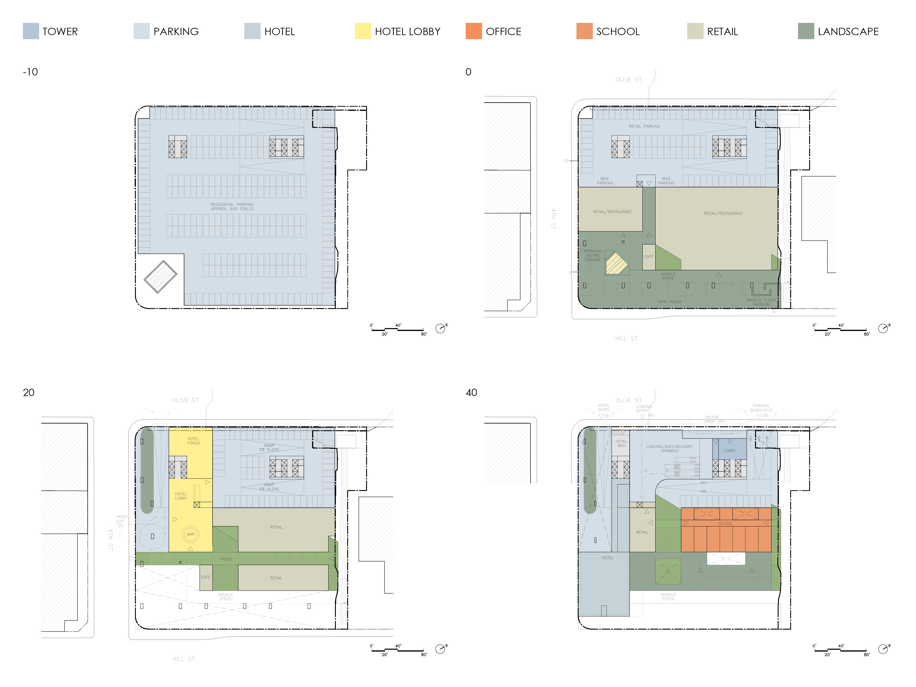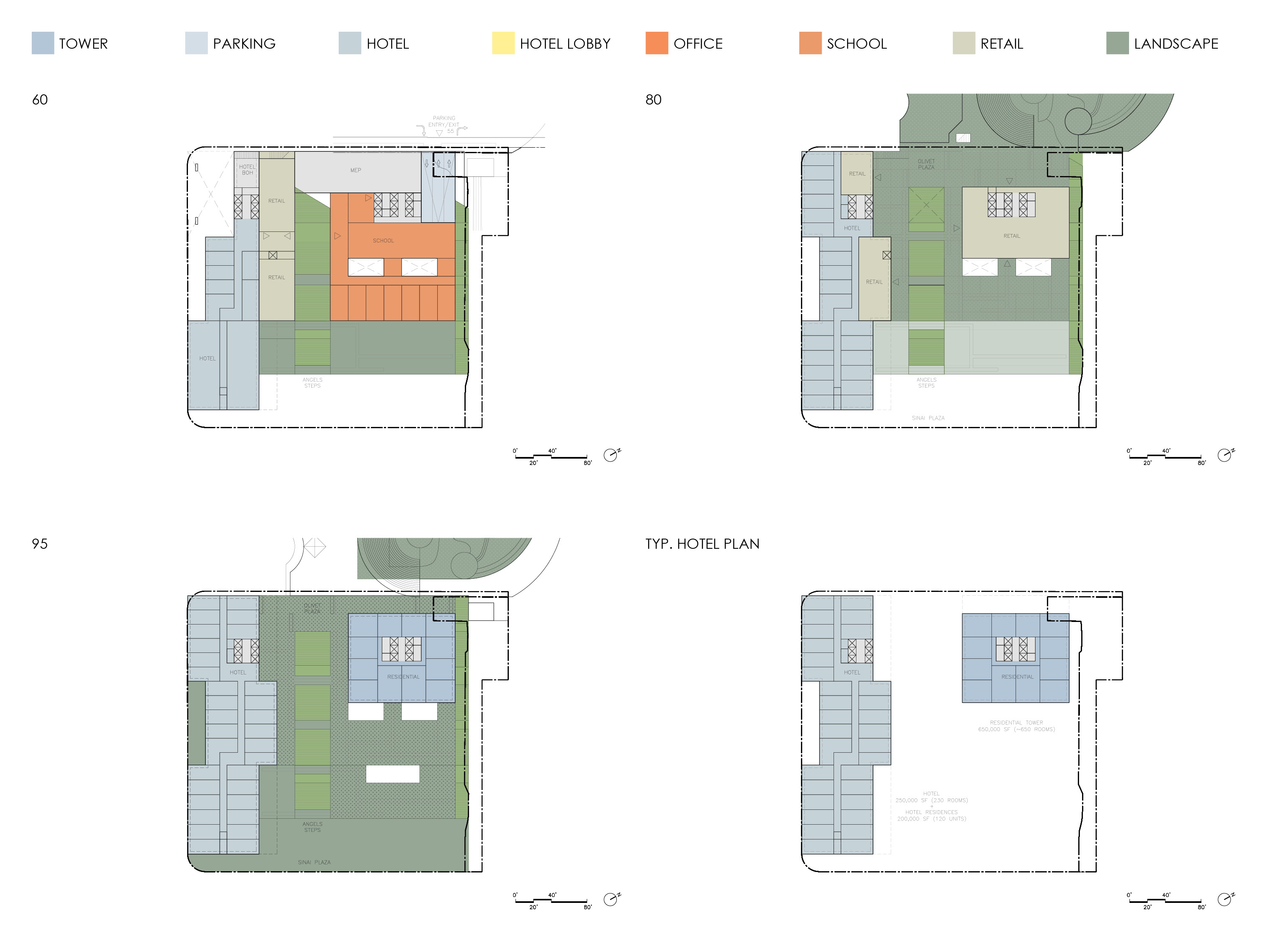 Angels Tower is placed at the top of the hill, aligned precisely with the gap between California 1 & 2, preserving their view corridors and ensuring views from all four sides of Angels Tower. This tall Bunker Hill scale tower is housing. The Stepped Slab Hotel building lines Fourth Street, tracking the topography, connecting the scale of Bunker Hill with the Historic Core.