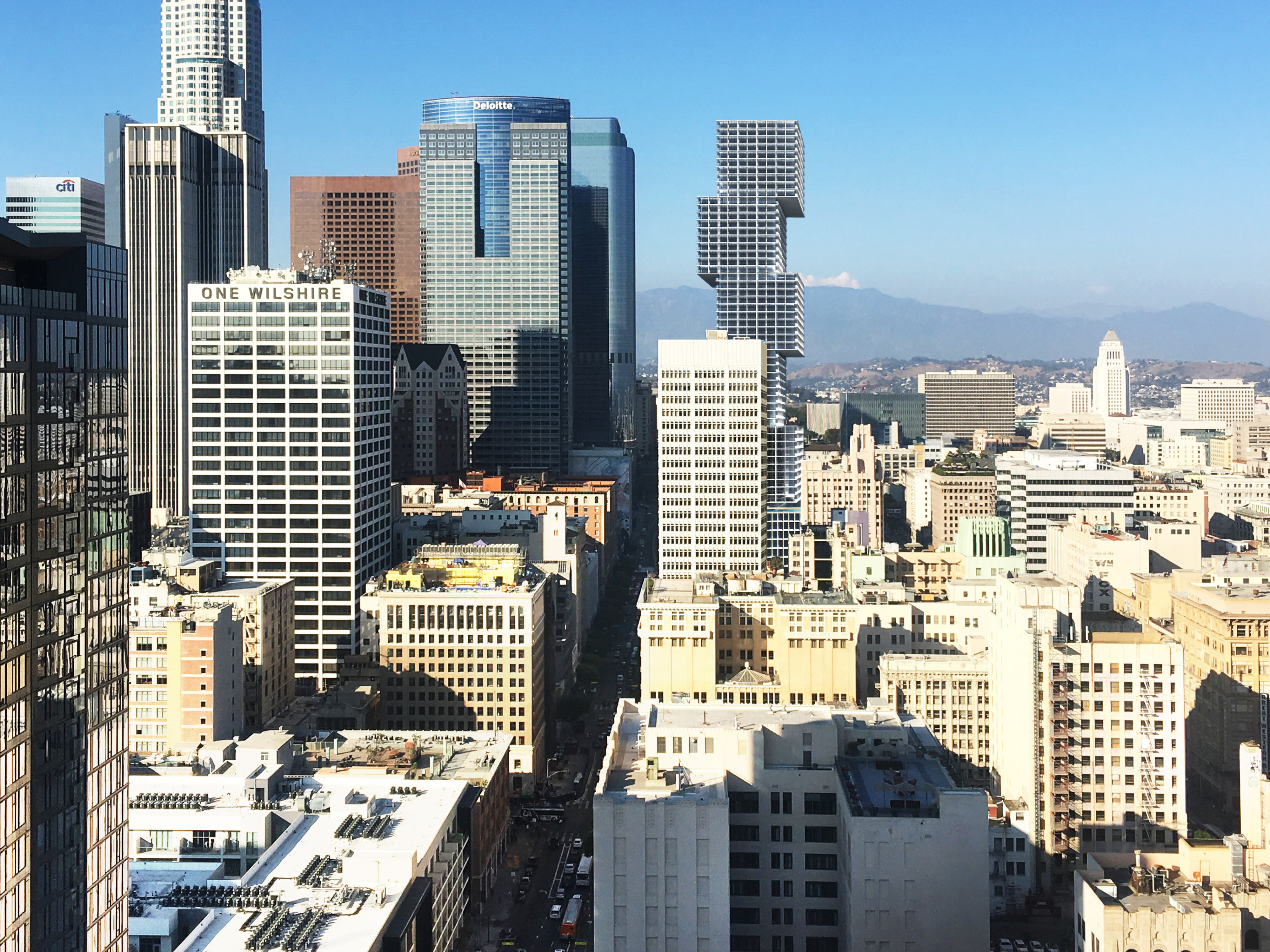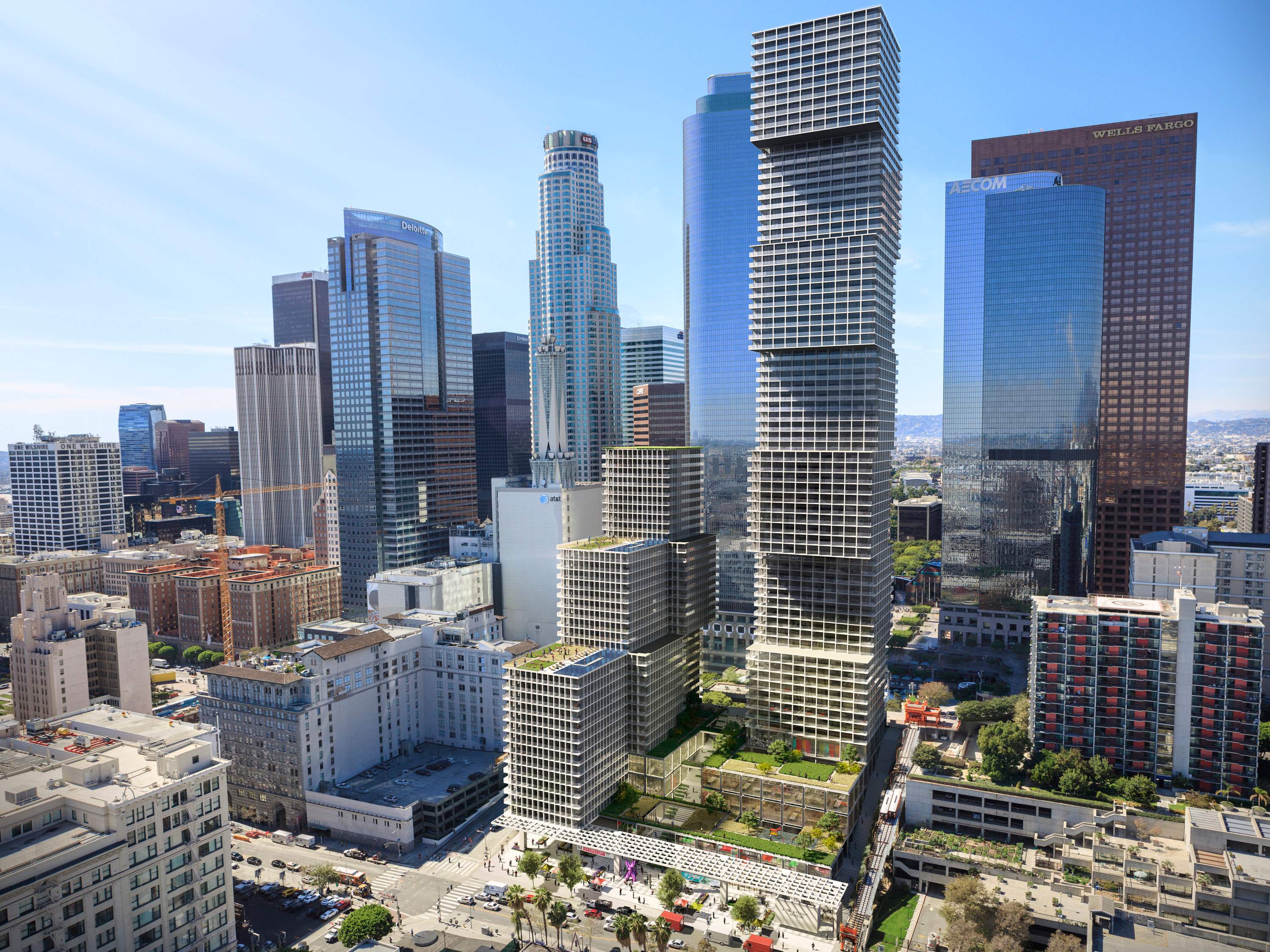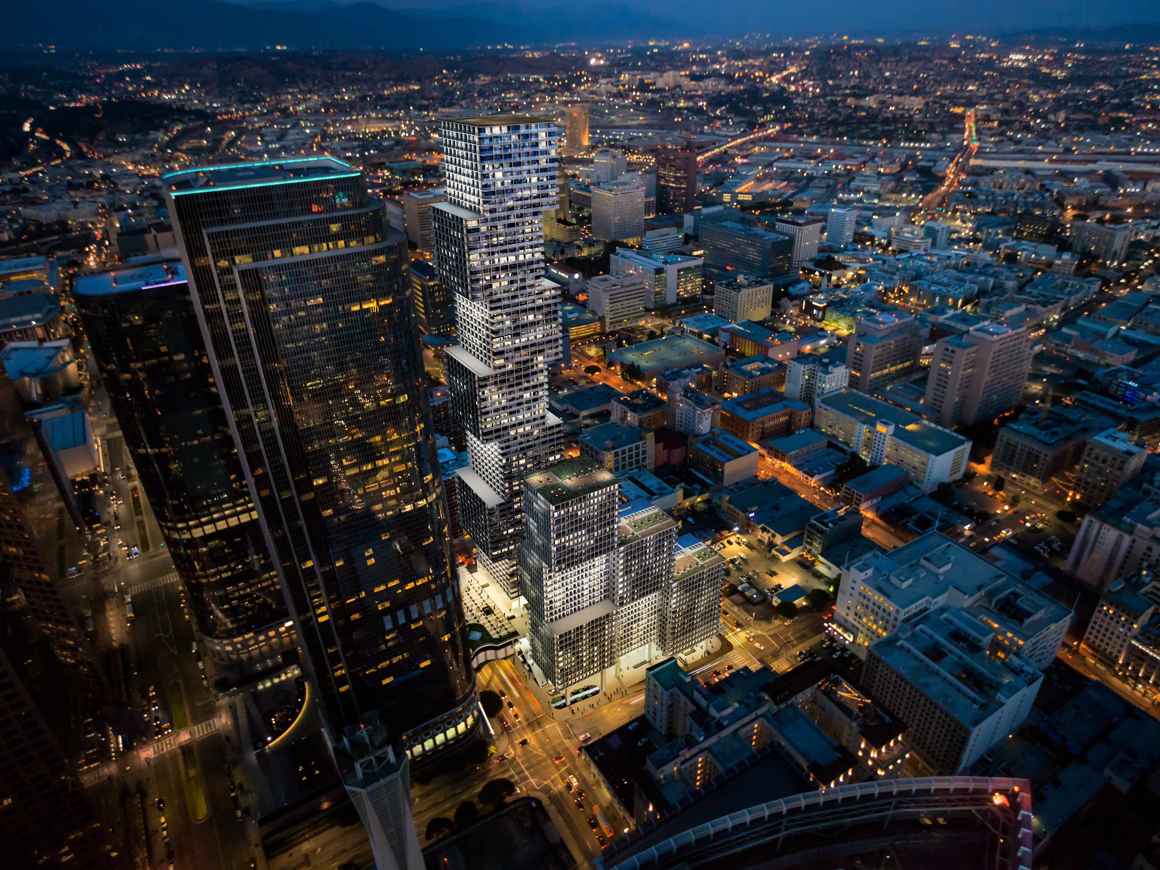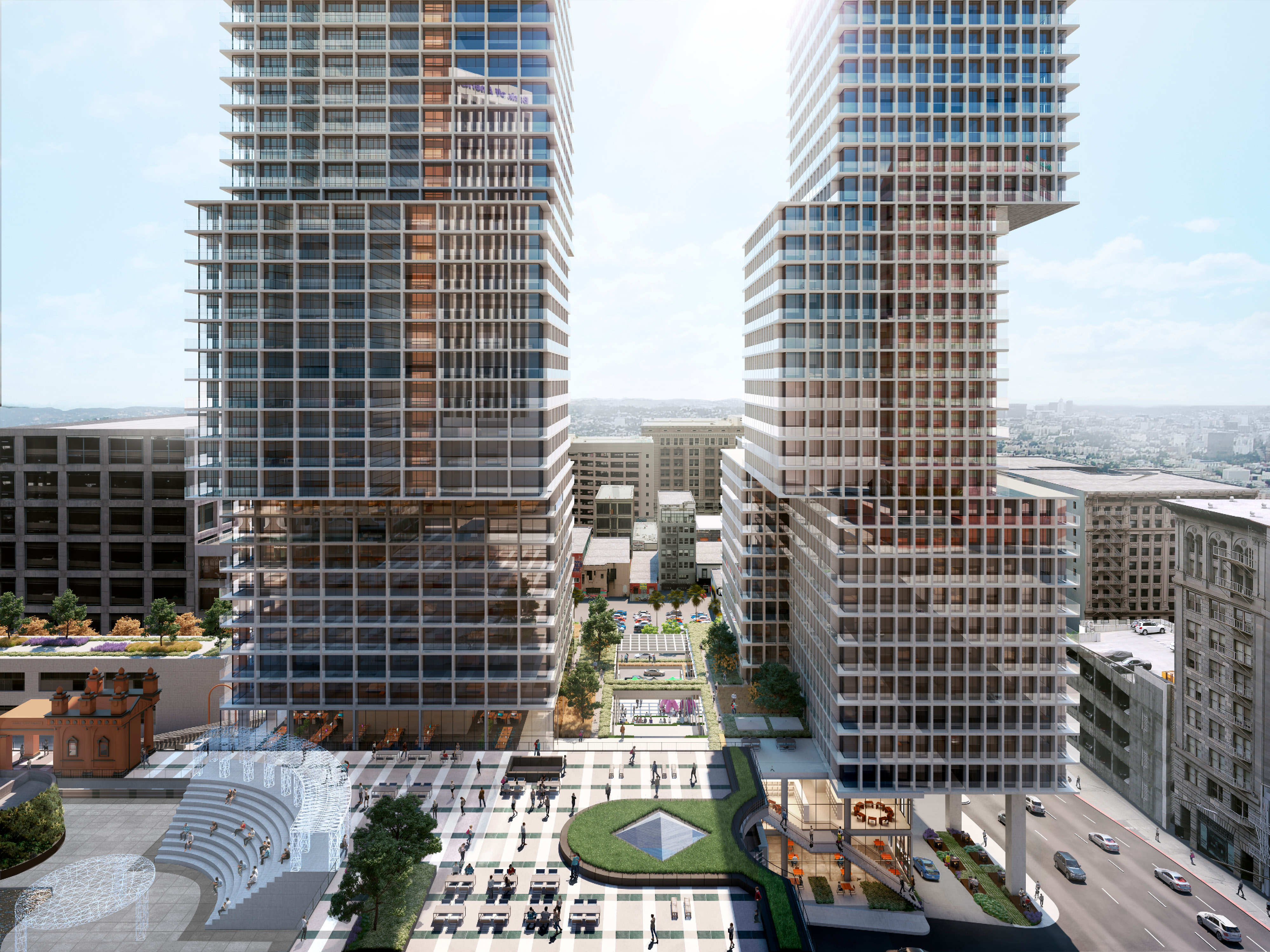 Angels Tower is placed at the top of the hill, aligned precisely with the gap between California 1 & 2, preserving their view corridors and ensuring views from all four sides of Angels Tower. This tall Bunker Hill scale tower is housing. The Stepped Slab Hotel building lines Fourth Street, tracking the topography, connecting the scale of Bunker Hill with the Historic Core.