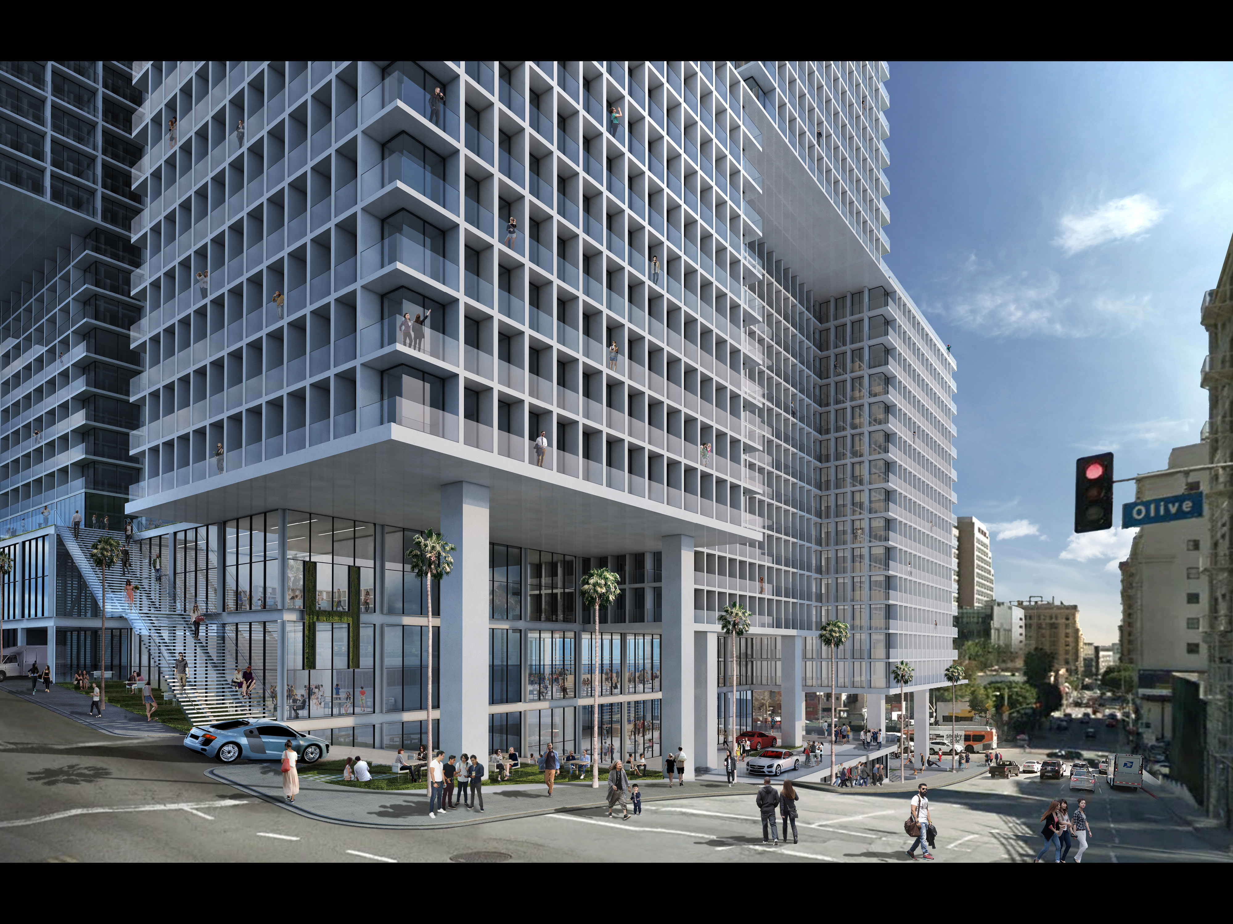 On the other side of Angels Steps is the Hotel. The Hotel Lobby is accessed from the Porte-Cochere on Fourth Street, with Capsule Cafe on the corner of Olive, and the Hotel drop-off and turnaround in a grand covered space. The arrivals desk is at the center, with direct access to parking, and open to the Paseo Bar overlooking Pershing Metro Square. On the other end of the Hotel Lobby at Olive Street is Fonda, a restaurant. The stepped slab Hotel is the base with blocks of Residences above and two rooftop amenity areas for the two programs.