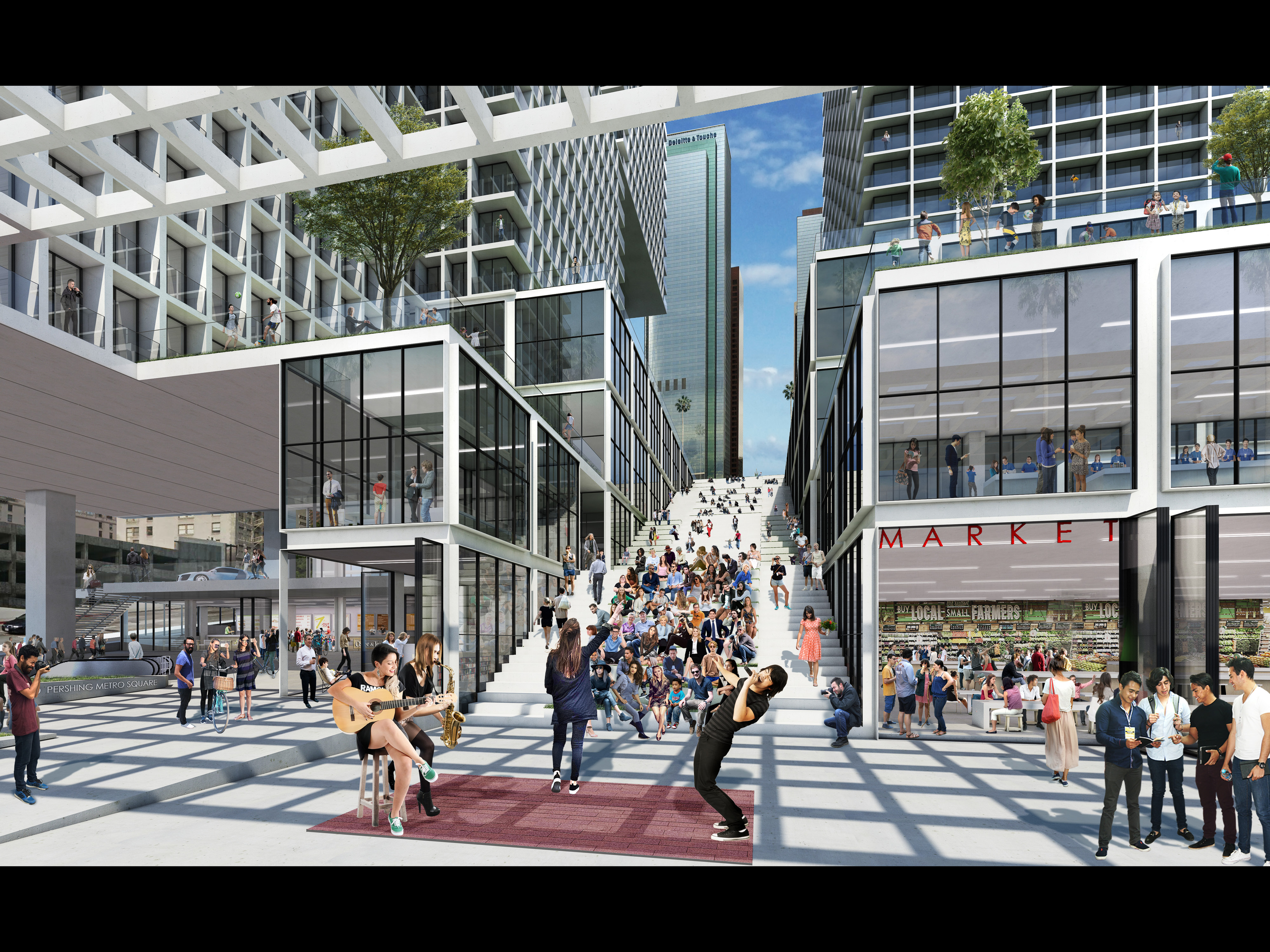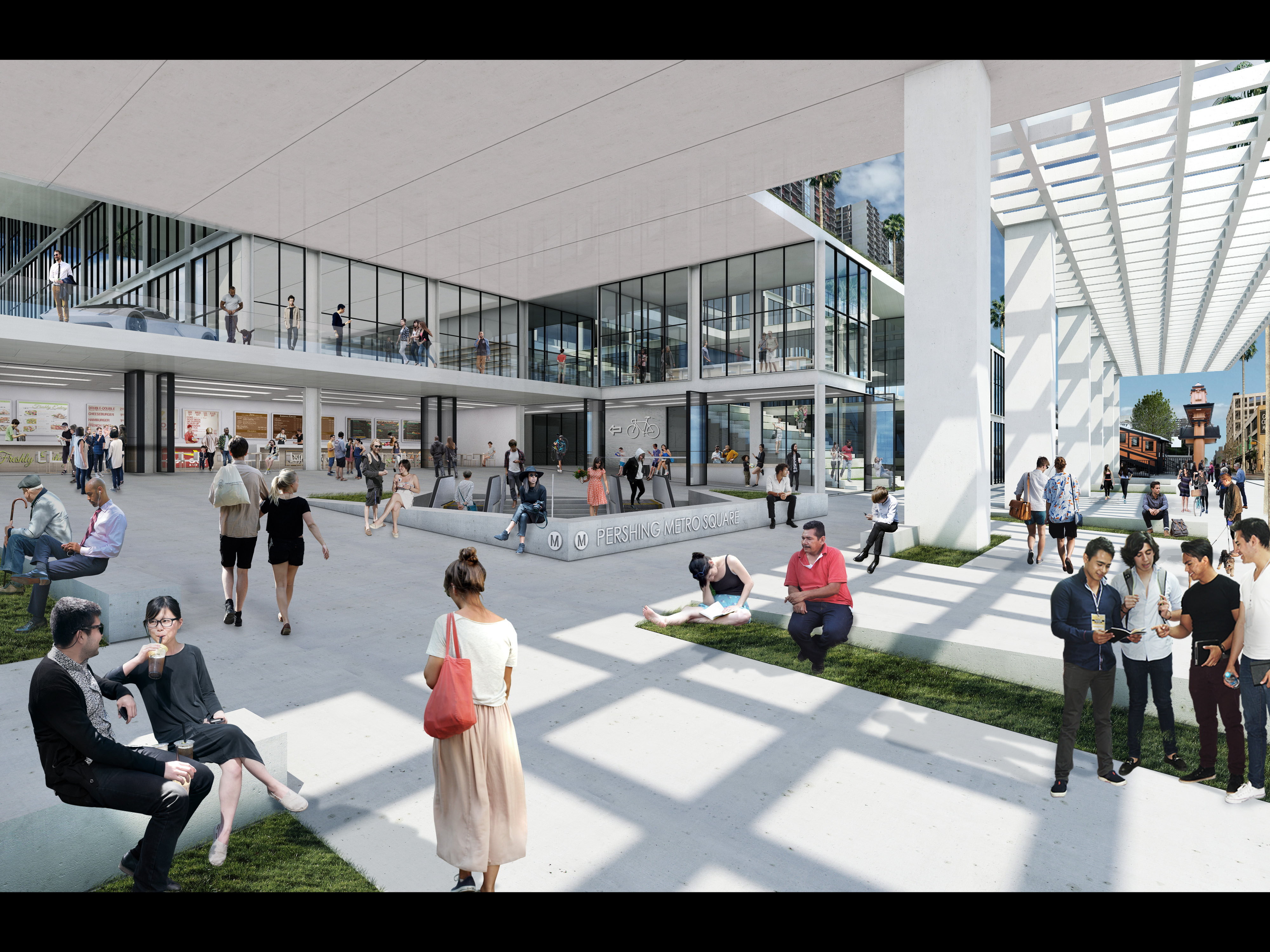 The large urban roof that connects Angels Flight and Pershing Metro demarcates a public square, where farmers markets and festivals have space to fill, where Central Market has space to overflow, food trucks place to park, and strollers and lingerers opportunities to sit and wait. This space can house public art, host art exhibitions, and support urban theatre.