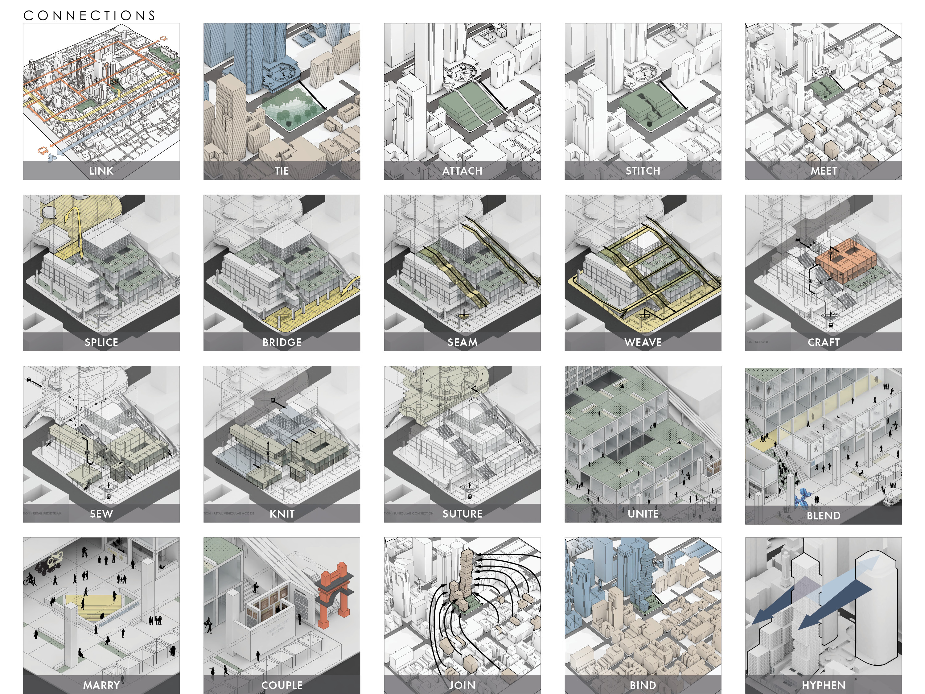 As the hill ascends, transverse Paseos connect the terrace programs laterally, linking the stairs in a net of connections, creating a web of public movement and retail opportunities. Elevators and parking are linked directly to every level.