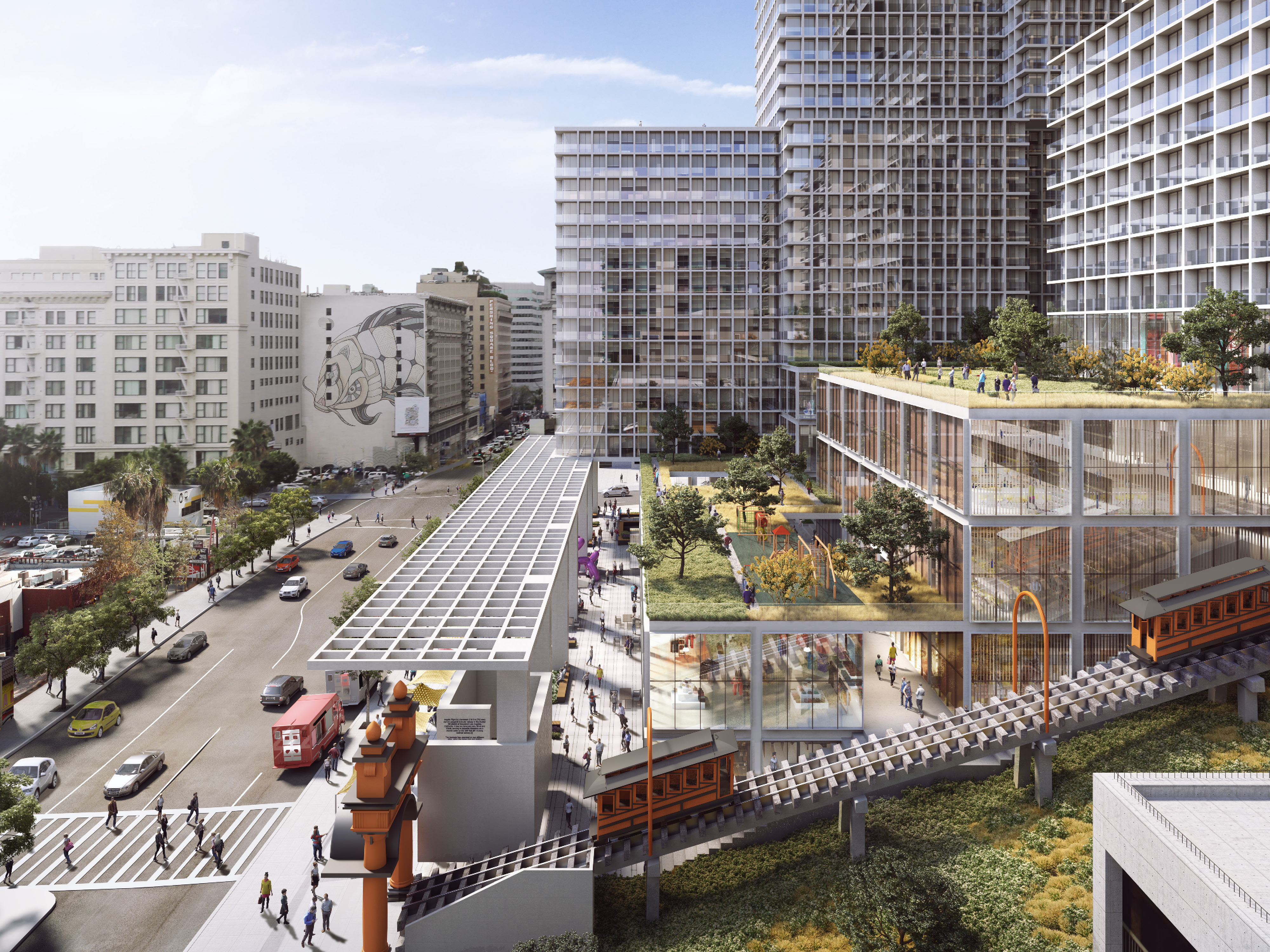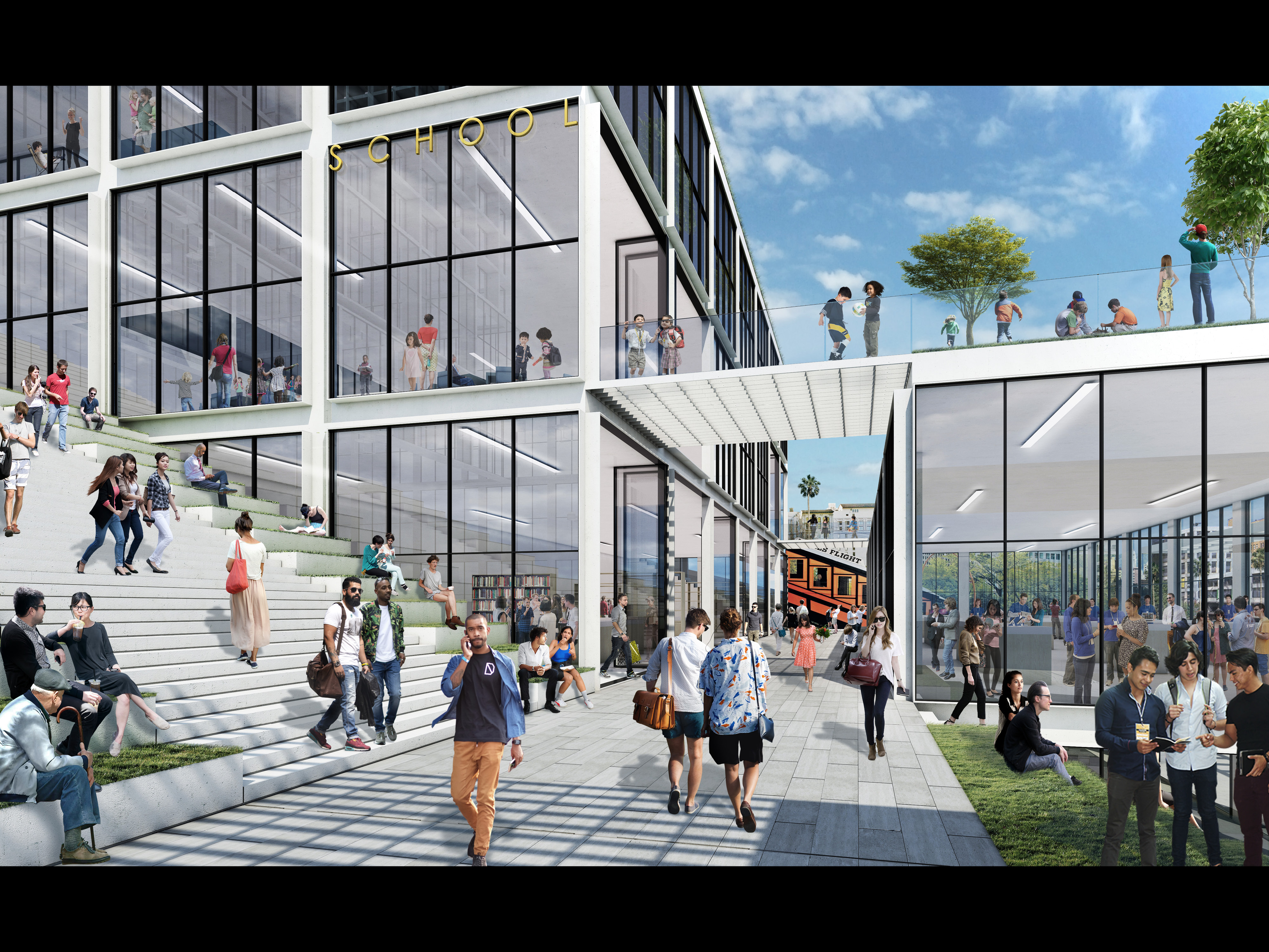 An Elementary School with access from Angels Steps as well as the Olive Street drop off via elevator occupies two levels of the landscaped terraces. The school spills out to a rooftop garden play yard, a green learning oasis in the midst of the city.