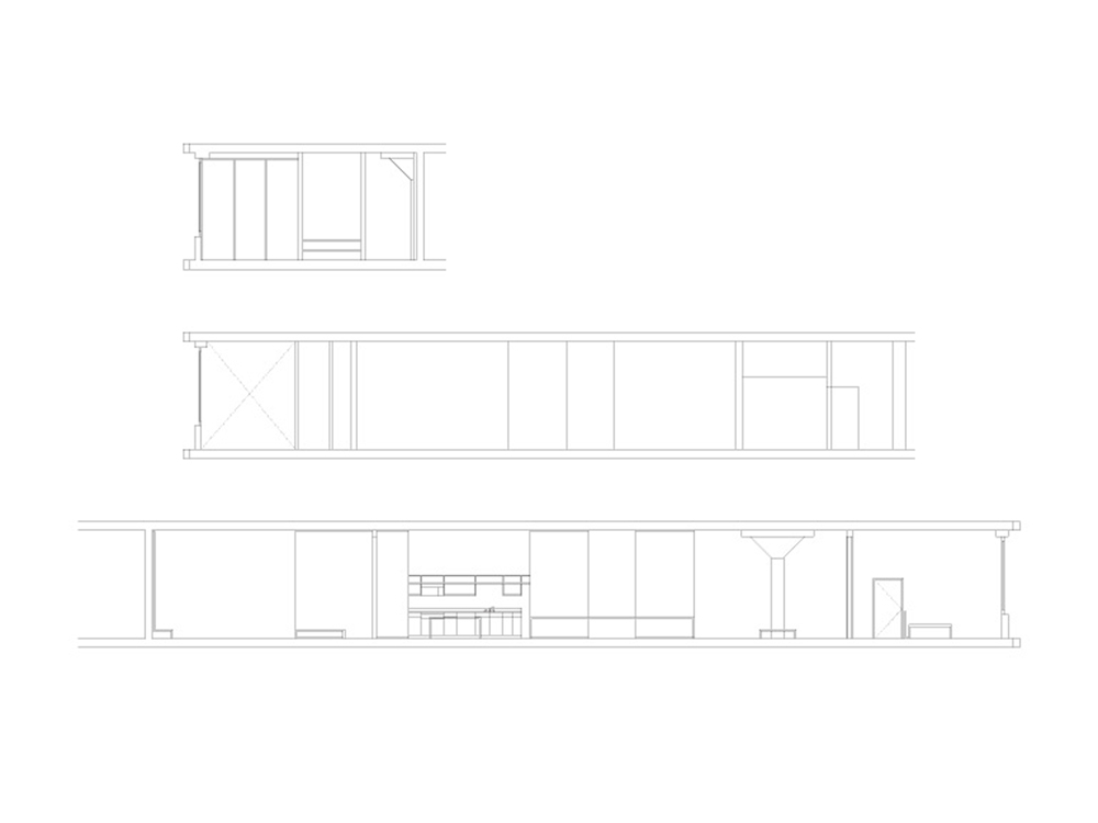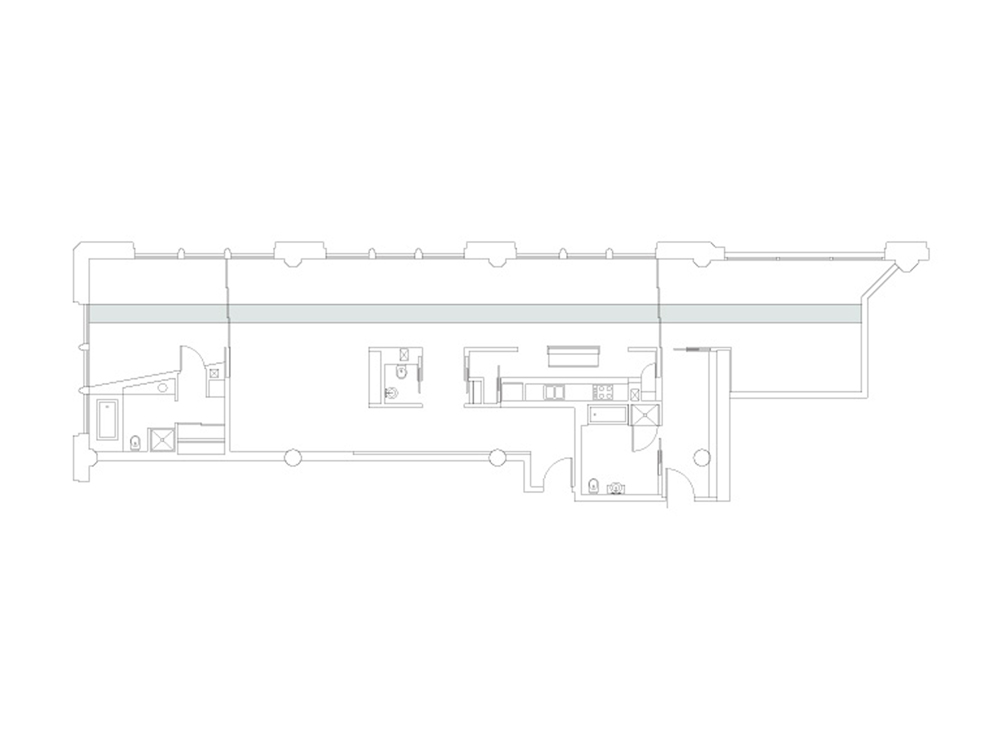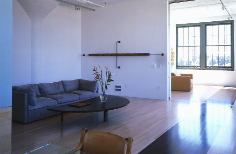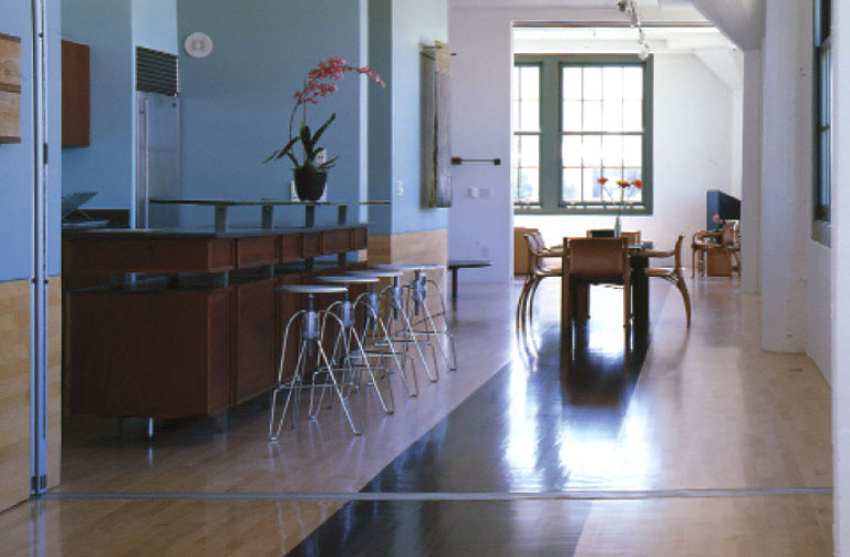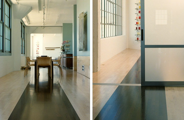 The loft consists of two units joined to form a long continuous space with one wall of industrial glazing. A black wenge stripe runs down the middle of the birch floor from end to end, measuring the length of the space. The stripe arranges the domestic landscape by providing the locus for a series of tables of different types and heights—television table in the guest bedroom, coffee table in the living room, dining room table, kitchen table, and bedside table in the master bedroom. On the service wall, the blond wood floor turns up to become a wainscot.